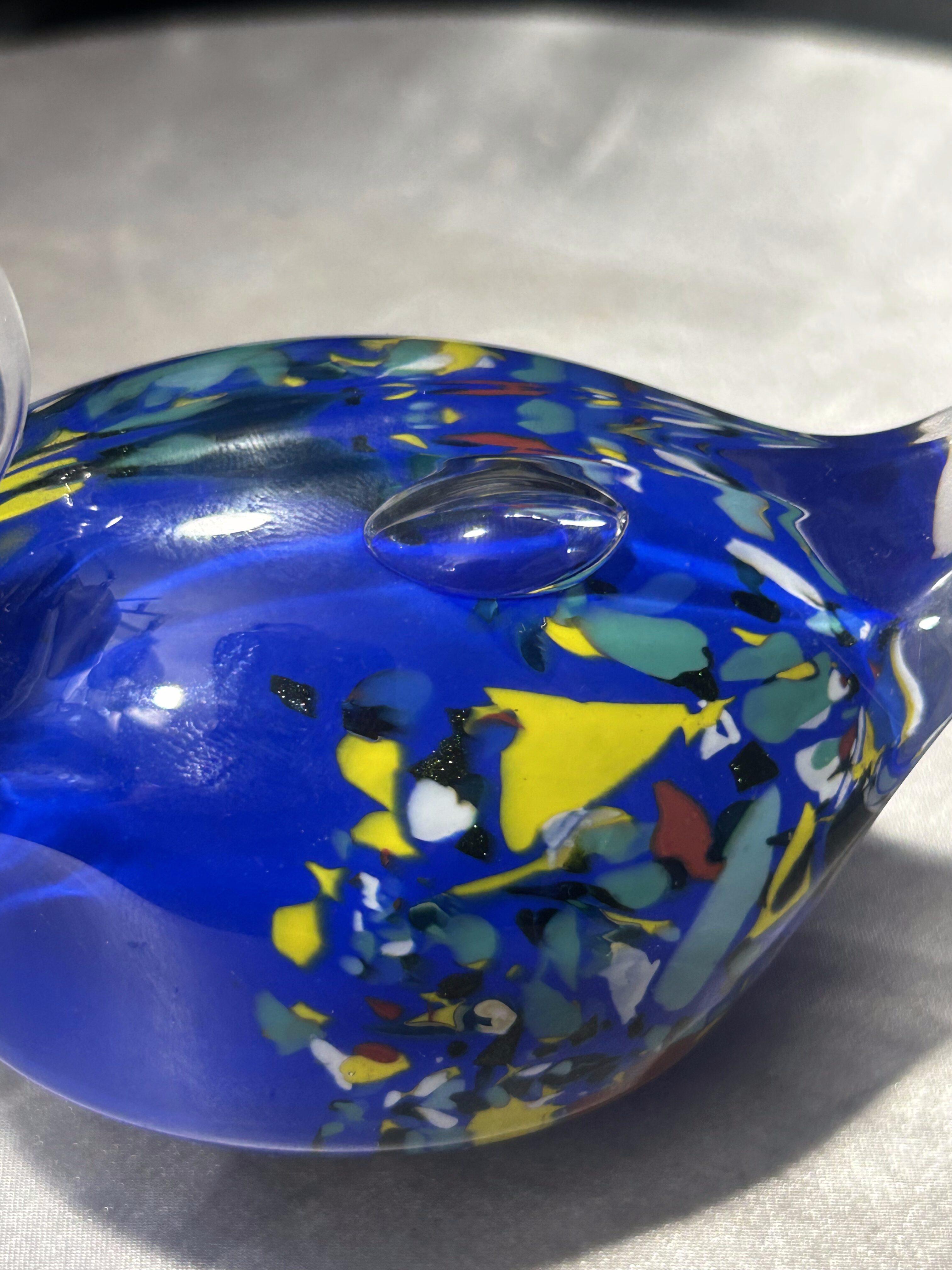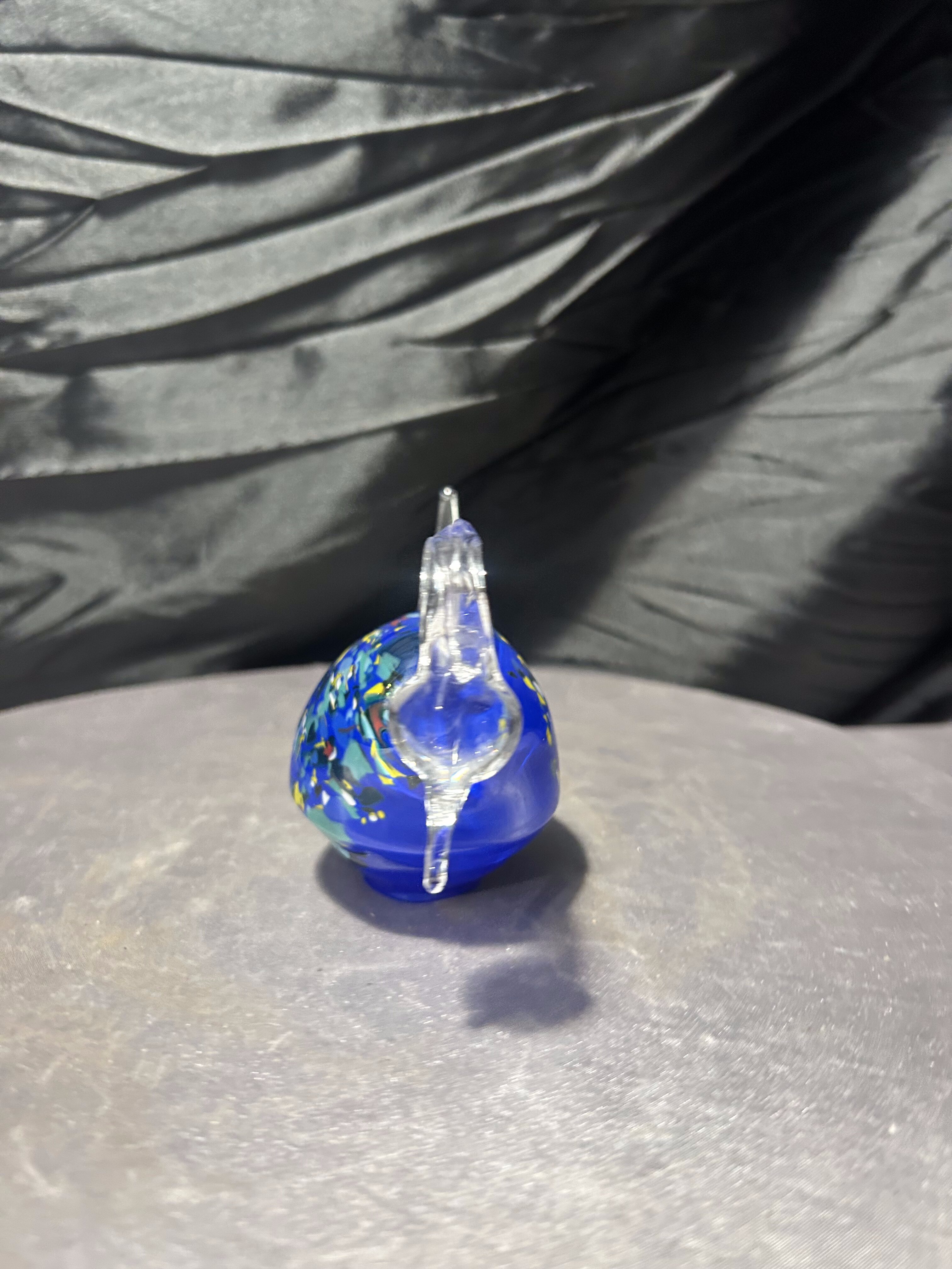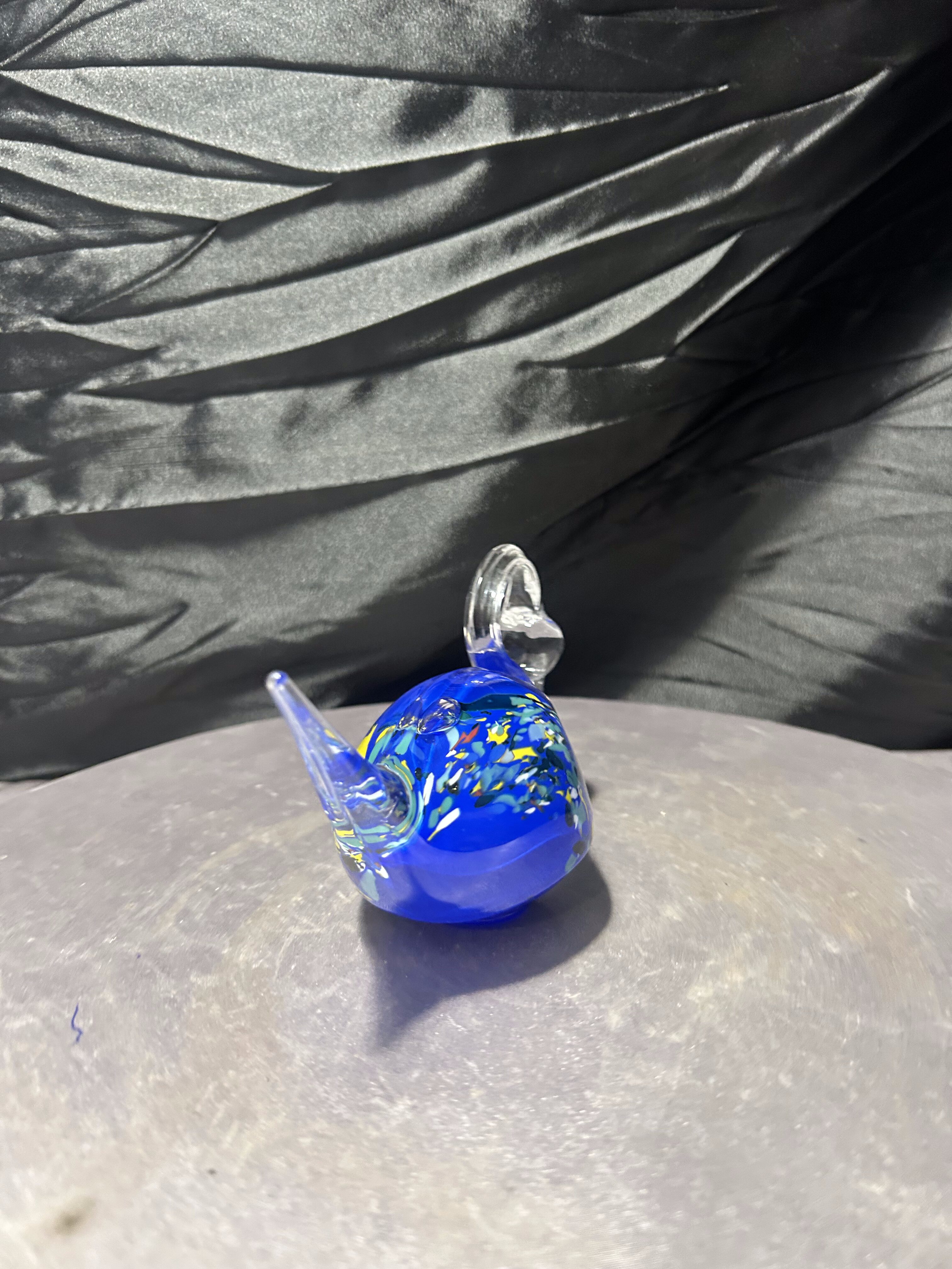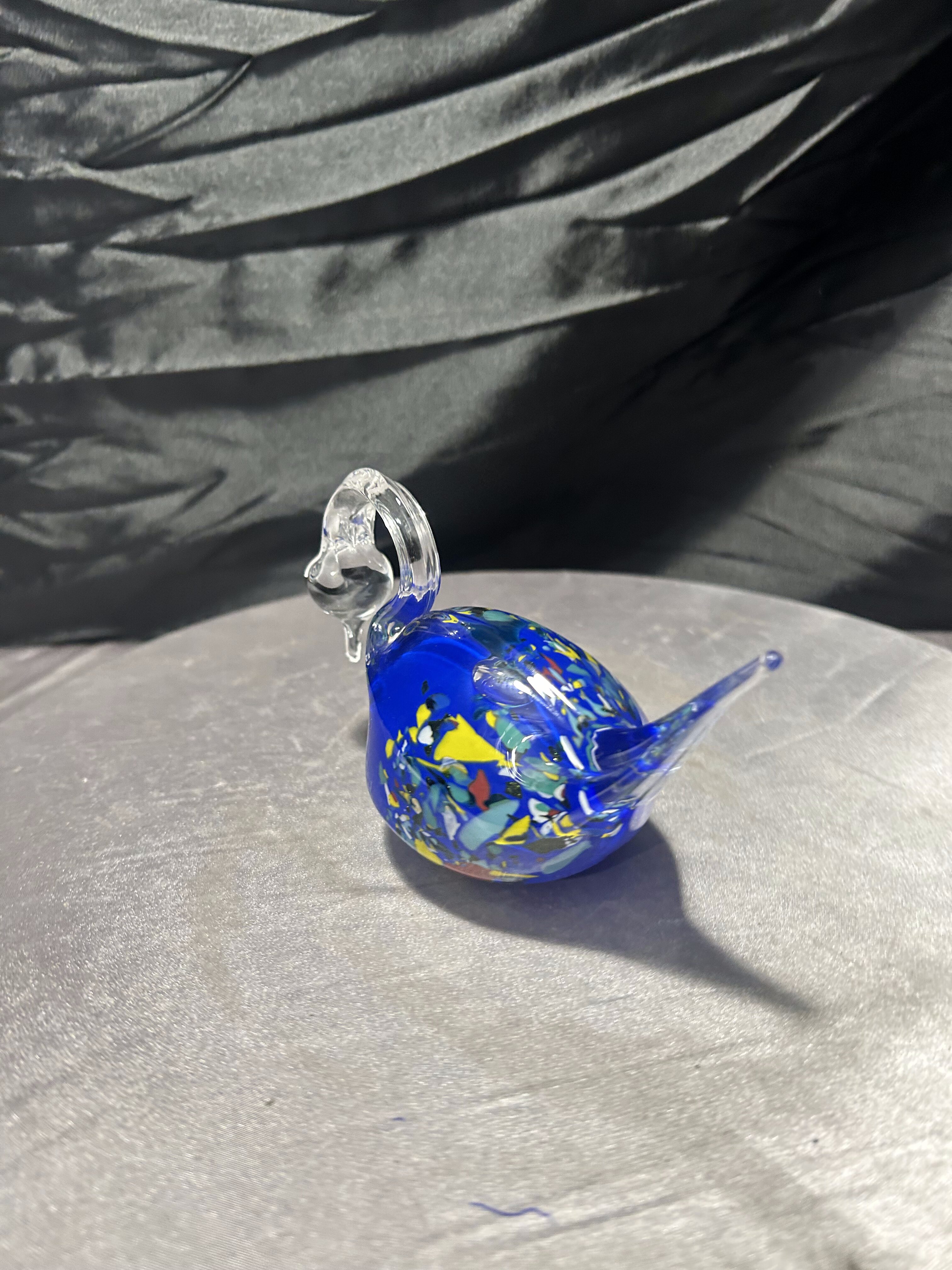 Elegancka figurka łabędzia wykonana ze szkła artystycznego, o wyjątkowej, płynnej linii i efektownej kolorystyce. Intensywnie kobaltowy korpus z wielobarwnymi wtopieniami kontrastuje z przezroczystą, finezyjnie wygiętą szyją i ogonem, tworząc dynamiczną, rzeźbiarską kompozycję.
