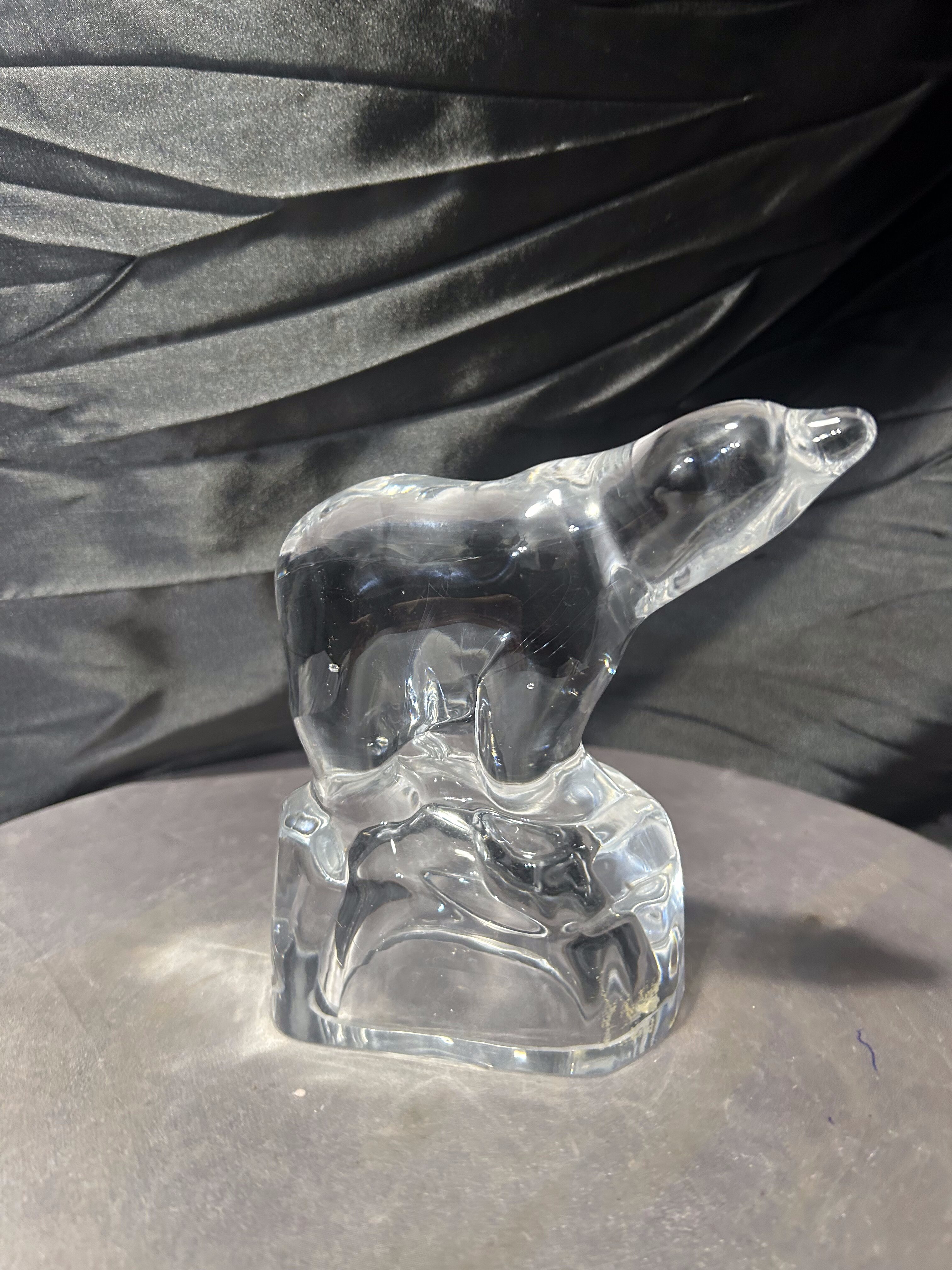 Dekoracyjna figurka przedstawiająca niedźwiedzia wykonana ze szkła artystycznego. Postać zwierzęcia została osadzona na stylizowanej podstawie przypominającej bryłę lodu lub skalną formację, co nadaje kompozycji naturalnego i dynamicznego charakteru.