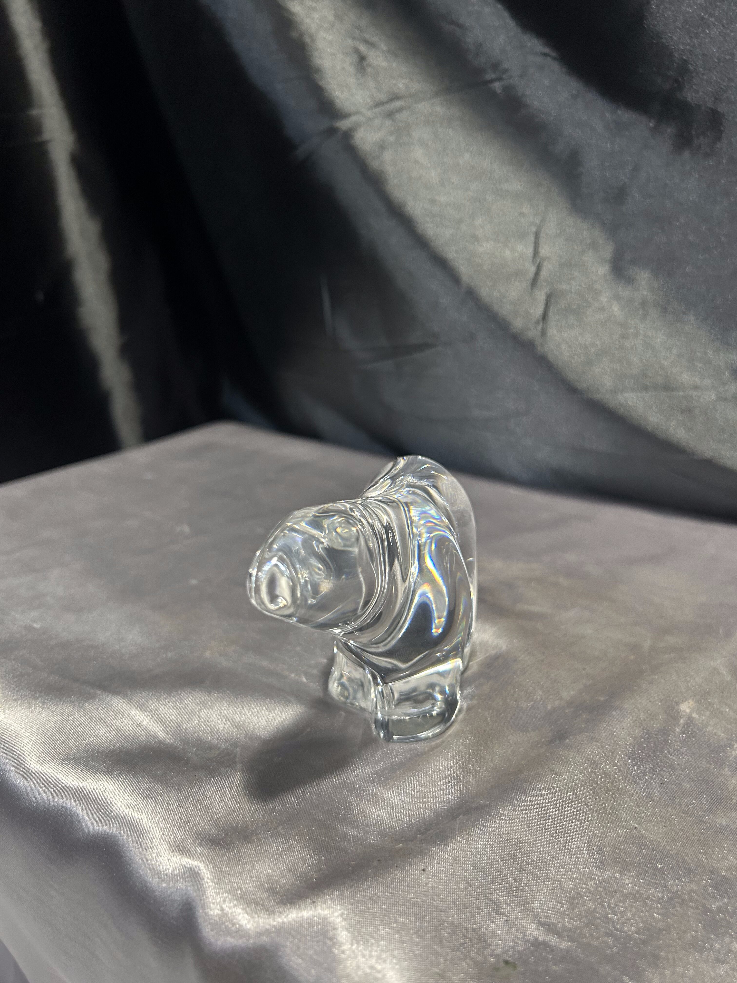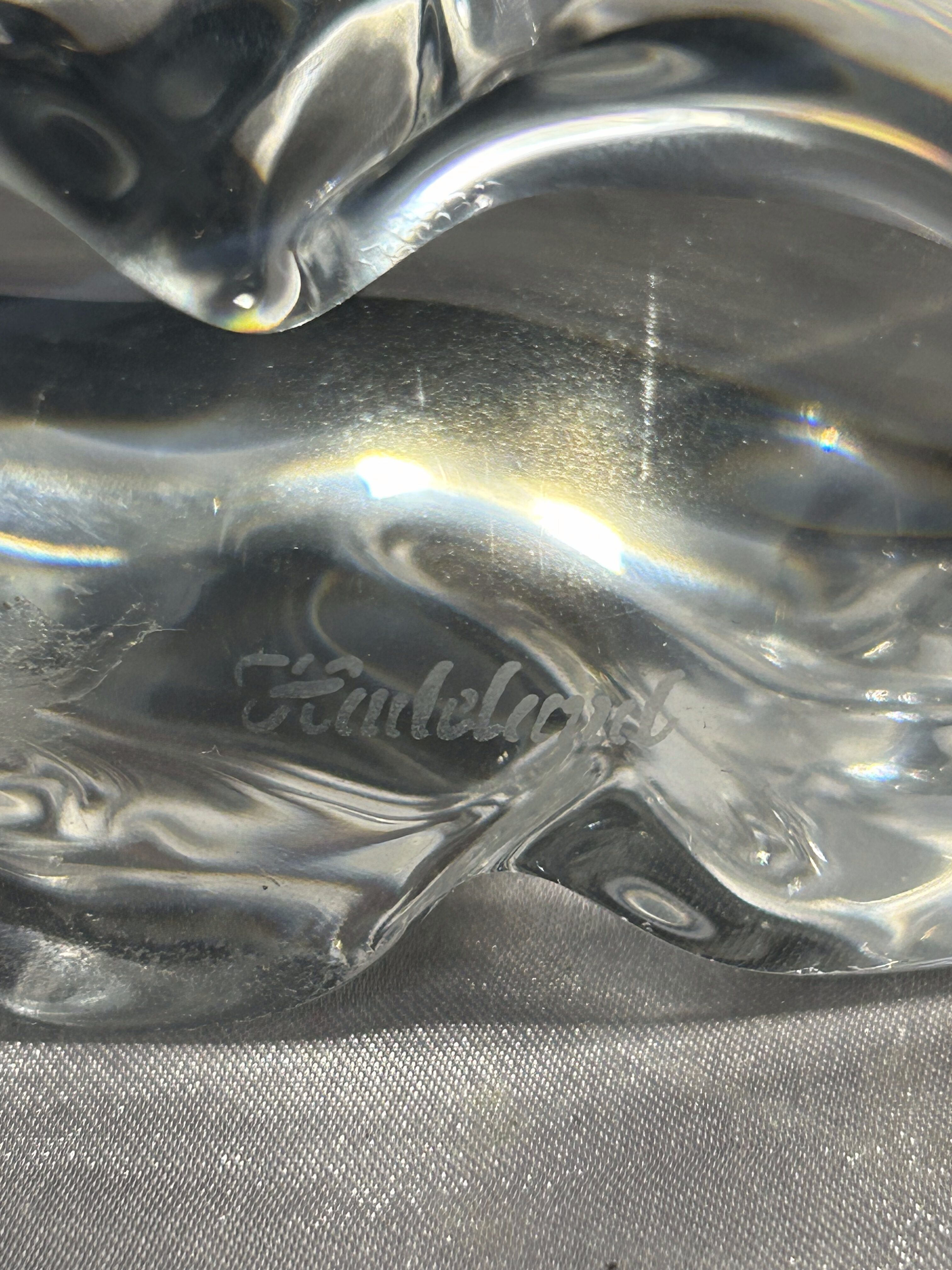 Imponująca figurka niedźwiedzia wykonana z przeźroczystego szkła artystycznego, sygnowana przez prestiżową norweską hutę Hadeland Glassverk. Zwarta, masywna forma doskonale oddaje siłę i majestat zwierzęcia, a gładkie powierzchnie subtelnie załamują światło, podkreślając kunszt ręcznego wykonania.
