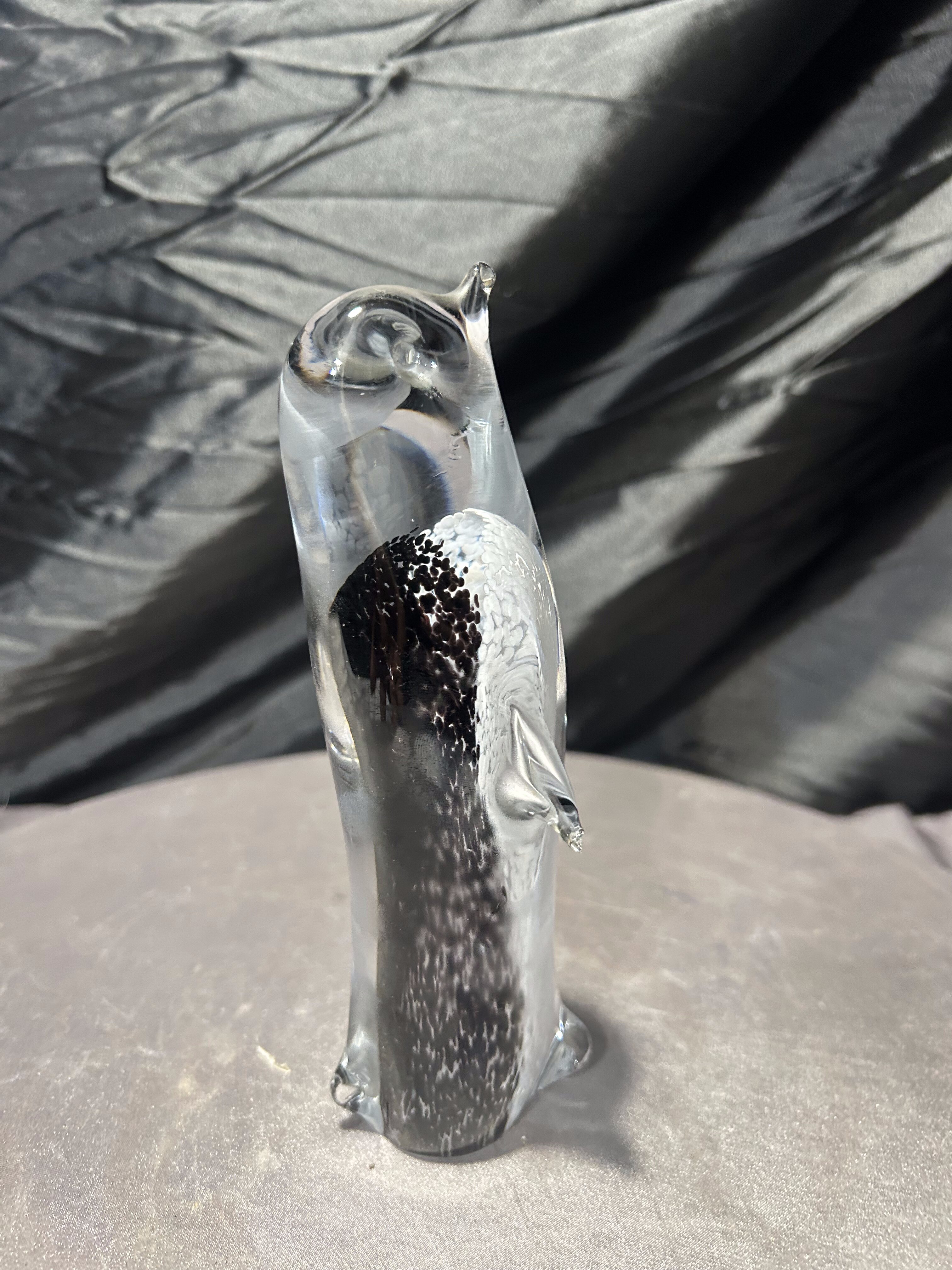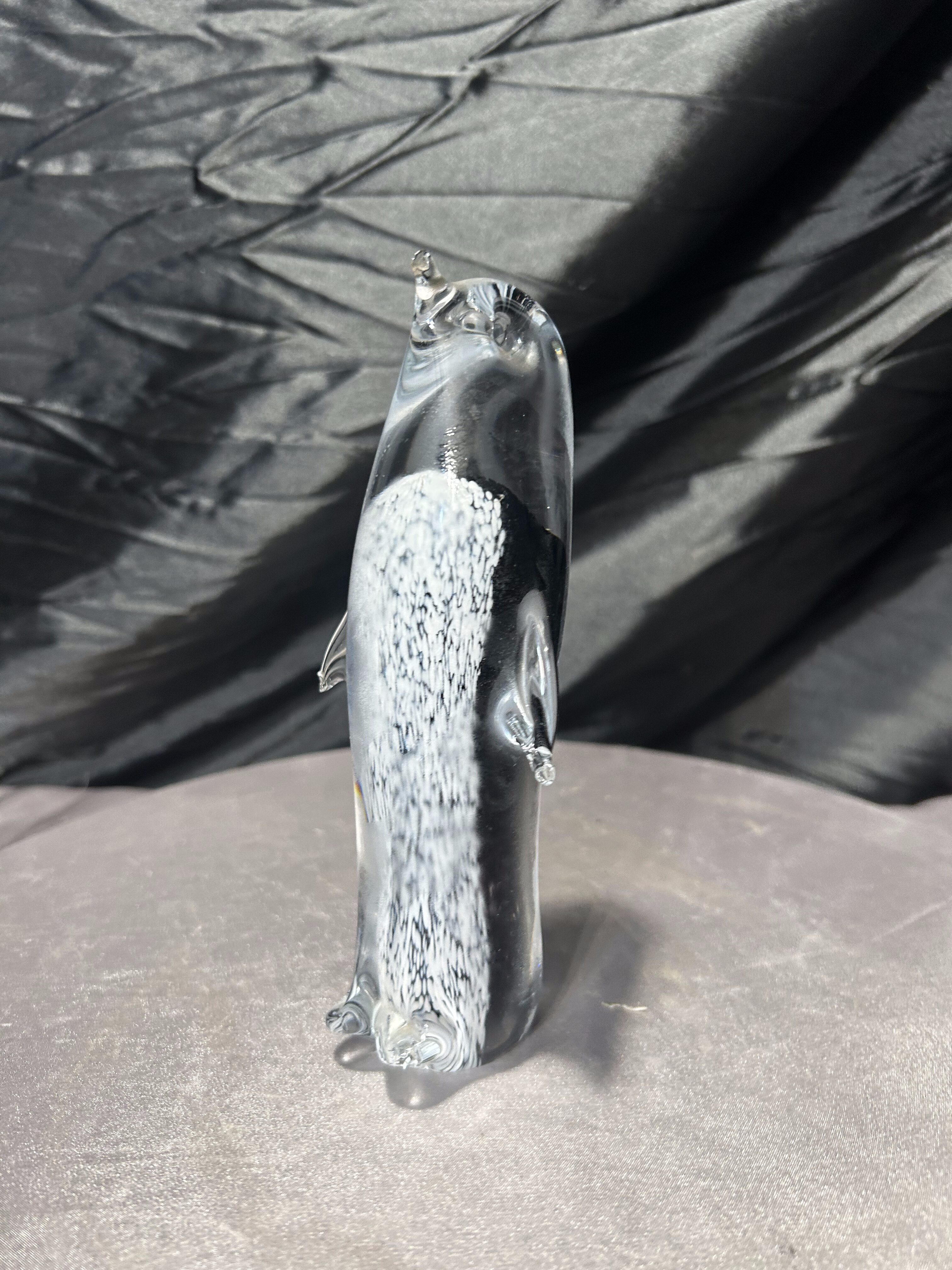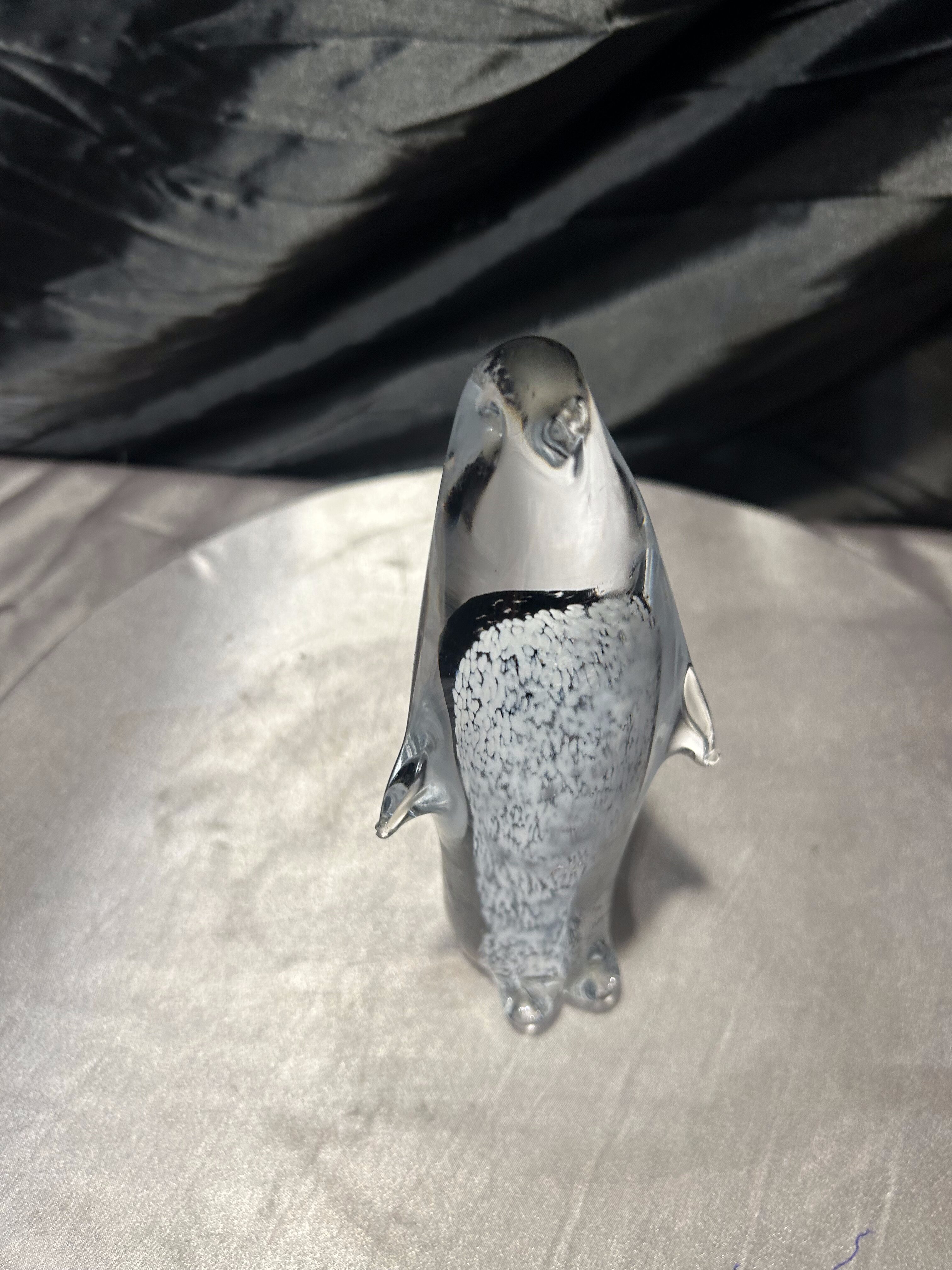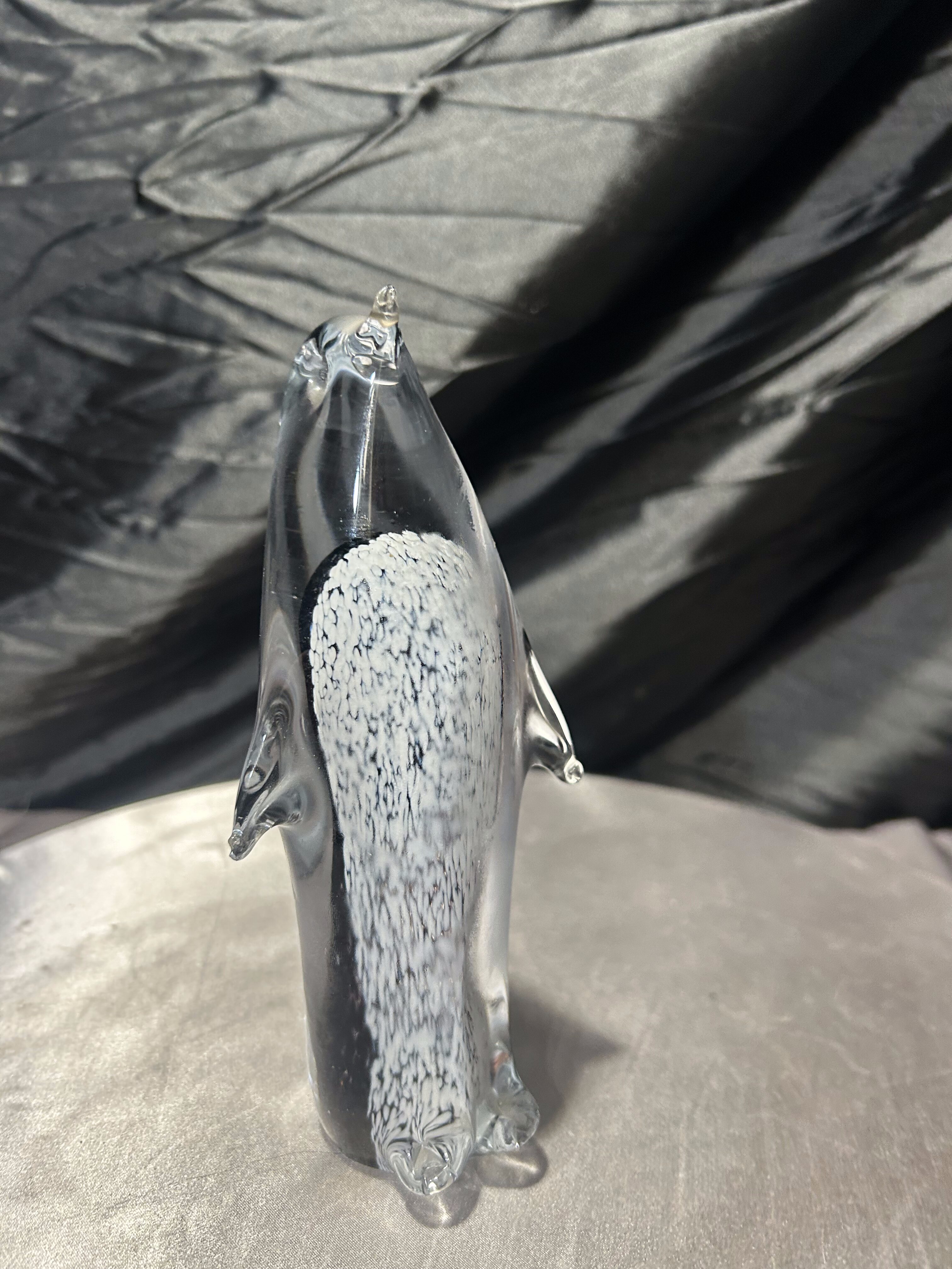Dekoracyjna figurka szklanego pingwina wykonana w technice szkła artystycznego, inspirowanej stylem Murano. Smukła, dynamiczna forma połączona została z charakterystycznym, mleczno-nakrapianym wnętrzem, zatopionym w przejrzystym szkle. Całość sprawia wrażenie lekkości i elegancji, typowej dla dekoracyjnych figurek szklanych z drugiej połowy XX wieku.