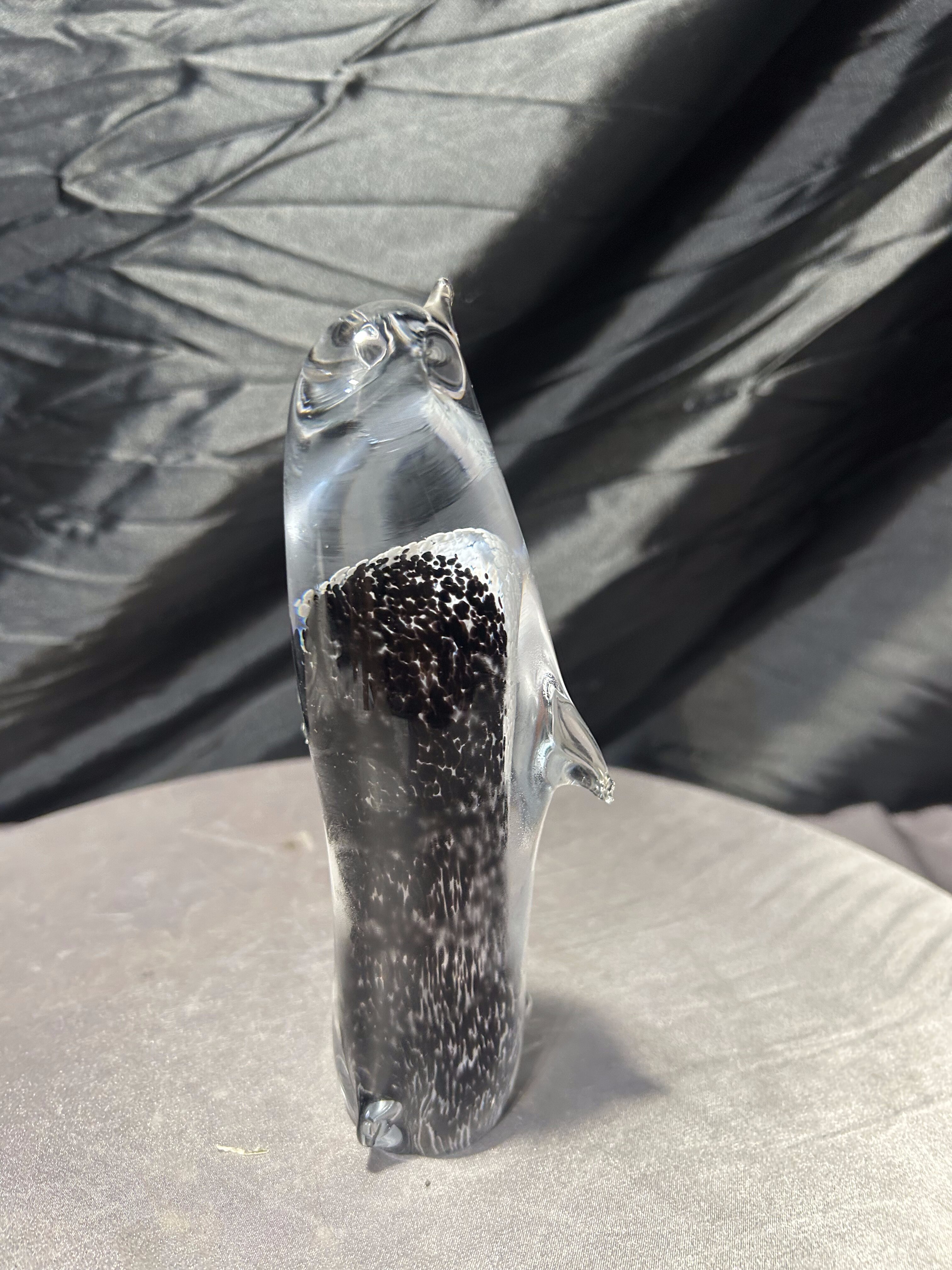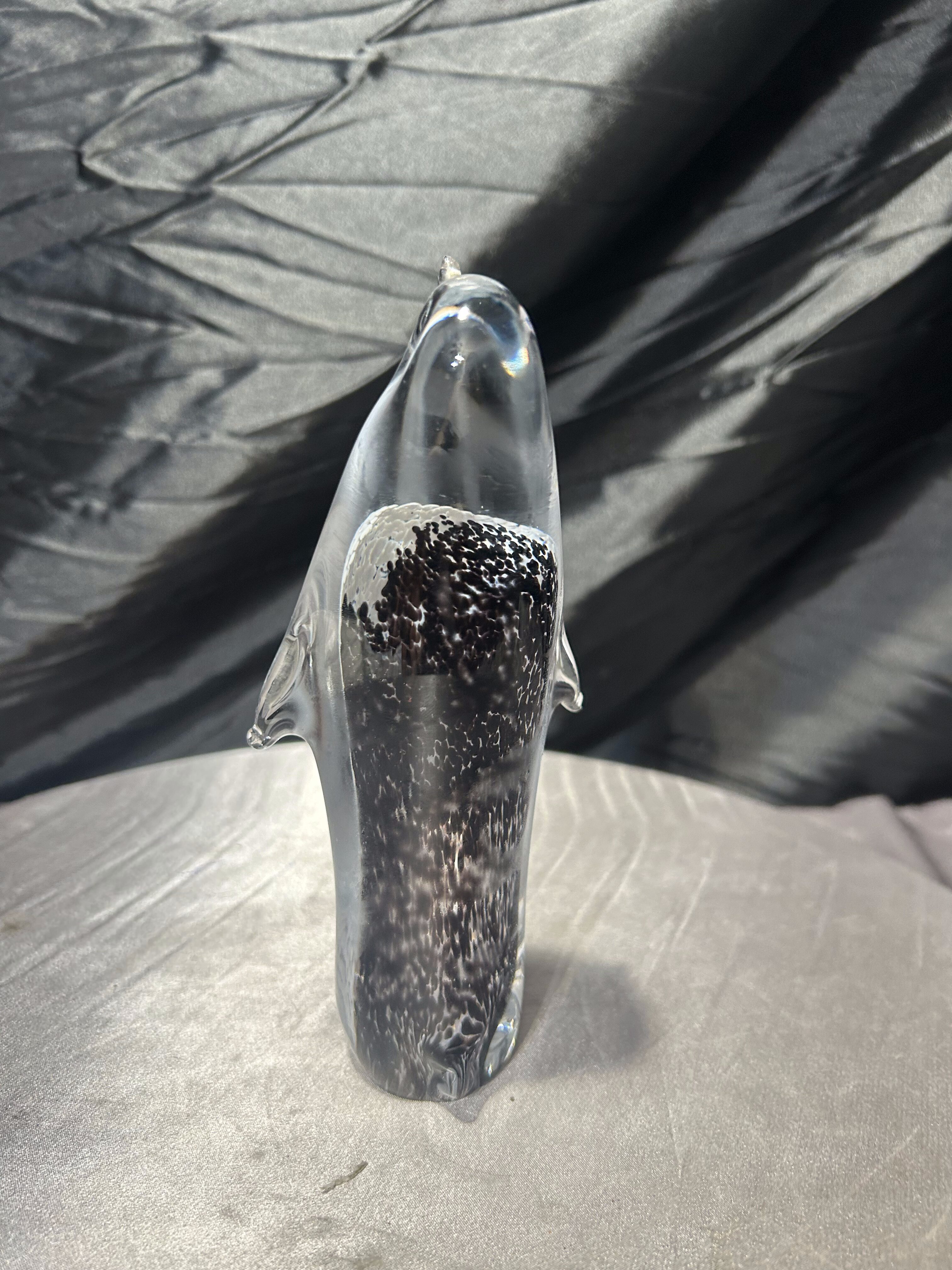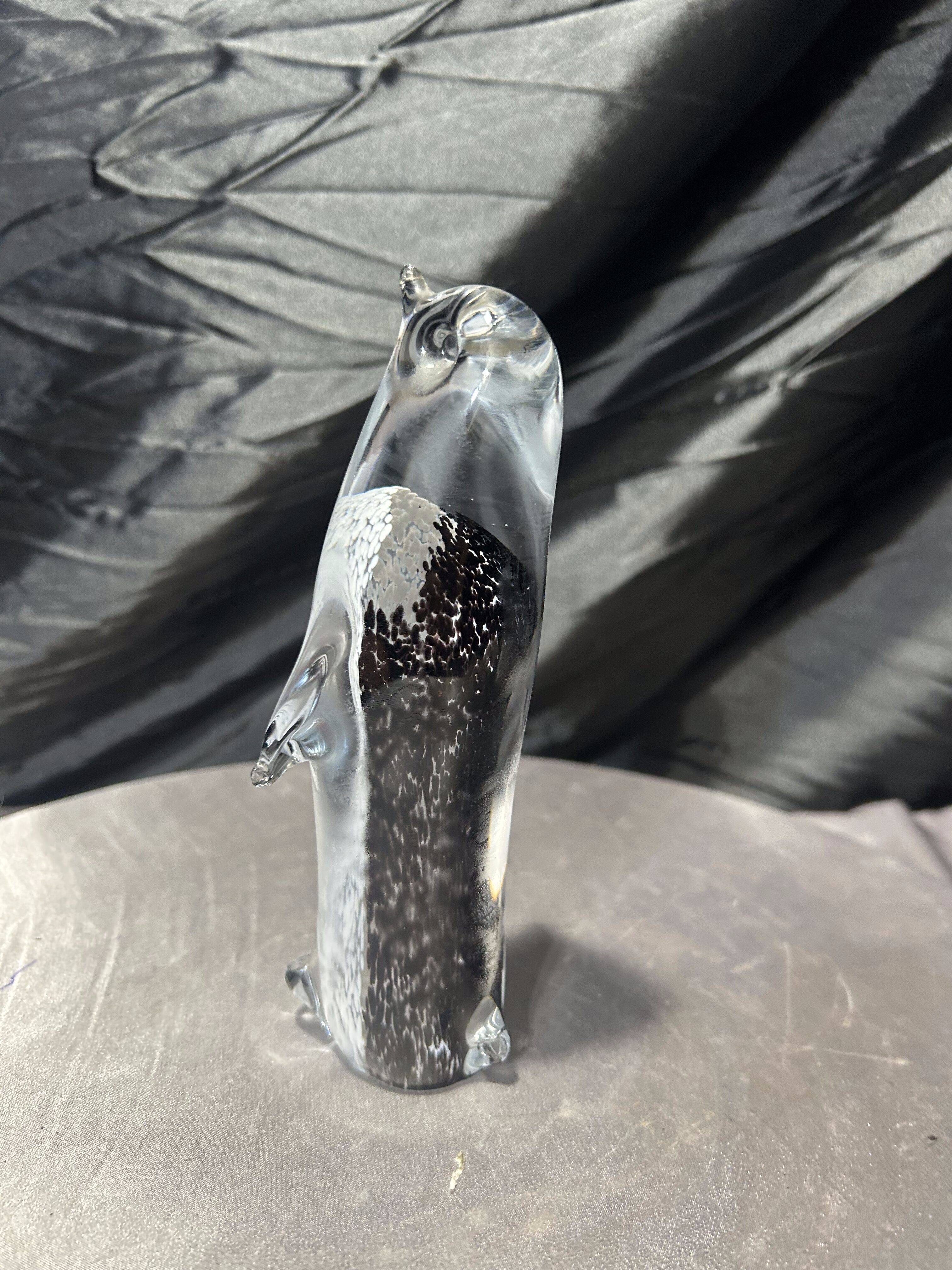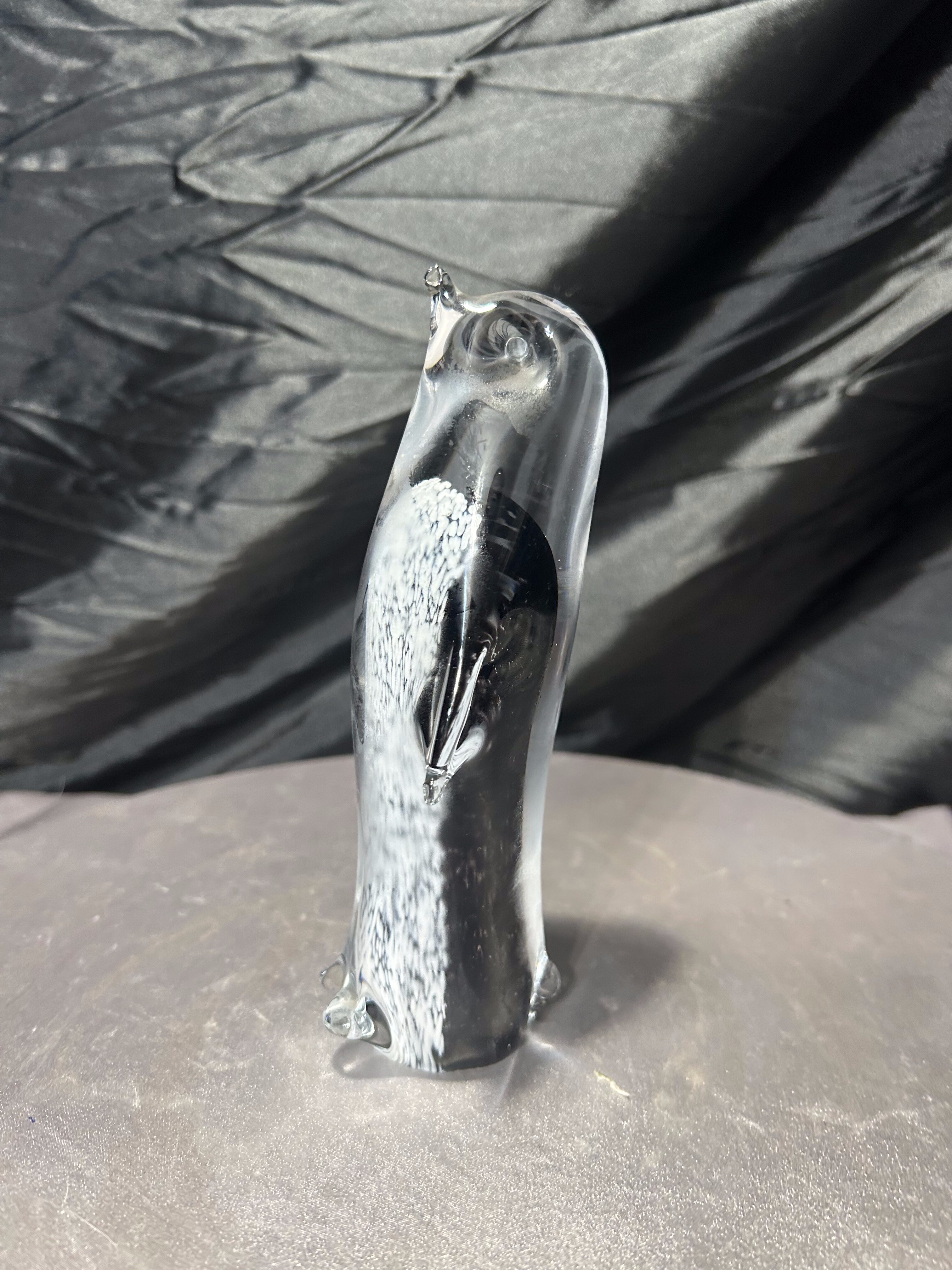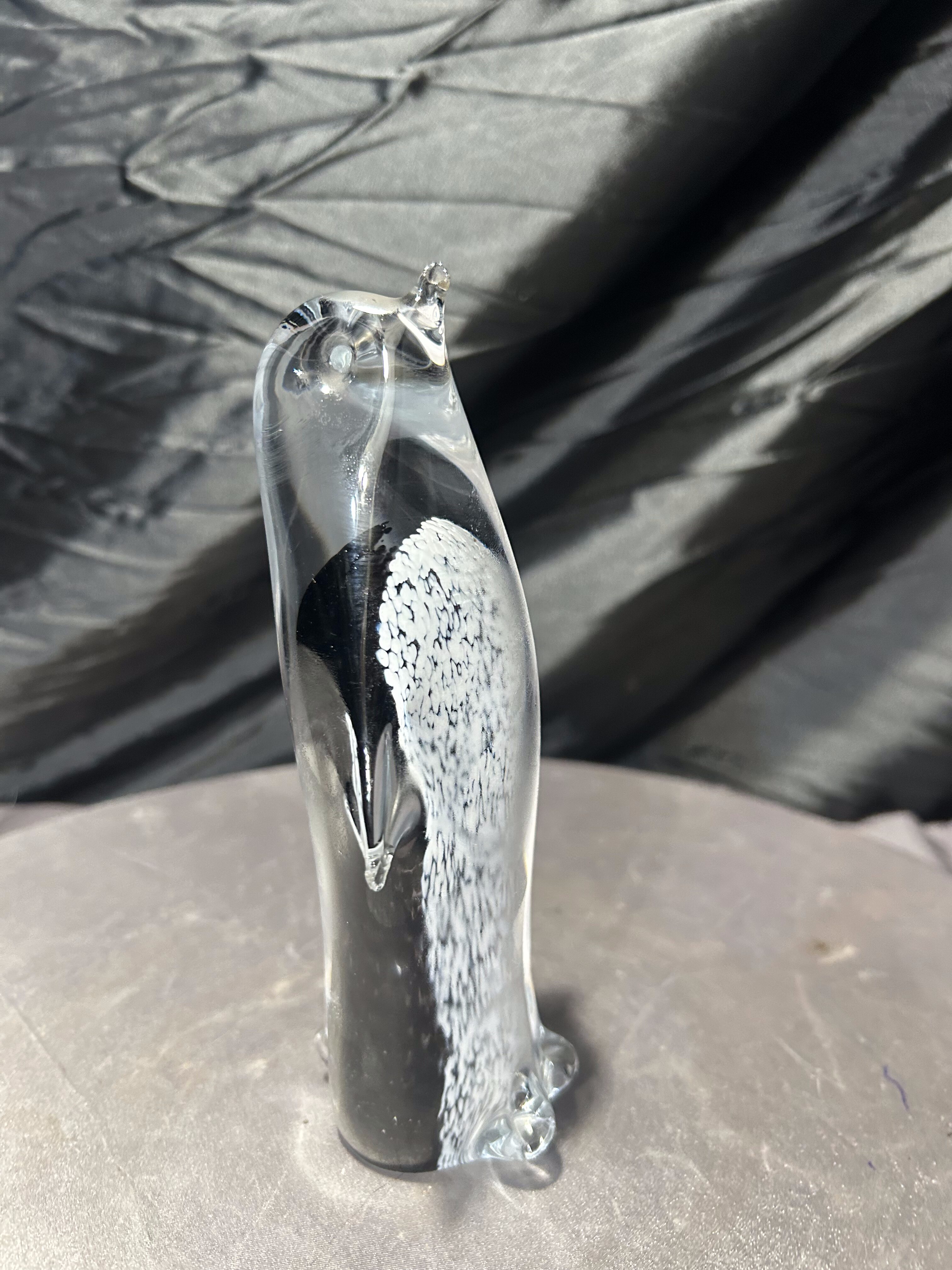Dekoracyjna figurka szklanego pingwina wykonana w technice szkła artystycznego, inspirowanej stylem Murano. Smukła, dynamiczna forma połączona została z charakterystycznym, mleczno-nakrapianym wnętrzem, zatopionym w przejrzystym szkle. Całość sprawia wrażenie lekkości i elegancji, typowej dla dekoracyjnych figurek szklanych z drugiej połowy XX wieku.