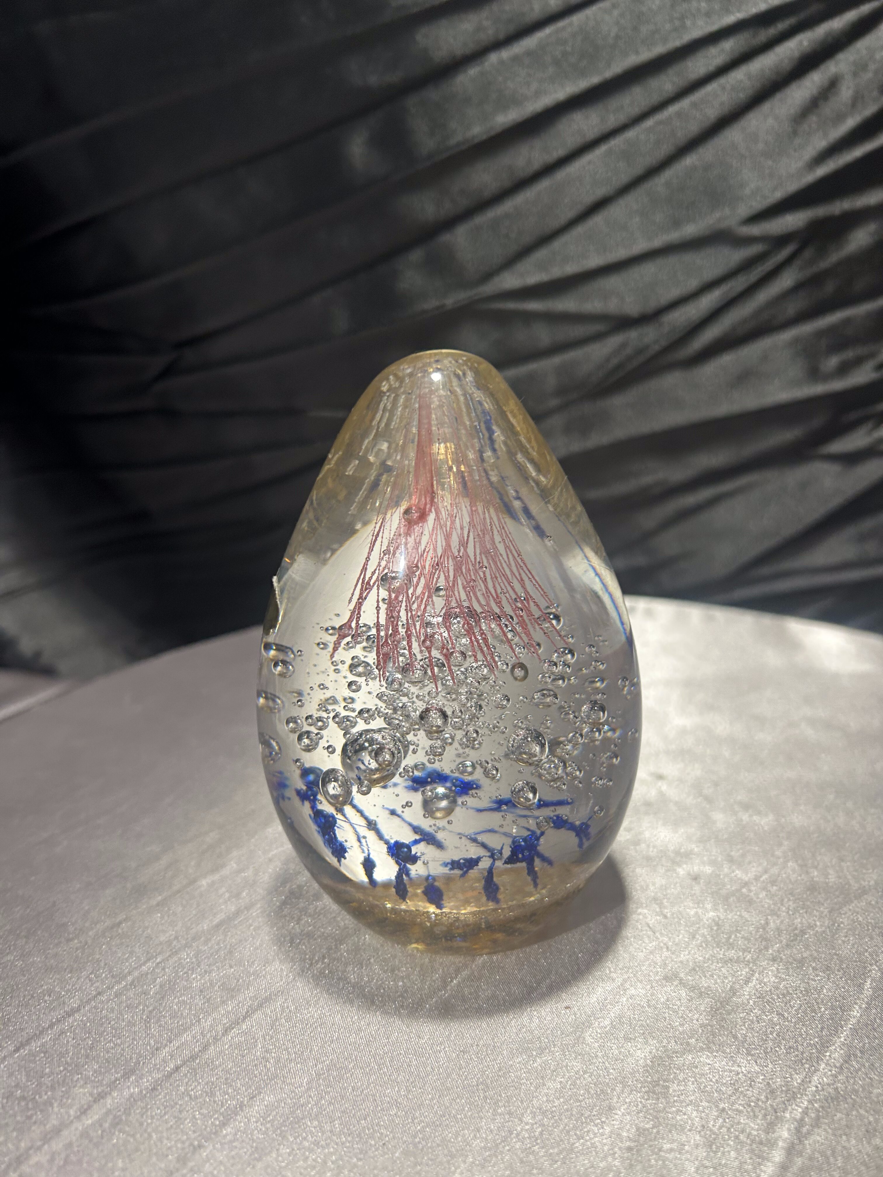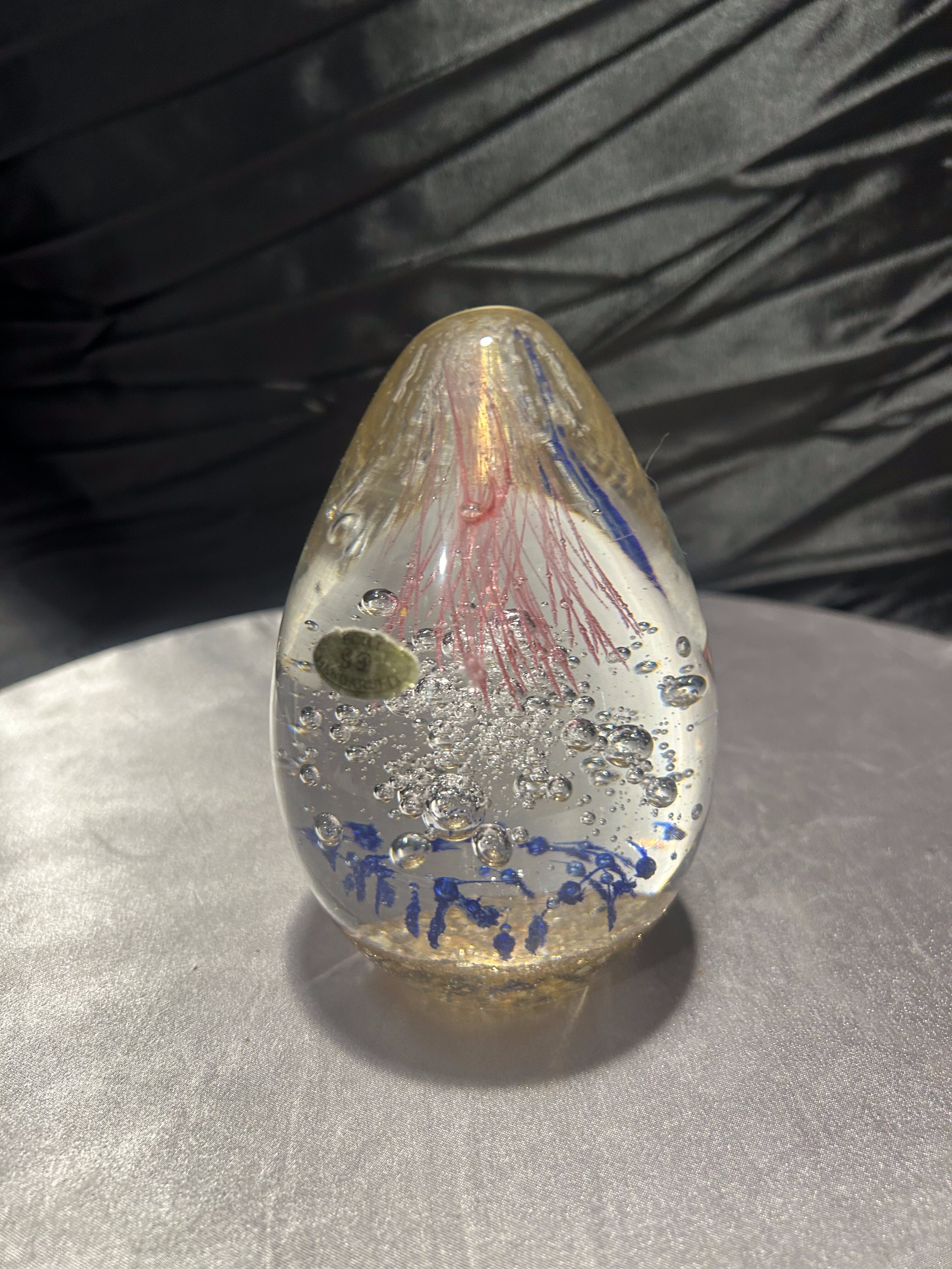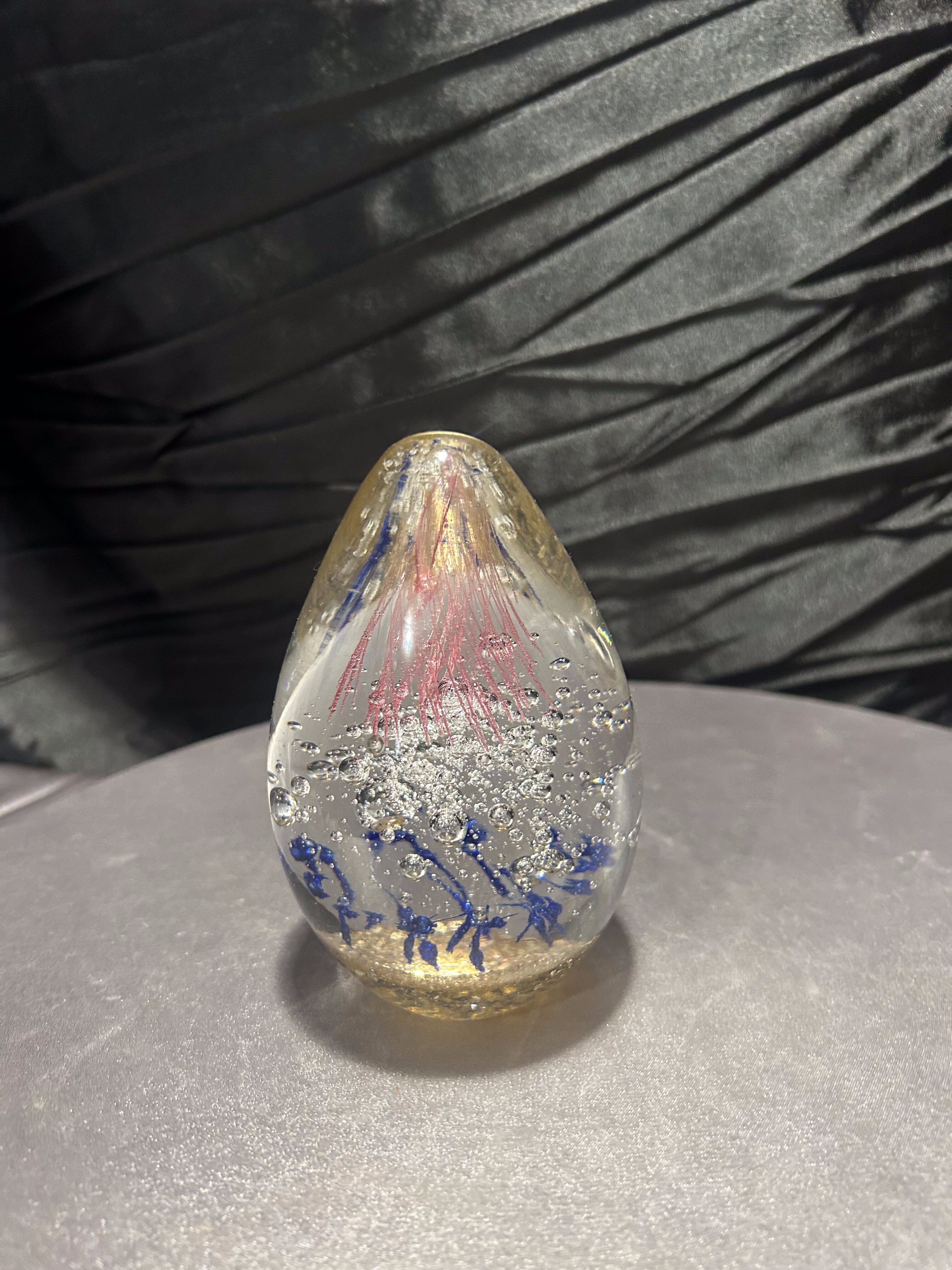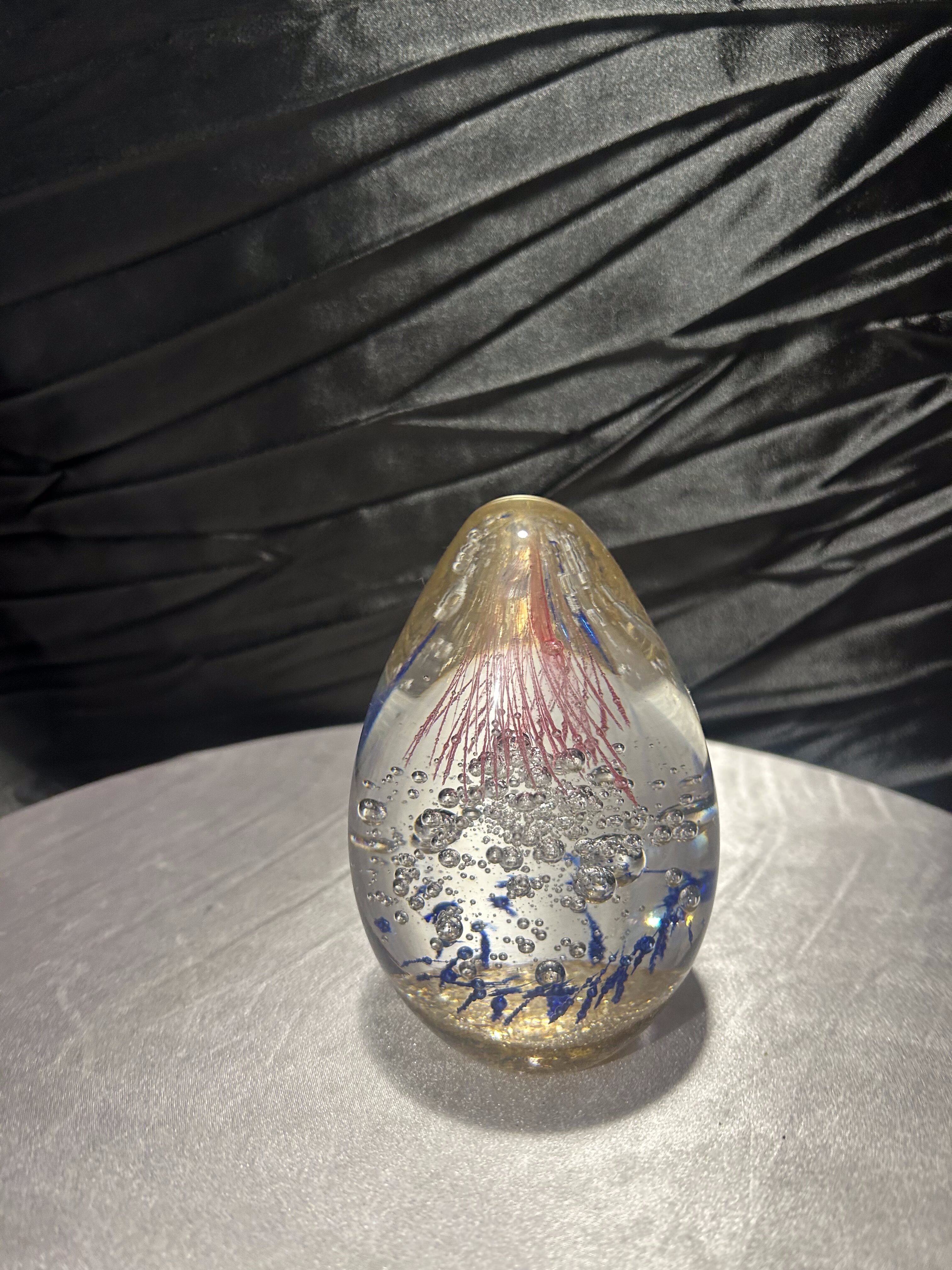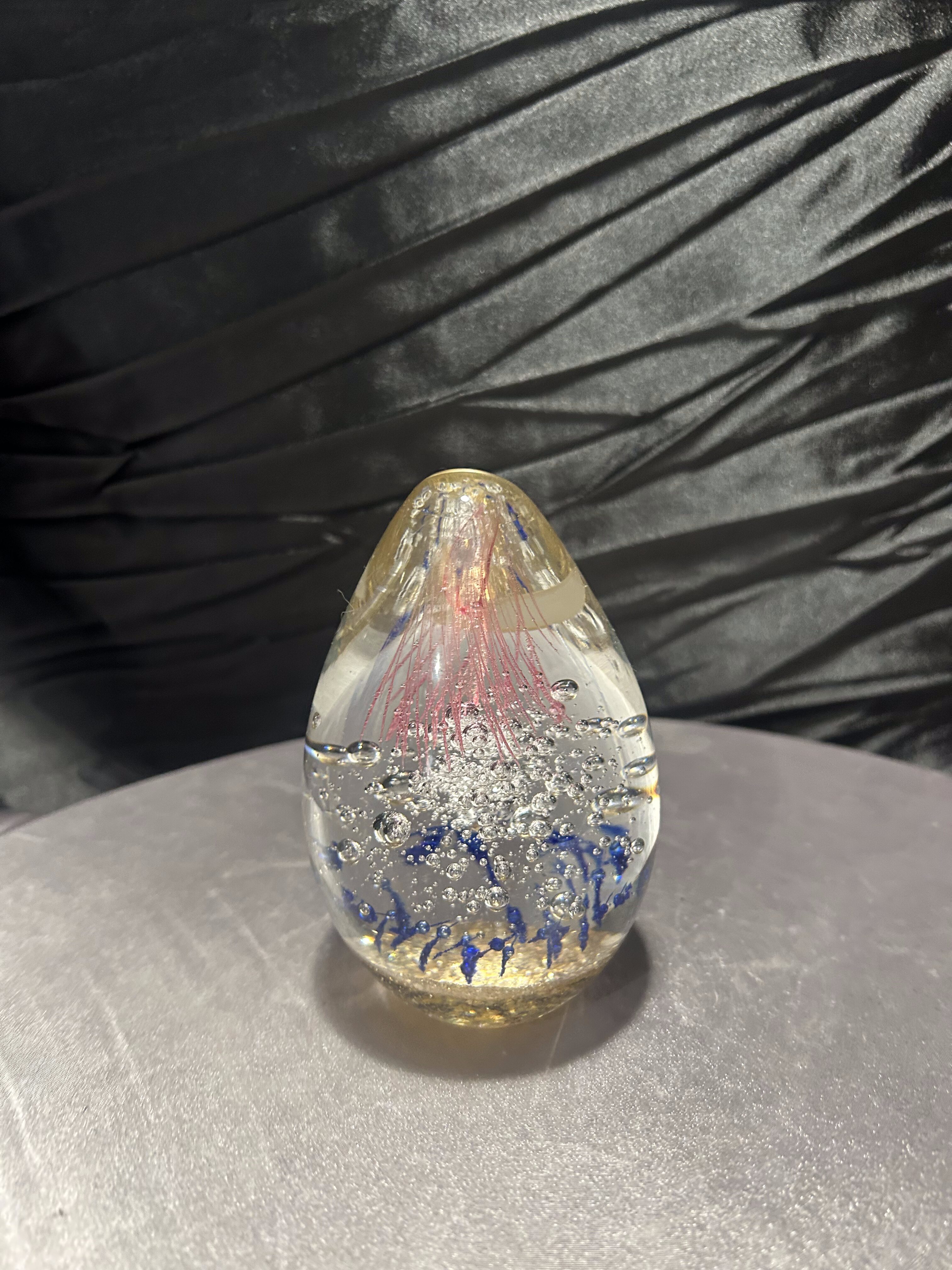 Oferuję wyjątkowy przycisk do papieru wykonany z ręcznie formowanego szkła artystycznego. Wnętrze zdobią misternie zatopione kolorowe elementy – różowe pasma szkła przypominające morskie meduzy, drobne niebieskie akcenty oraz regularnie rozmieszczone bąbelki powietrza, które tworzą efekt głębi.