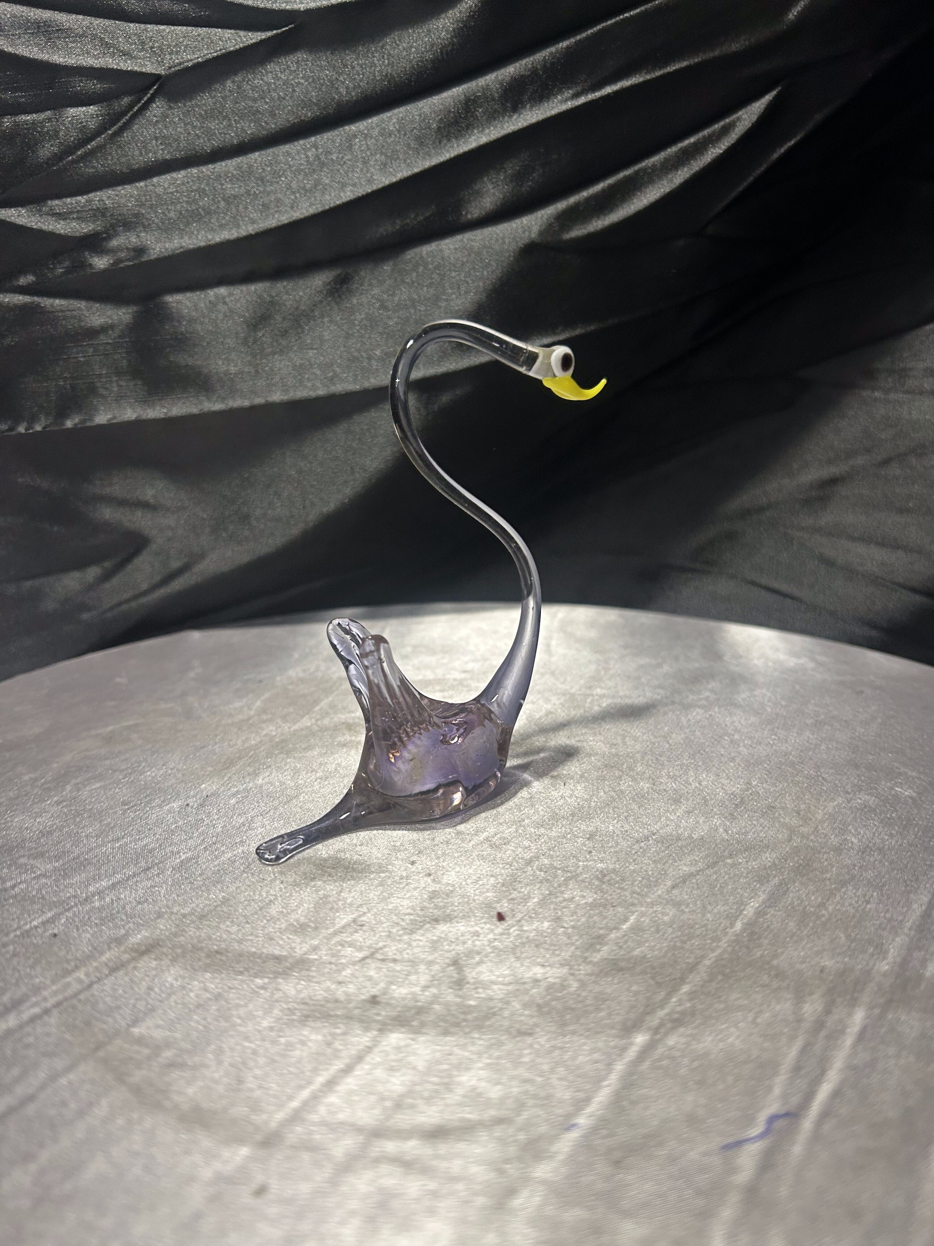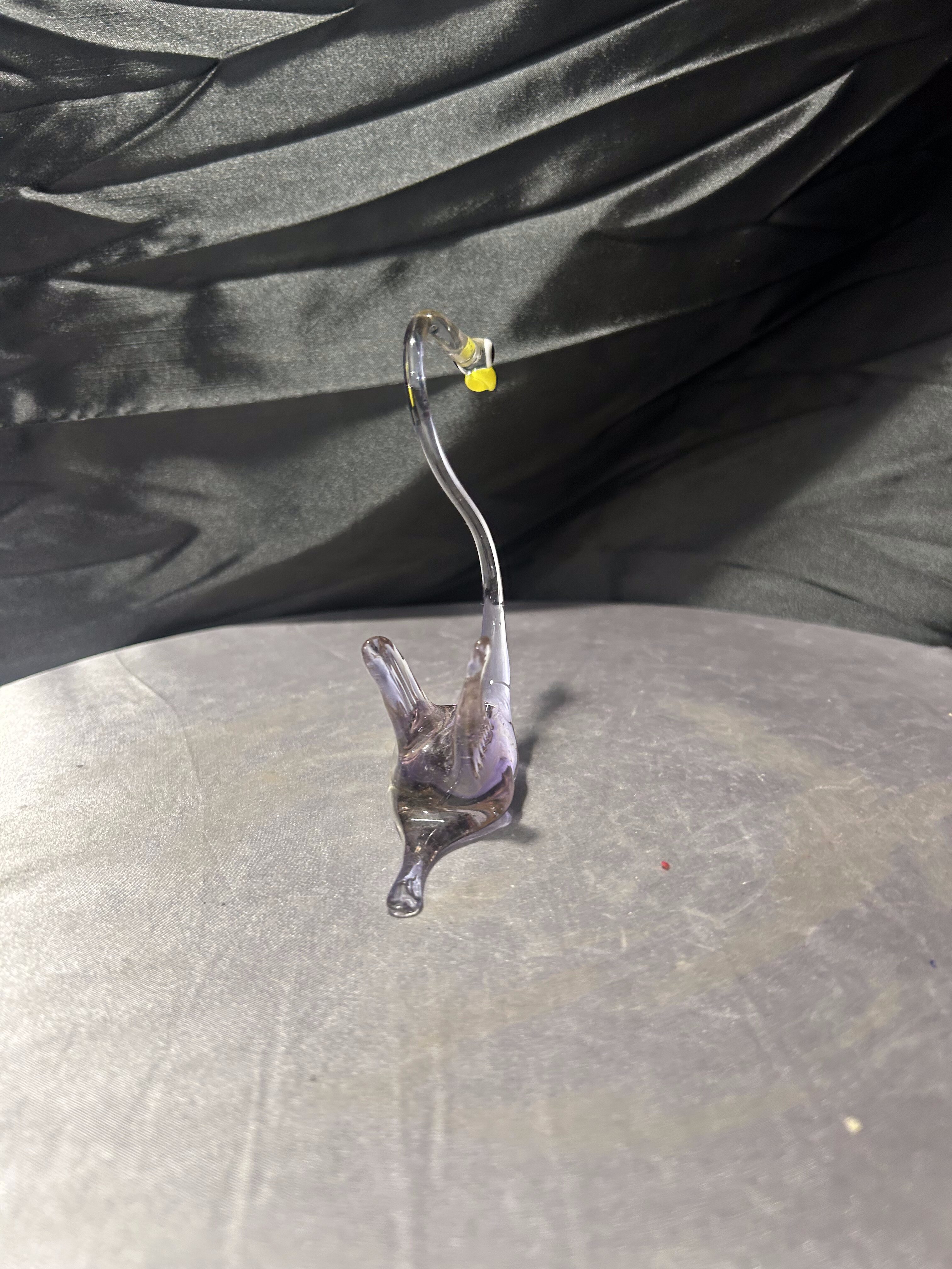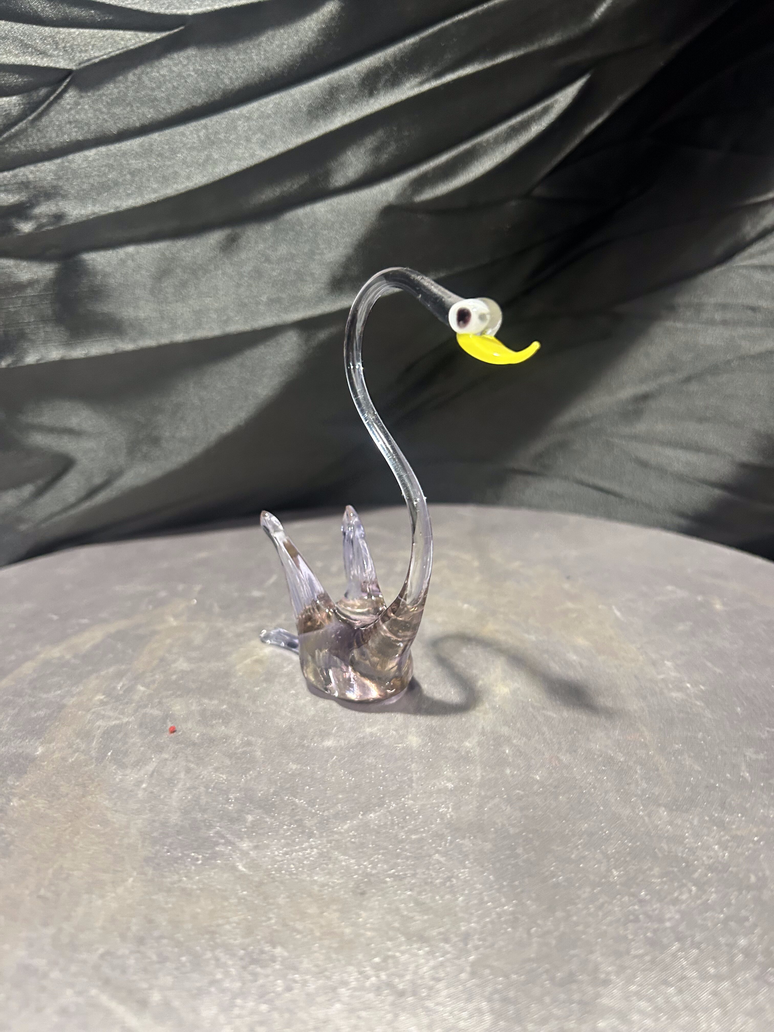 Elegancka figurka ptaka wykonana ze szkła artystycznego o smukłej, finezyjnie wygiętej szyi. Transparentne szkło z delikatnym, lekko przydymionym odcieniem subtelnie załamuje światło, podkreślając lekkość i płynność formy. Kontrastujący, żółty dziób oraz ciemne oko nadają figurce wyrazistości i charakteru.