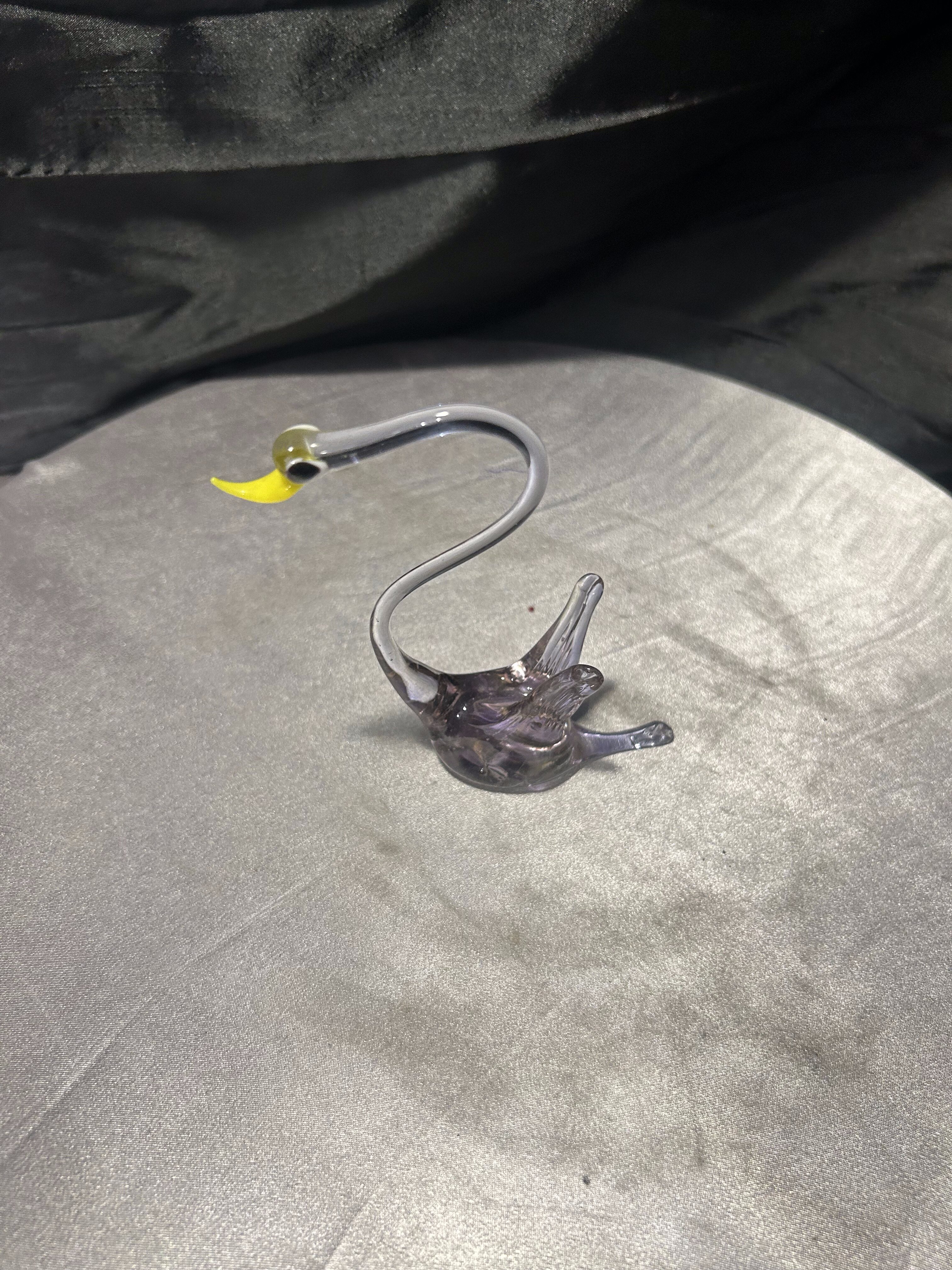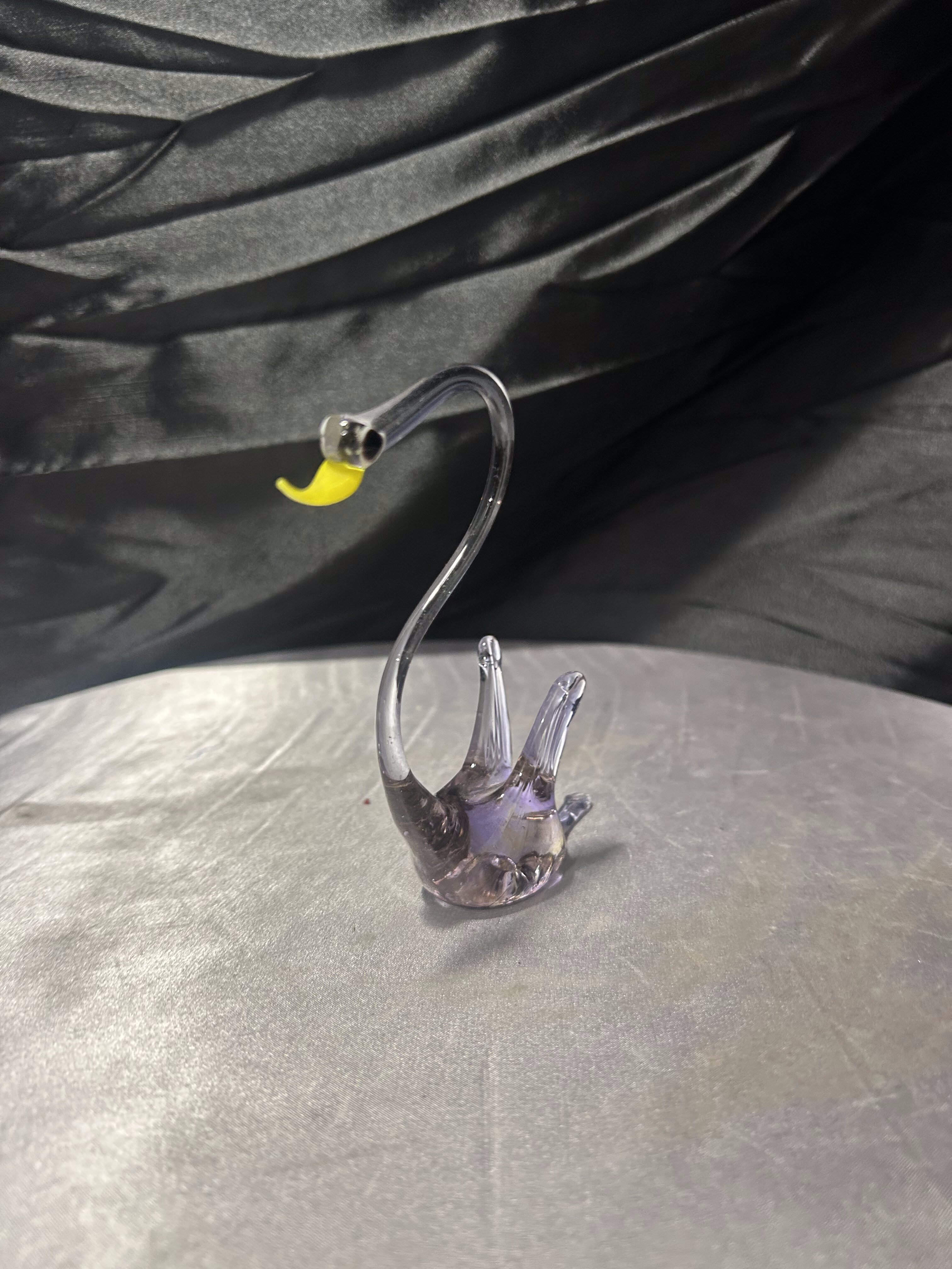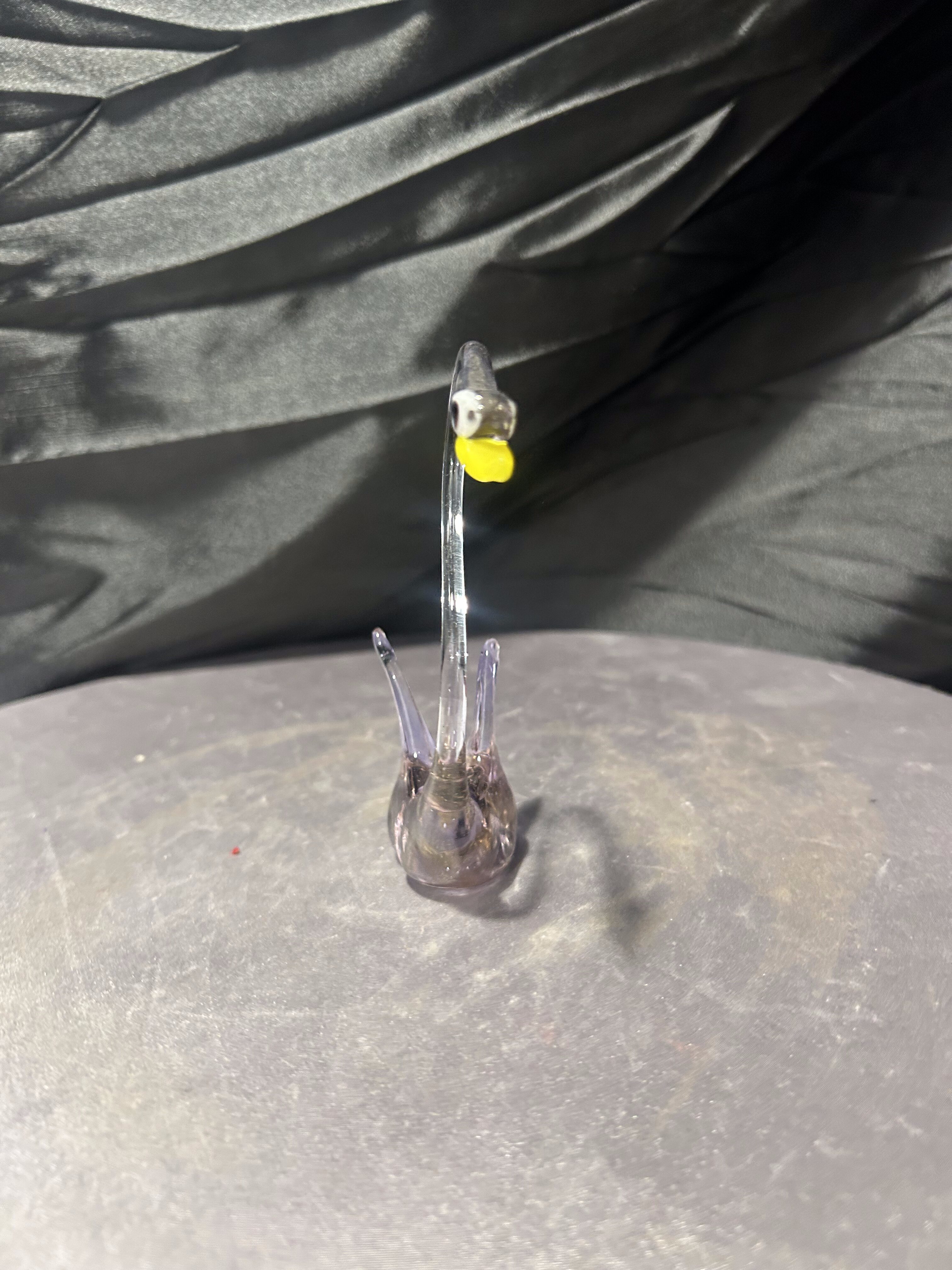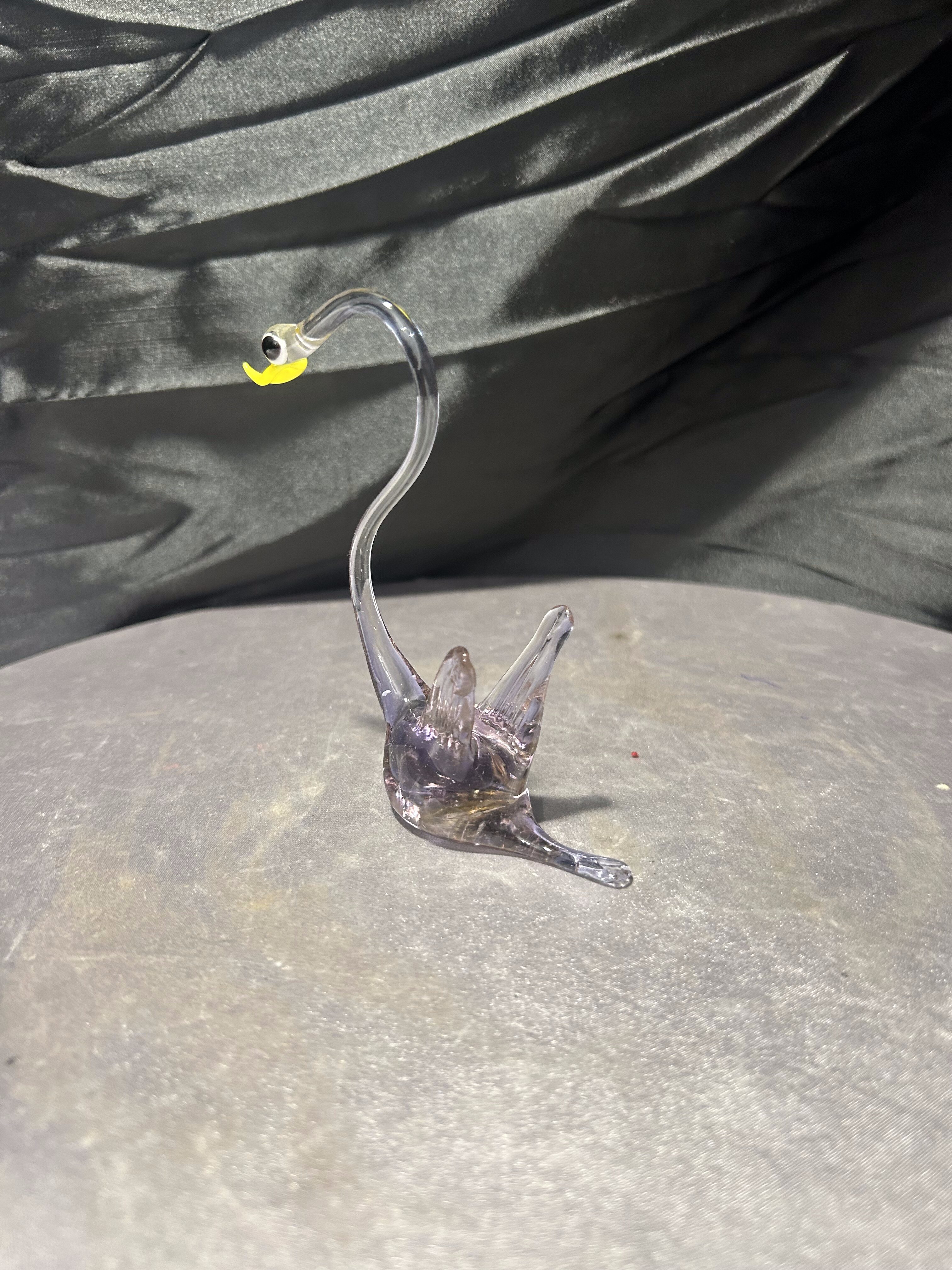 Elegancka figurka ptaka wykonana ze szkła artystycznego o smukłej, finezyjnie wygiętej szyi. Transparentne szkło z delikatnym, lekko przydymionym odcieniem subtelnie załamuje światło, podkreślając lekkość i płynność formy. Kontrastujący, żółty dziób oraz ciemne oko nadają figurce wyrazistości i charakteru.