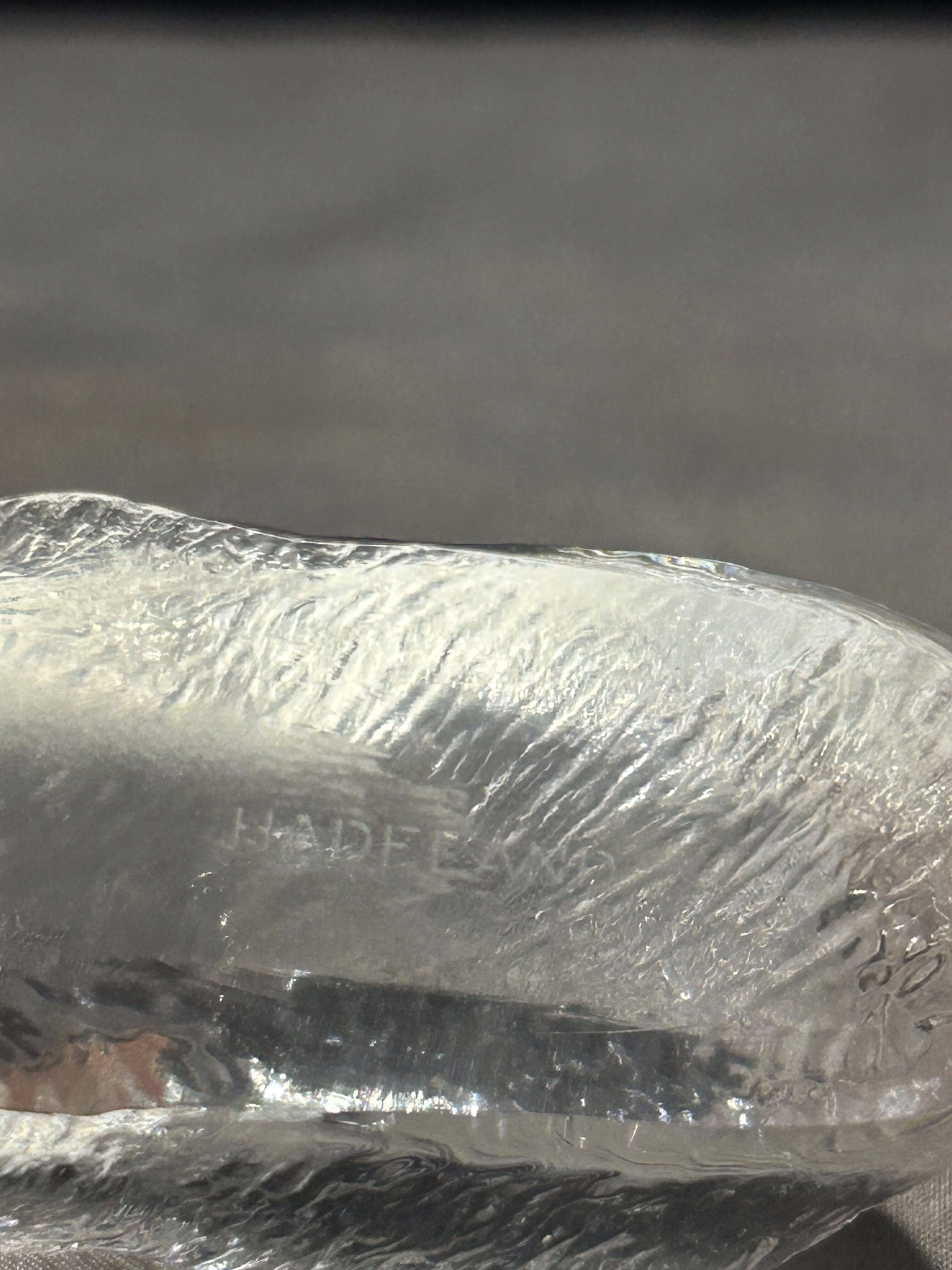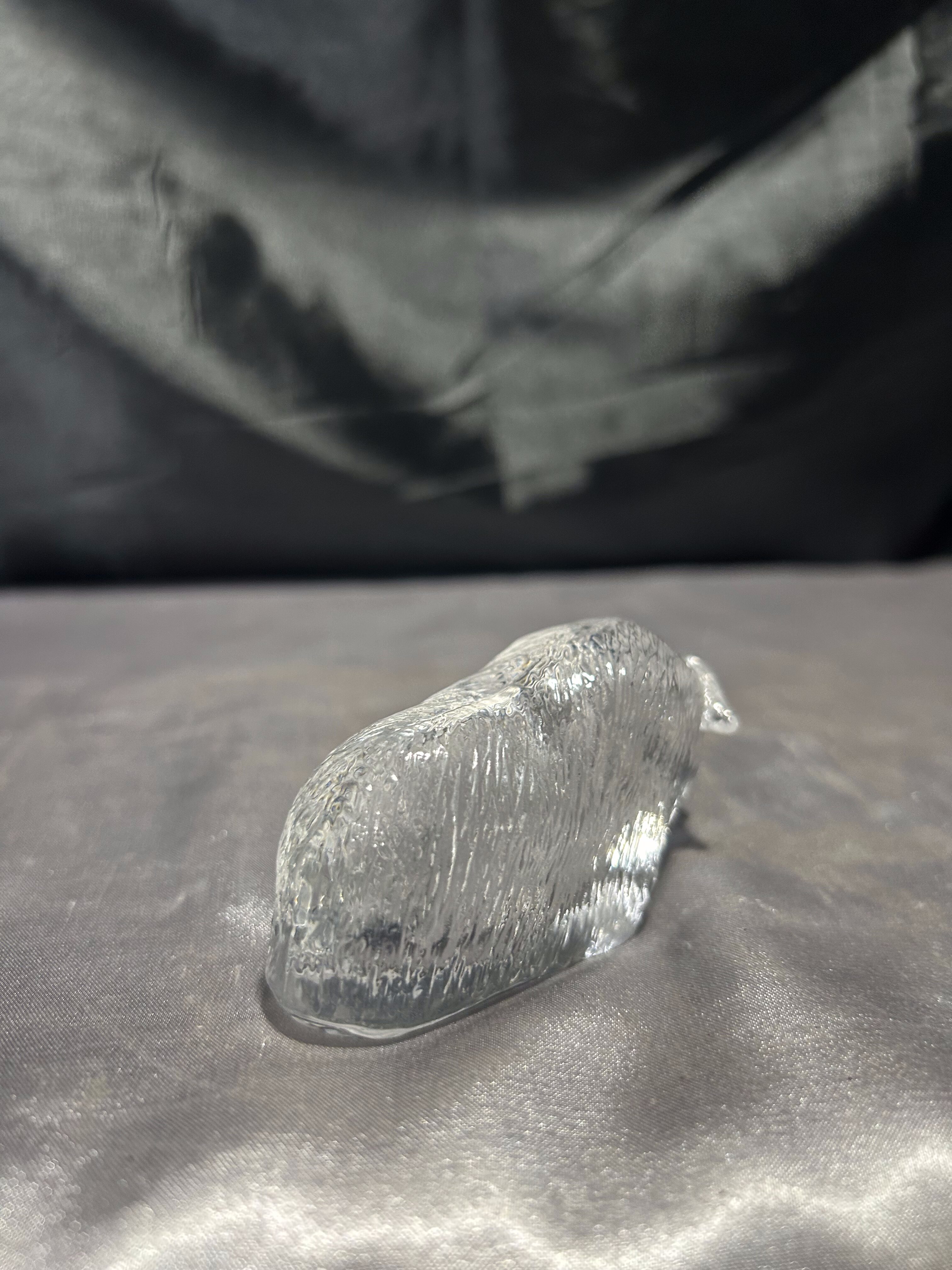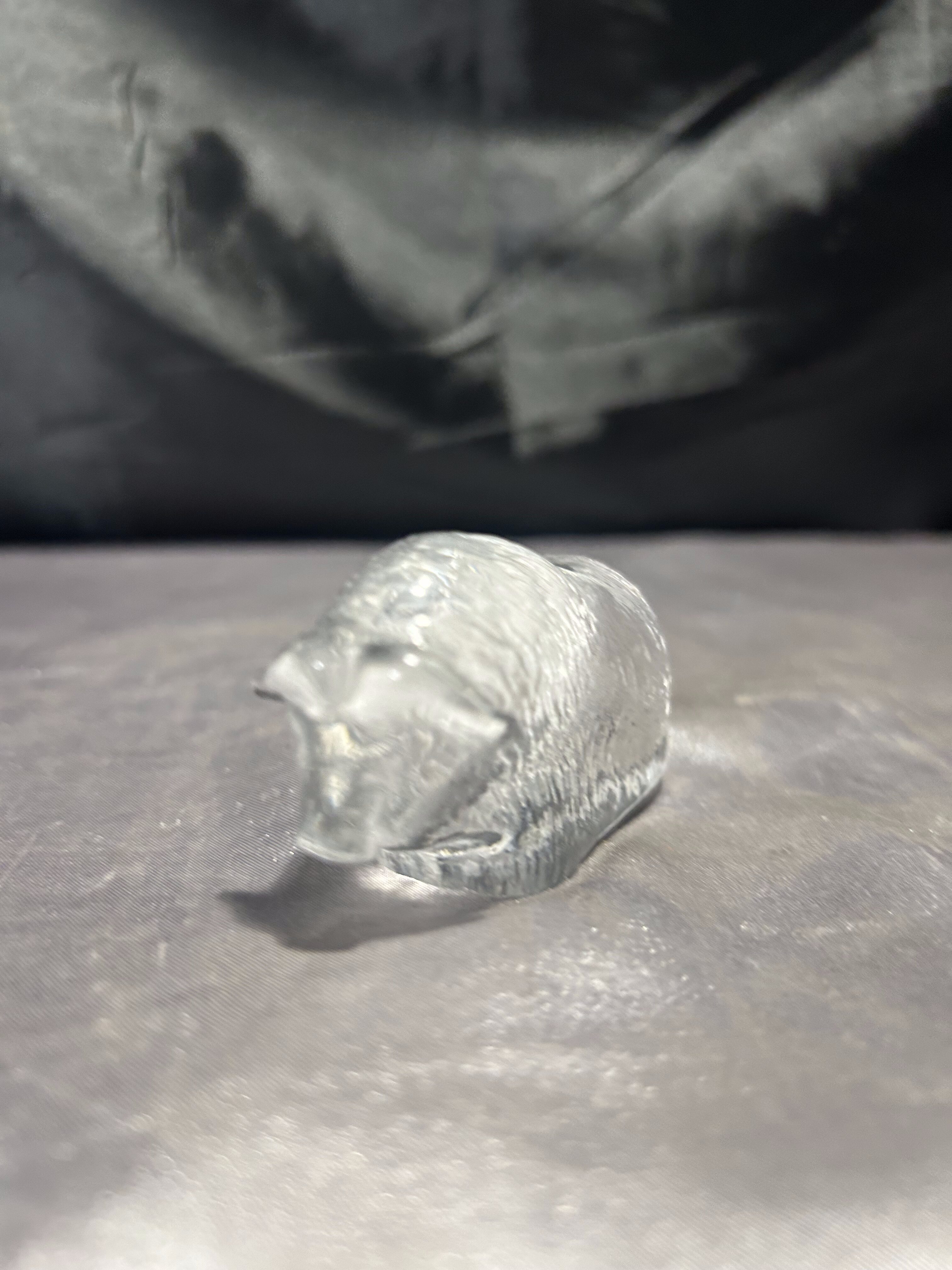 Rzadko spotykana figurka żubra wykonana z przeźroczystego szkła artystycznego, sygnowana przez renomowaną norweską hutę Hadeland Glassverk. Zwarta forma, uproszczone linie i precyzyjne modelowanie nadają tej niewielkiej rzeźbie wyjątkowego charakteru – siła i spokój zamknięte w delikatnej, szklanej bryle.