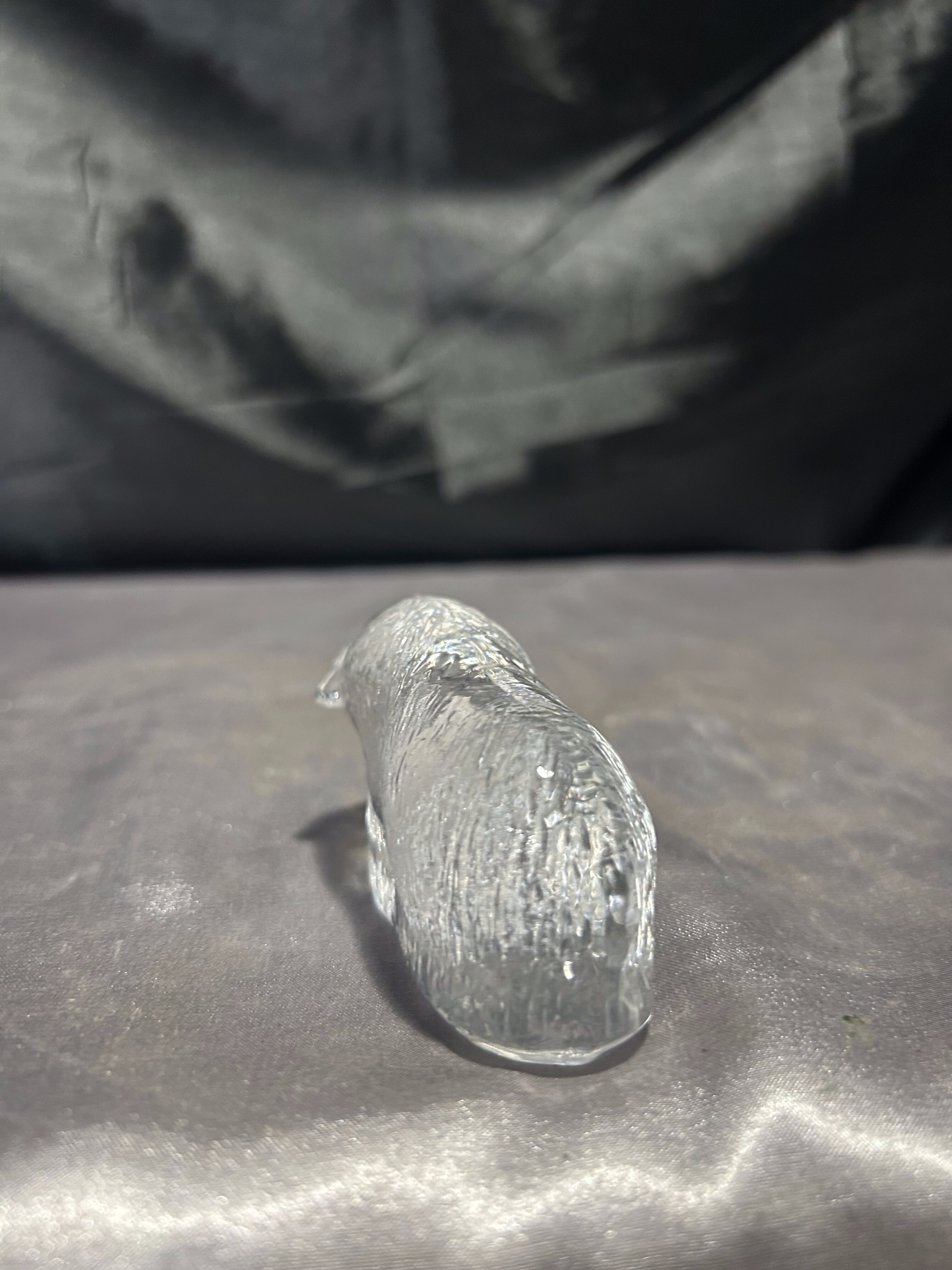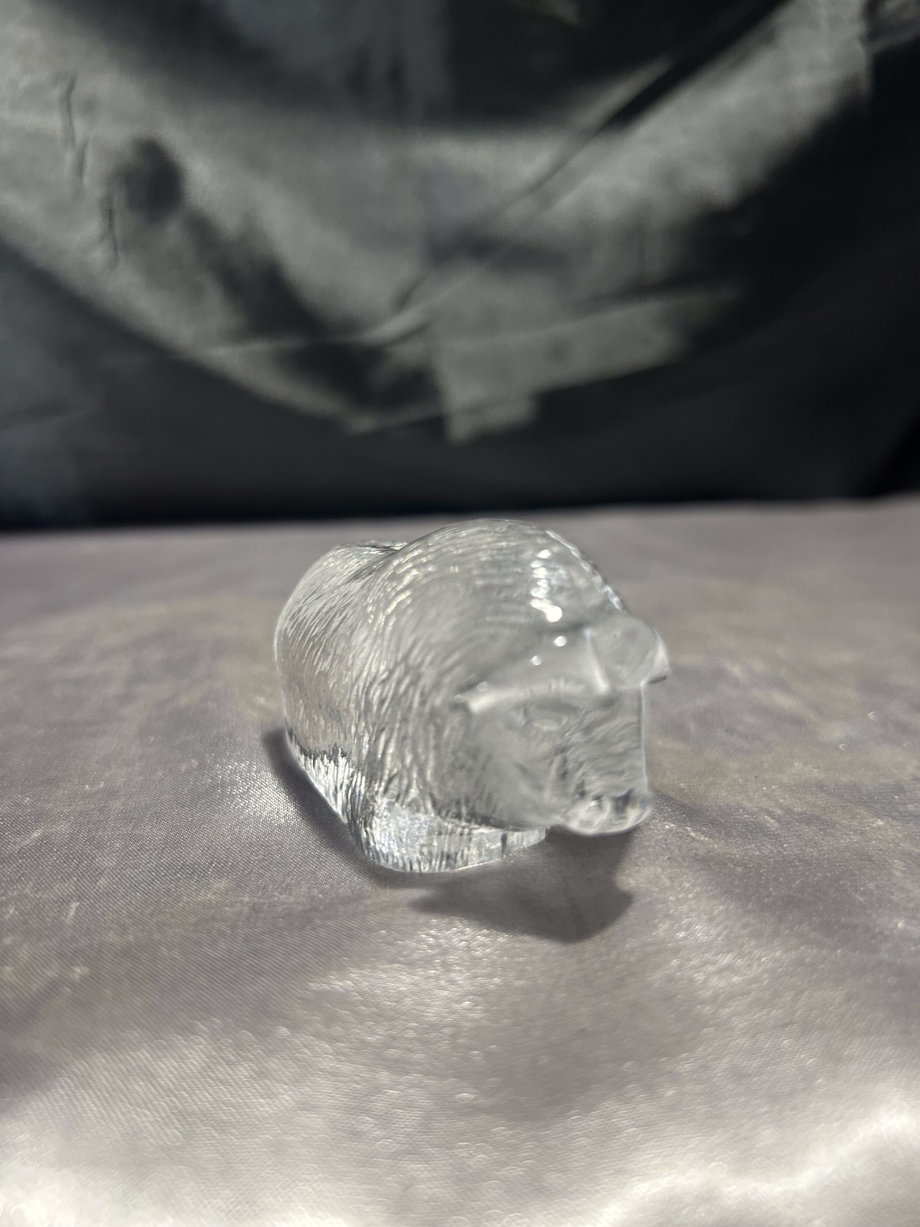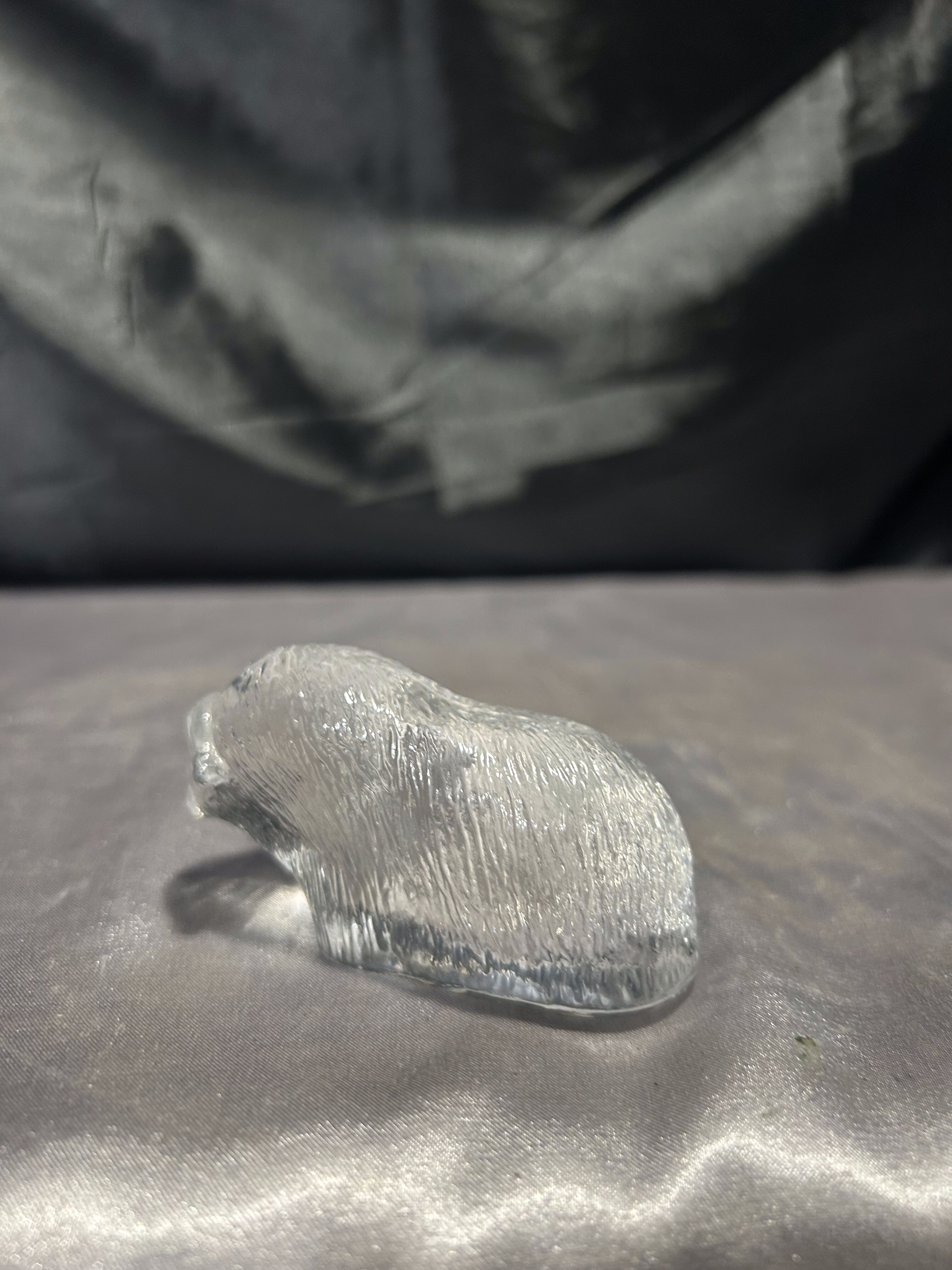 Rzadko spotykana figurka żubra wykonana z przeźroczystego szkła artystycznego, sygnowana przez renomowaną norweską hutę Hadeland Glassverk. Zwarta forma, uproszczone linie i precyzyjne modelowanie nadają tej niewielkiej rzeźbie wyjątkowego charakteru – siła i spokój zamknięte w delikatnej, szklanej bryle.