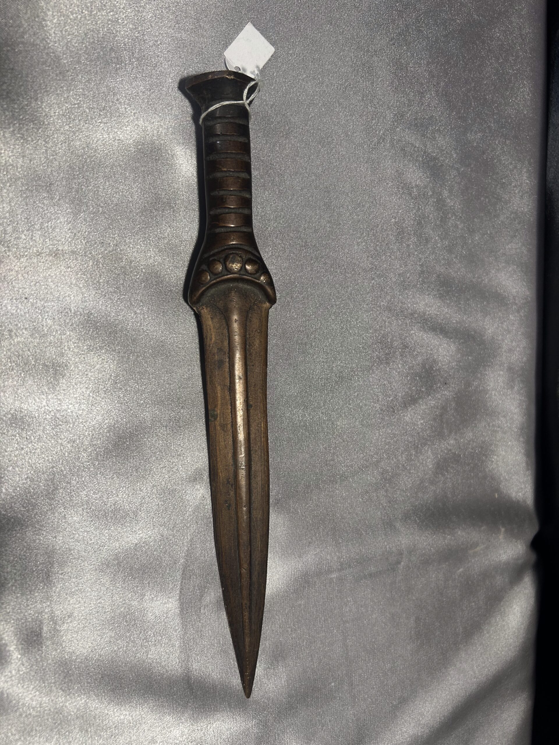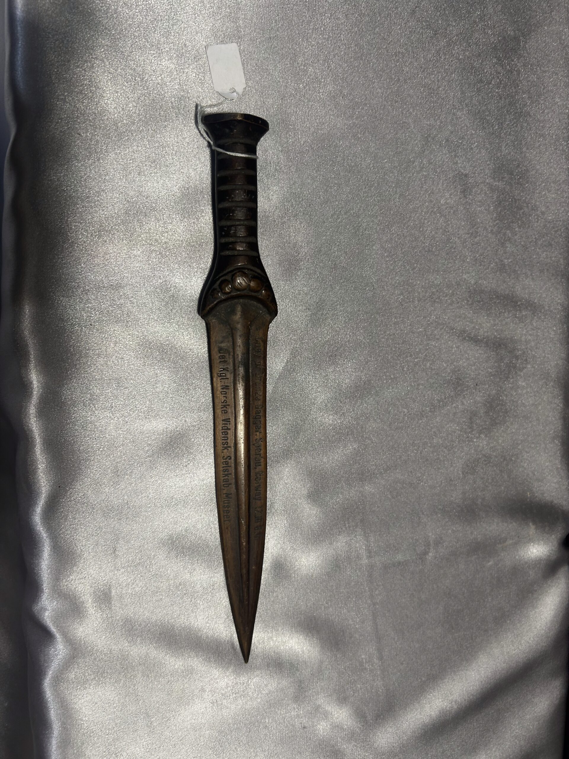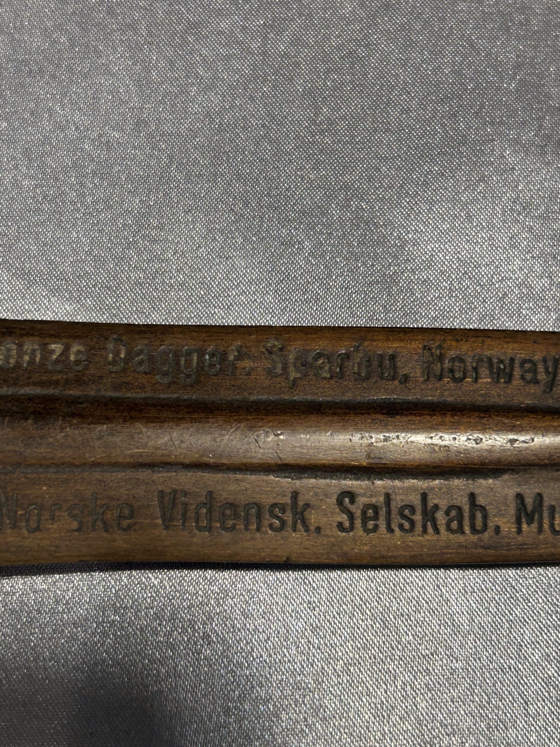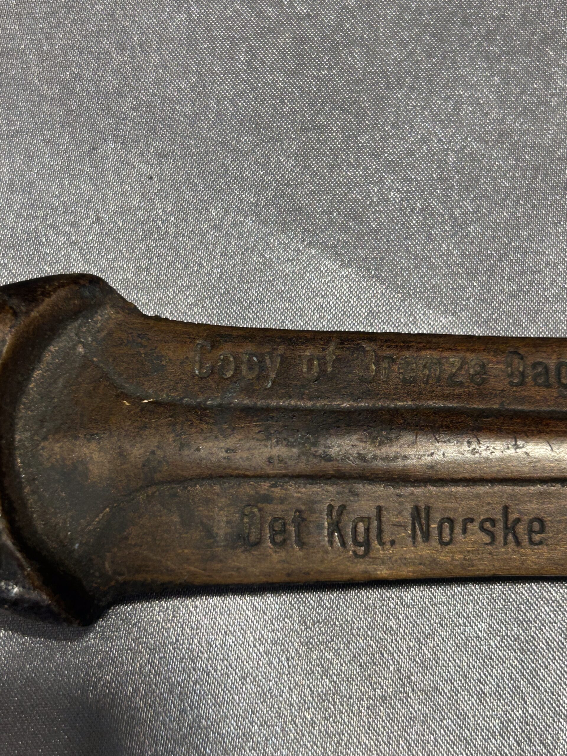 Wyjątkowy sztylet wykonany z brązu, będący repliką norweskiej broni z epoki brązu. Replika oznaczona jako „COPY OF BRONZE DAGGER. SPARBU NORWAY 1200 B.C. OET KGL. NORSKE VIDENSK. SELSKAB. MUSEET”, co podkreśla jej autentyczność i historyczny charakter.