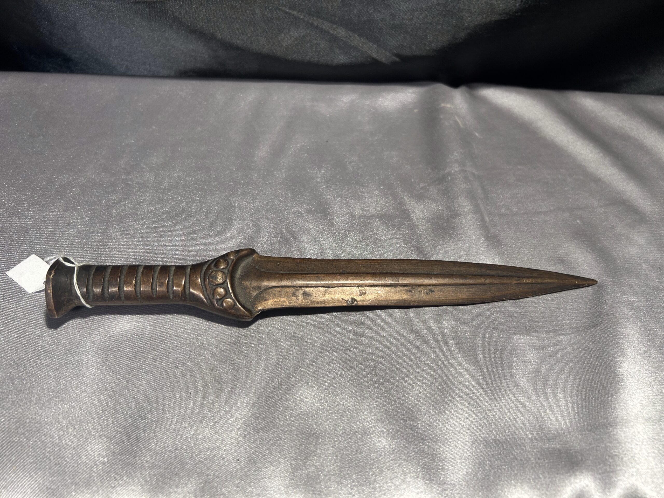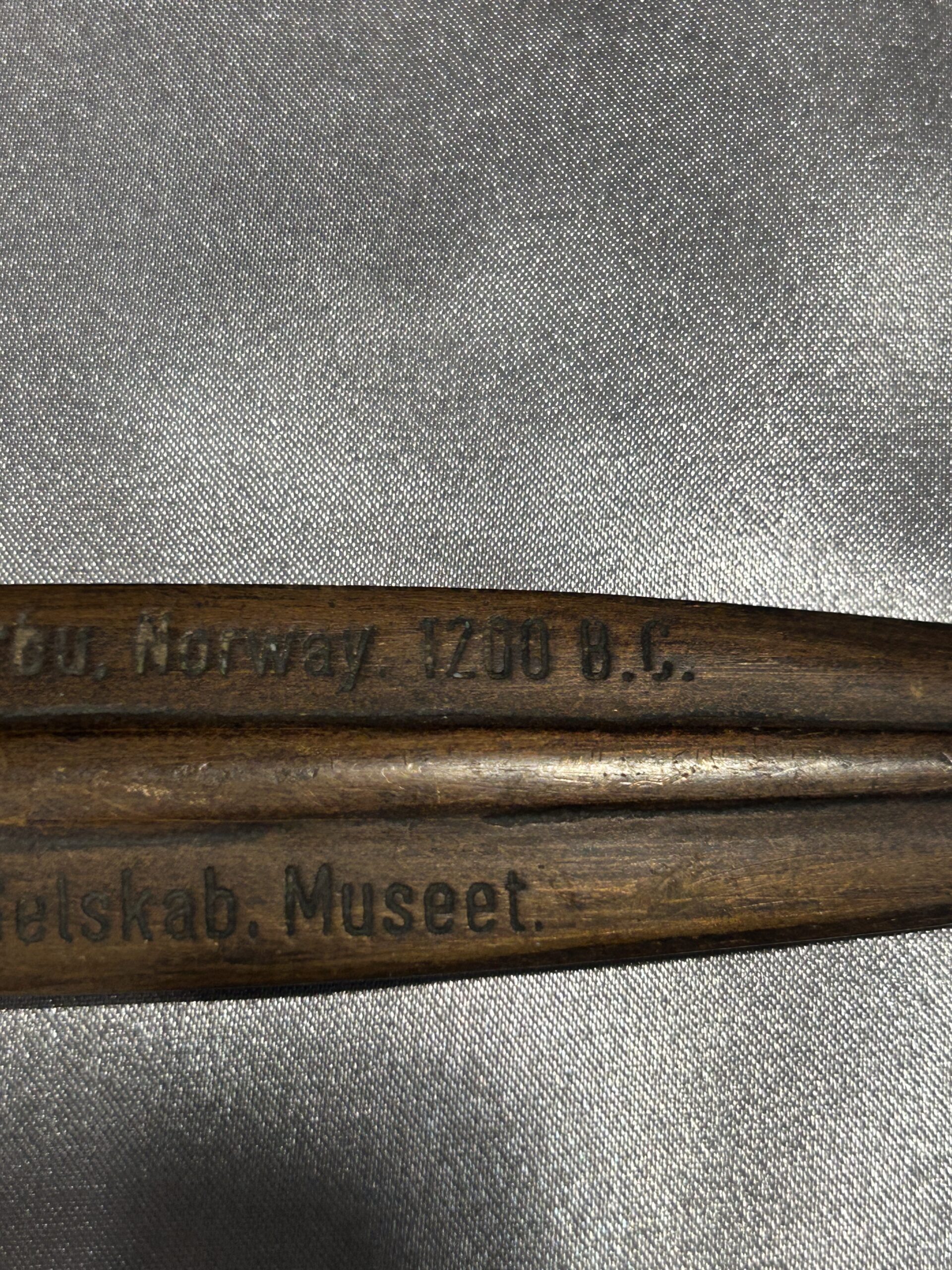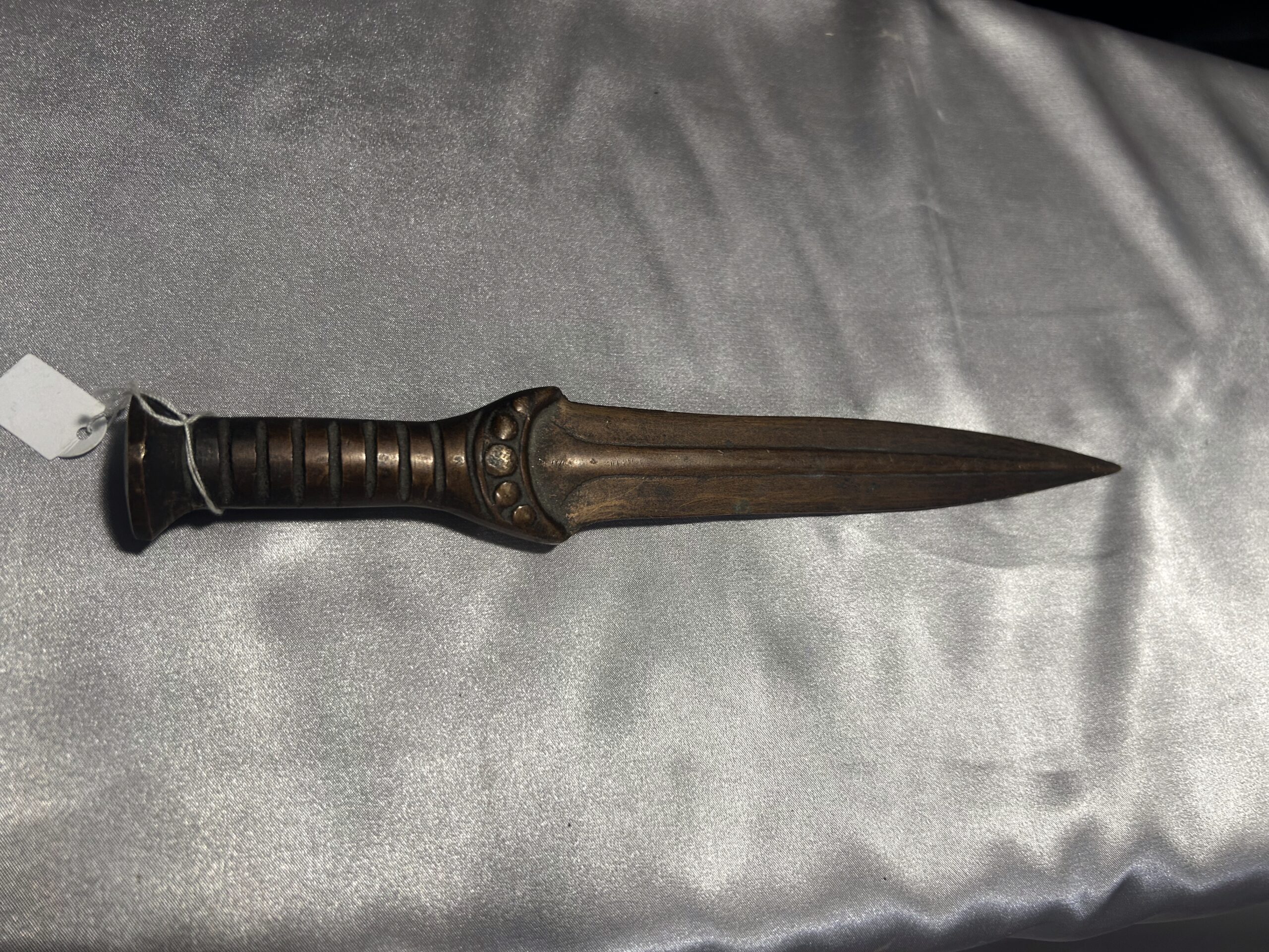 Wyjątkowy sztylet wykonany z brązu, będący repliką norweskiej broni z epoki brązu. Replika oznaczona jako „COPY OF BRONZE DAGGER. SPARBU NORWAY 1200 B.C. OET KGL. NORSKE VIDENSK. SELSKAB. MUSEET”, co podkreśla jej autentyczność i historyczny charakter.