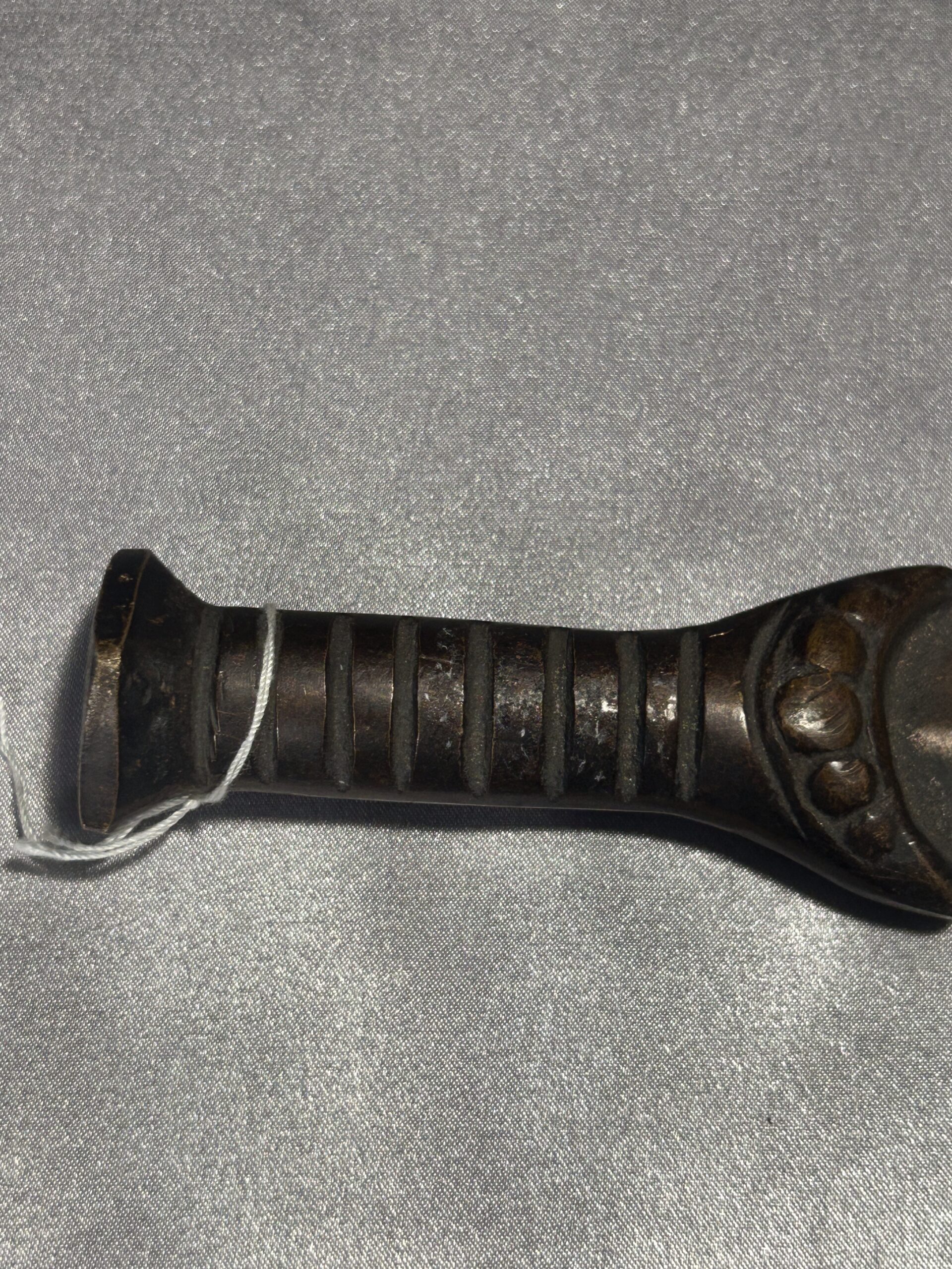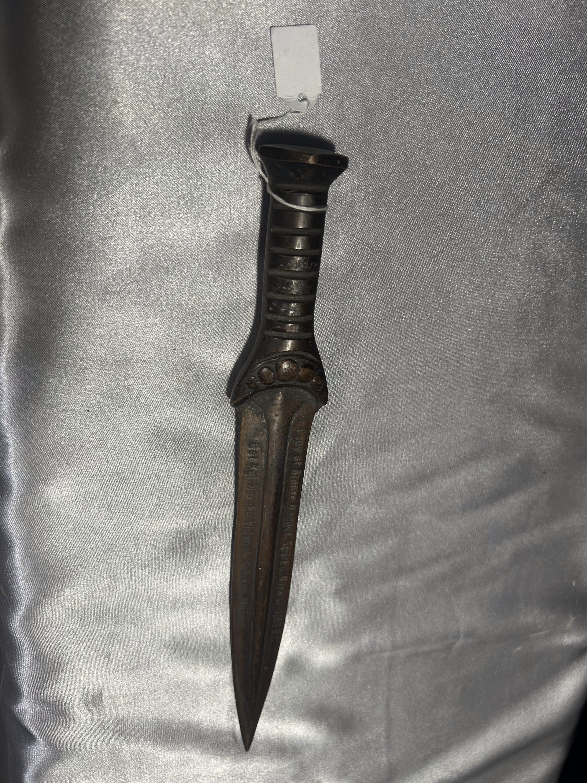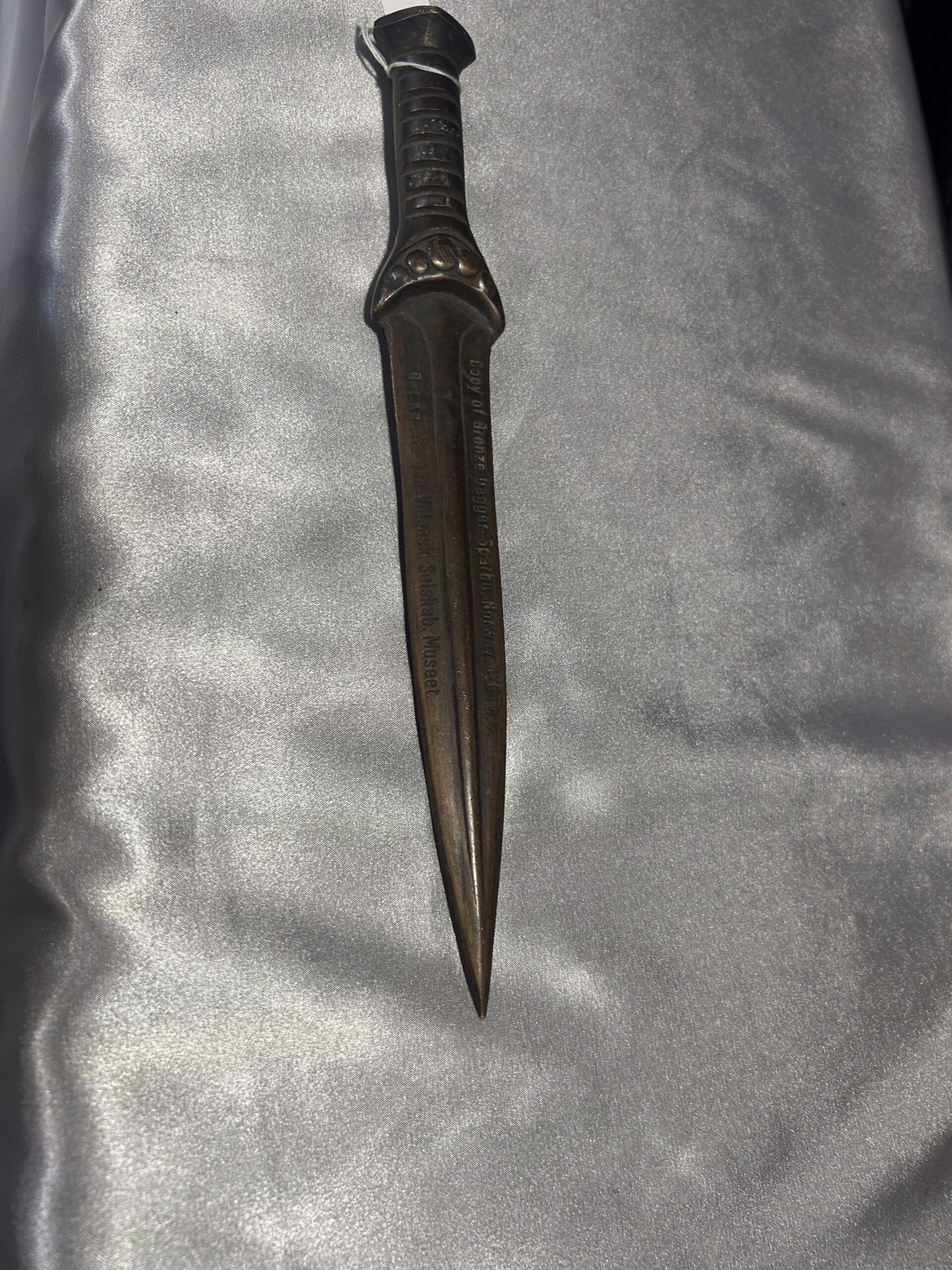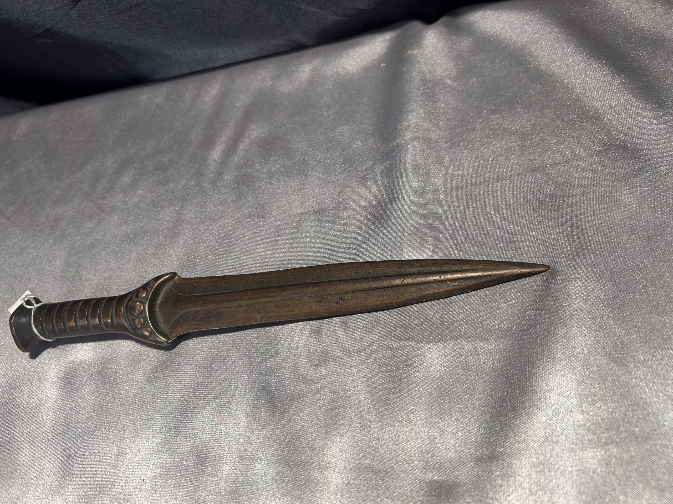 Wyjątkowy sztylet wykonany z brązu, będący repliką norweskiej broni z epoki brązu. Replika oznaczona jako „COPY OF BRONZE DAGGER. SPARBU NORWAY 1200 B.C. OET KGL. NORSKE VIDENSK. SELSKAB. MUSEET”, co podkreśla jej autentyczność i historyczny charakter.