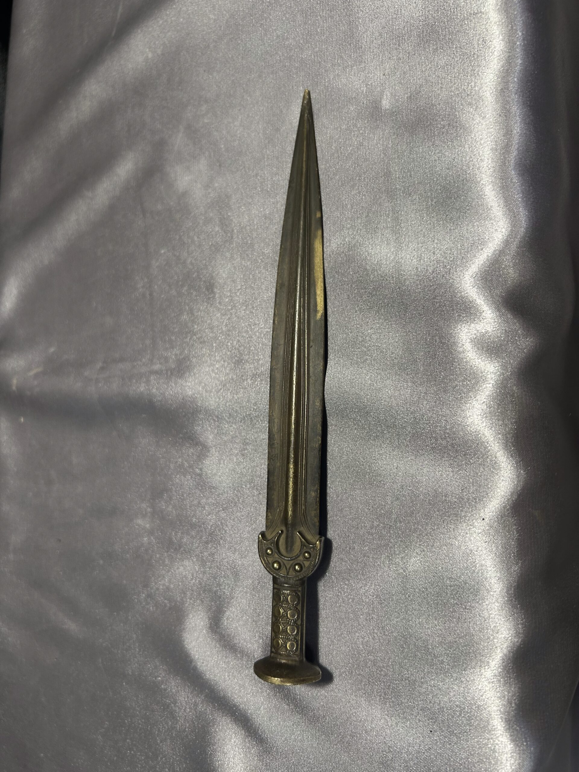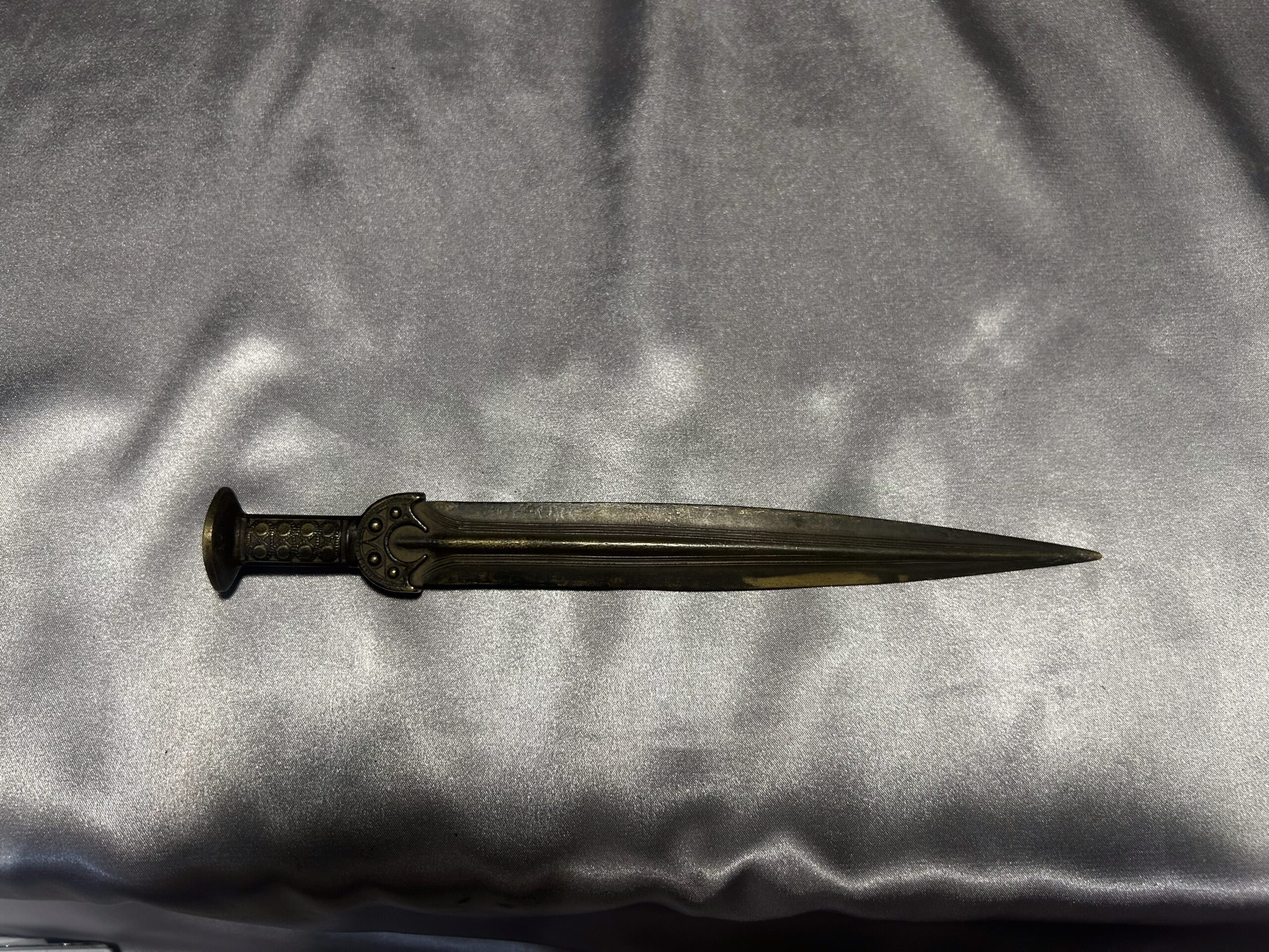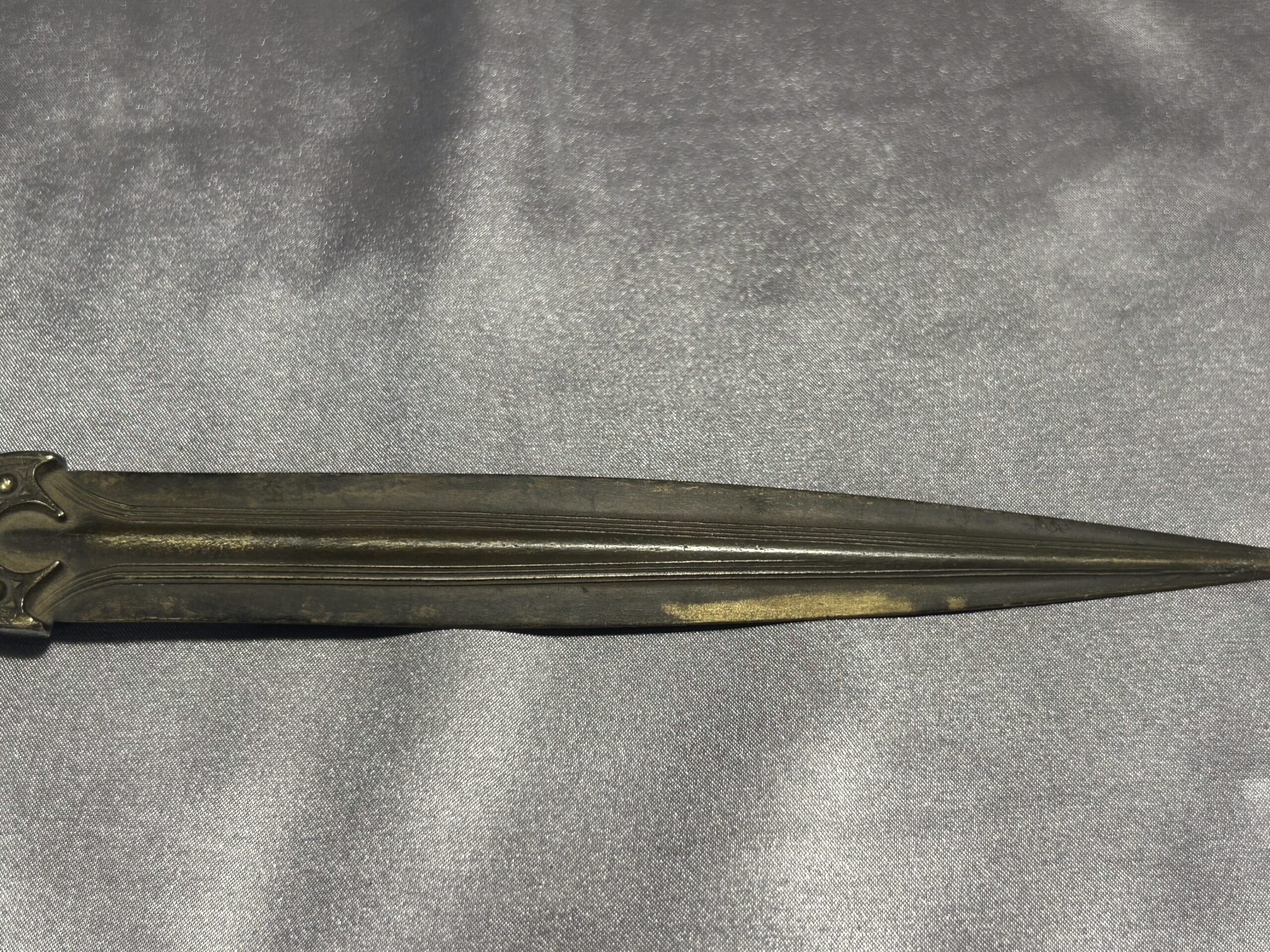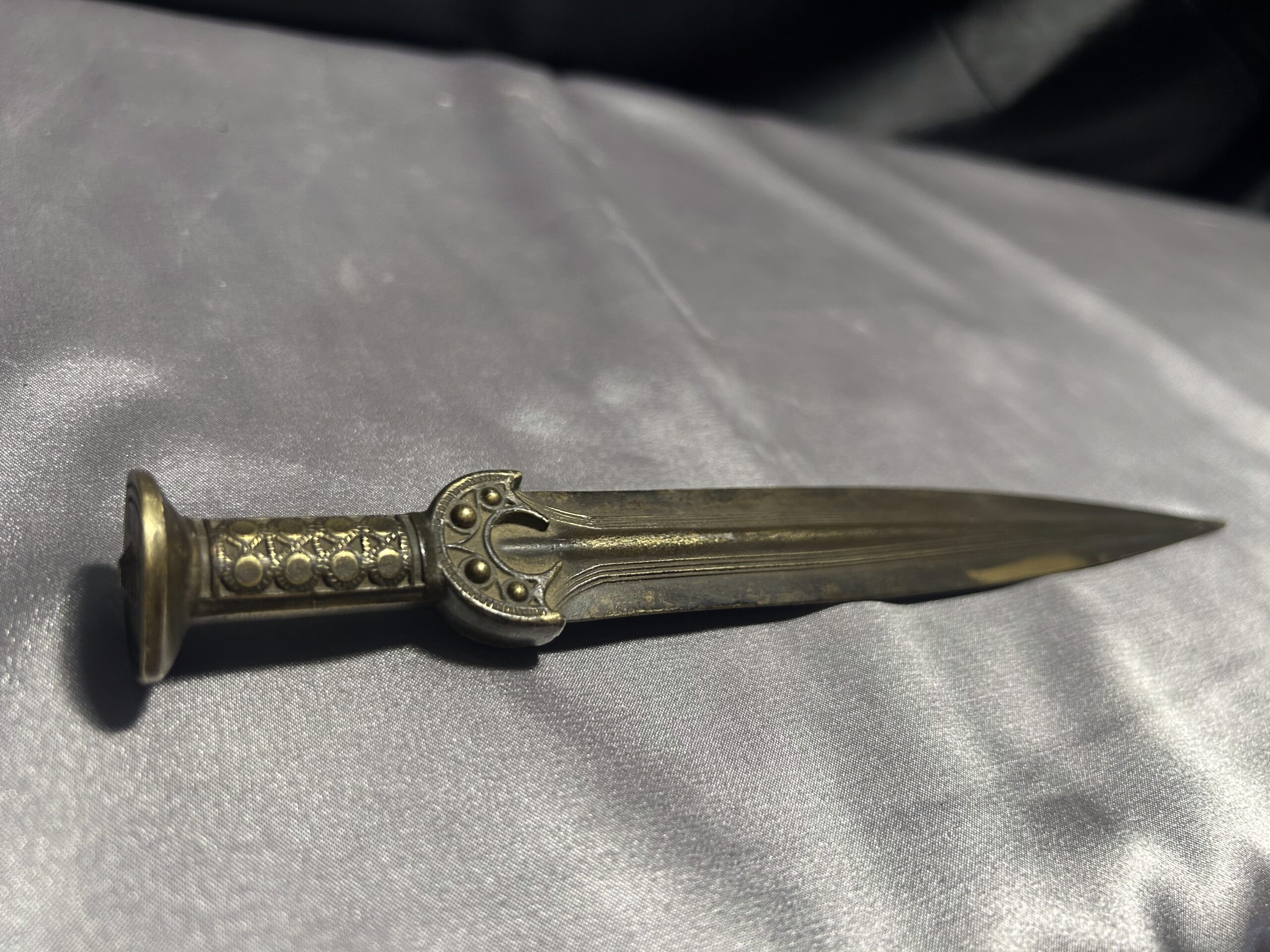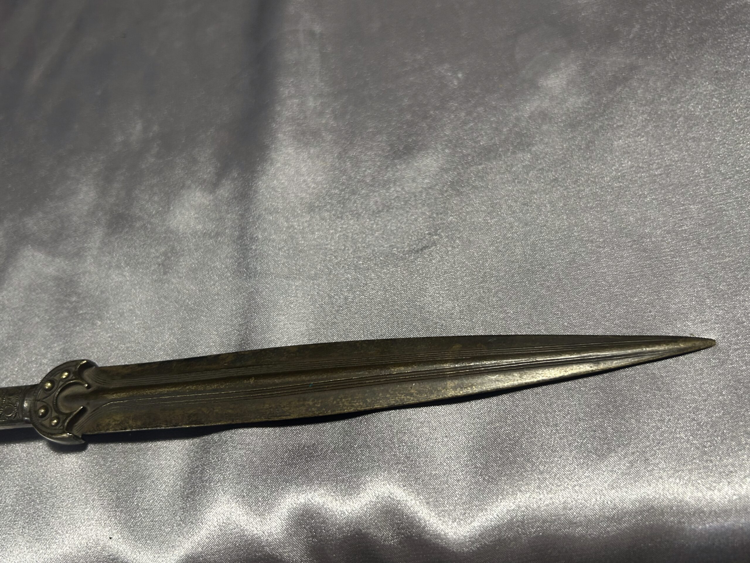 Elegancki sztylet o zdobionej rękojeści, idealny dla miłośników białej broni oraz kolekcjonerów. Dzięki swojej wyjątkowej estetyce i precyzyjnemu wykonaniu, sztylet ten stanowi doskonałe połączenie funkcjonalności i dekoracyjności.