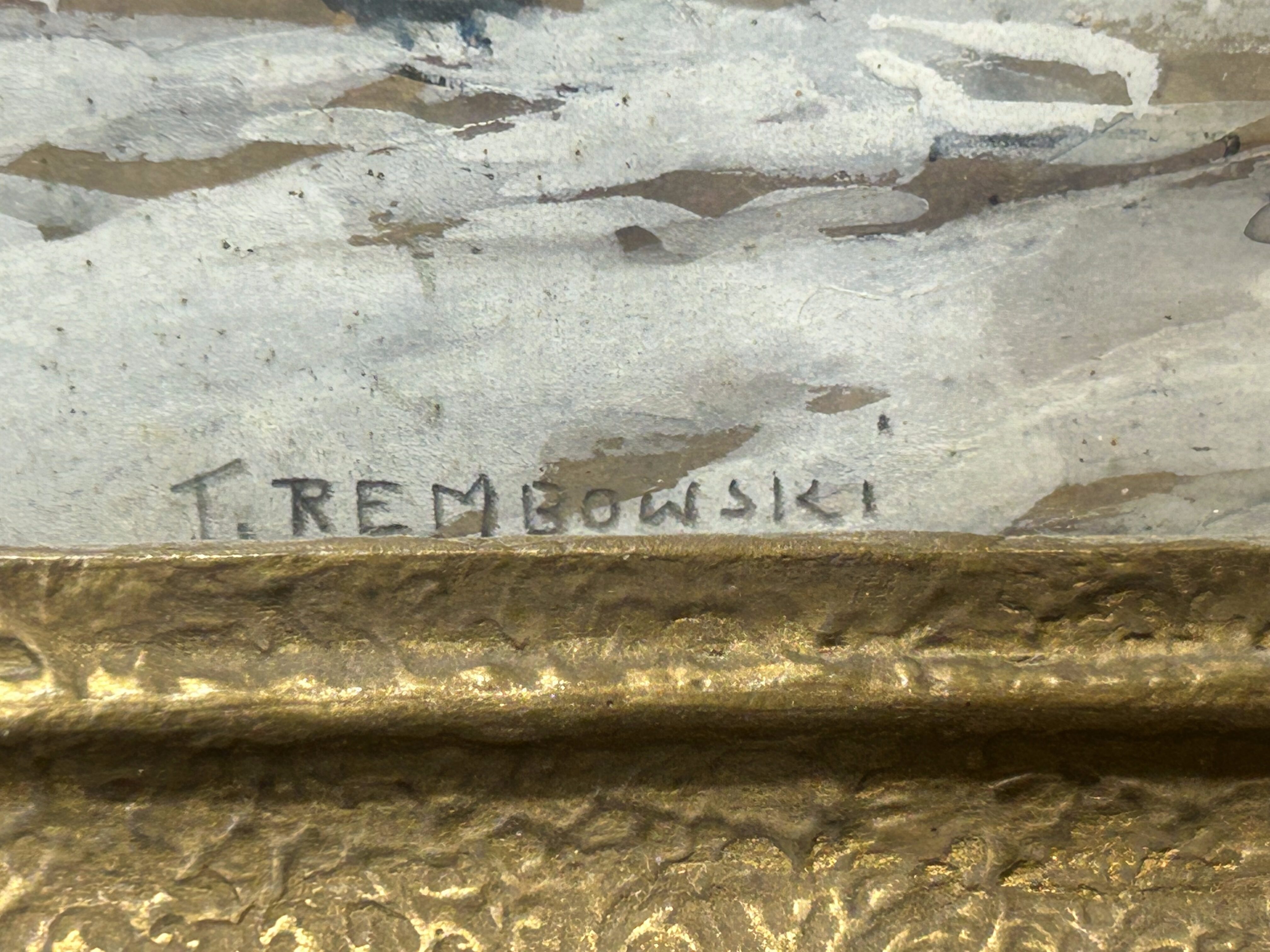 Obraz posiada sygnaturę autora T. Rembowski widoczną na pracy, natomiast na odwrocie znajduje się opis: