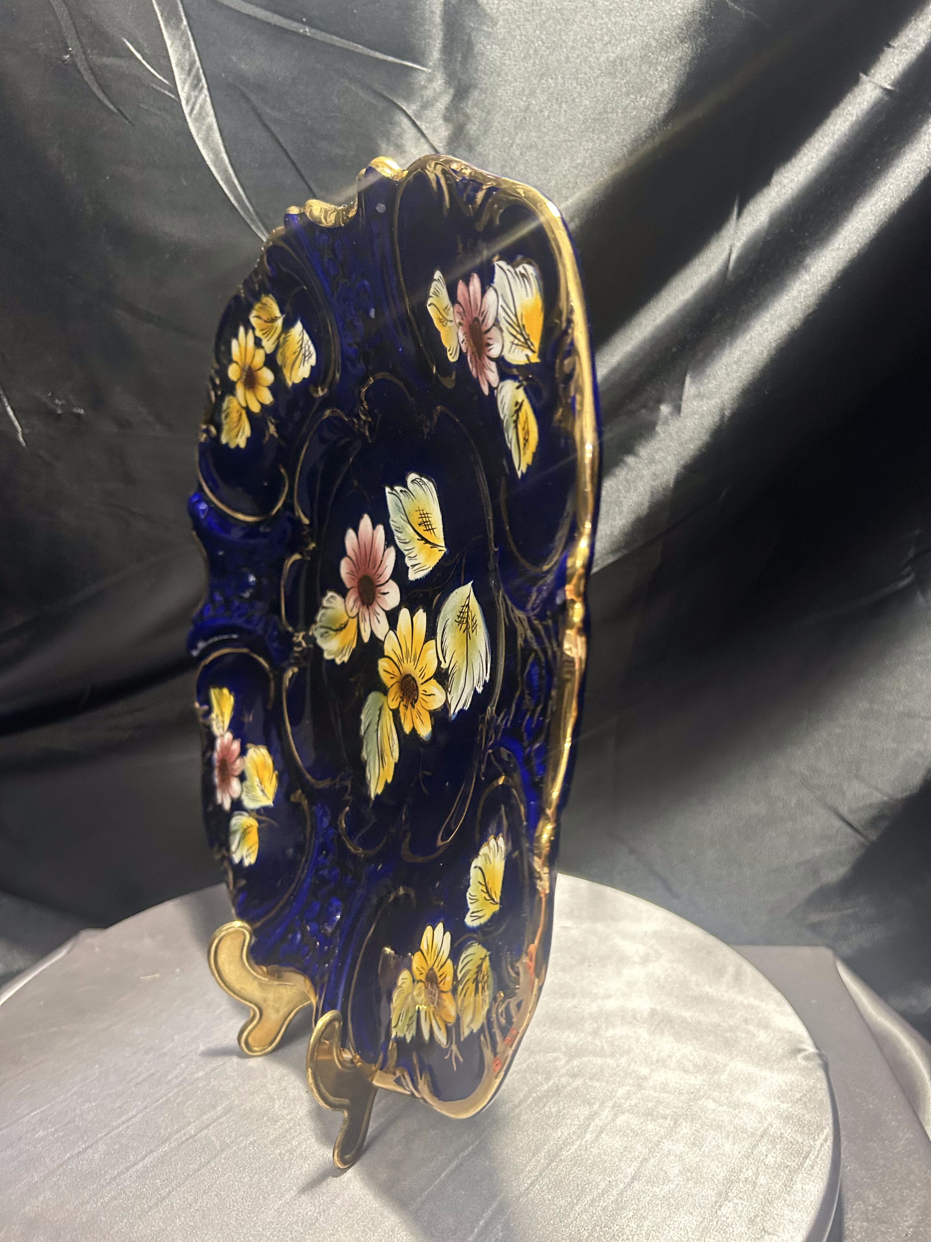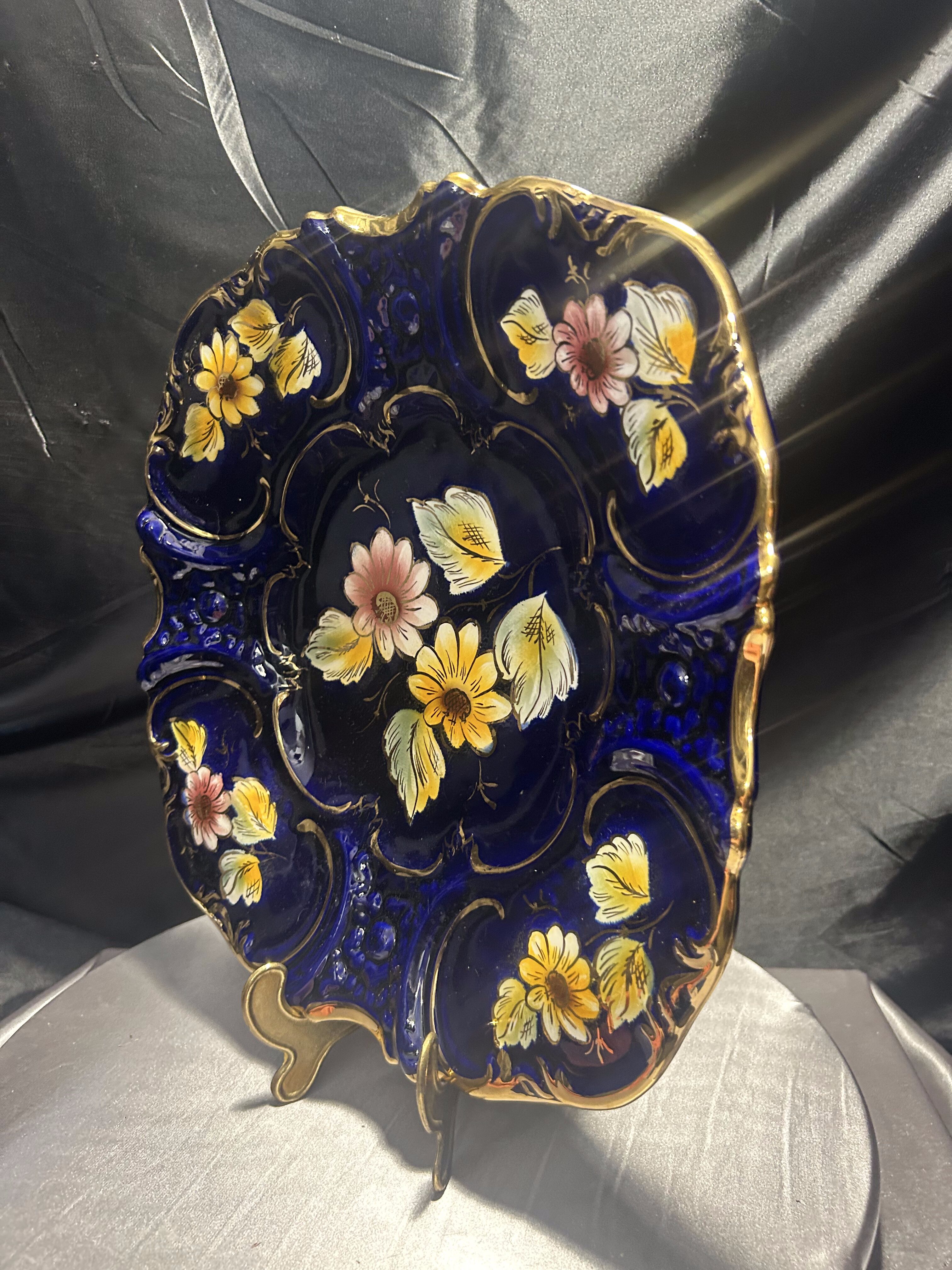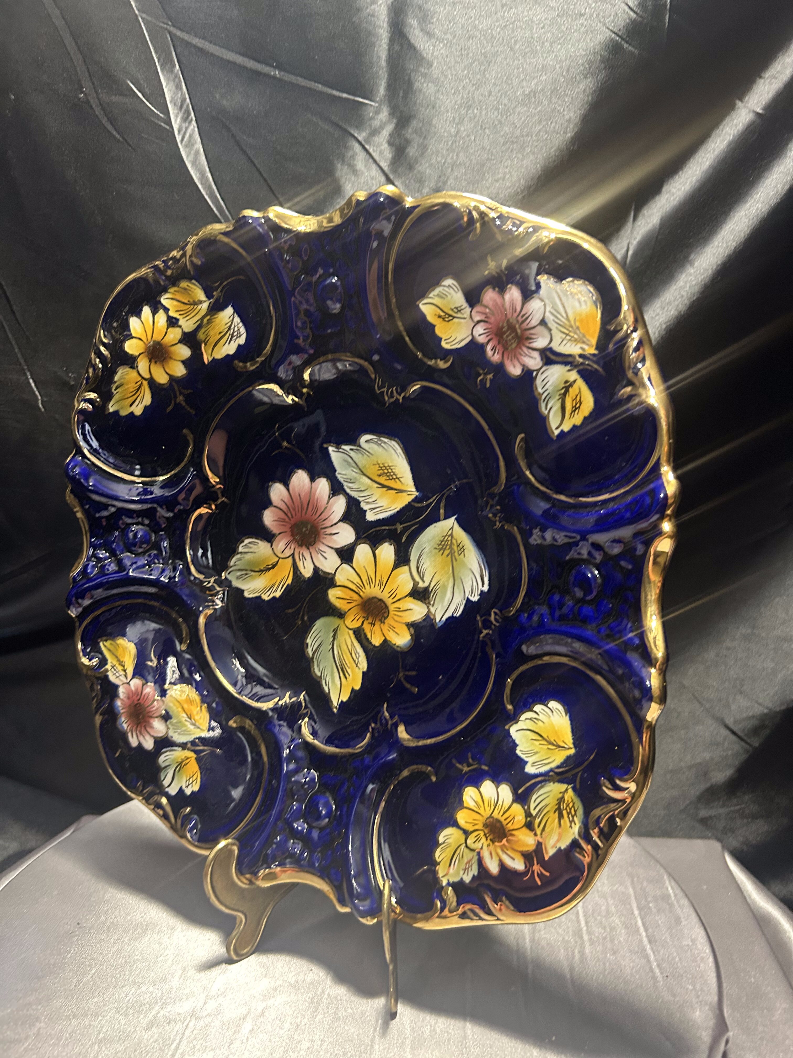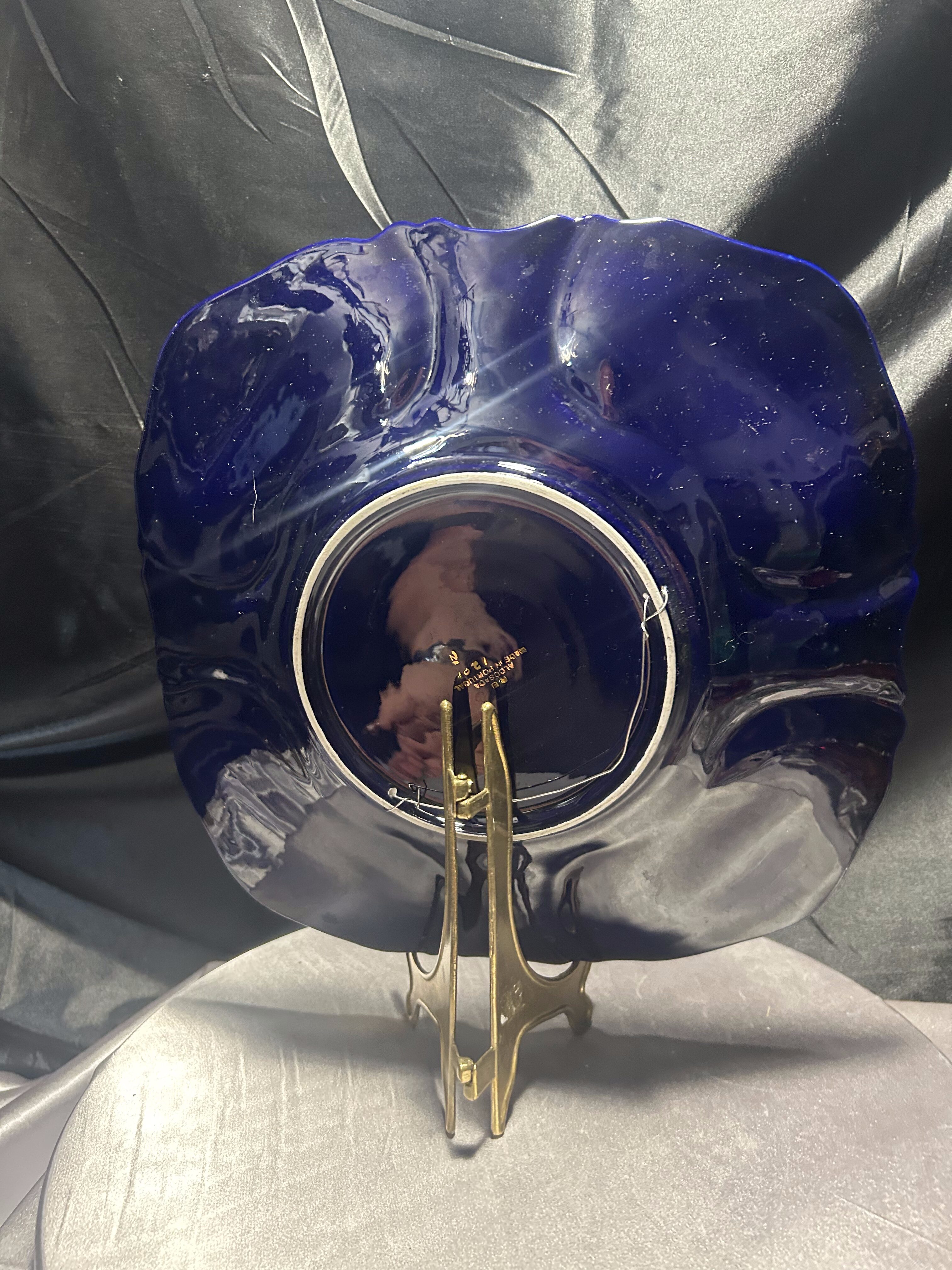 Imponujący talerz dekoracyjny wyprodukowany w portugalskim regionie Alcobaça – znanym z wyjątkowej ceramiki artystycznej o długiej tradycji rzemieślniczej. Naczynie wykonano z ceramiki szkliwionej w intensywnym, głębokim odcieniu kobaltu, z ręcznie malowanymi kwiatami w odcieniach żółci, różu i bieli oraz wyraźnie zaznaczonymi, wypukłymi złoceniami.