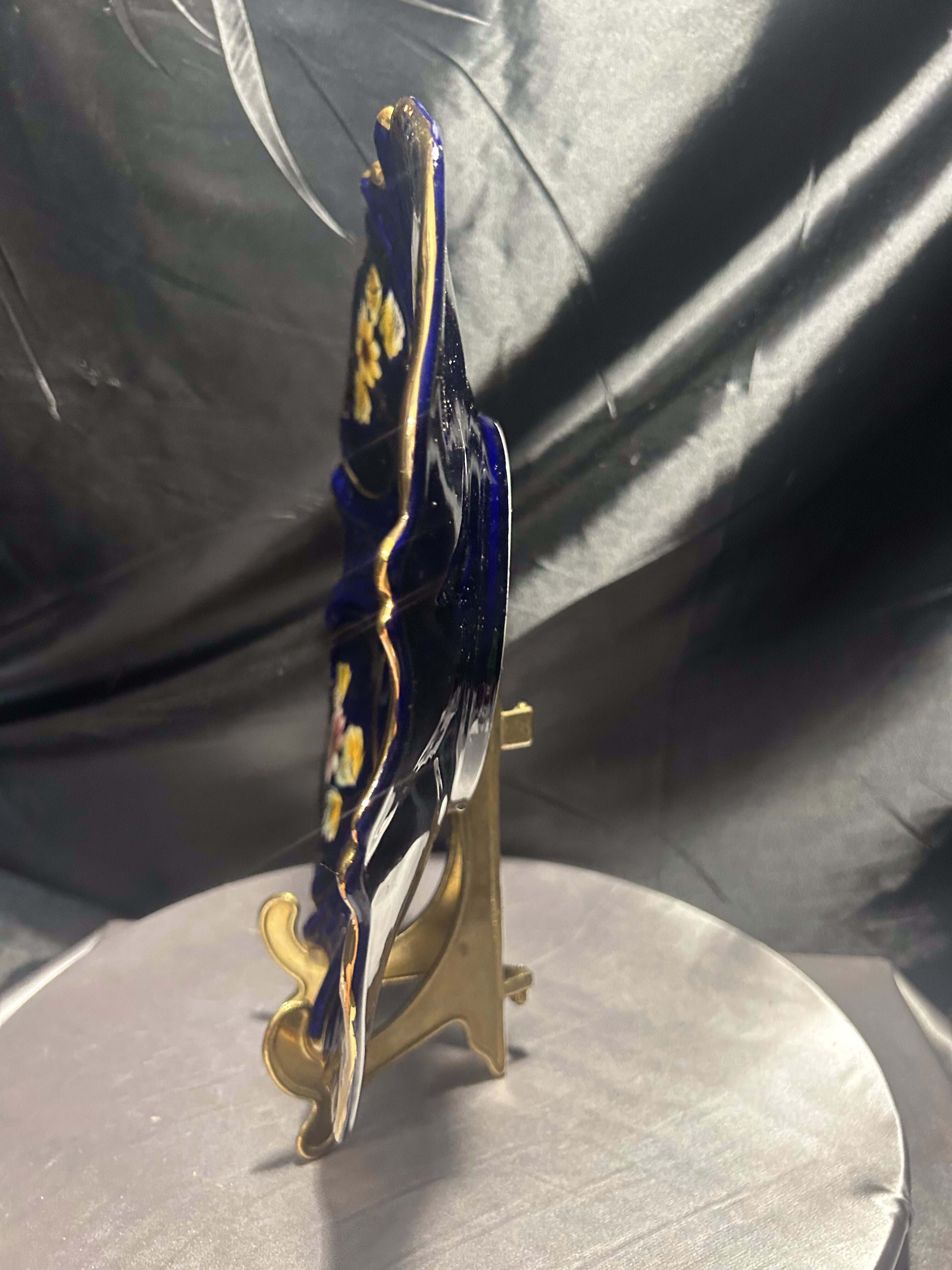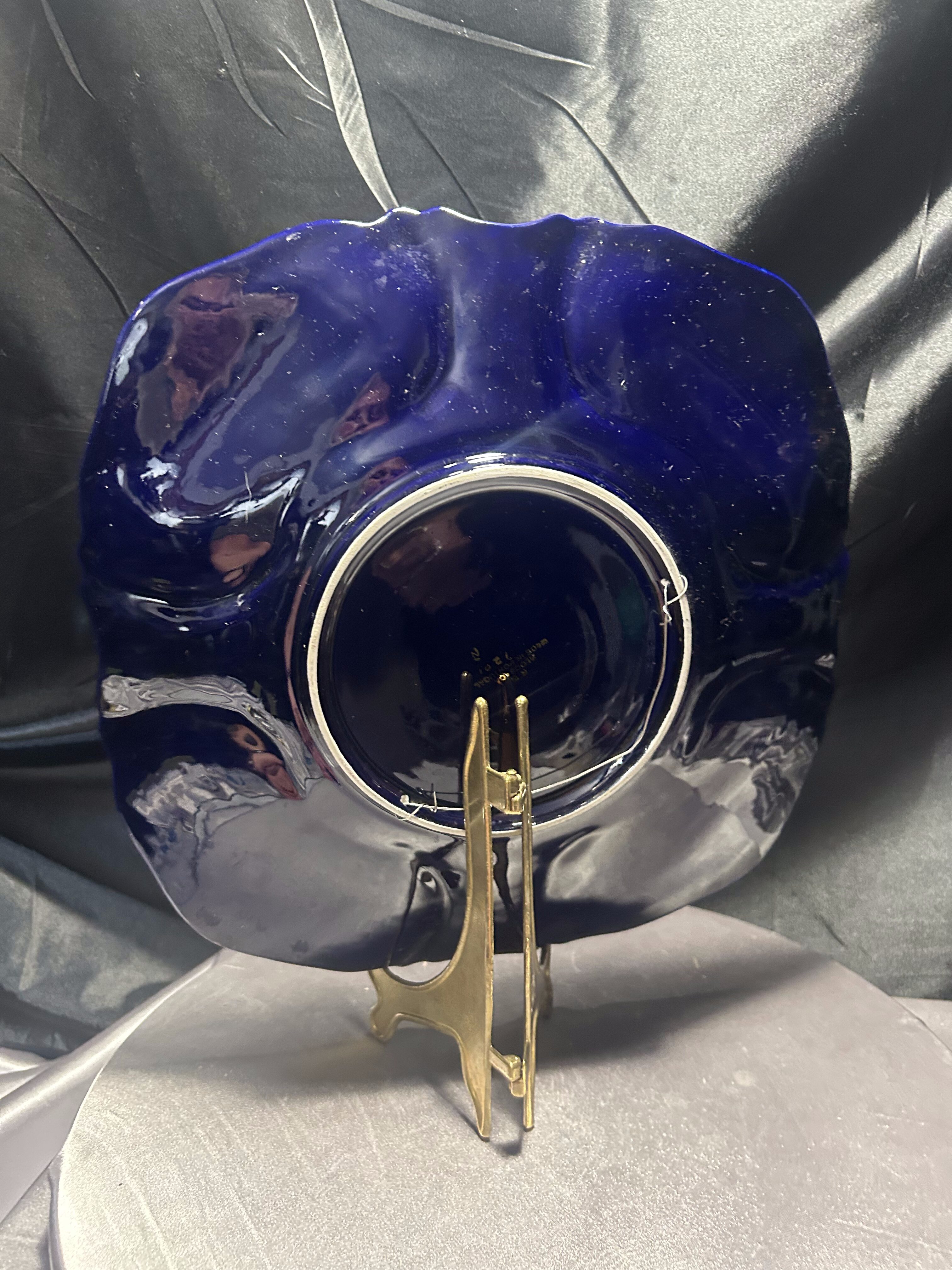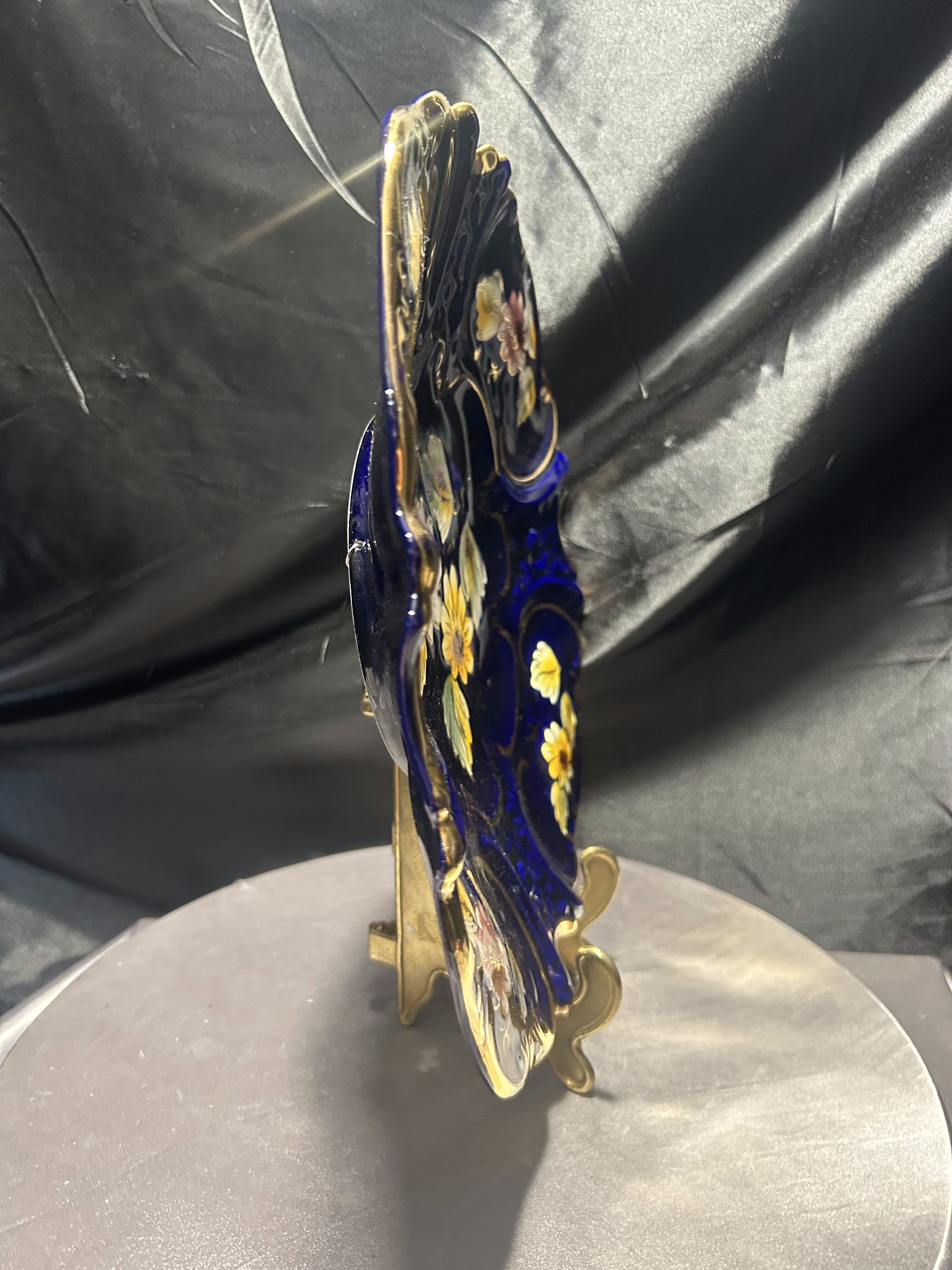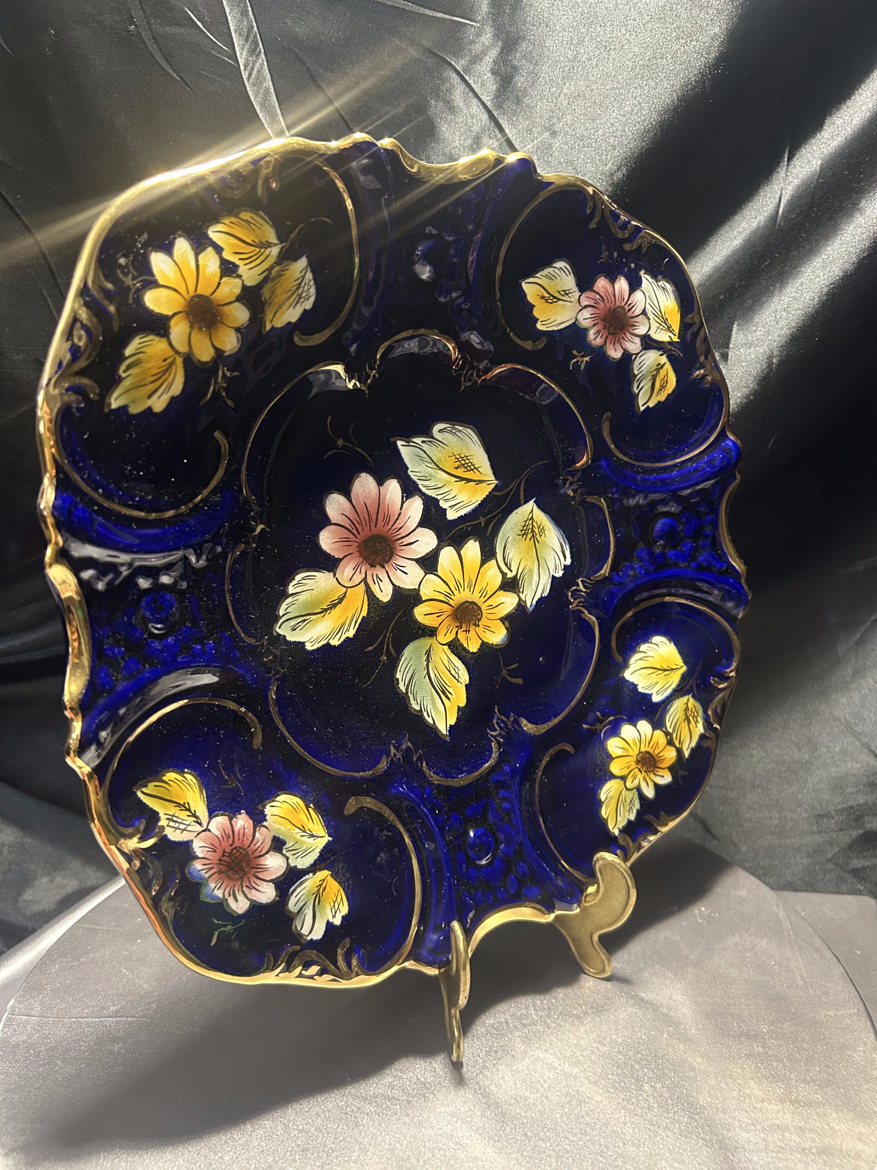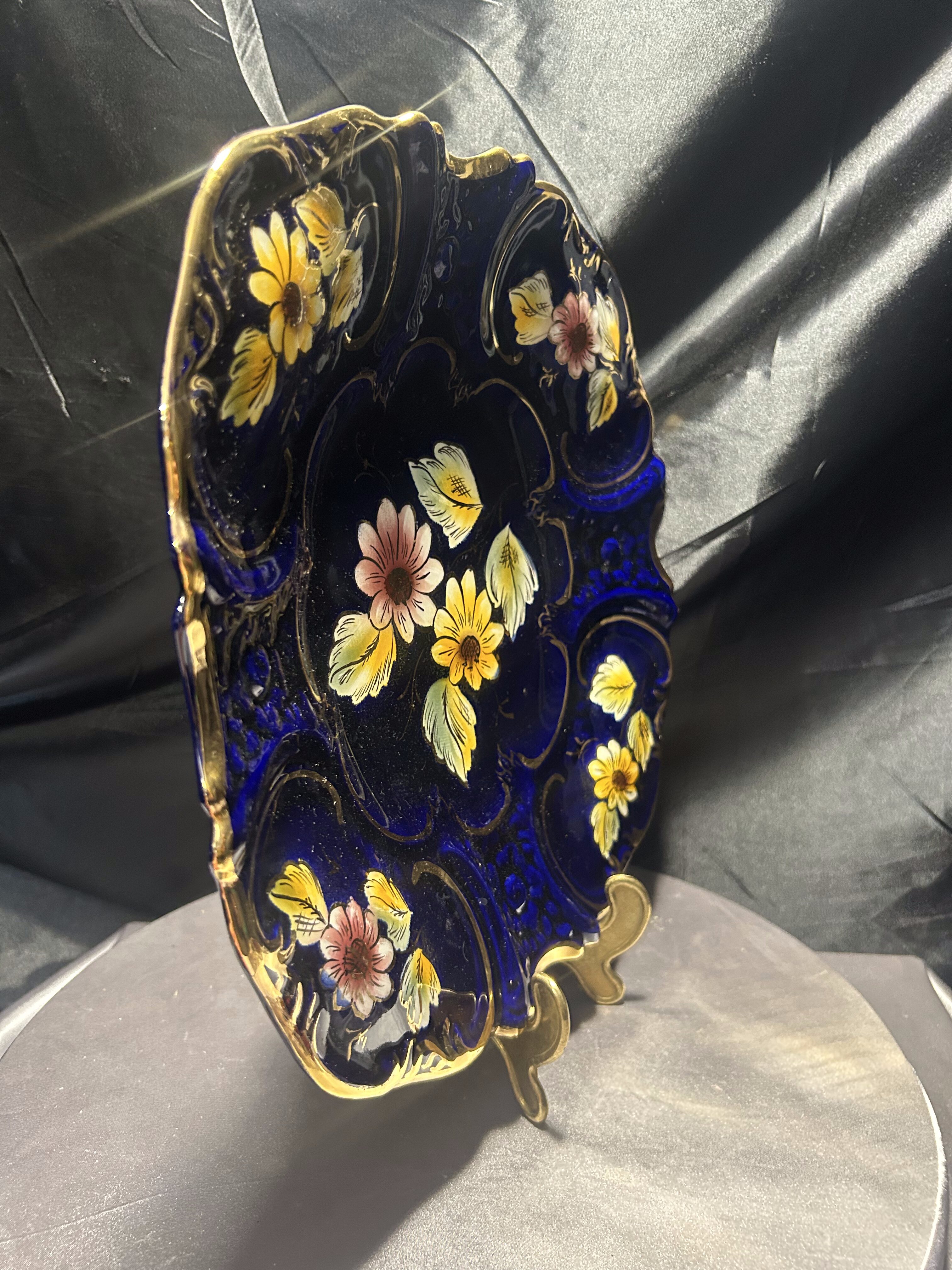 Imponujący talerz dekoracyjny wyprodukowany w portugalskim regionie Alcobaça – znanym z wyjątkowej ceramiki artystycznej o długiej tradycji rzemieślniczej. Naczynie wykonano z ceramiki szkliwionej w intensywnym, głębokim odcieniu kobaltu, z ręcznie malowanymi kwiatami w odcieniach żółci, różu i bieli oraz wyraźnie zaznaczonymi, wypukłymi złoceniami.