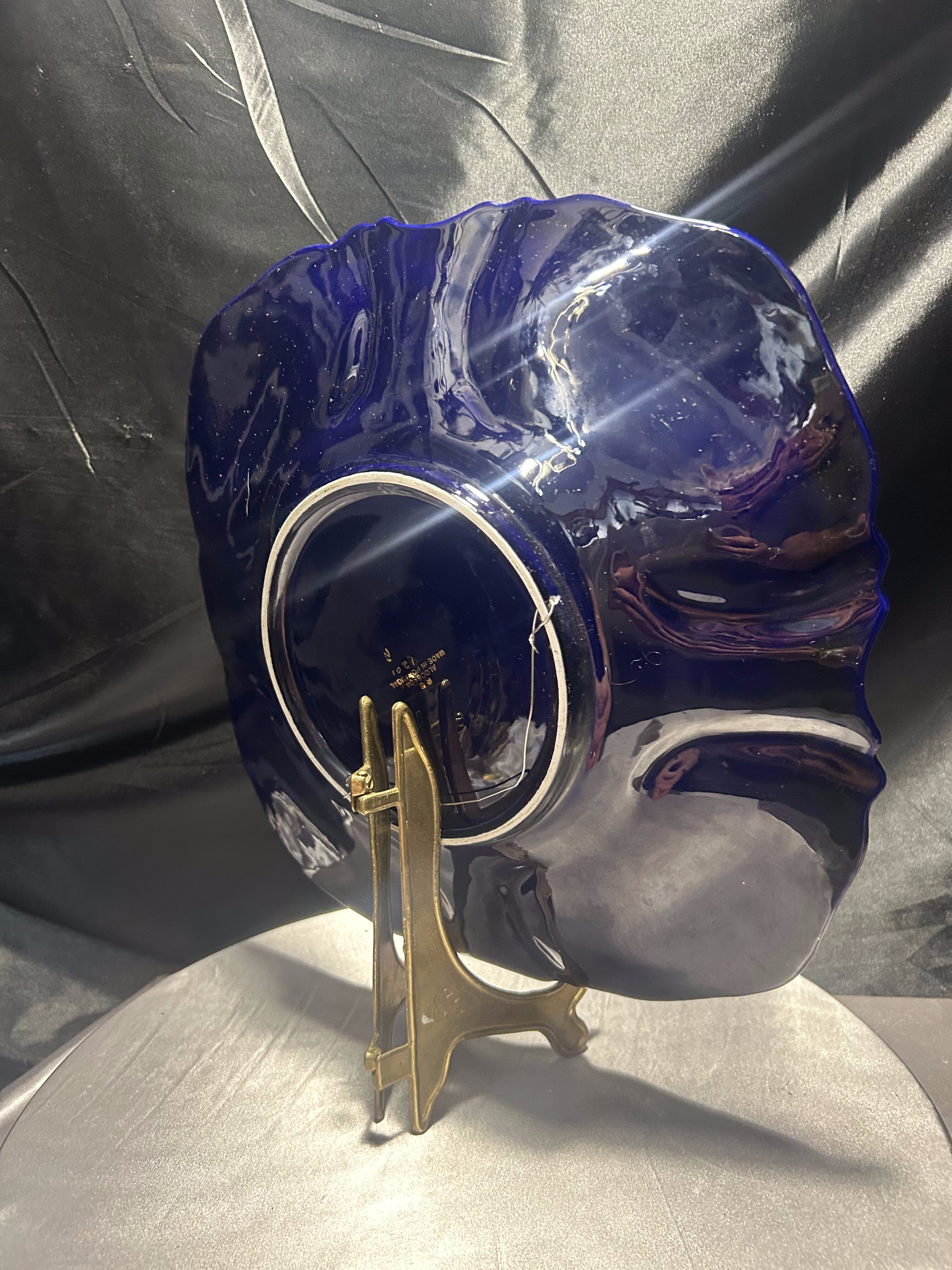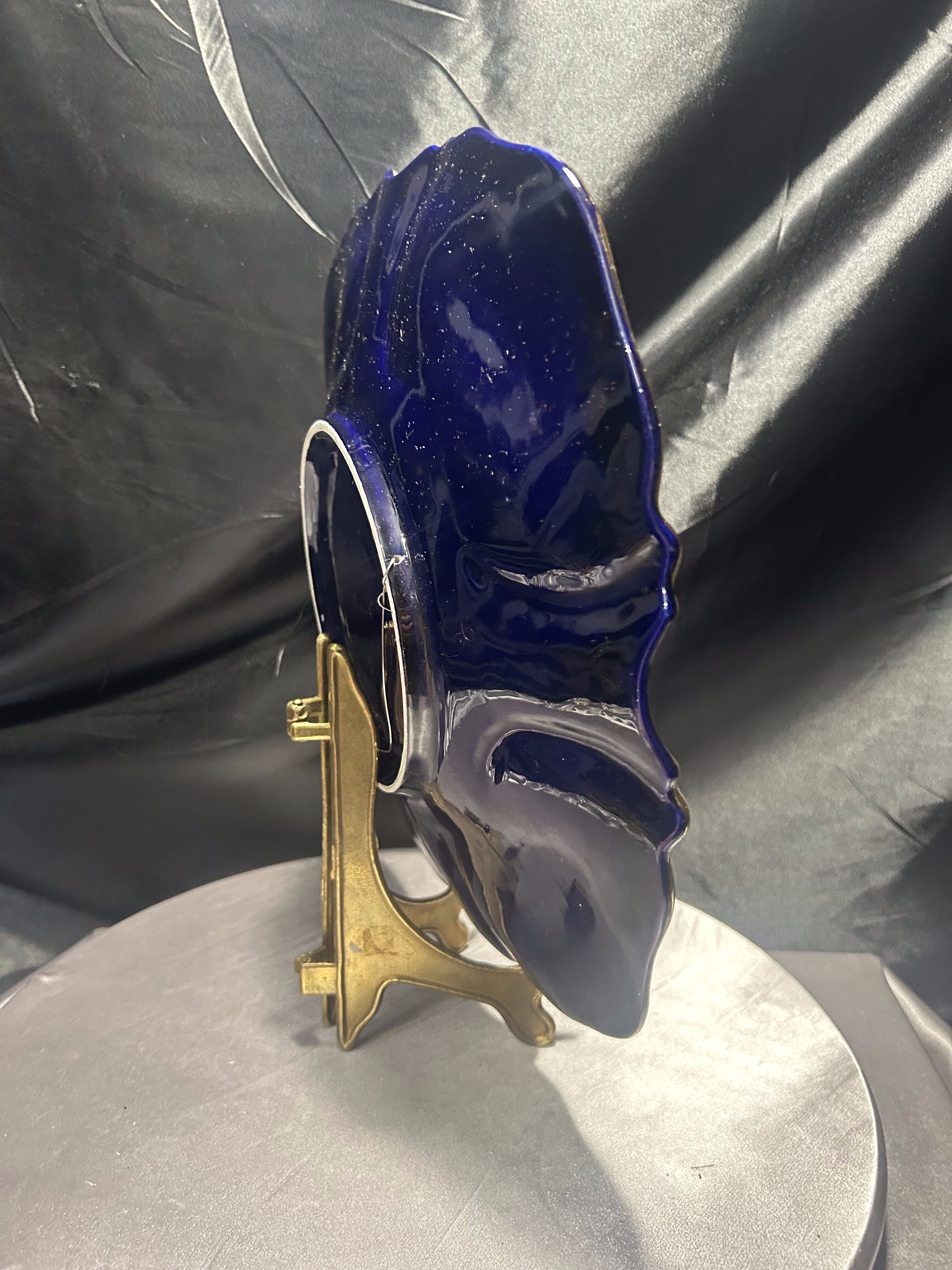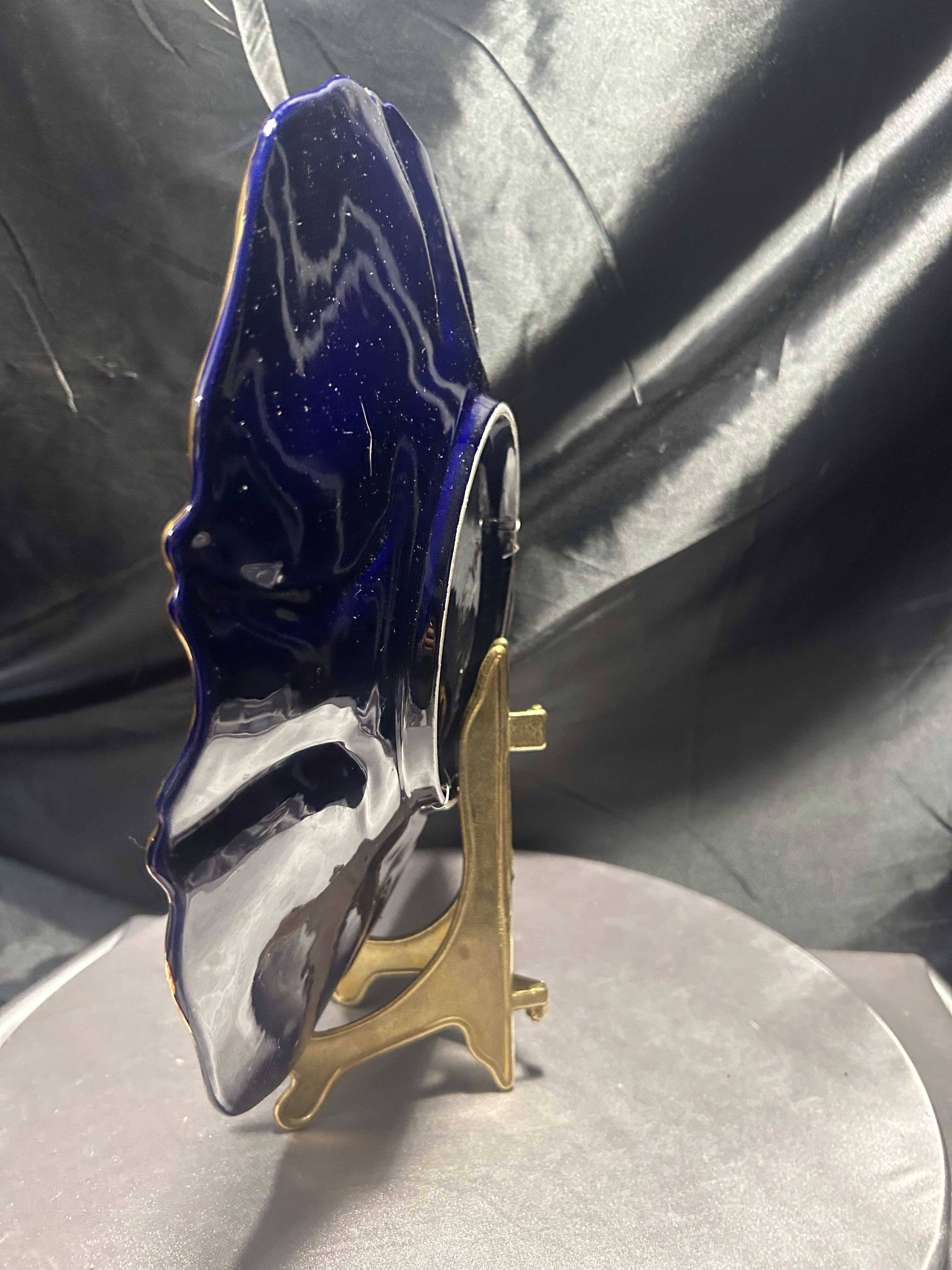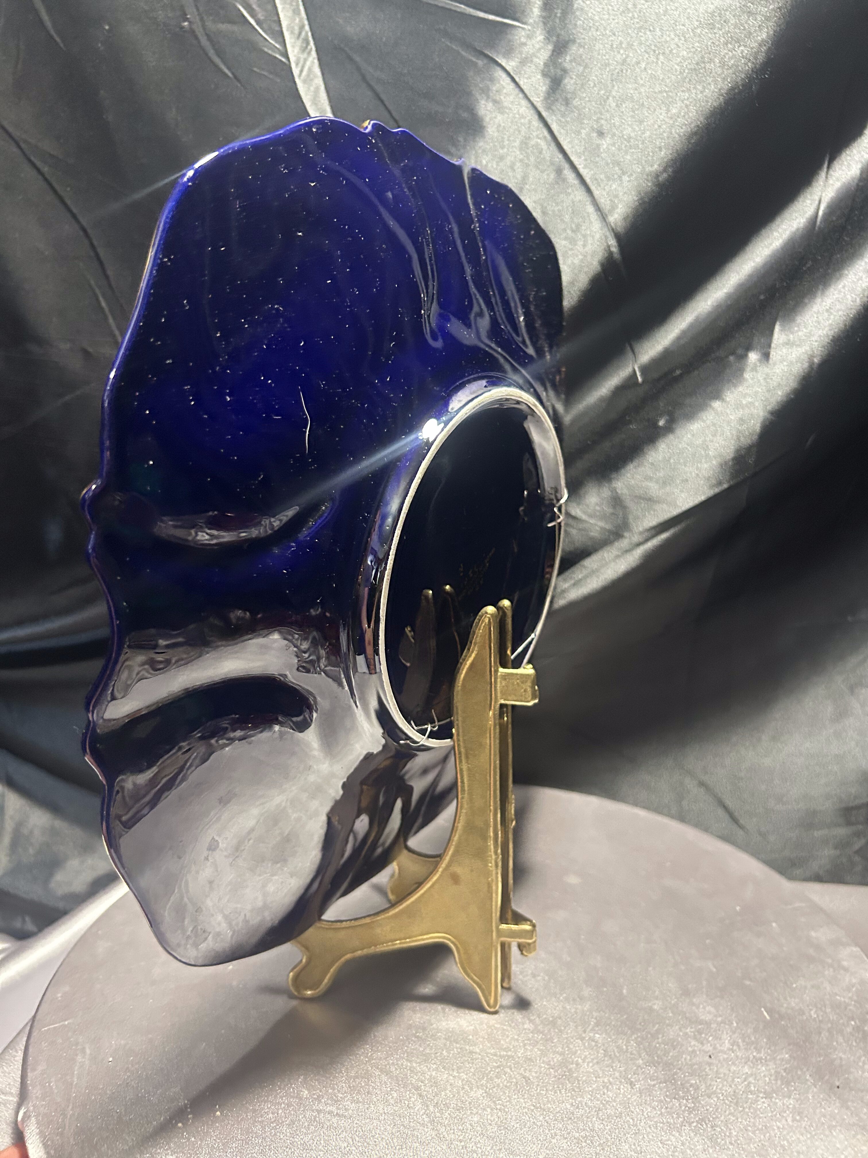 Imponujący talerz dekoracyjny wyprodukowany w portugalskim regionie Alcobaça – znanym z wyjątkowej ceramiki artystycznej o długiej tradycji rzemieślniczej. Naczynie wykonano z ceramiki szkliwionej w intensywnym, głębokim odcieniu kobaltu, z ręcznie malowanymi kwiatami w odcieniach żółci, różu i bieli oraz wyraźnie zaznaczonymi, wypukłymi złoceniami.