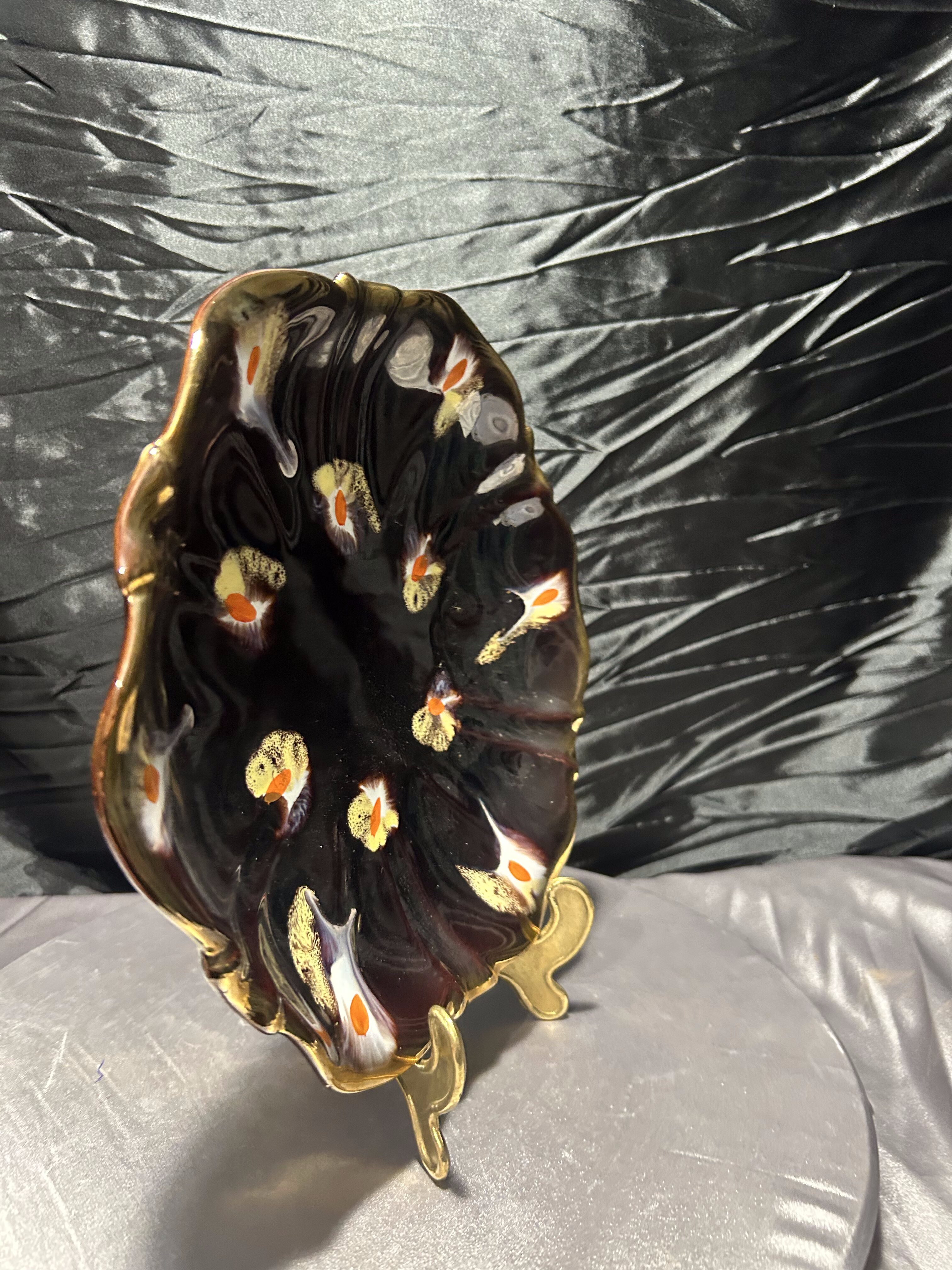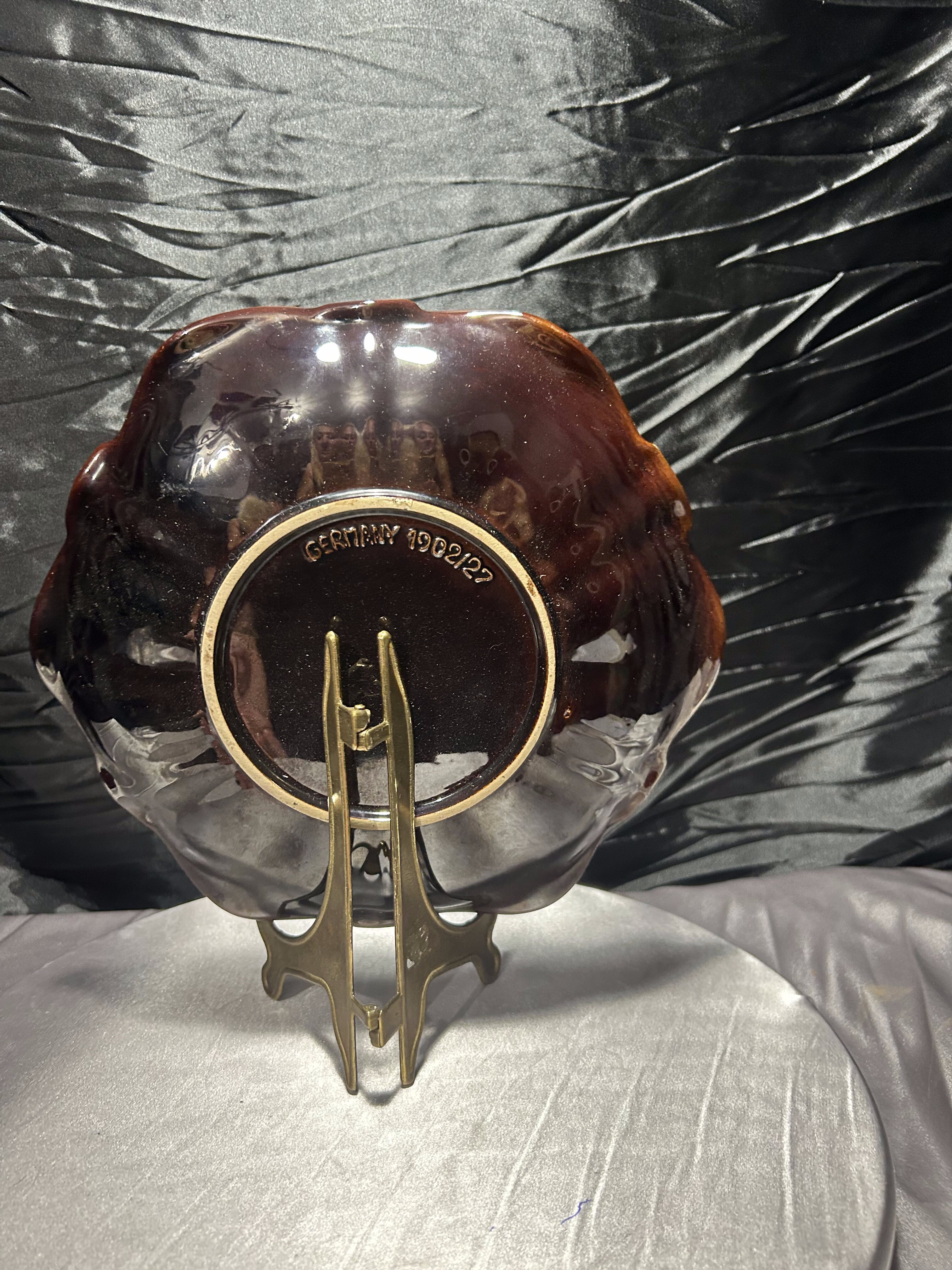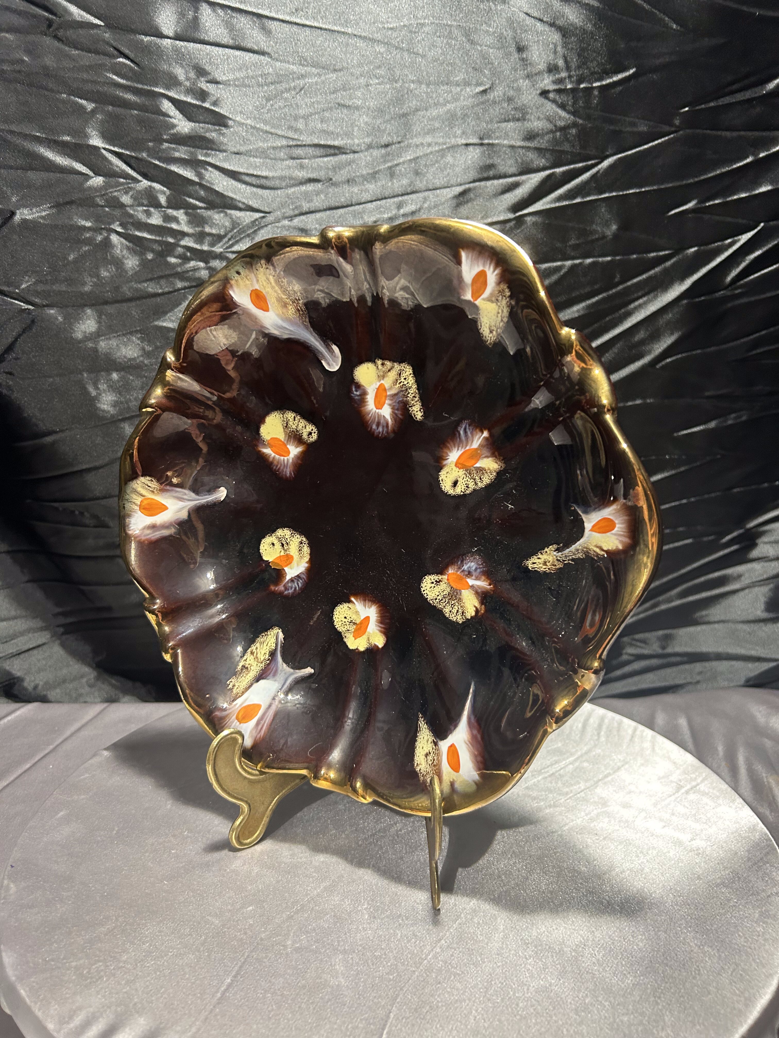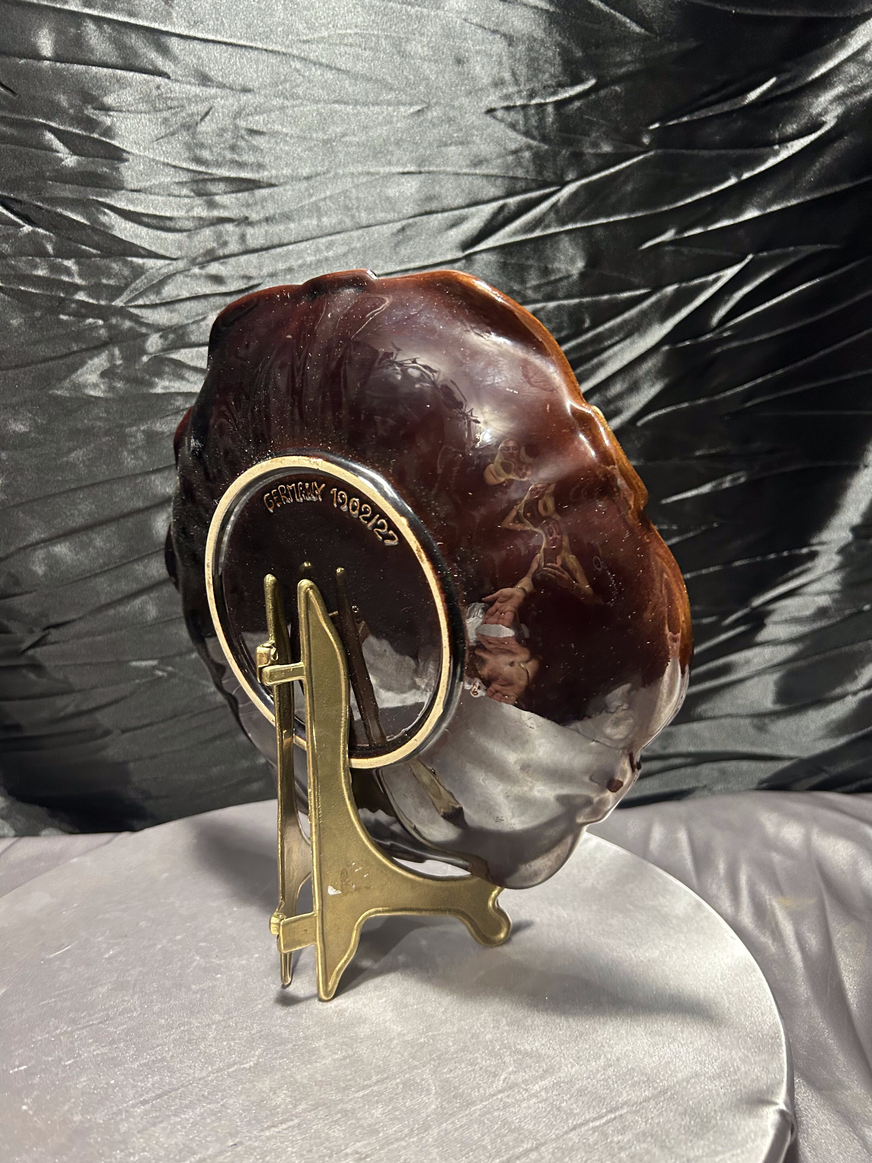Oryginalny talerz dekoracyjny sygnowany Germany 1902/27, wykonany ze szkła artystycznego o niezwykle ciekawym efekcie barwnym. Dominują głębokie tony brązu i bursztynu z ręcznie nanoszonymi zdobieniami w odcieniach bieli, złota i pomarańczu. Nieregularna forma z delikatnie falującym rantem oraz złocone wykończenia nadają mu wyjątkowej elegancji.