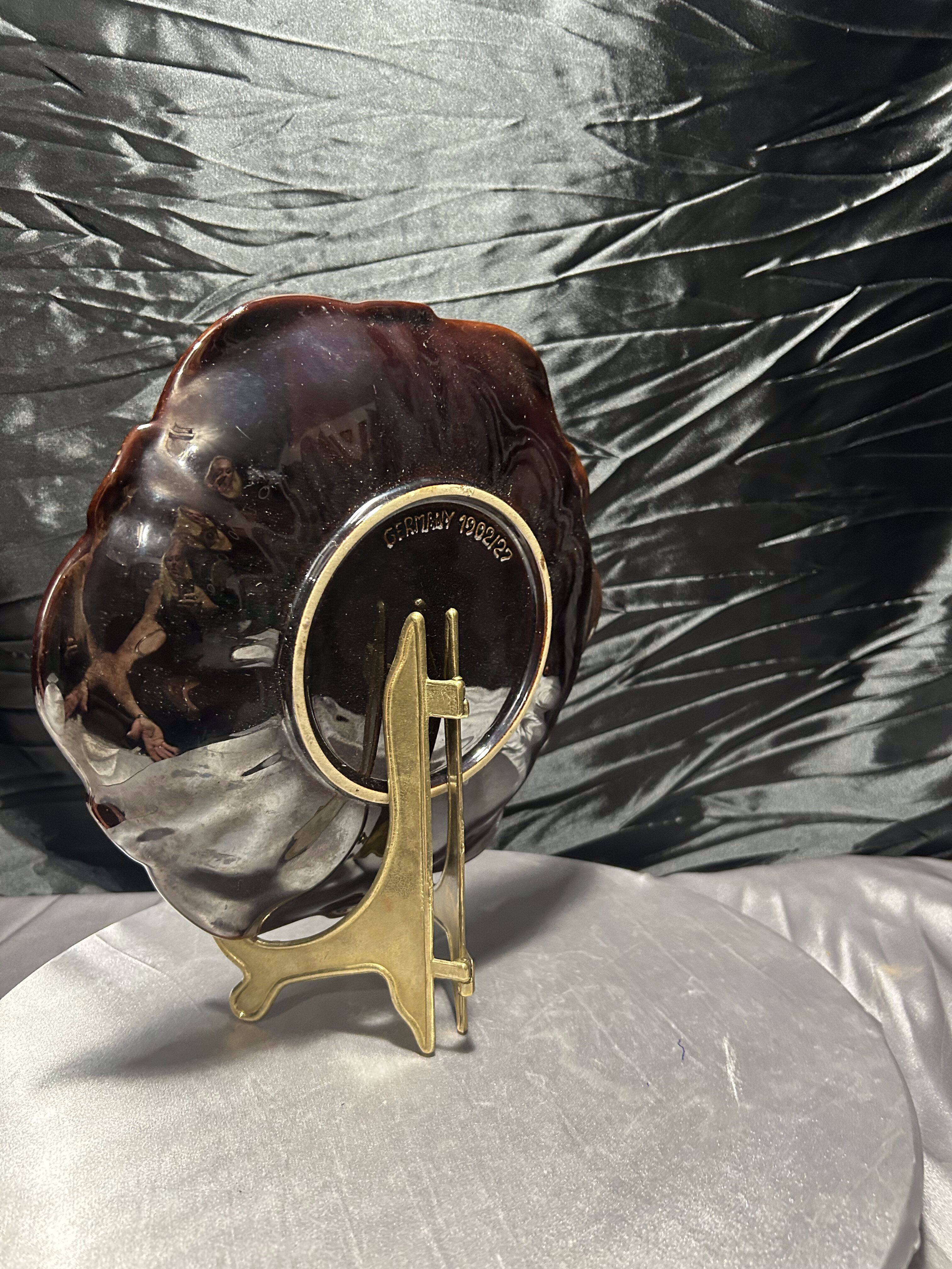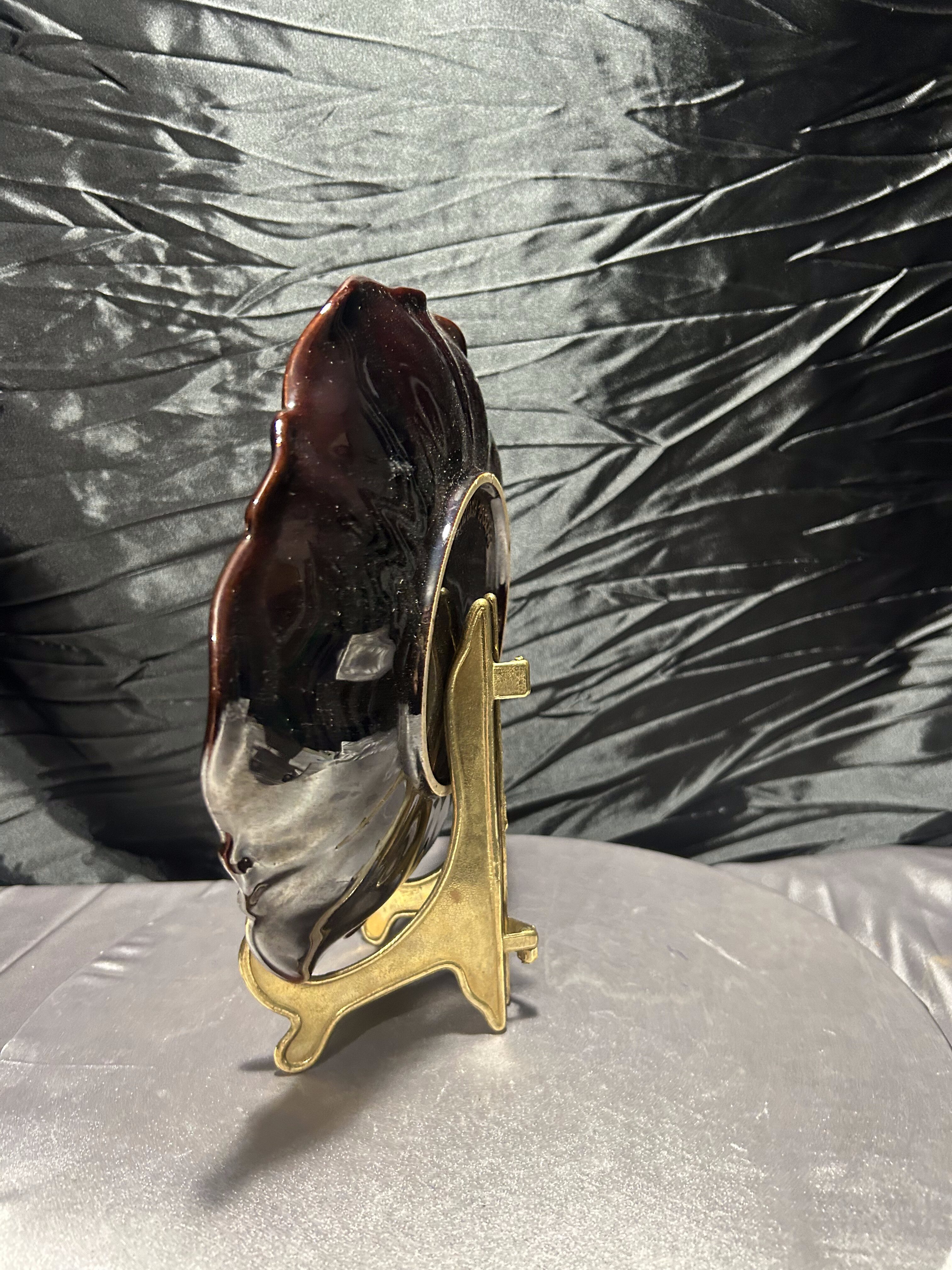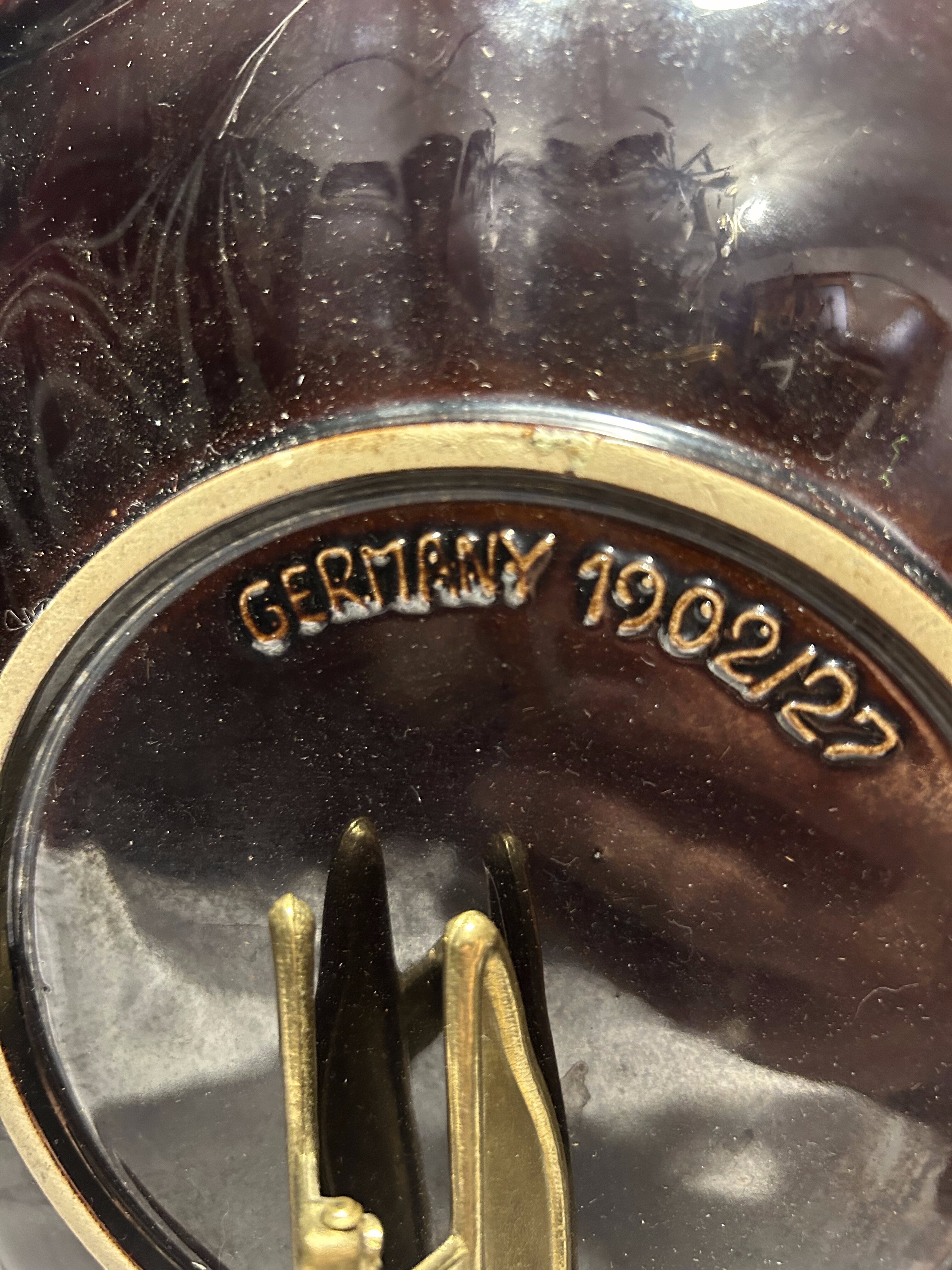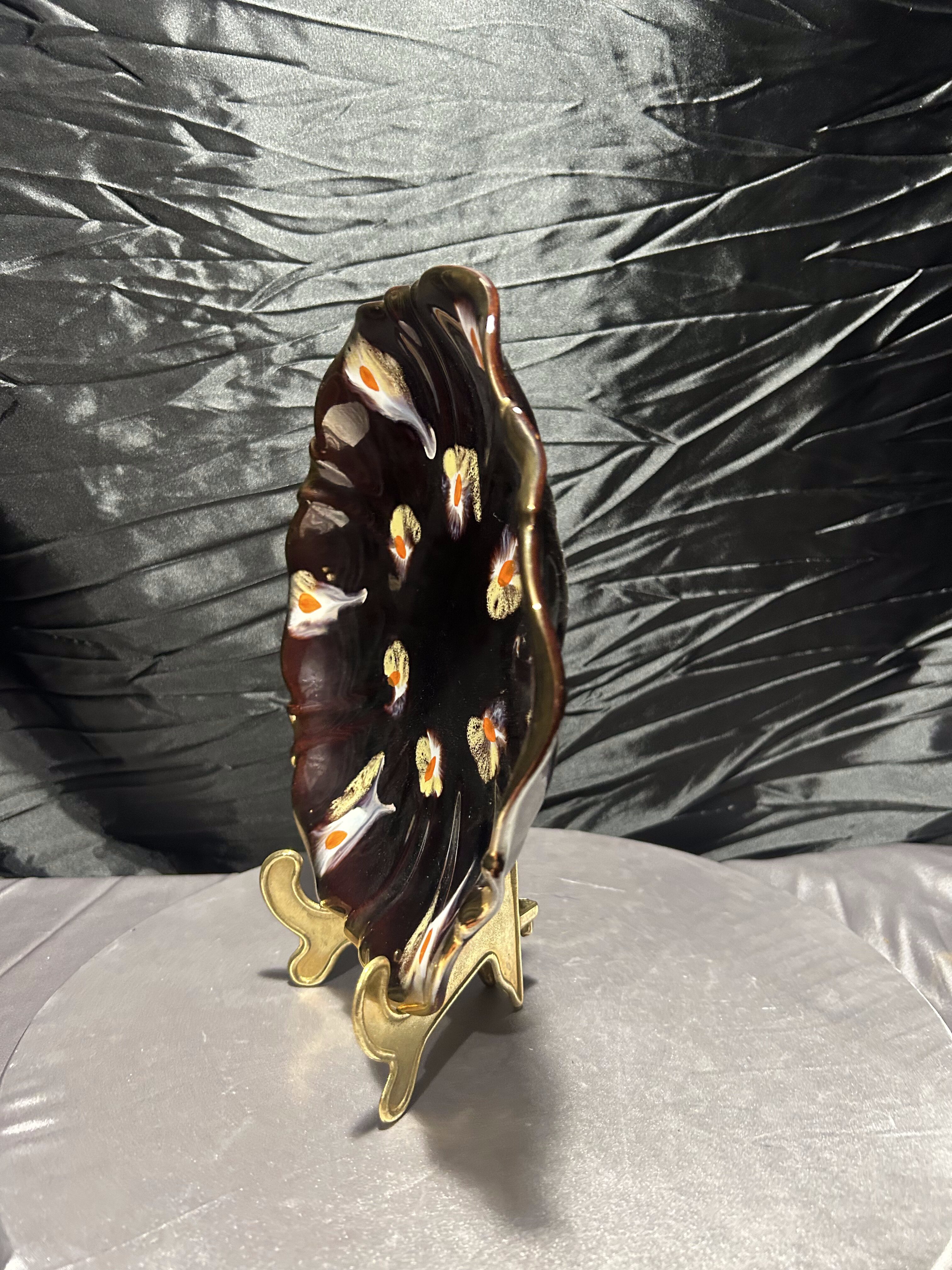 Oryginalny talerz dekoracyjny sygnowany Germany 1902/27, wykonany ze szkła artystycznego o niezwykle ciekawym efekcie barwnym. Dominują głębokie tony brązu i bursztynu z ręcznie nanoszonymi zdobieniami w odcieniach bieli, złota i pomarańczu. Nieregularna forma z delikatnie falującym rantem oraz złocone wykończenia nadają mu wyjątkowej elegancji.