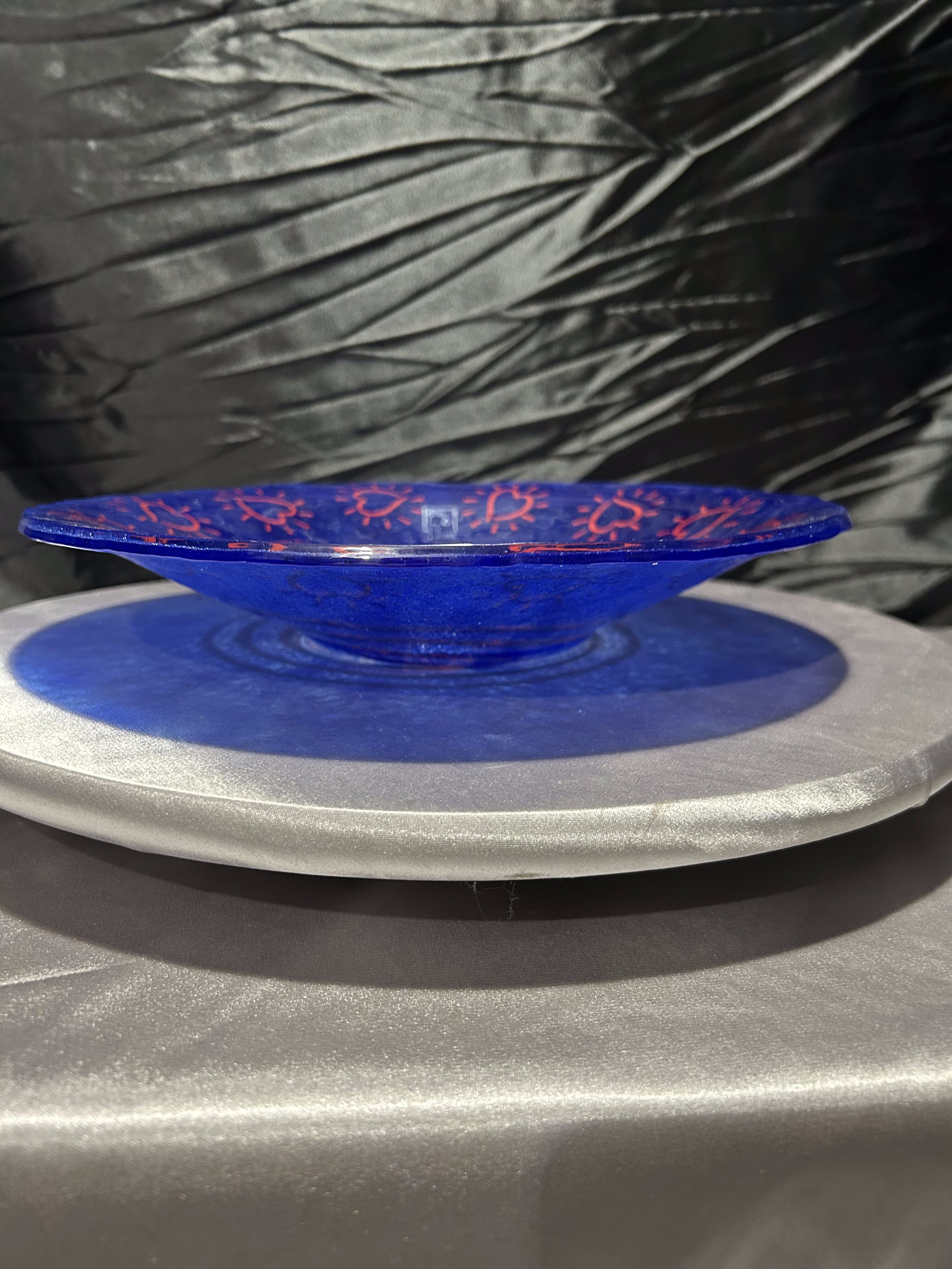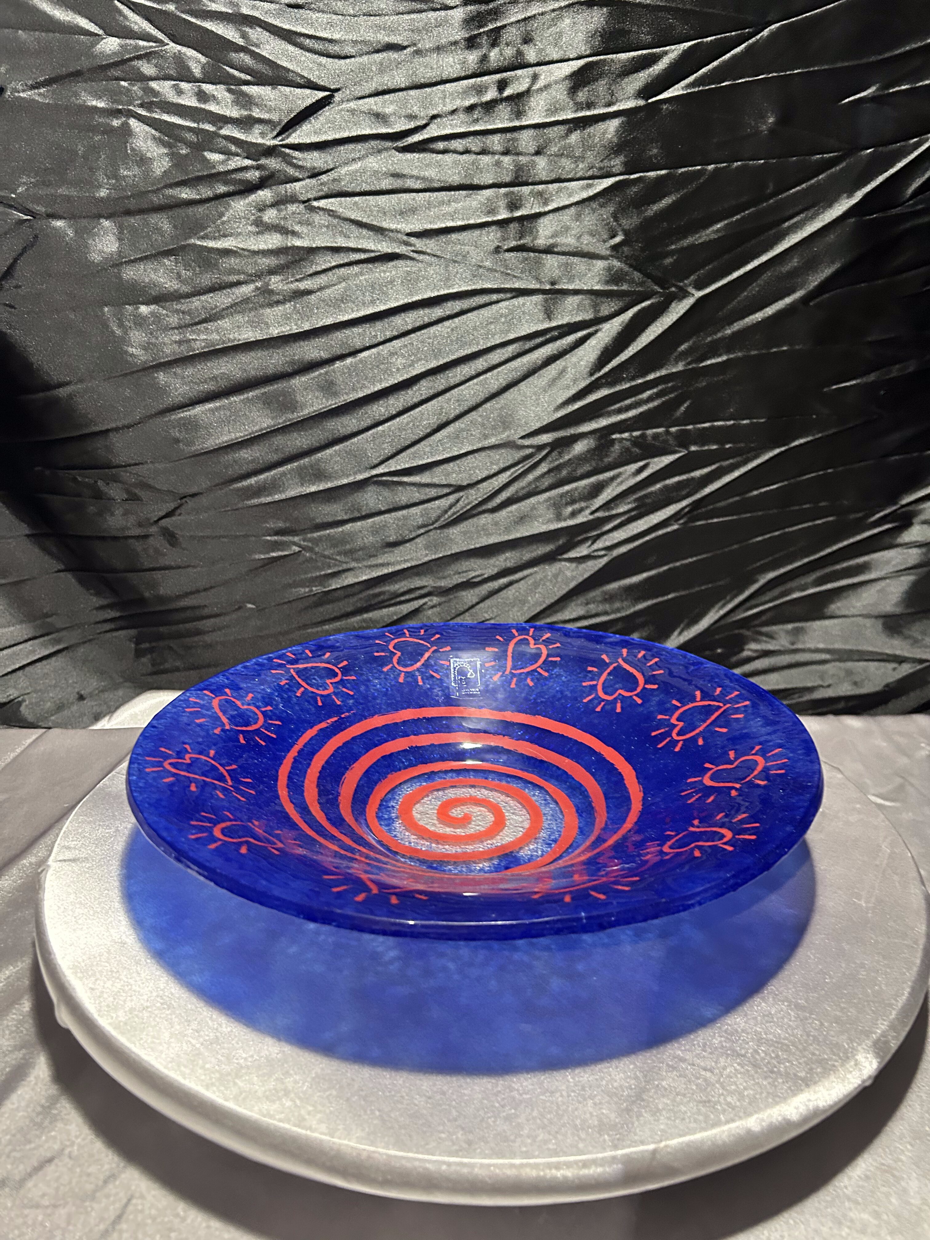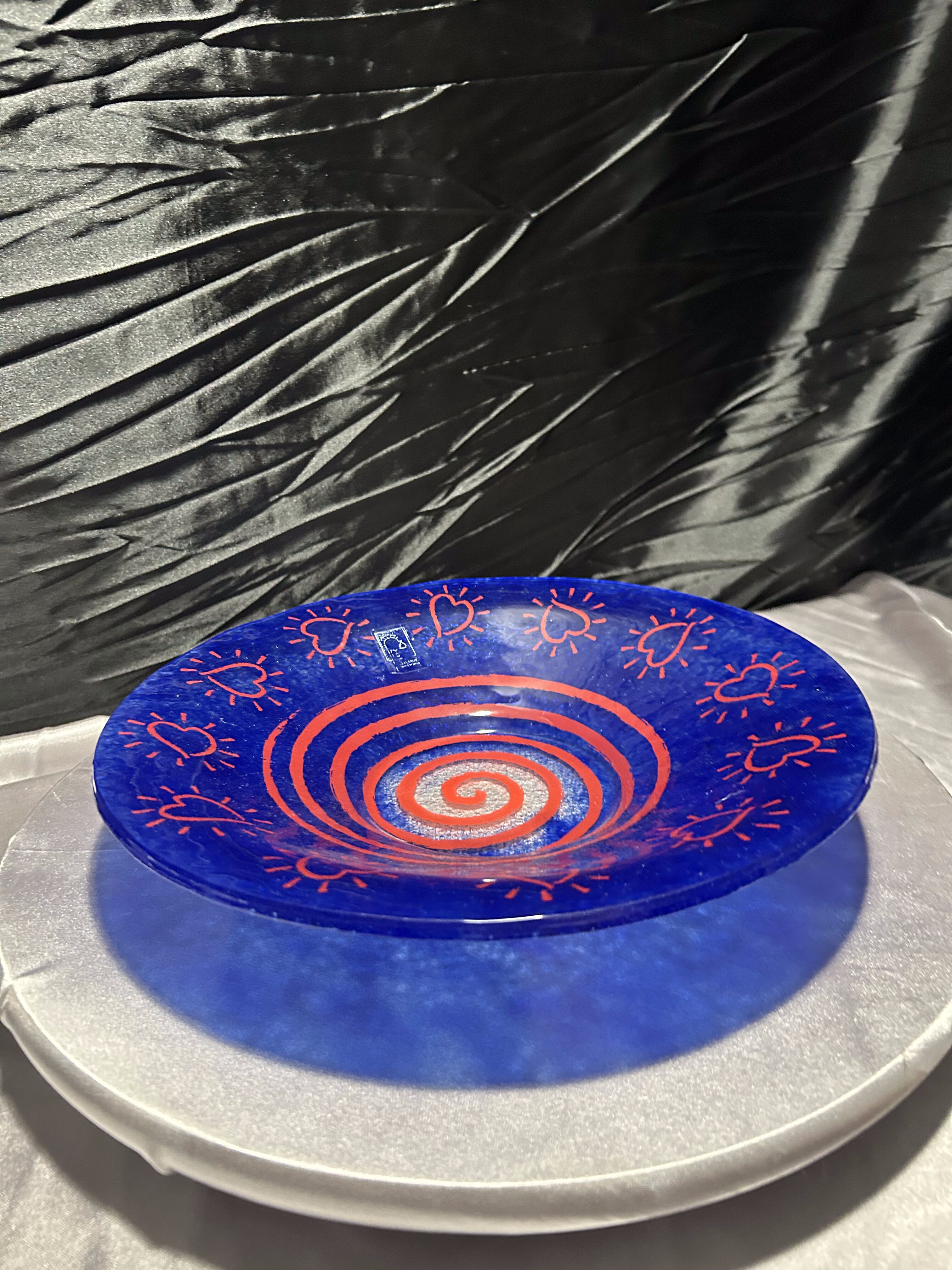 Artystyczny talerz dekoracyjny wykonany ze szkła w intensywnym odcieniu kobaltowego błękitu, ozdobiony ręcznie malowanymi czerwonymi serduszkami i spiralnym wzorem. Pochodzi z hiszpańskiej manufaktury Vidrios San Miguel, znanej z ręcznego wytwarzania szkła artystycznego i użytkowego. Każdy egzemplarz tej marki to unikat, powstały z dbałością o detale i charakterystyczną ekspresję koloru. Talerz pięknie prezentuje się jako dekoracja stołu, komody lub zawieszony na ścianie. Stojak widoczny na zdjęciu nie jest częścią oferty.
