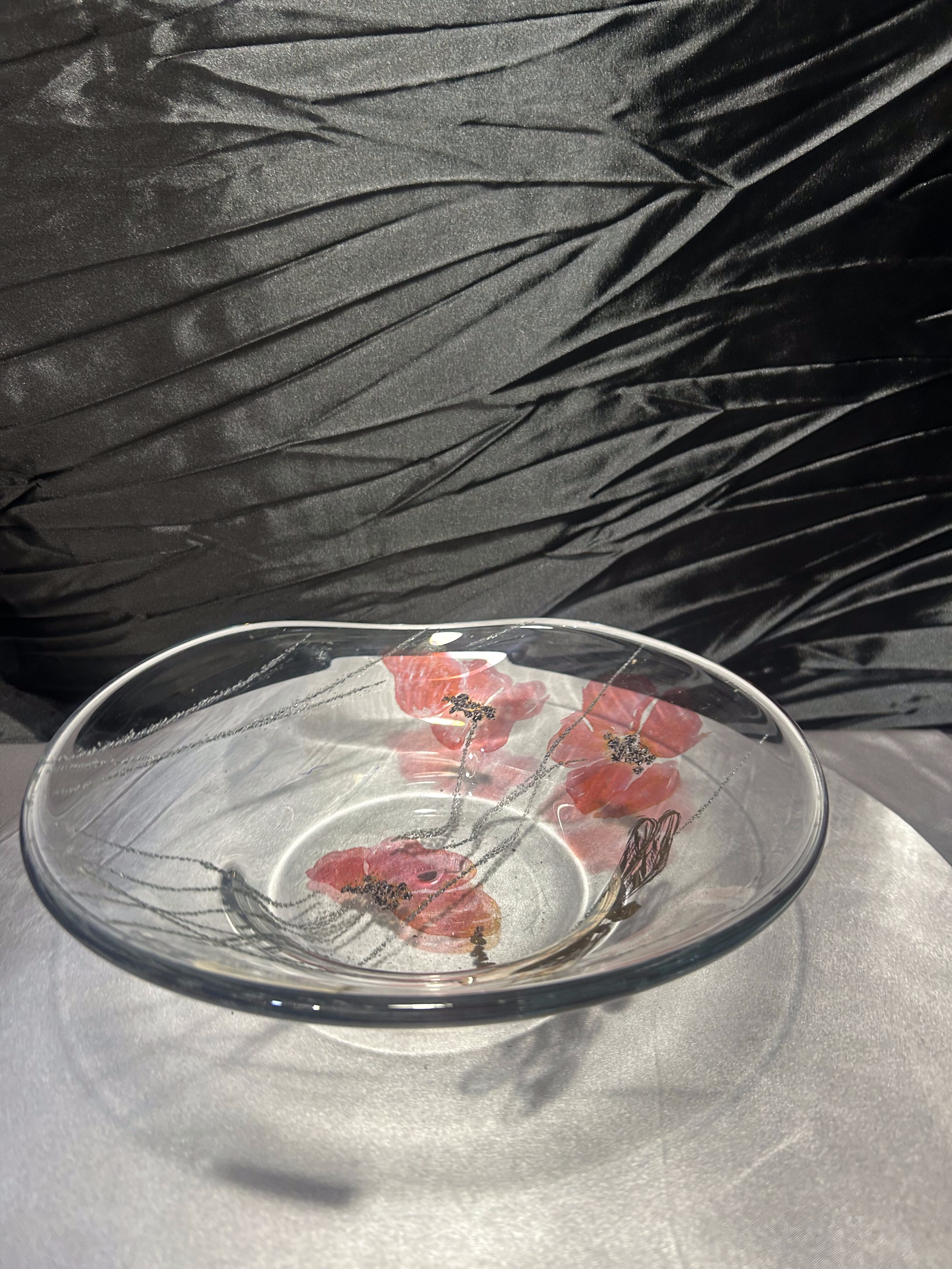 Motyw czerwonych maków i złotej ważki tworzy kompozycję o wyjątkowym uroku, łączącą delikatność natury z nowoczesną formą szkła. Drobne pęcherzyki powietrza w strukturze dodają głębi i artystycznego charakteru.