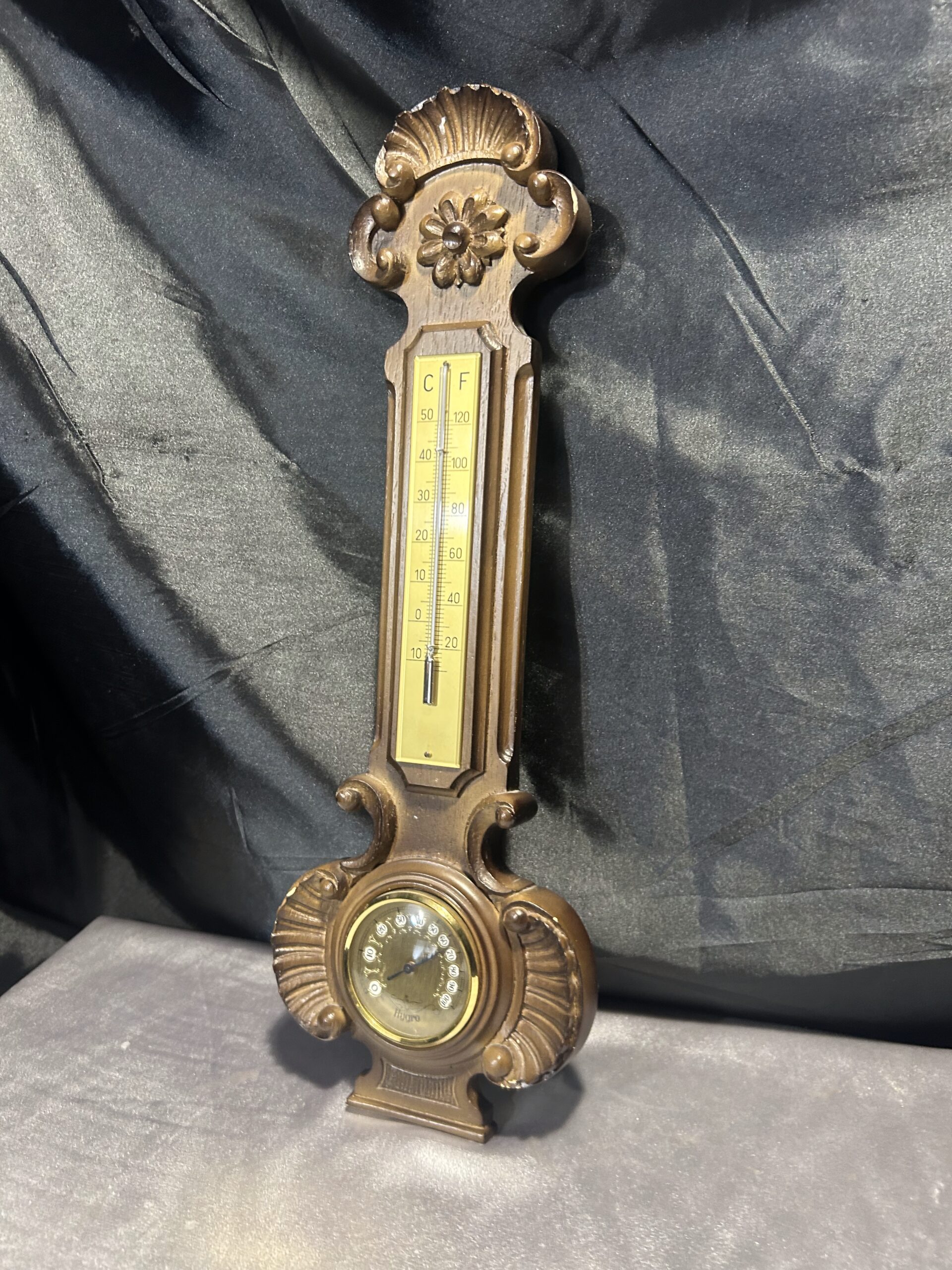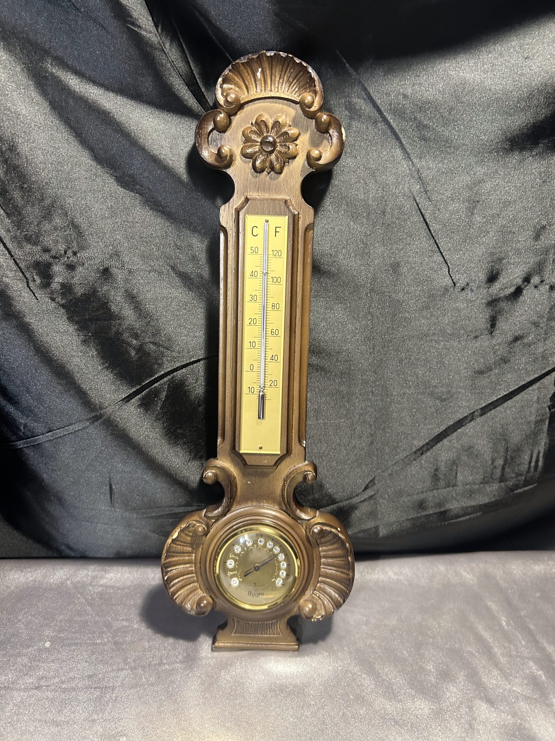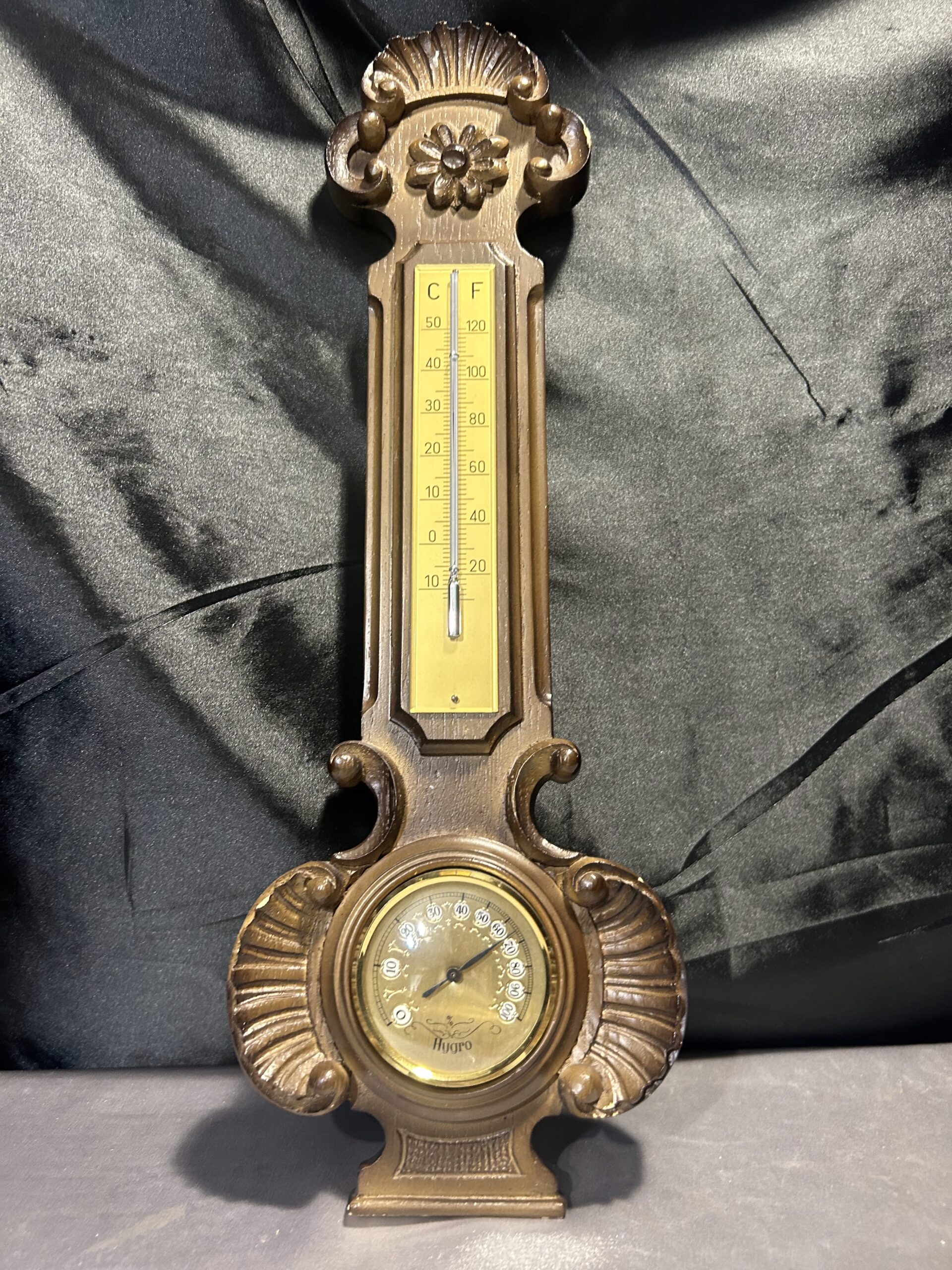 Stylowy zestaw mierników – termometr i higrometr – osadzony w eleganckiej, drewnopodobnej ramie o dekoracyjnym wykończeniu. Klasyczny design sprawia, że doskonale komponuje się z wnętrzami w stylu retro, rustykalnym czy vintage. Praktyczna możliwość zawieszenia na ścianie czyni go zarówno funkcjonalnym, jak i dekoracyjnym elementem każdego pomieszczenia.