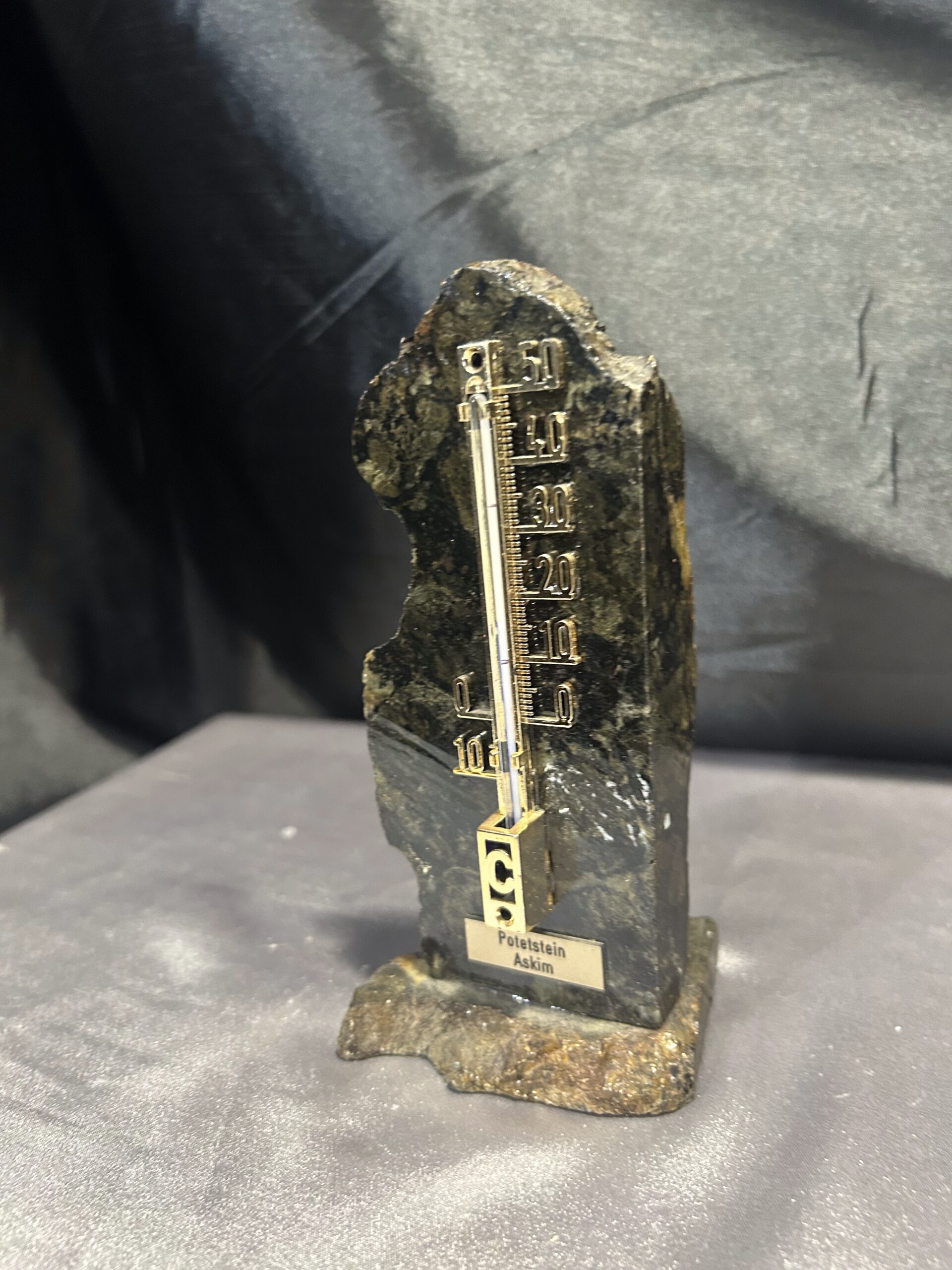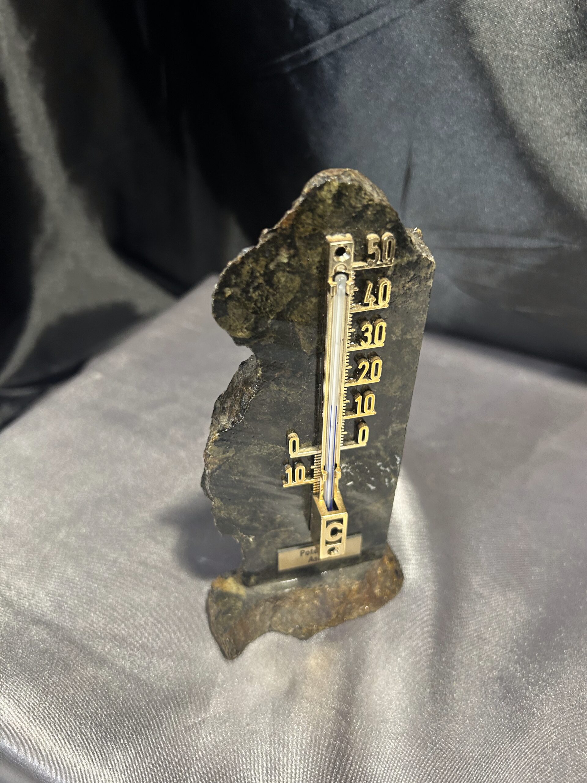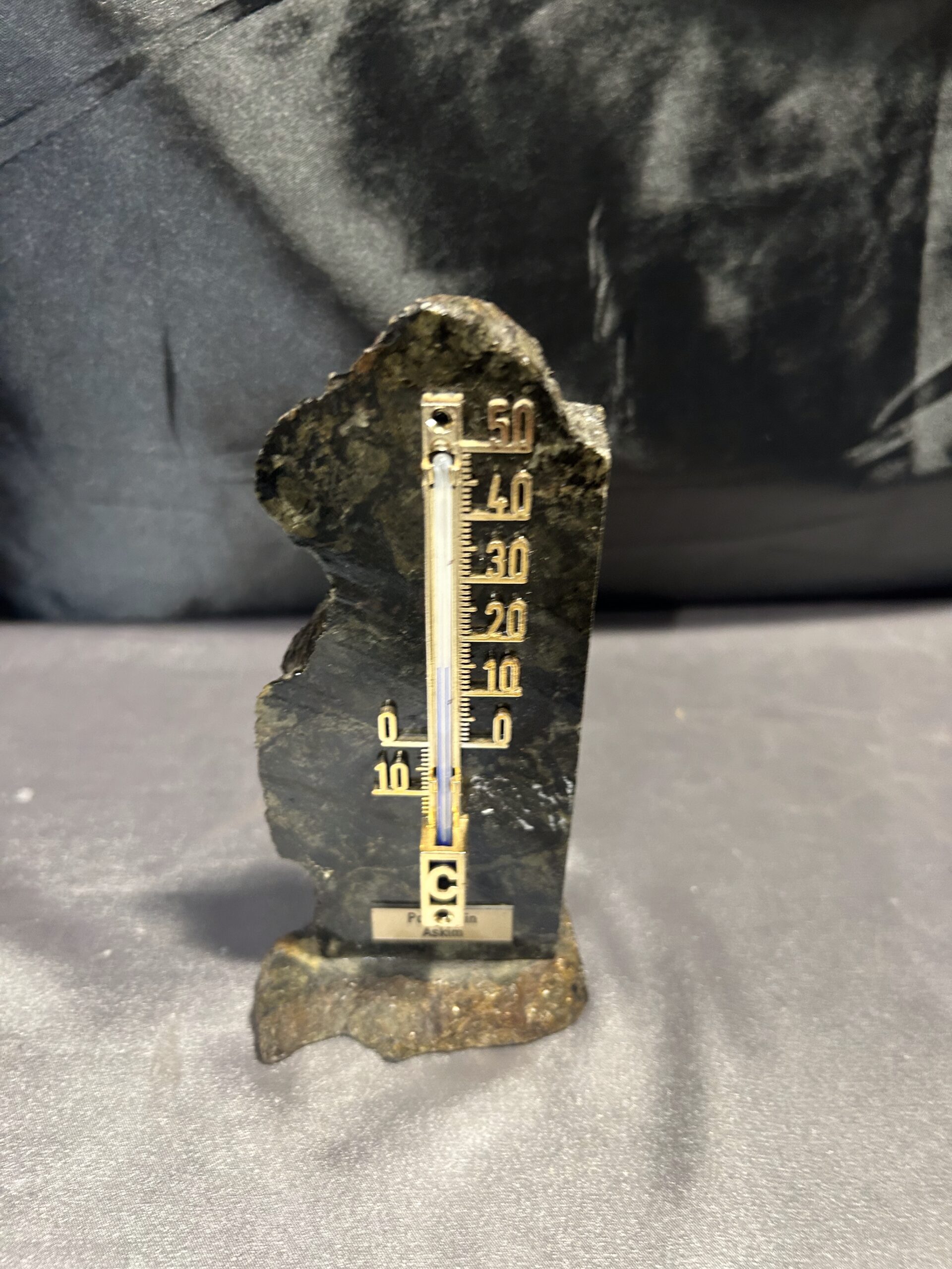 Stylowy termometr osadzony na naturalnym, ciemnozielonym kamieniu. Jego unikalna forma łączy surowość i elegancję – z tyłu widoczna jest nieoszlifowana, naturalna powierzchnia, natomiast przód został przecięty i wygładzony, co tworzy efektowny kontrast. Doskonały do postawienia na półce, biurku lub komodzie jako funkcjonalna i dekoracyjna ozdoba wnętrza.
