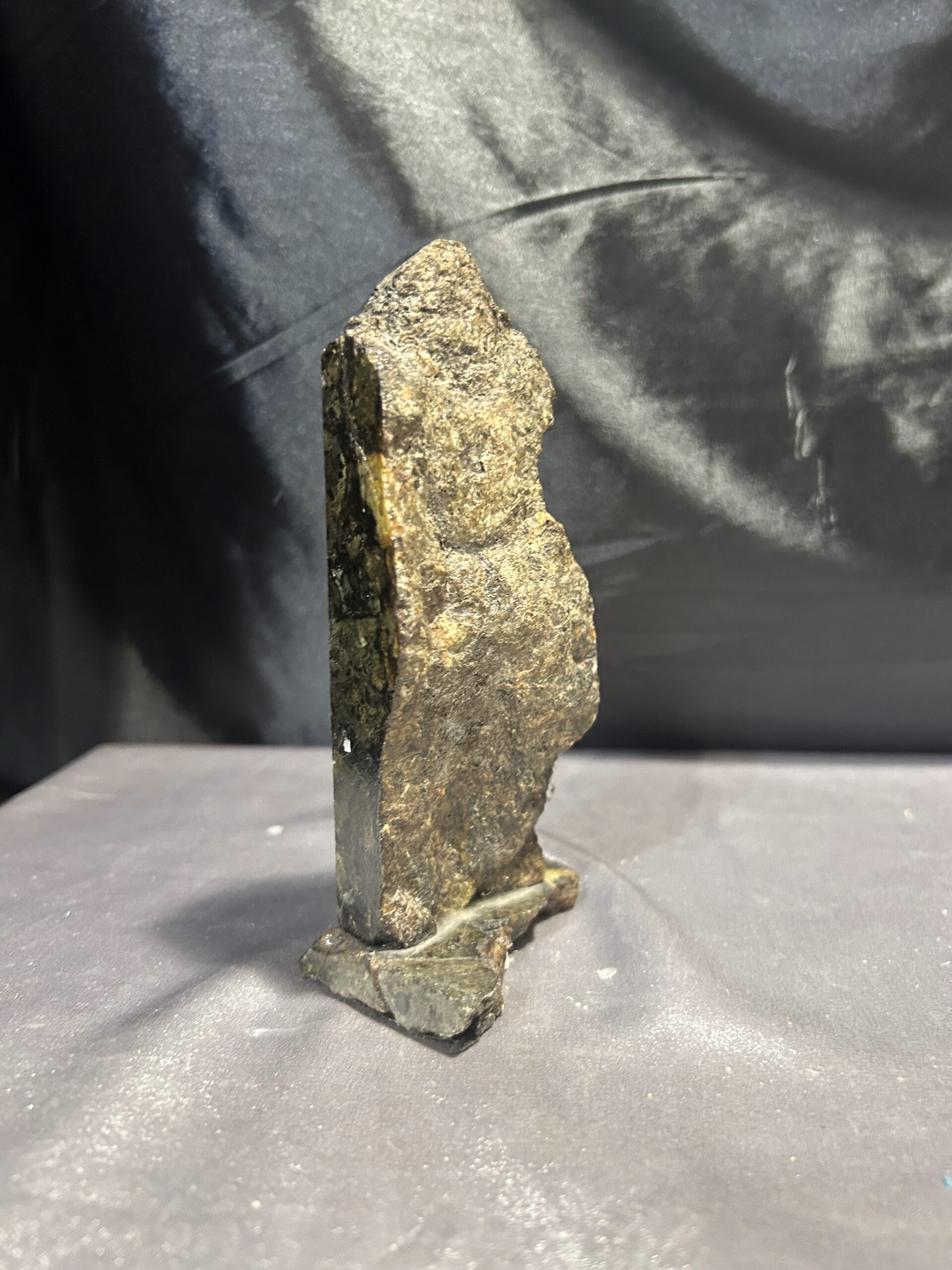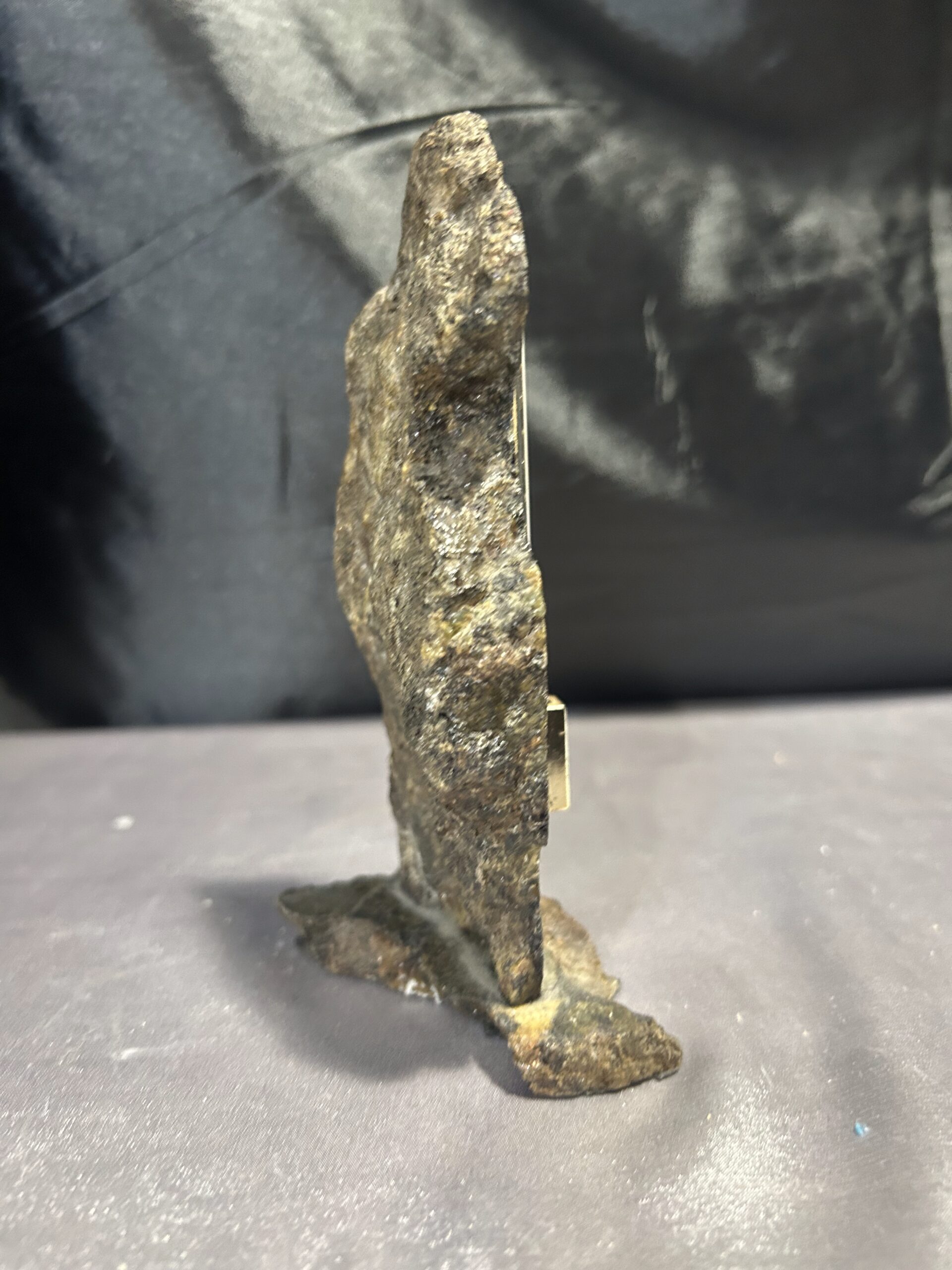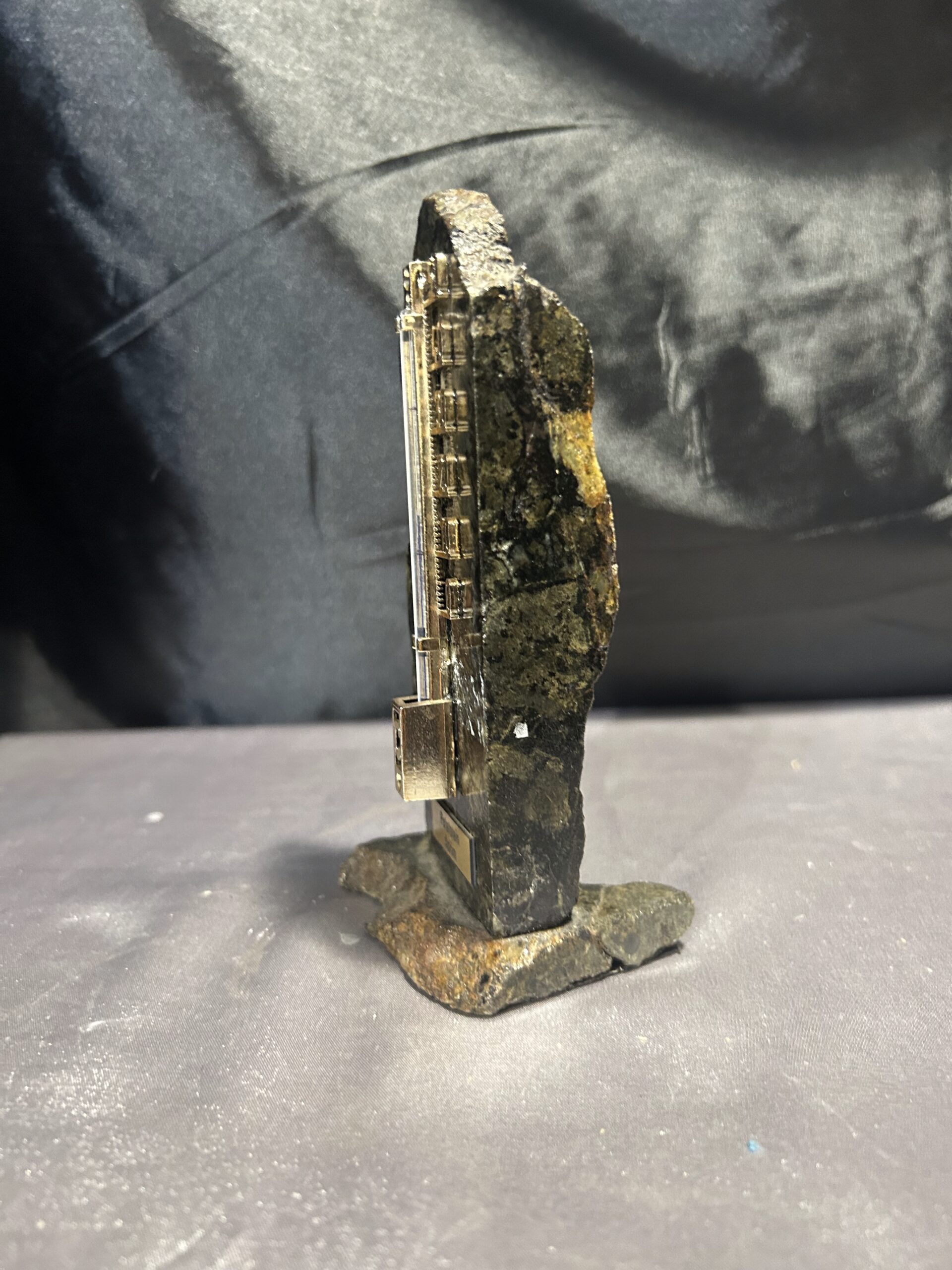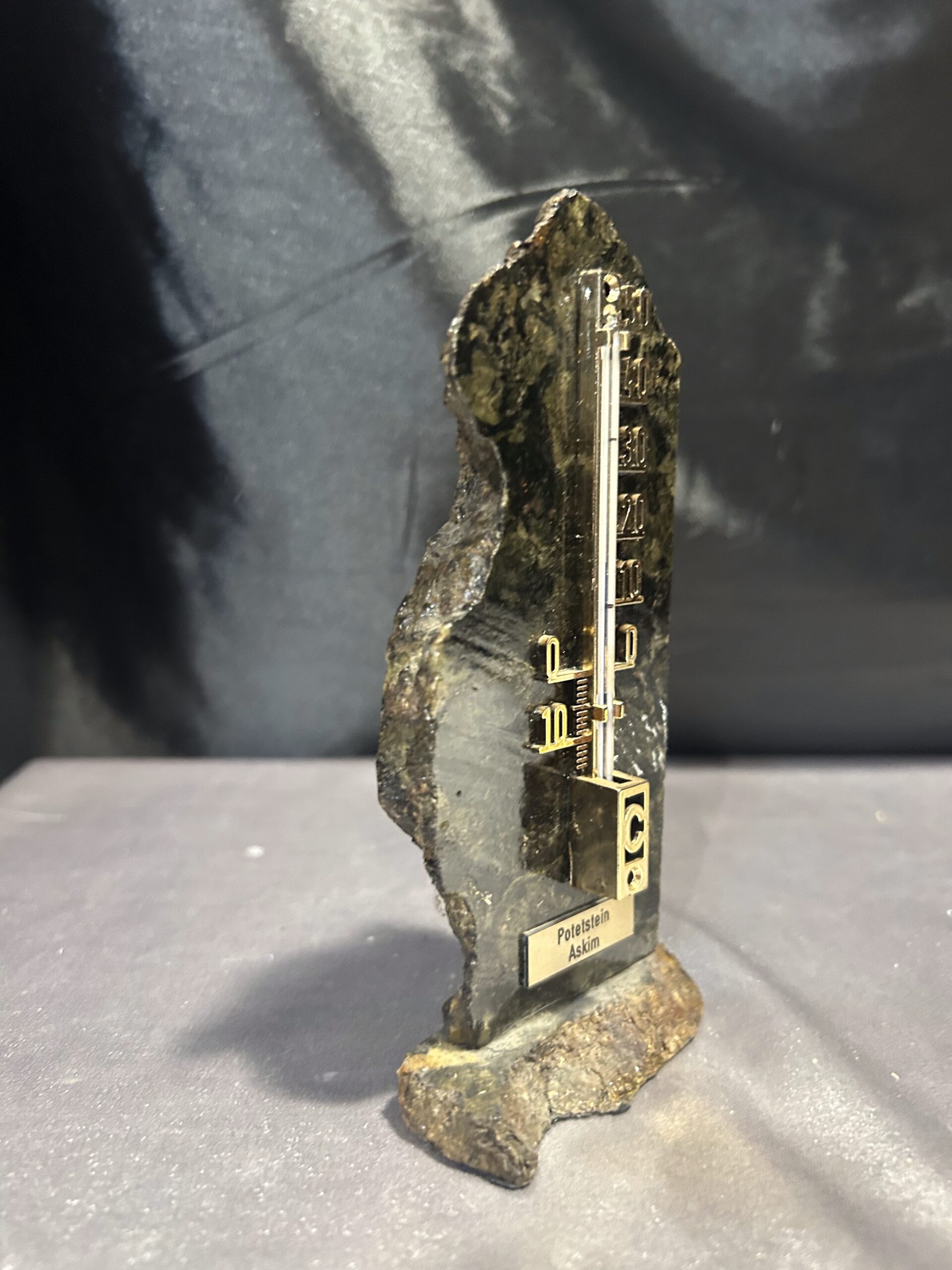 Stylowy termometr osadzony na naturalnym, ciemnozielonym kamieniu. Jego unikalna forma łączy surowość i elegancję – z tyłu widoczna jest nieoszlifowana, naturalna powierzchnia, natomiast przód został przecięty i wygładzony, co tworzy efektowny kontrast. Doskonały do postawienia na półce, biurku lub komodzie jako funkcjonalna i dekoracyjna ozdoba wnętrza.