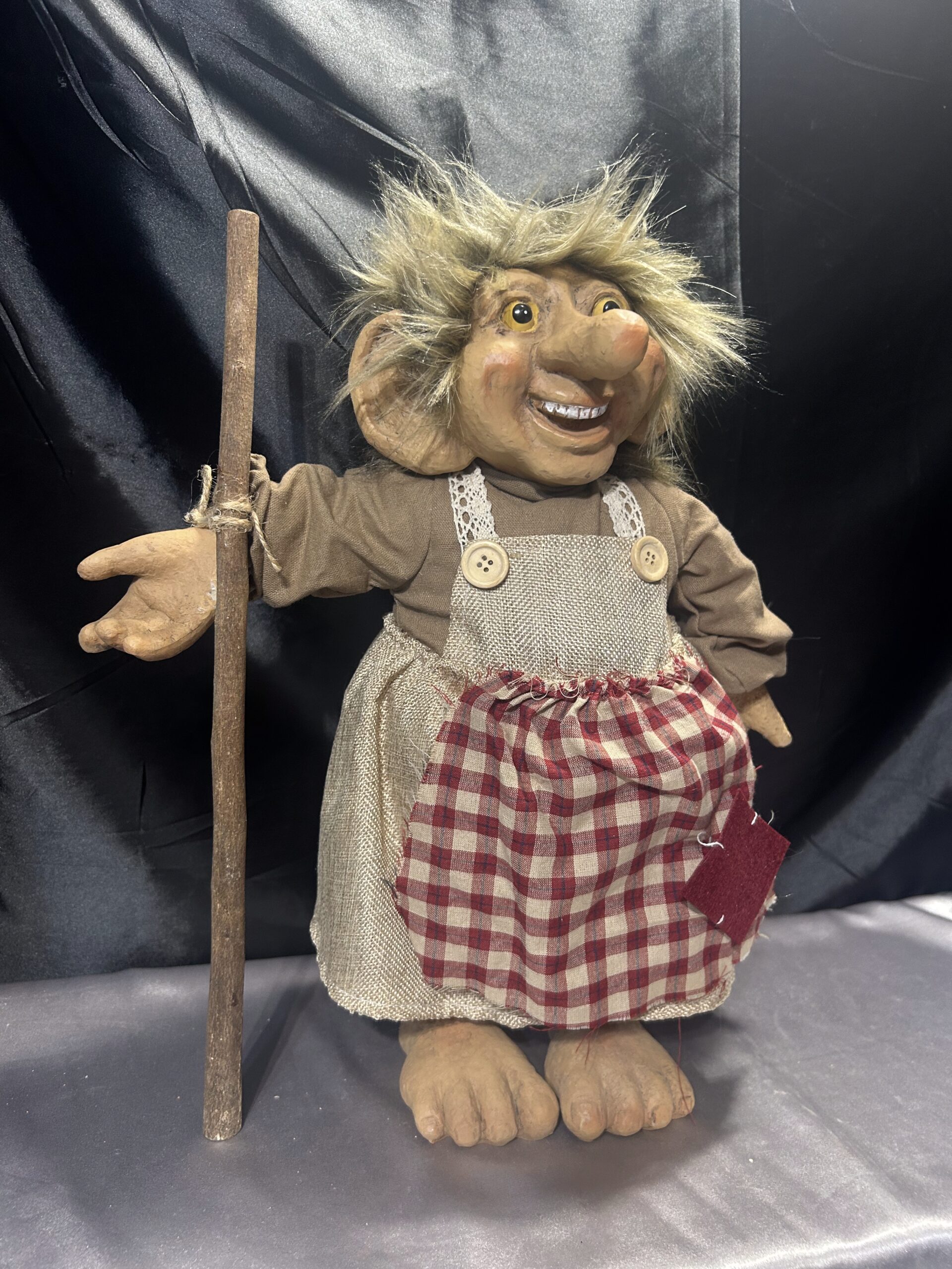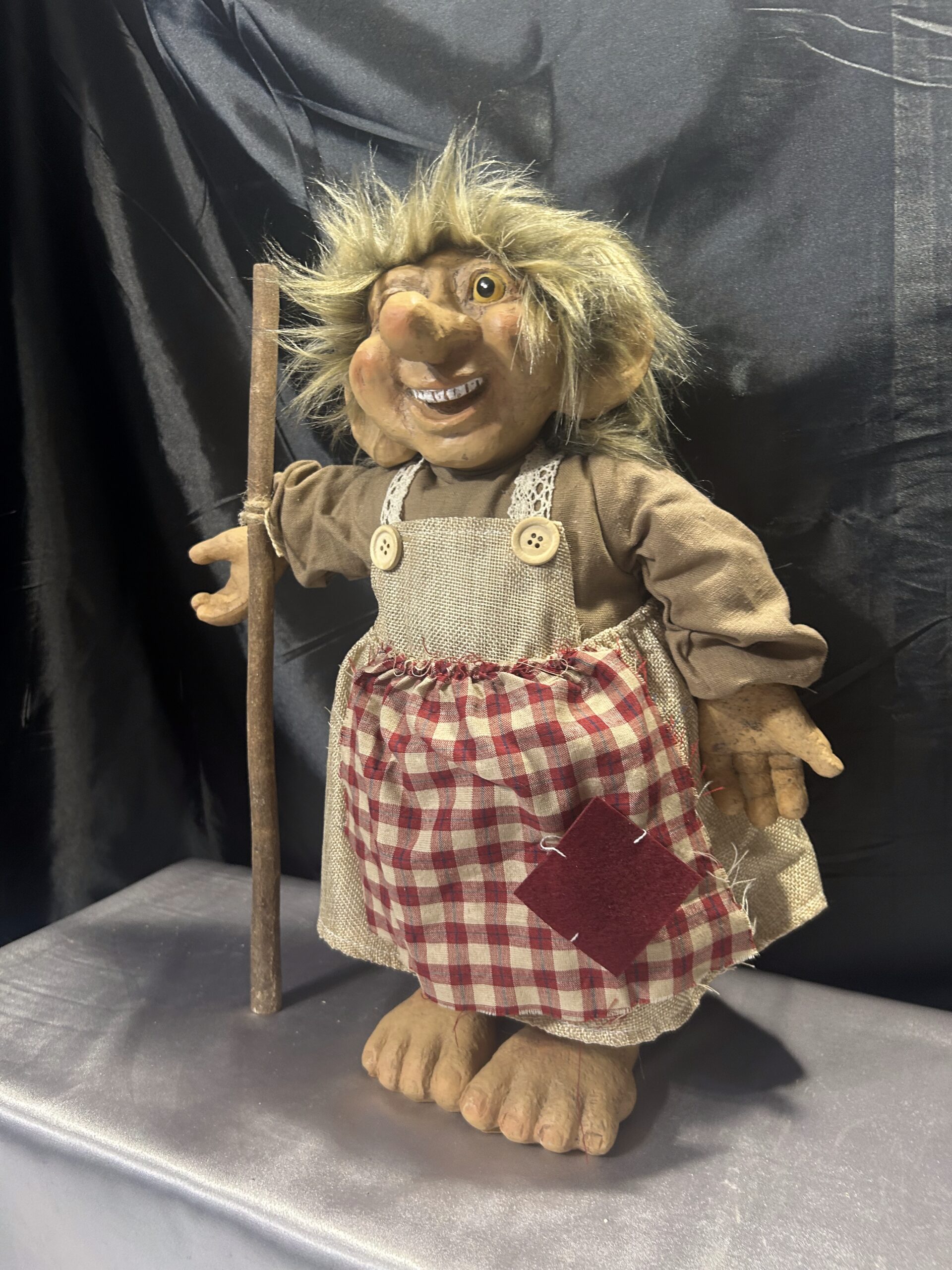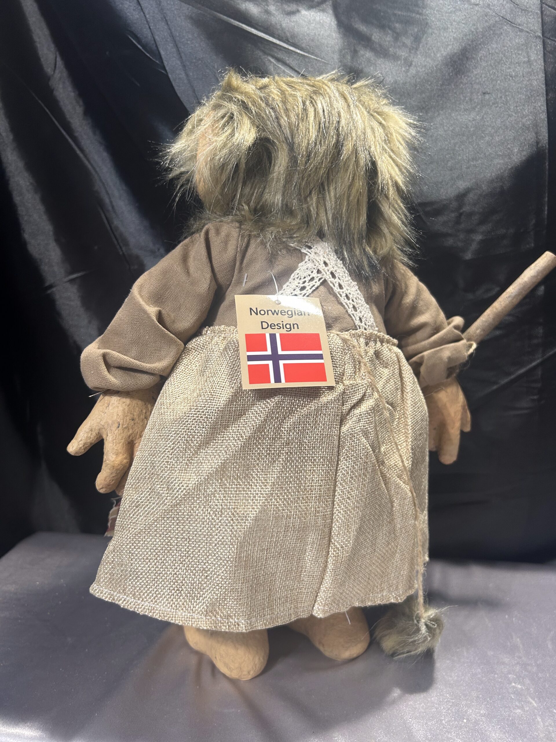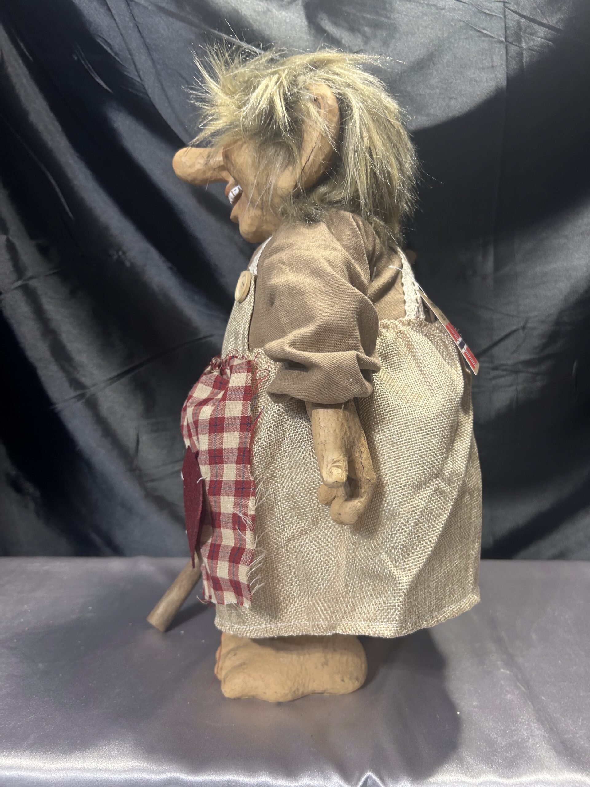 Przedstawiam unikalną figurkę norweskiego trolla, ubranego jak gospodyni, z fartuchem i drewnianym kijem. To klasyczna norweska pamiątka, przywieziona prosto z Norwegii, wciąż z oryginalną metką. Figurka łączy różne materiały – nogi, ręce i głowa wykonane są z tworzywa, a tułów pozostaje miękki, co nadaje jej nietuzinkowego charakteru.