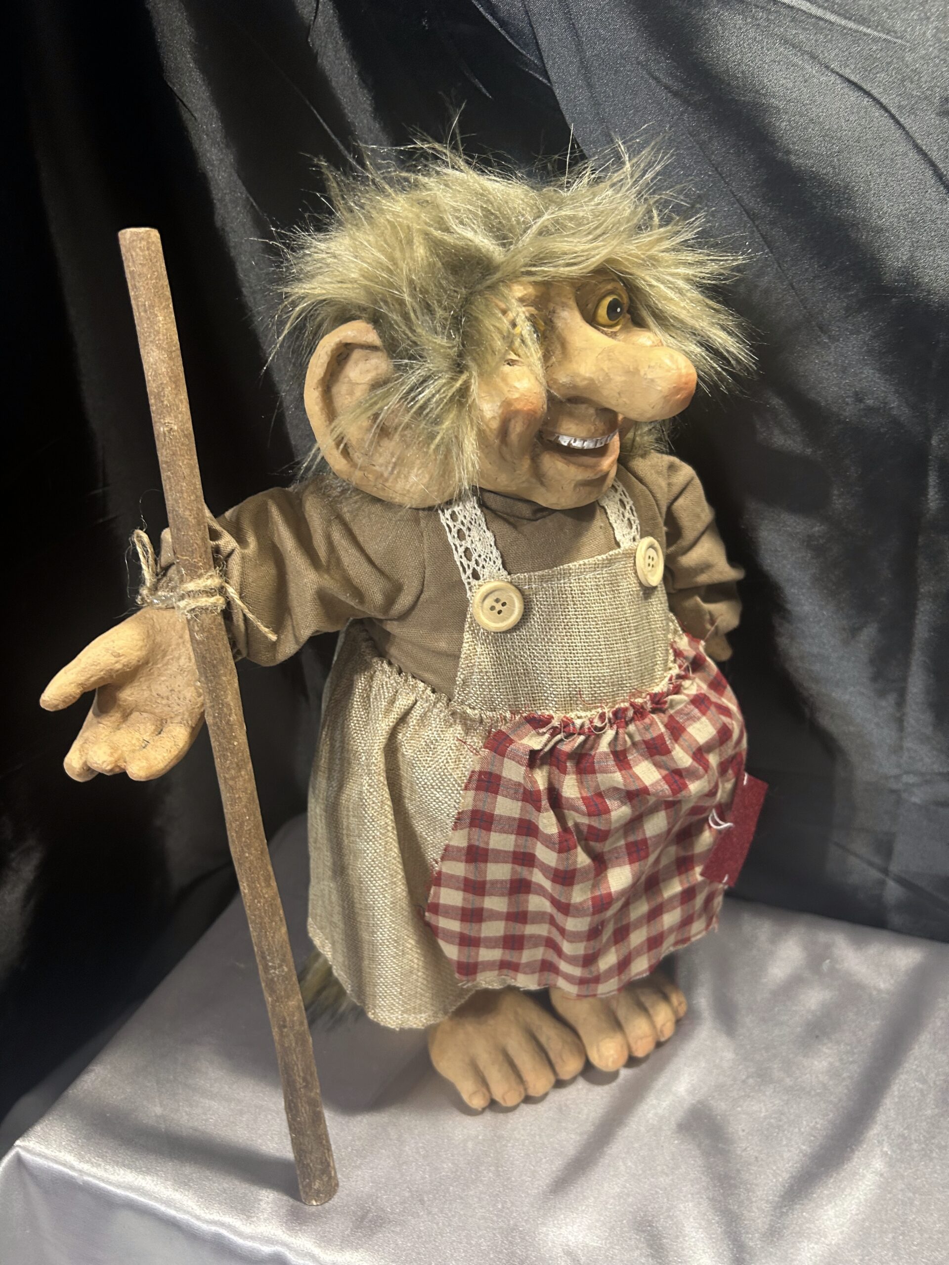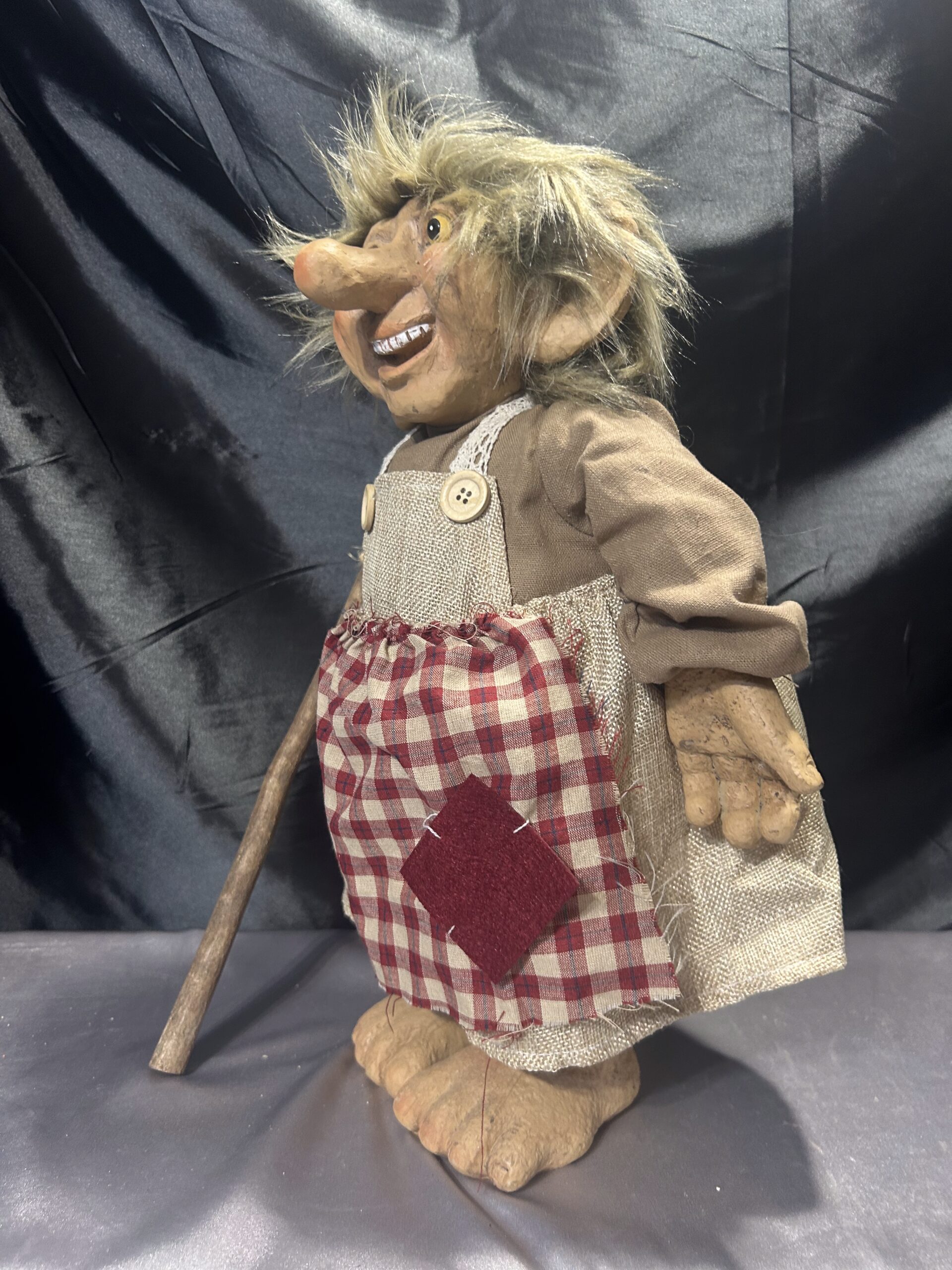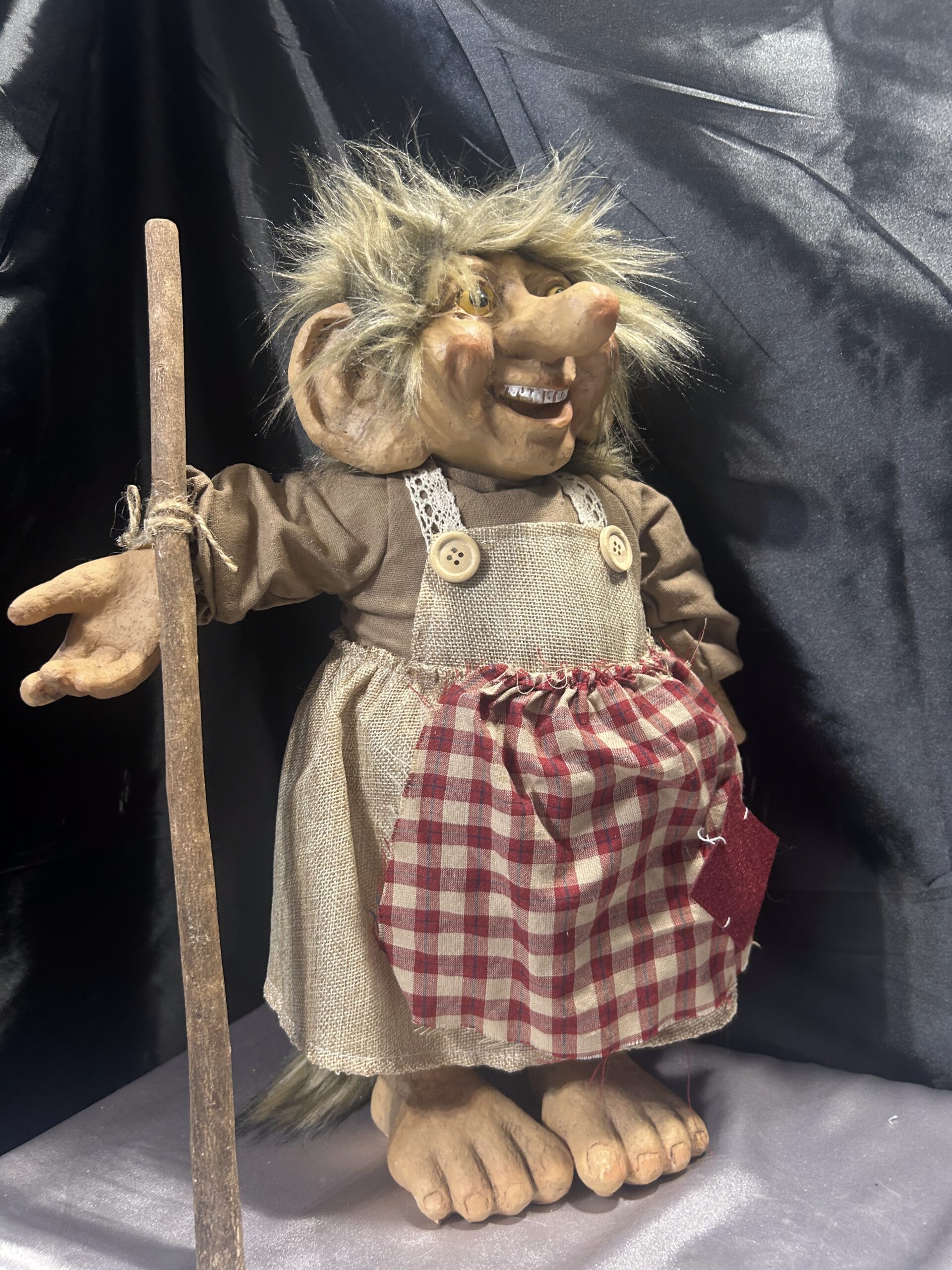 - Troll w stroju gospodyni, z fartuchem i drewnianym kijem, co podkreśla jej oryginalny wygląd
