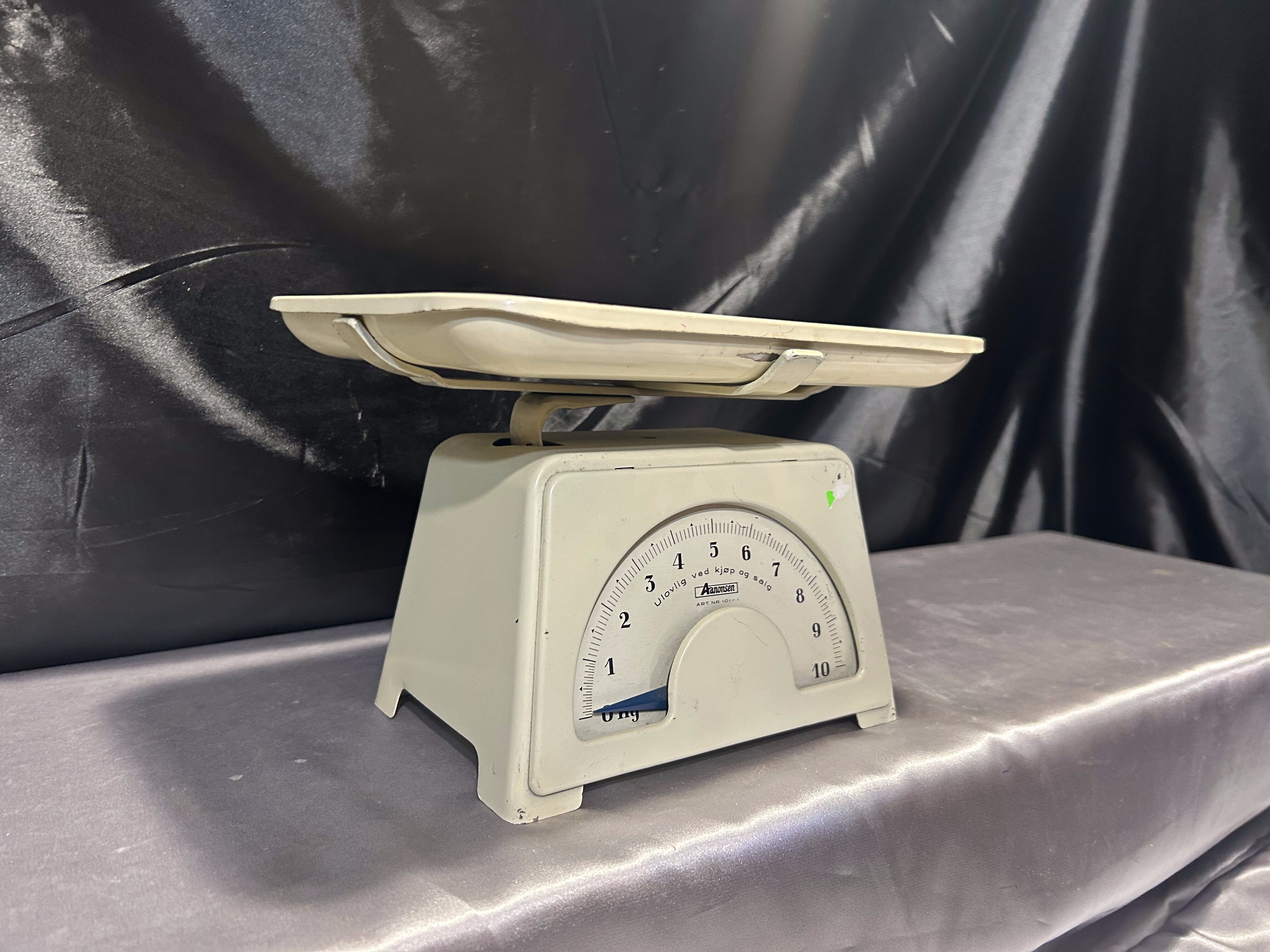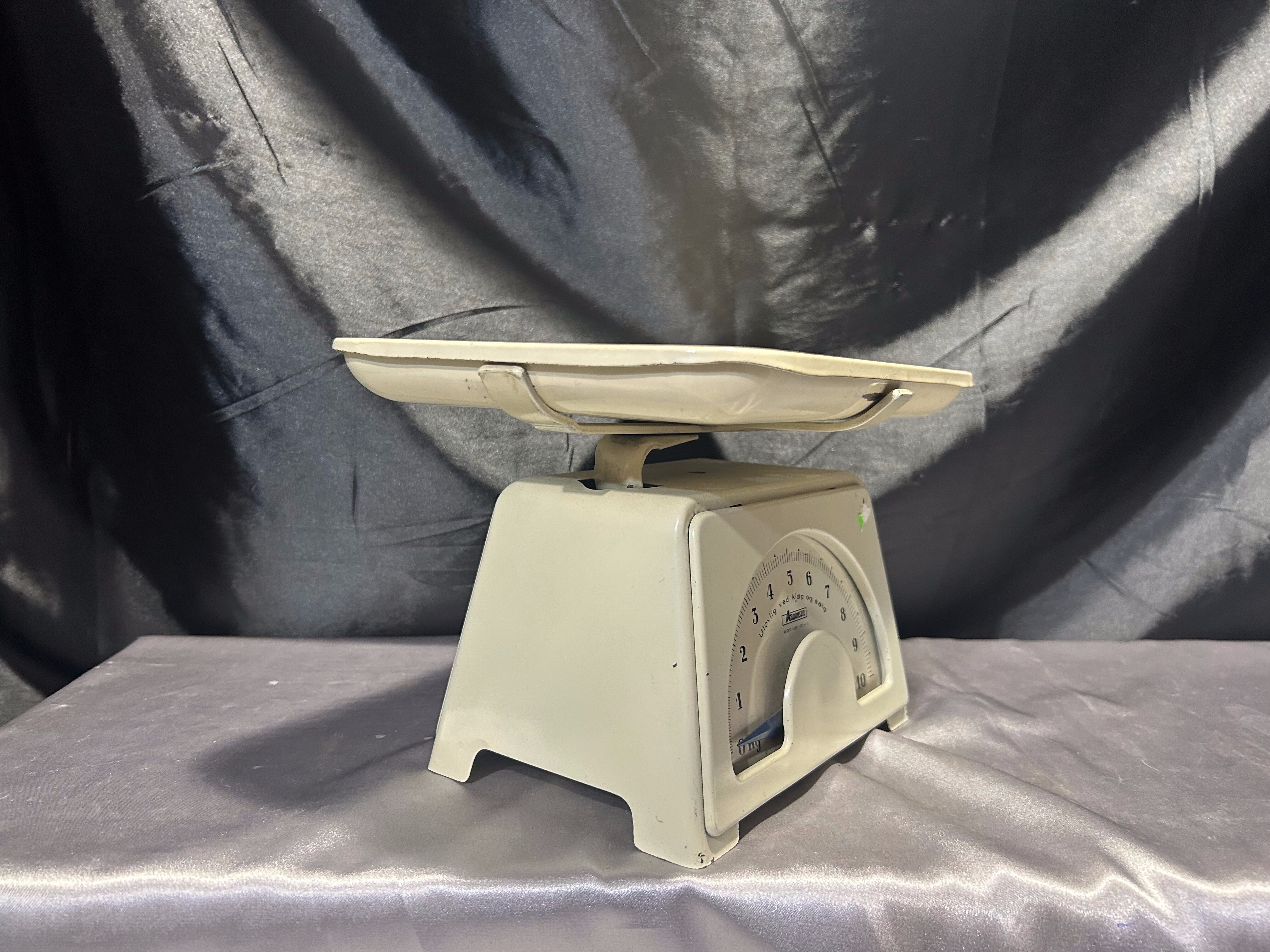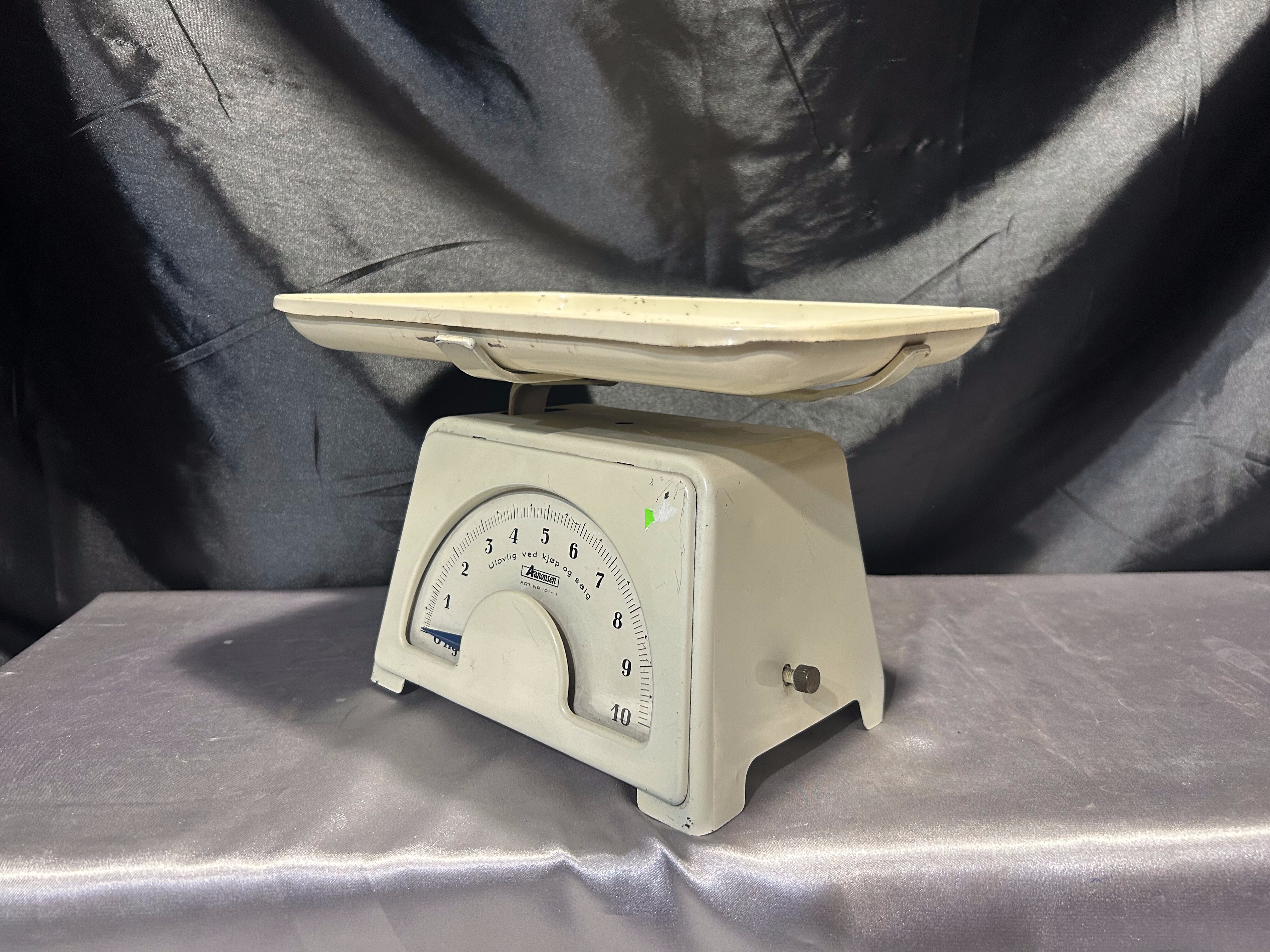 Na sprzedaż stylowa waga kuchenna marki Aanonsen w klasycznym kolorze ecru, wyposażona w prostokątny talerz i skalę do 10 kg. Solidna konstrukcja i elegancka forma sprawiają, że waga może pełnić funkcję zarówno praktycznego narzędzia kuchennego, jak i stylowej dekoracji w klimacie vintage lub retro.