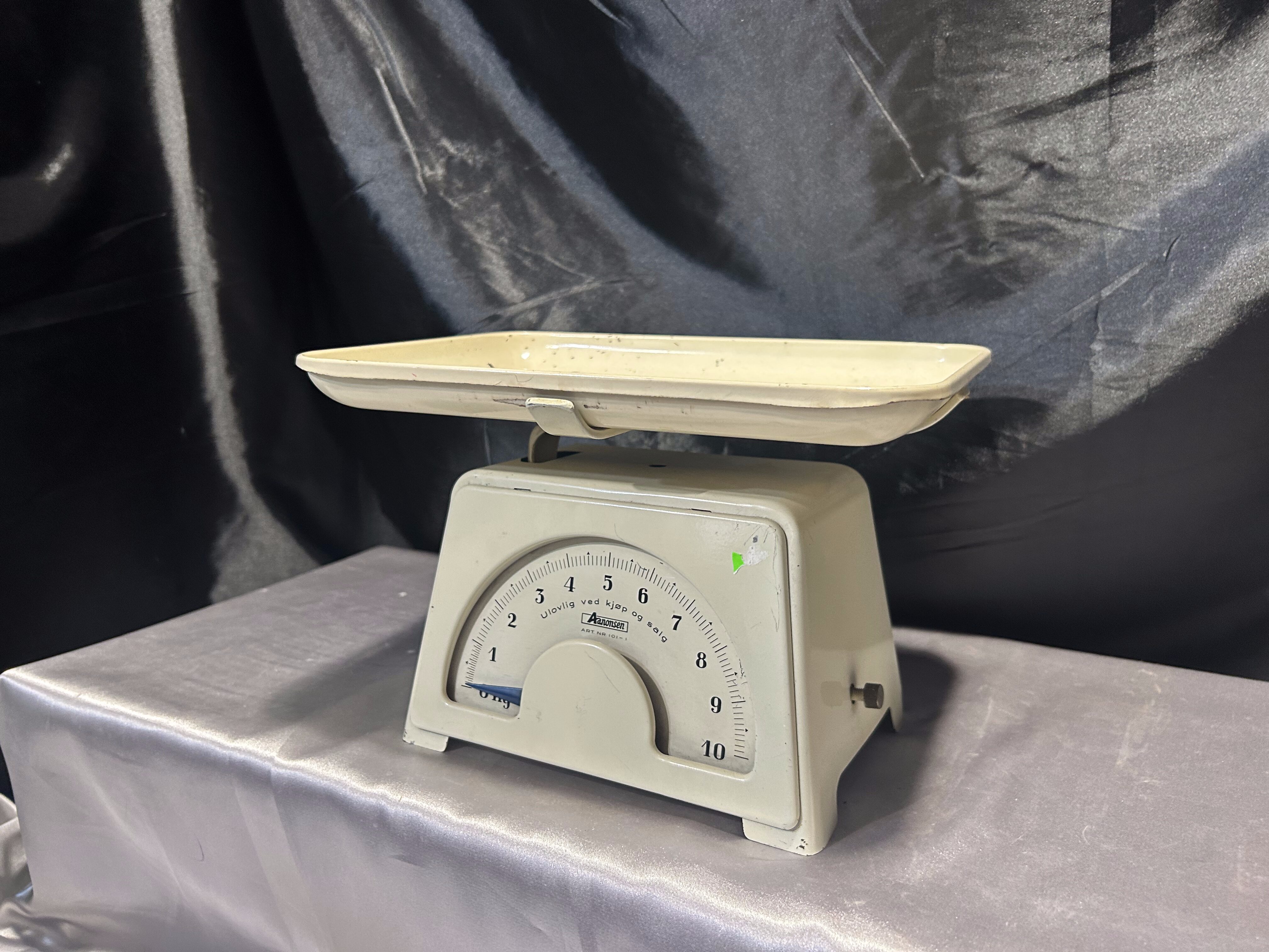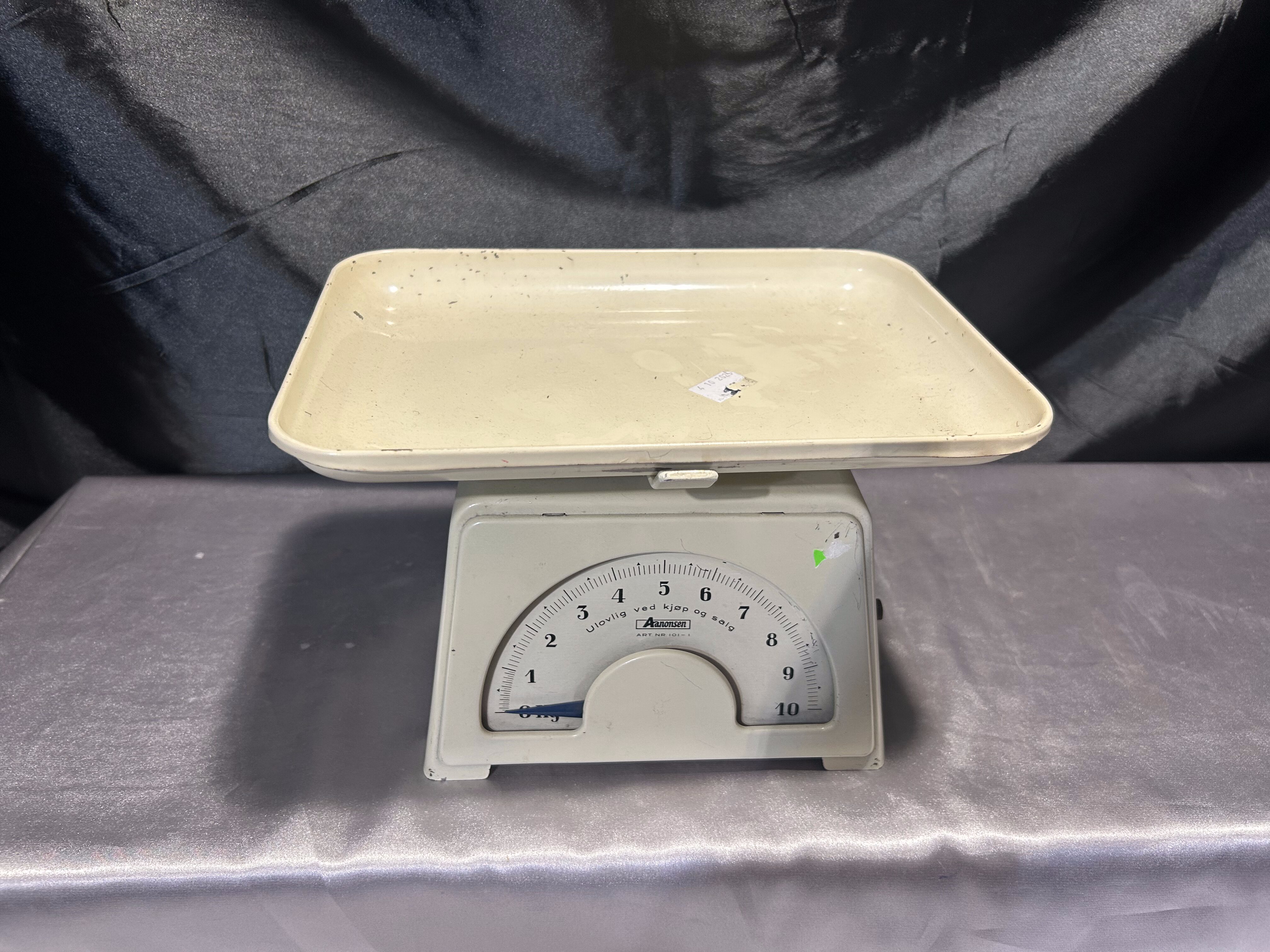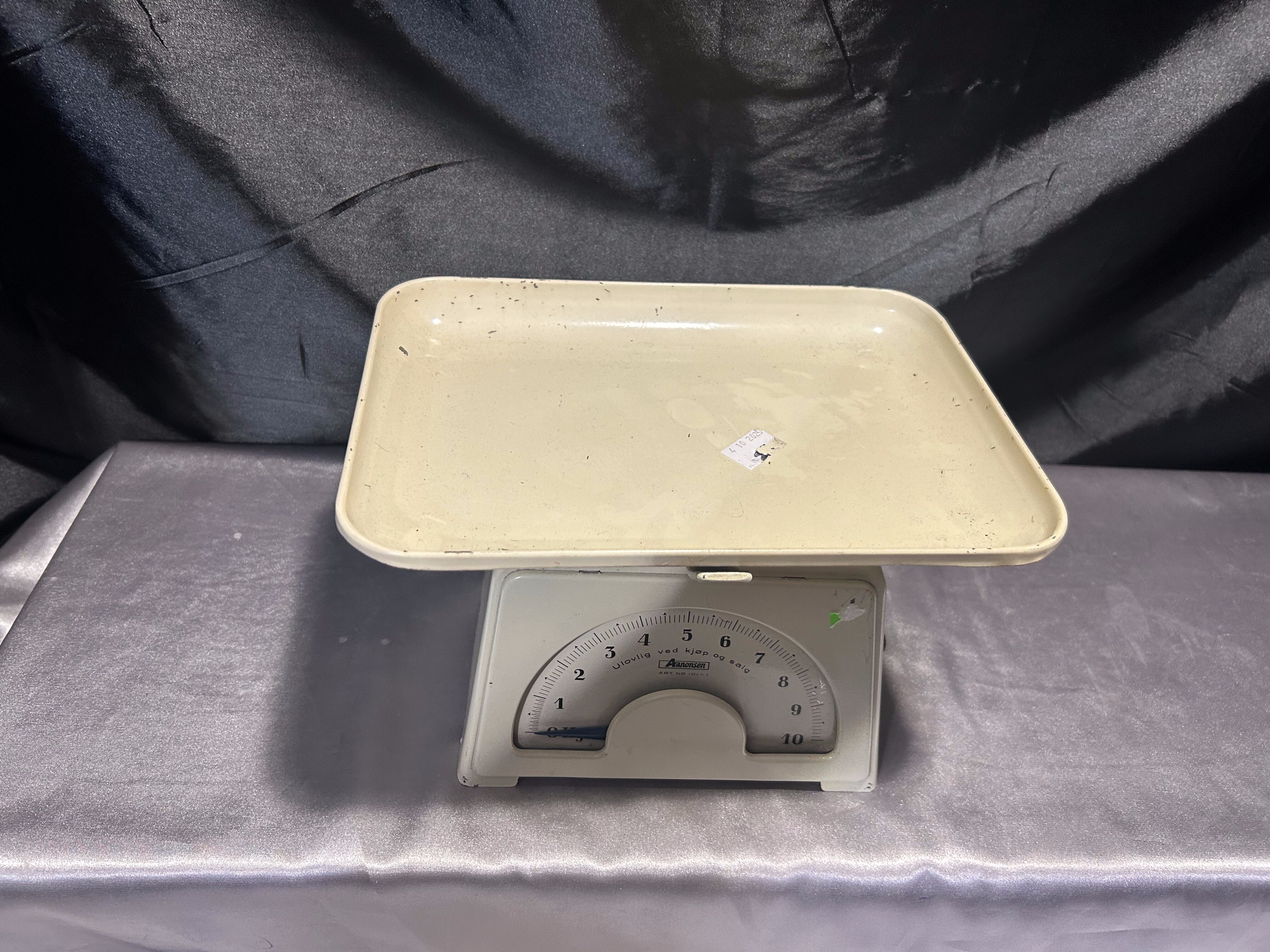 Na sprzedaż stylowa waga kuchenna marki Aanonsen w klasycznym kolorze ecru, wyposażona w prostokątny talerz i skalę do 10 kg. Solidna konstrukcja i elegancka forma sprawiają, że waga może pełnić funkcję zarówno praktycznego narzędzia kuchennego, jak i stylowej dekoracji w klimacie vintage lub retro.