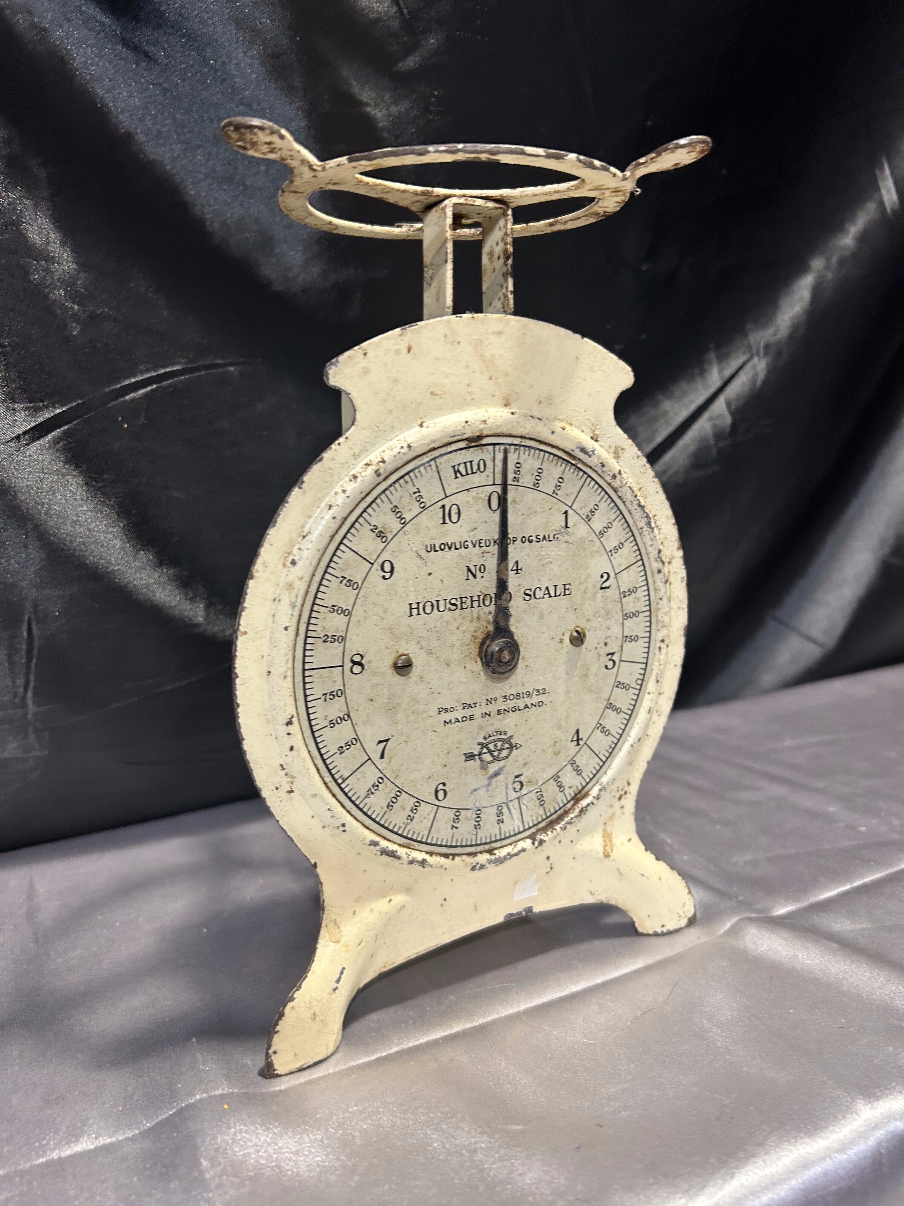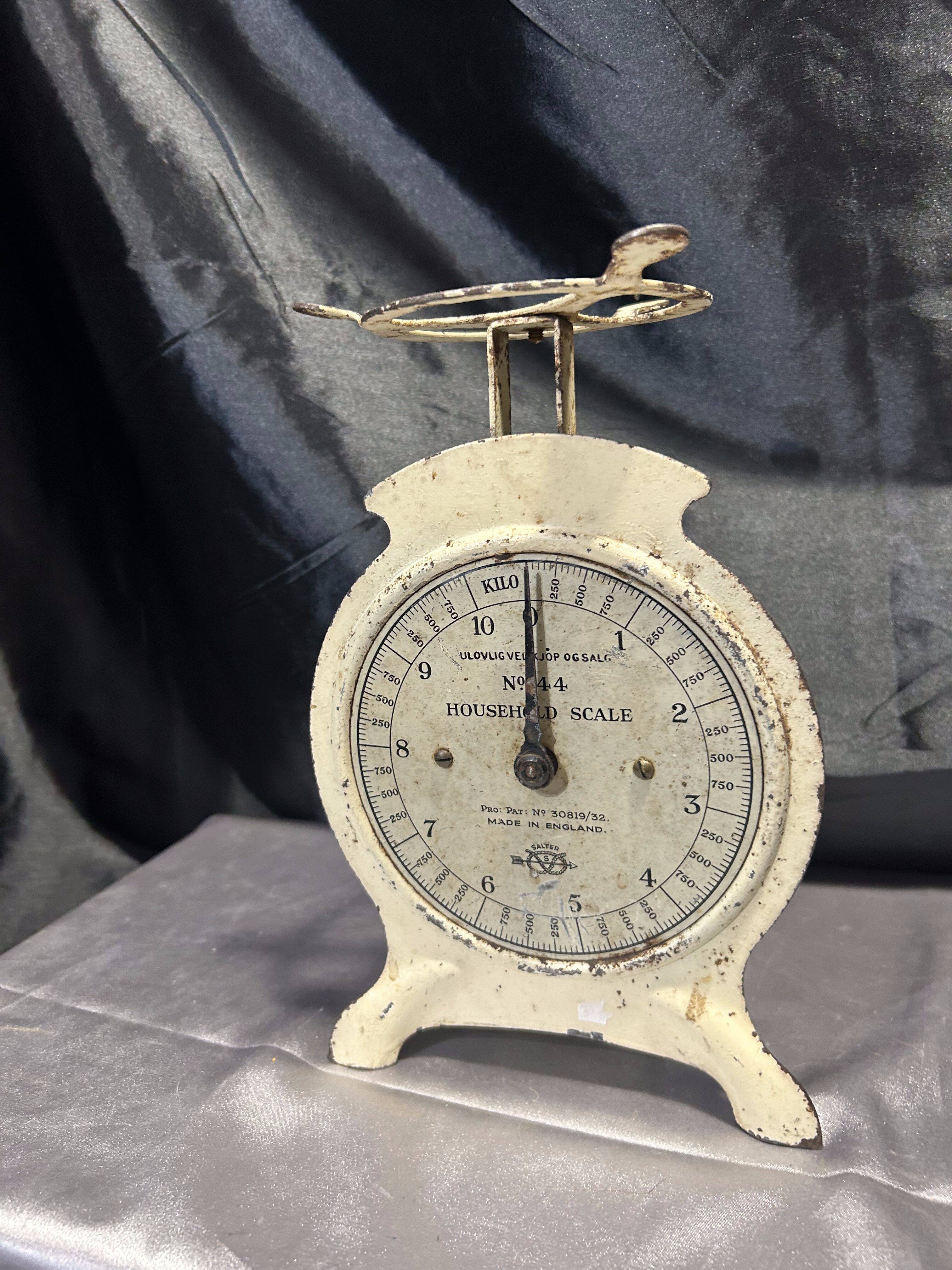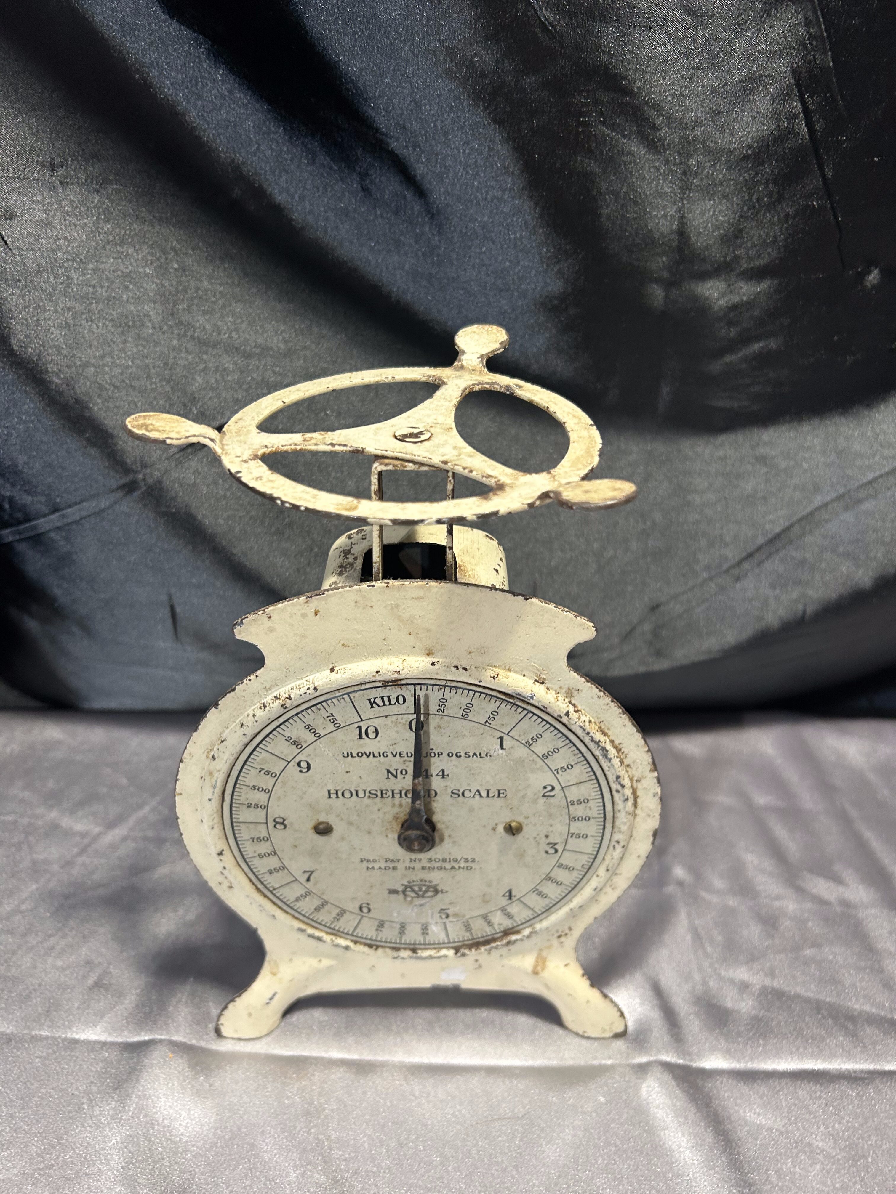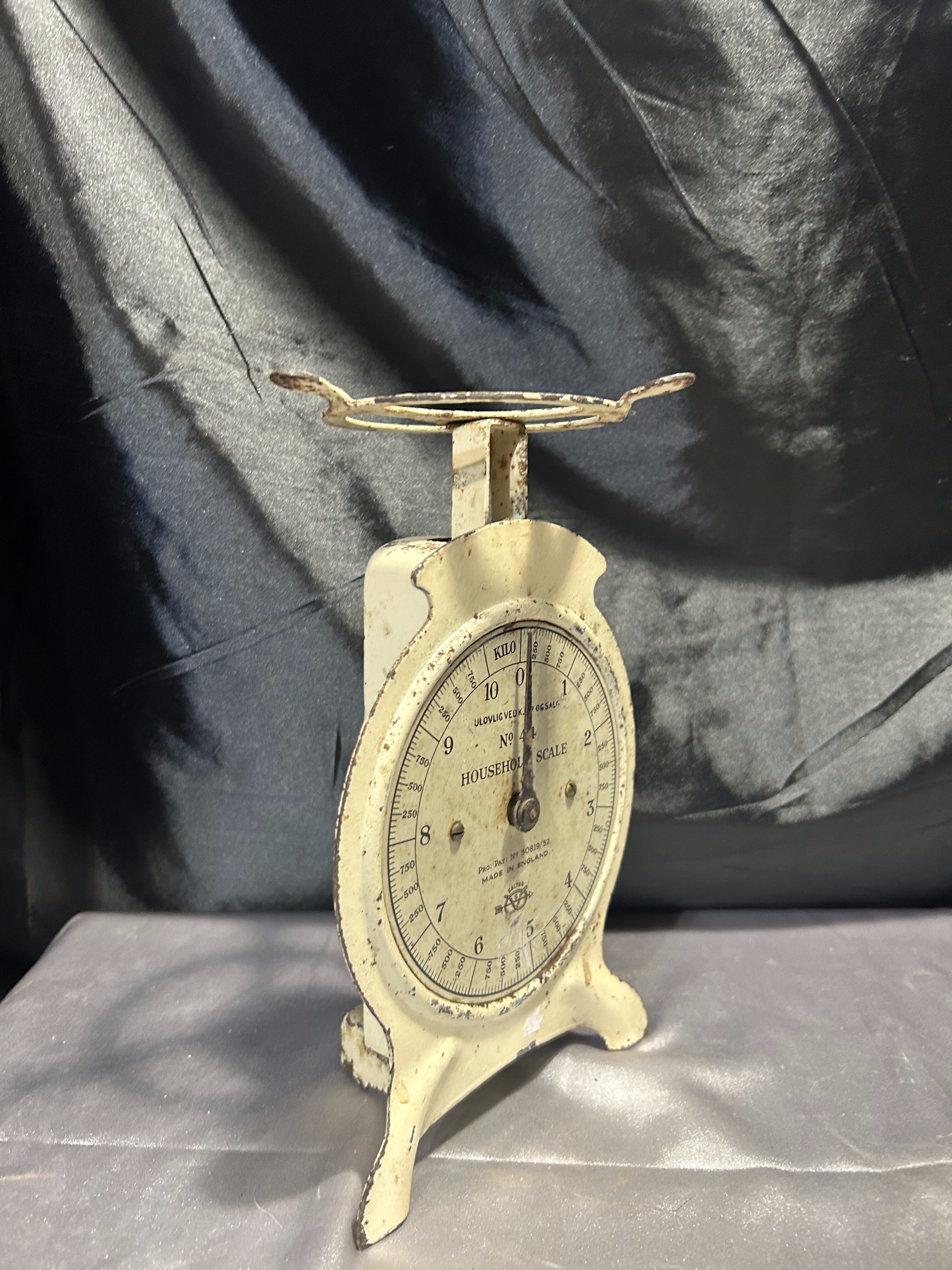 Na sprzedaż oryginalna, stara waga kuchenna marki HOUSEHOLD SCALE, wyprodukowana w Anglii. Solidna konstrukcja z czytelną tarczą i klasycznym mechanizmem sprężynowym. Model bez talerzyka, idealny do ekspozycji lub jako stylowy element kuchni retro, rustykalnej czy vintage.