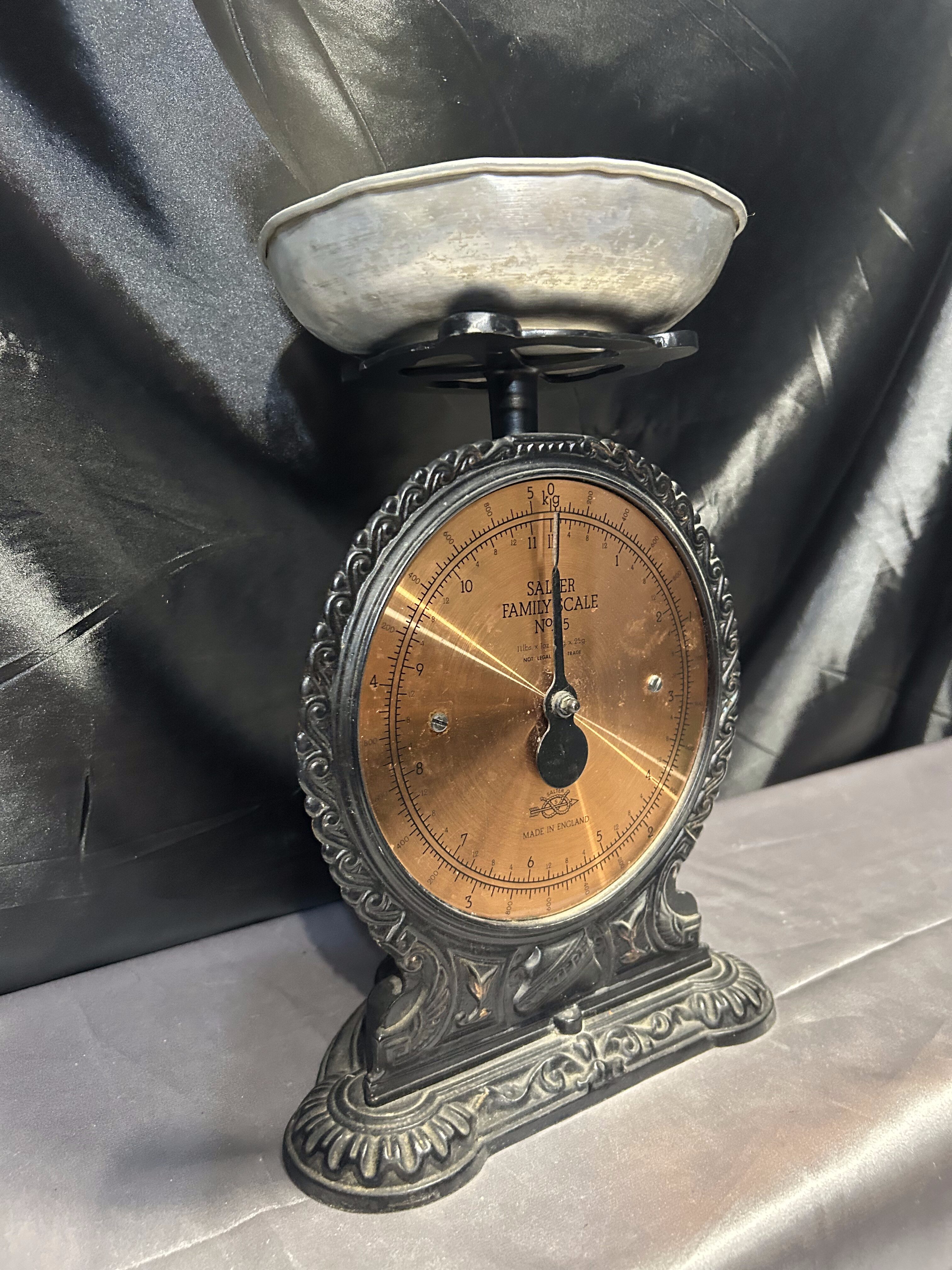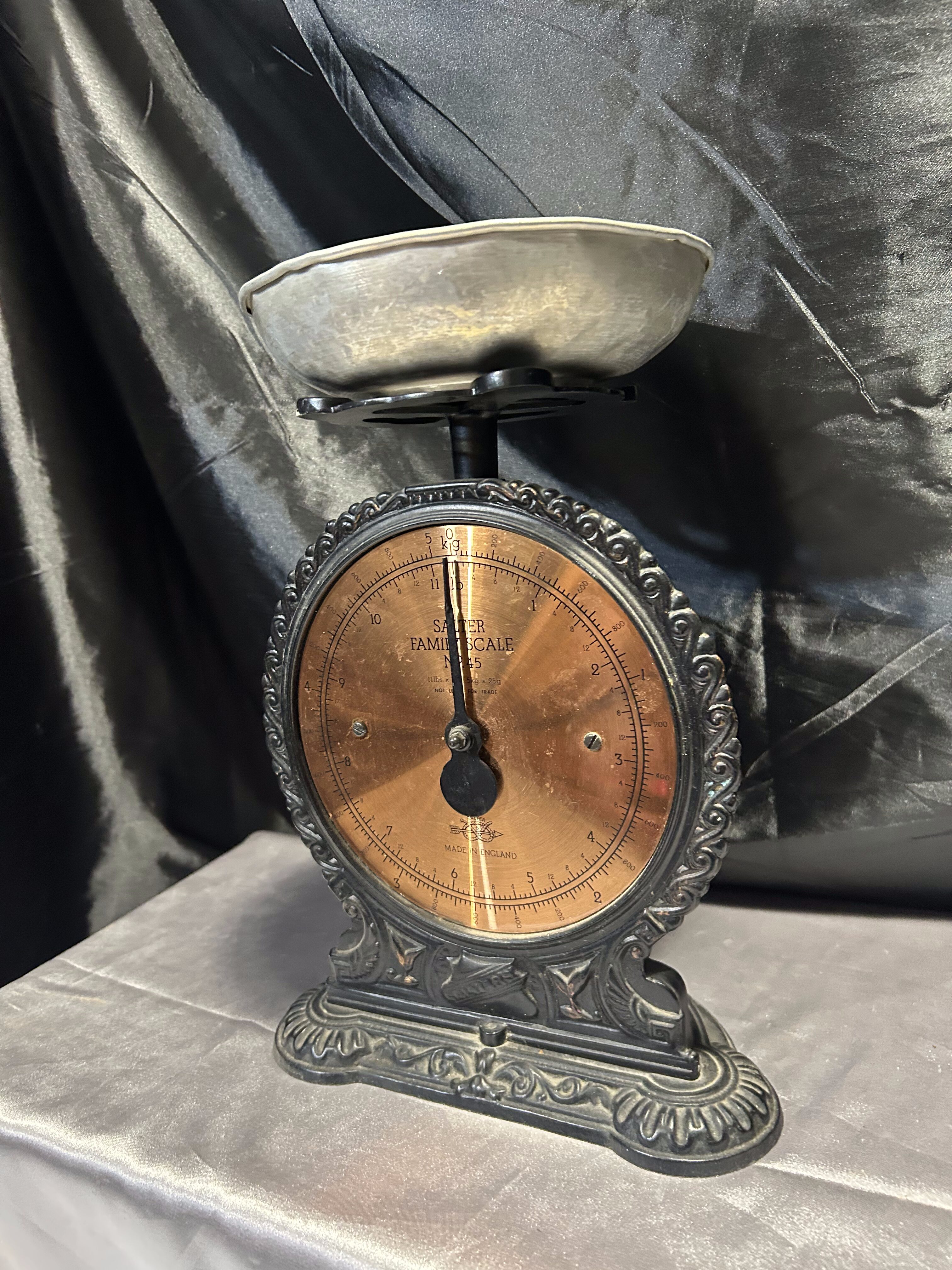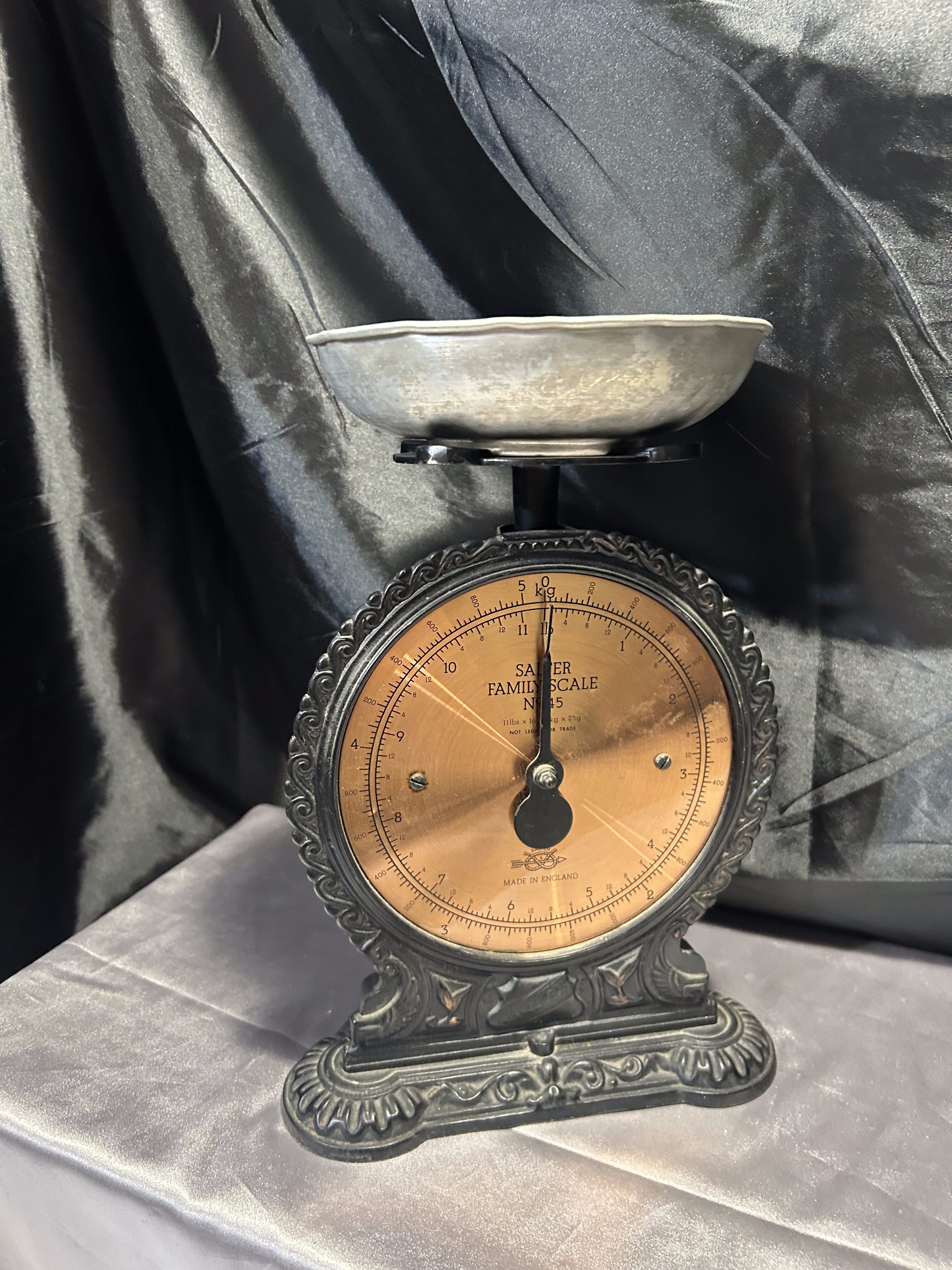 Na sprzedaż klasyczna waga kuchenna marki Salter Family Scale, wyprodukowana w Anglii. Czarna, dekoracyjna obudowa w połączeniu z miedzianą tarczą i srebrnym talerzykiem tworzy niepowtarzalny, elegancki wygląd. Skala do 5 kg pozwala na praktyczne zastosowanie, a jednocześnie czyni z niej wyjątkowy element wystroju kuchni w stylu retro lub vintage.
