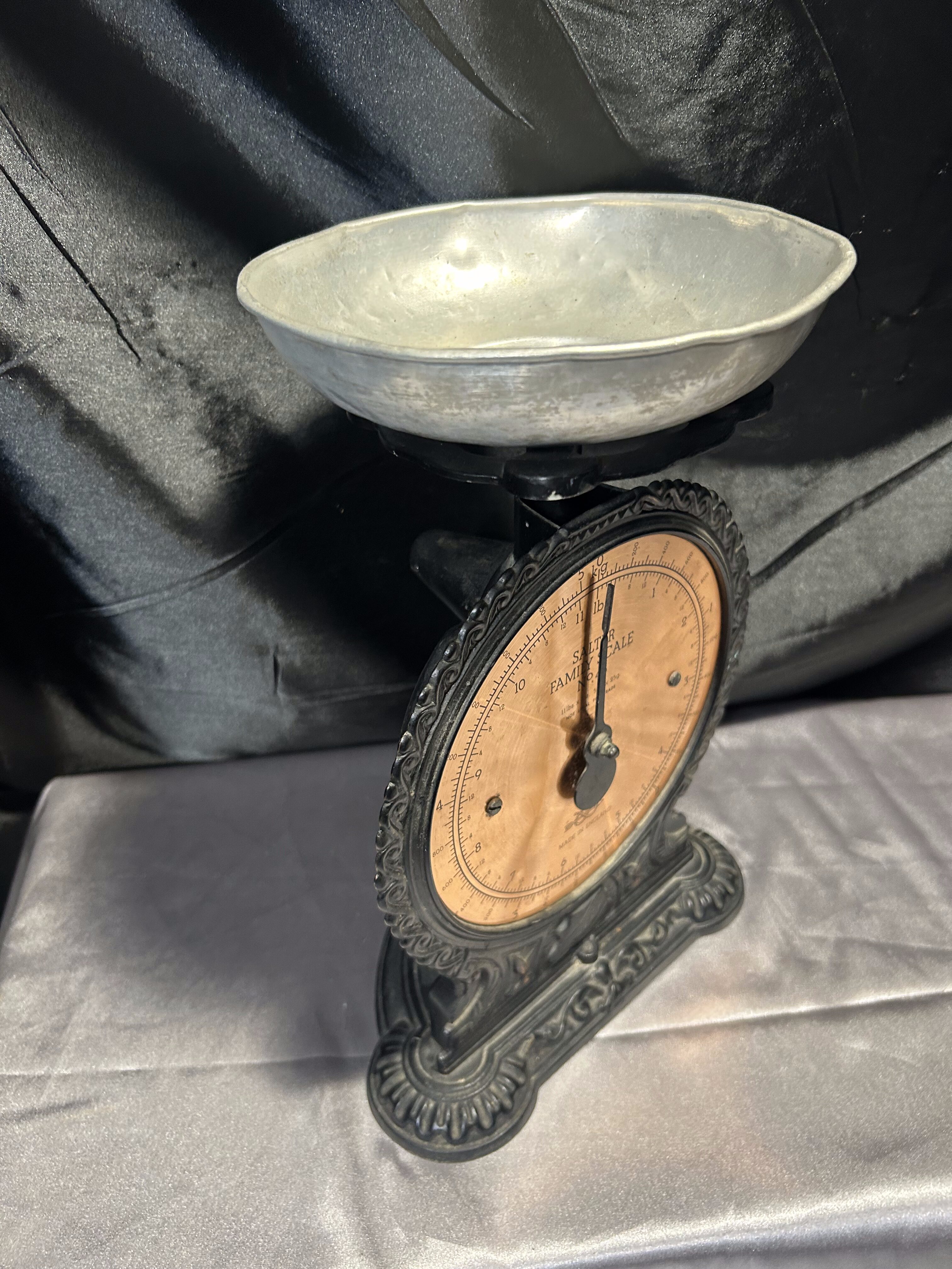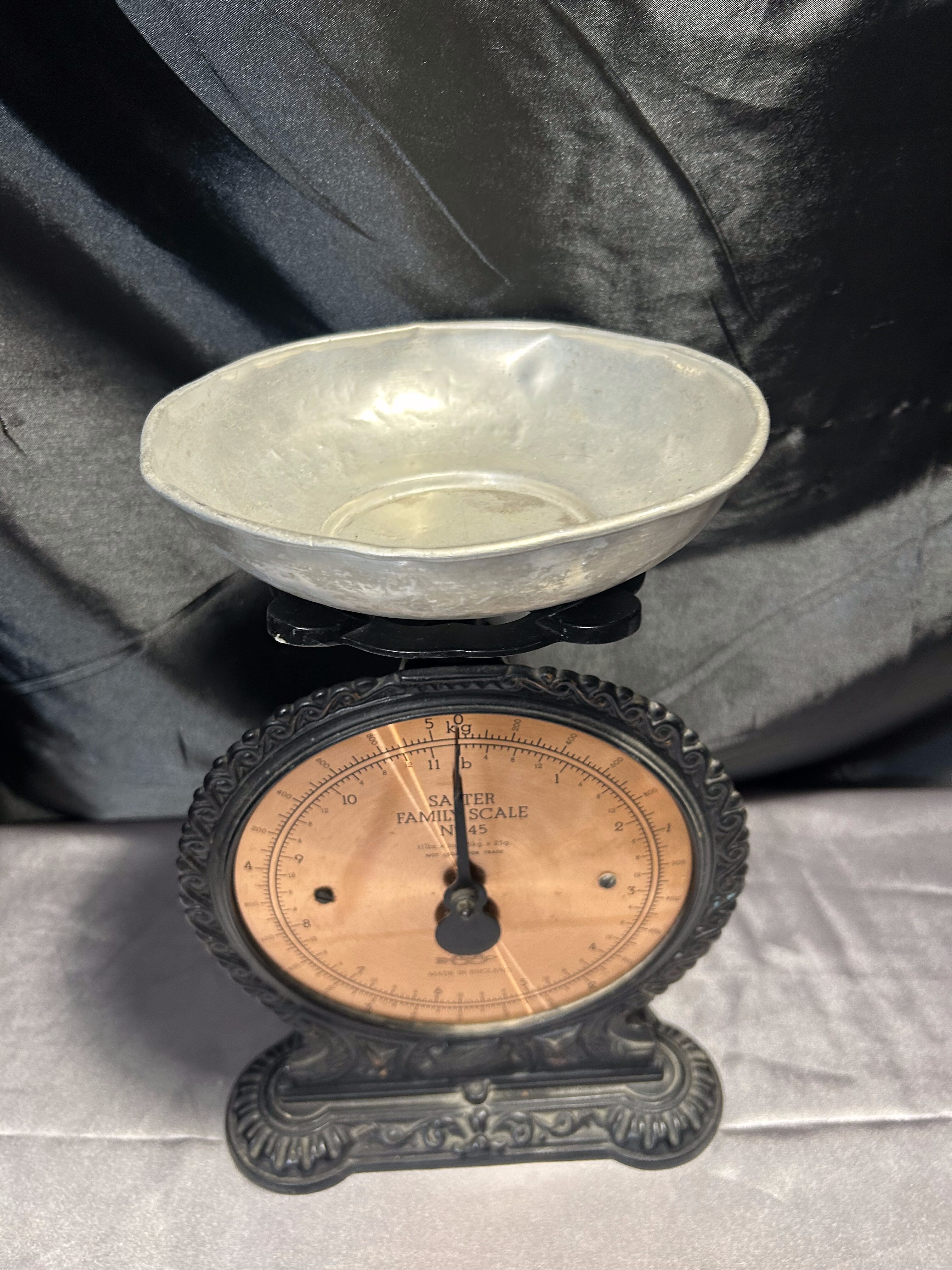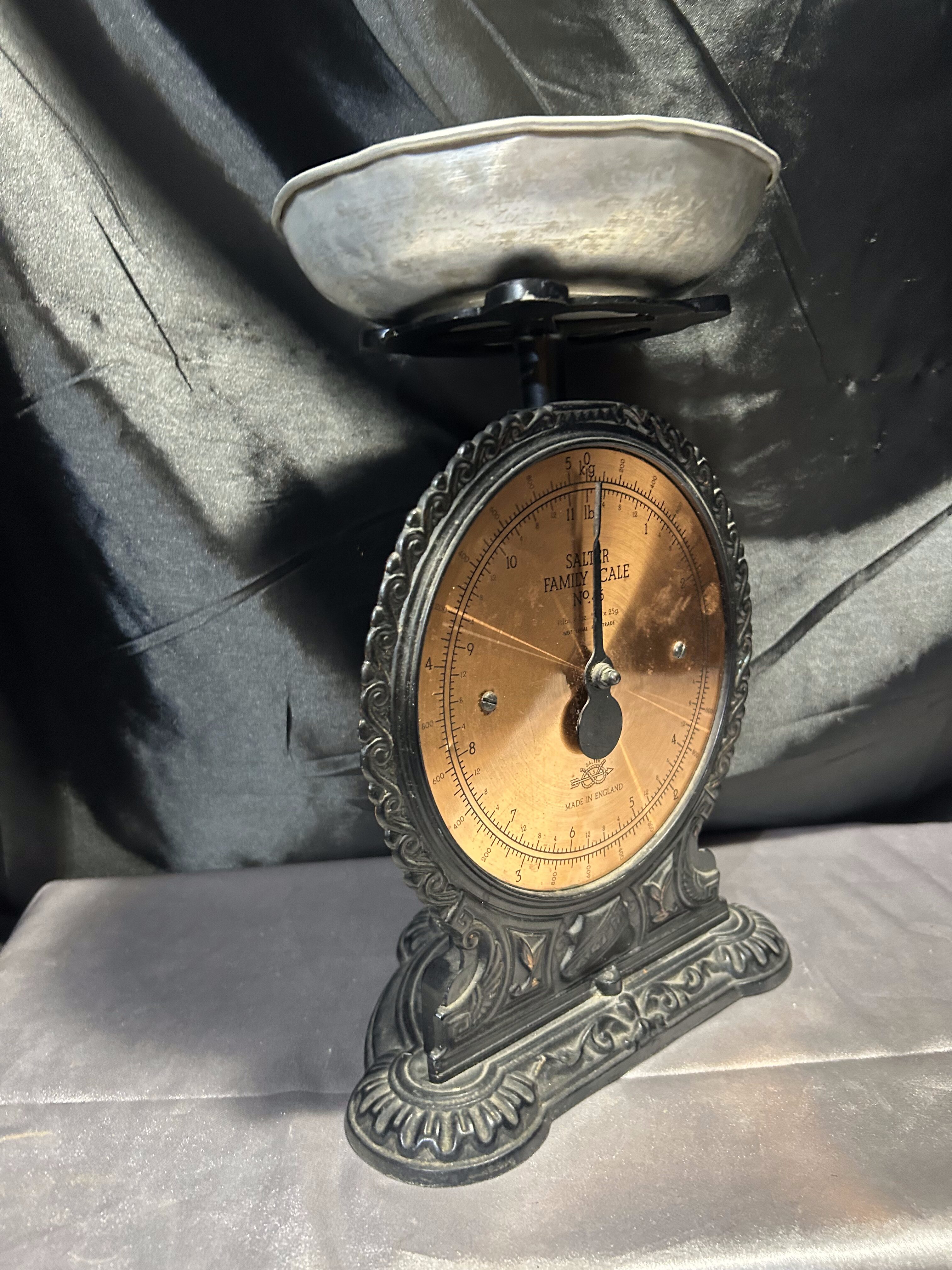 Na sprzedaż klasyczna waga kuchenna marki Salter Family Scale, wyprodukowana w Anglii. Czarna, dekoracyjna obudowa w połączeniu z miedzianą tarczą i srebrnym talerzykiem tworzy niepowtarzalny, elegancki wygląd. Skala do 5 kg pozwala na praktyczne zastosowanie, a jednocześnie czyni z niej wyjątkowy element wystroju kuchni w stylu retro lub vintage.