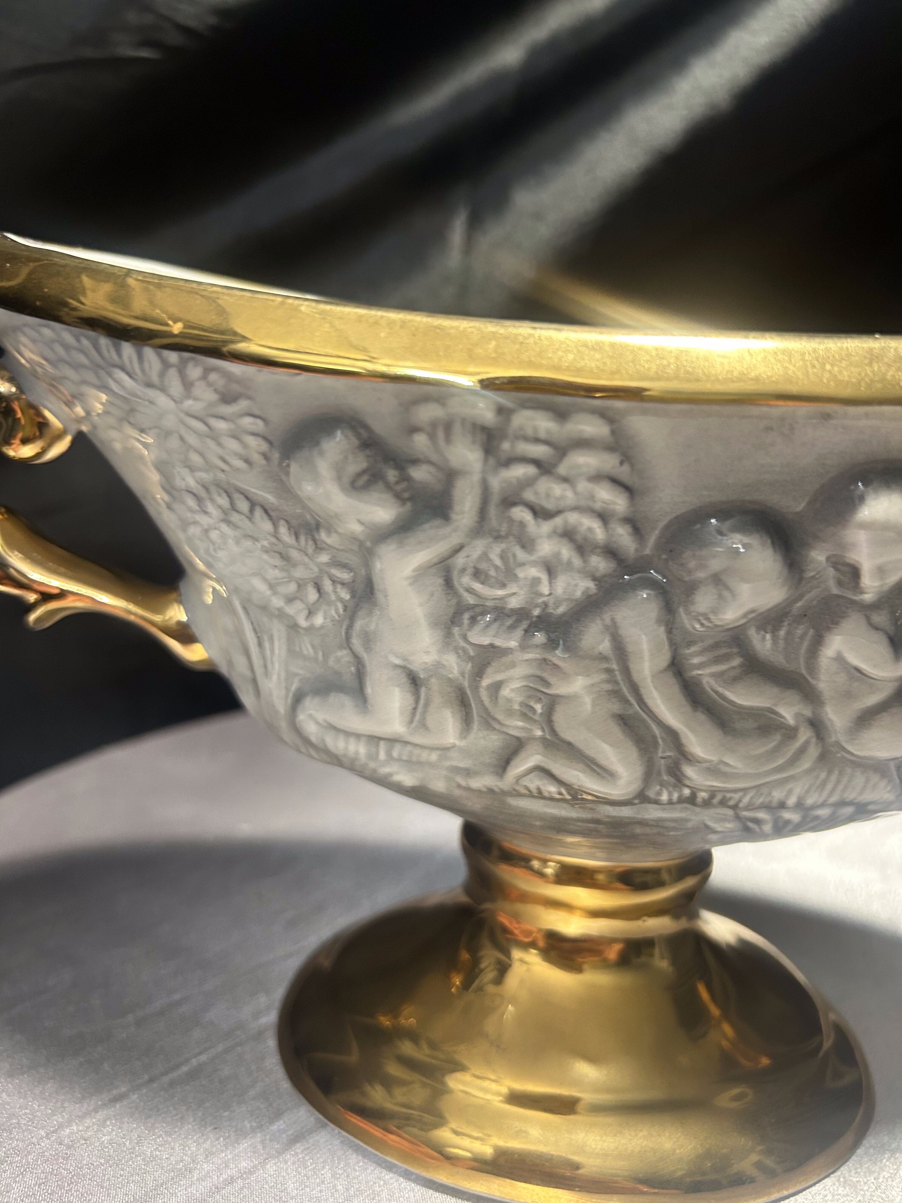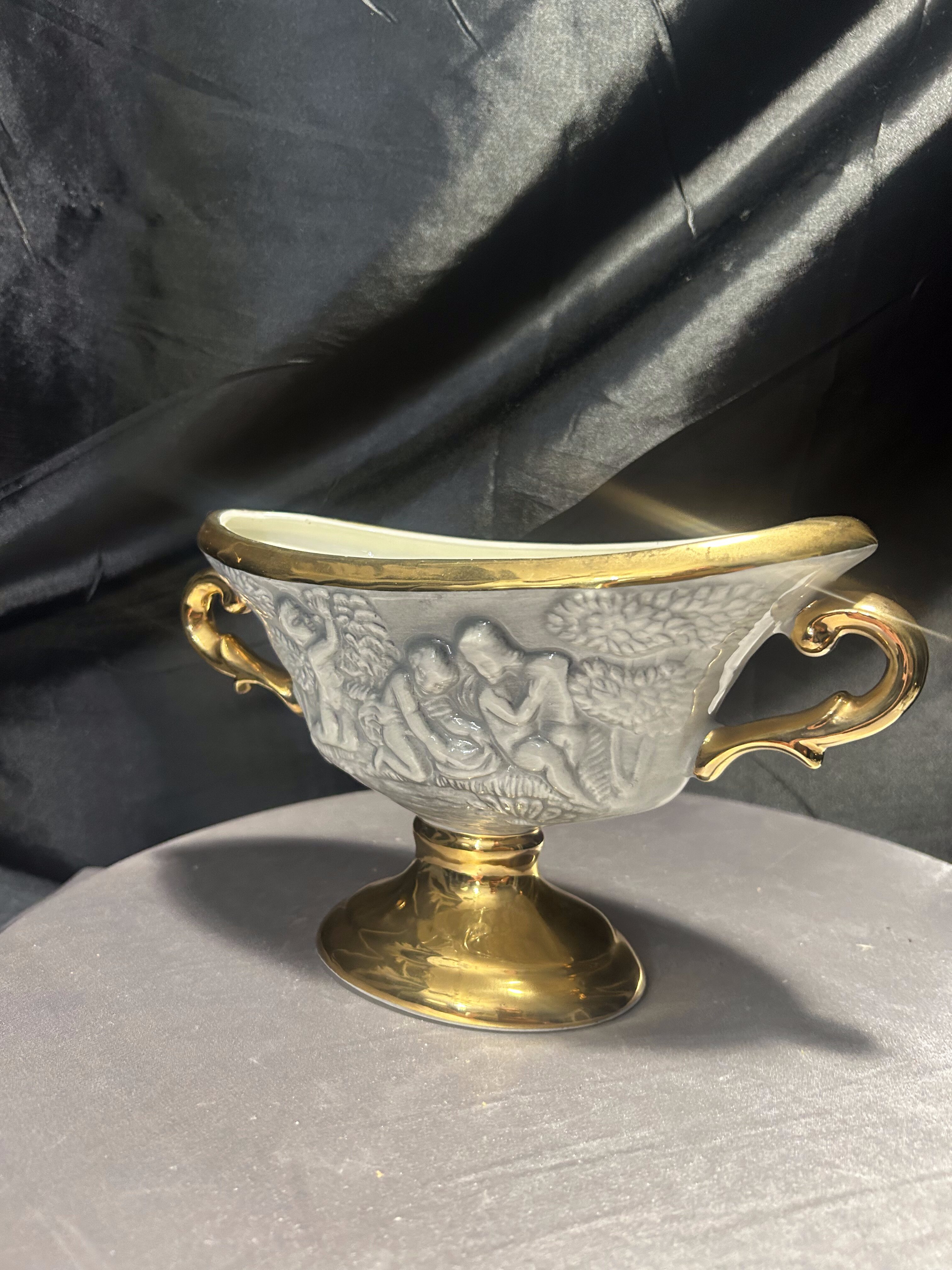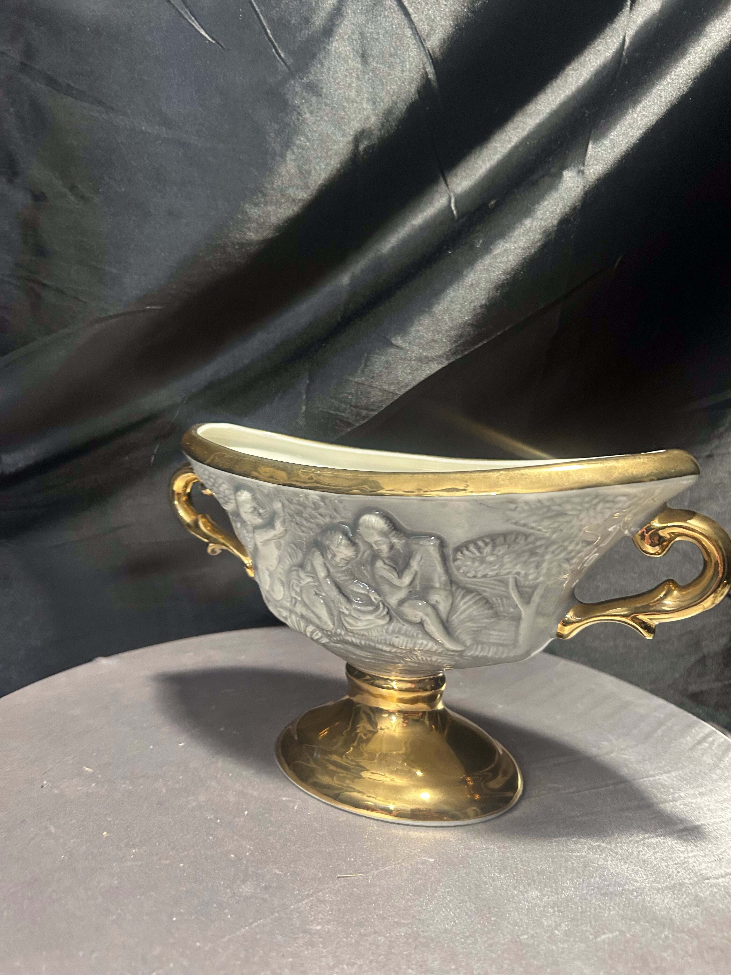 Waza osadzona jest na stabilnej, błyszczącej podstawie z emaliowanego złota, z którym harmonizują również bogato zdobione uchwyty. Na powierzchni naczynia widnieje kunsztownie wykonana scena figuralna z motywem antycznym – postaci wplecione w dekoracyjną kompozycję, przypominającą mityczne opowieści.