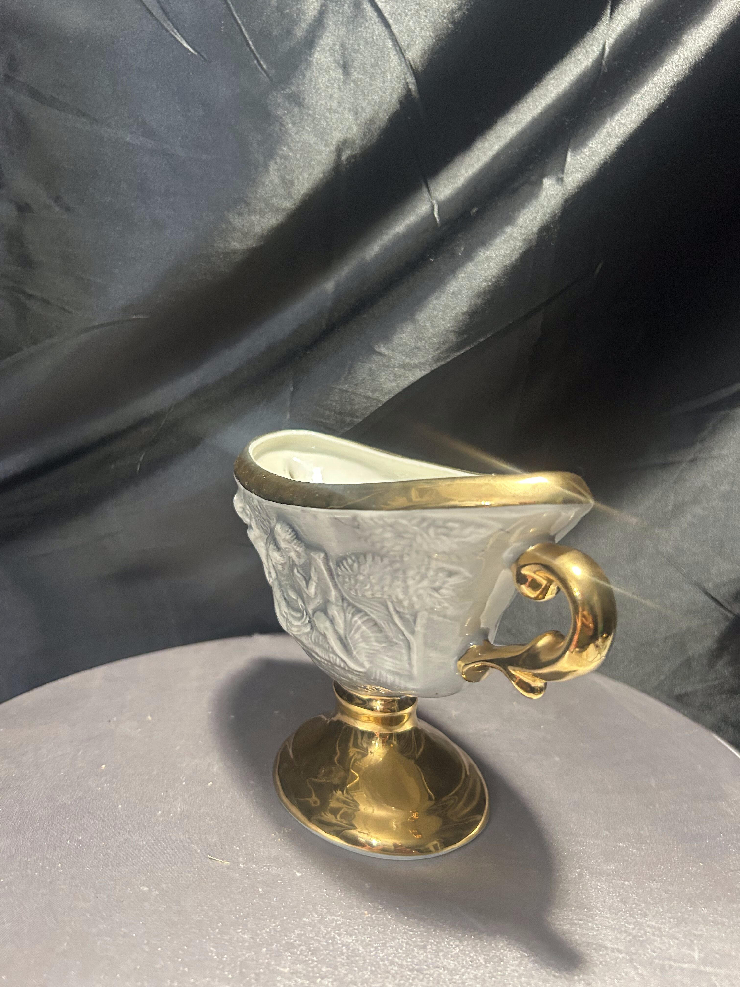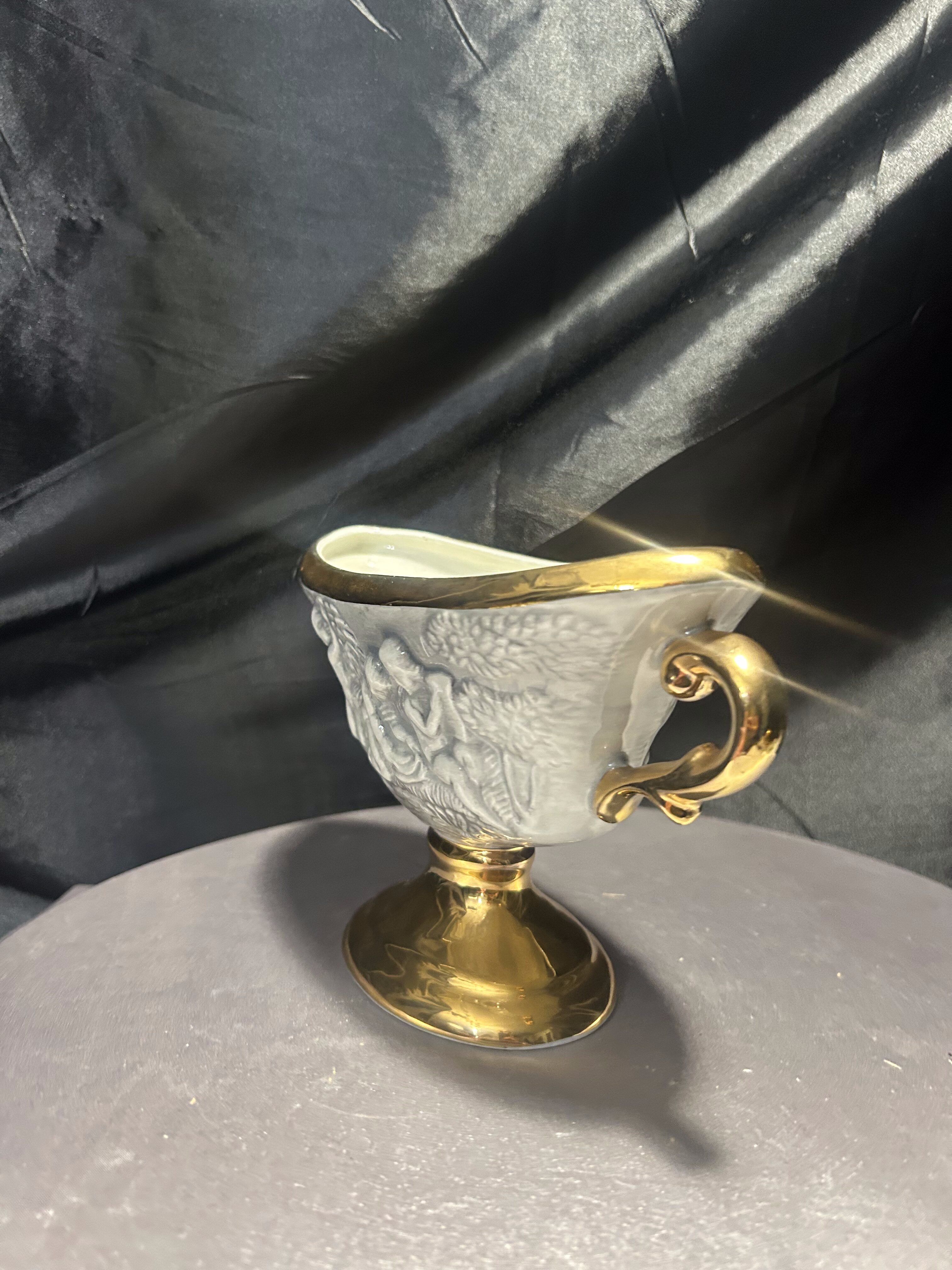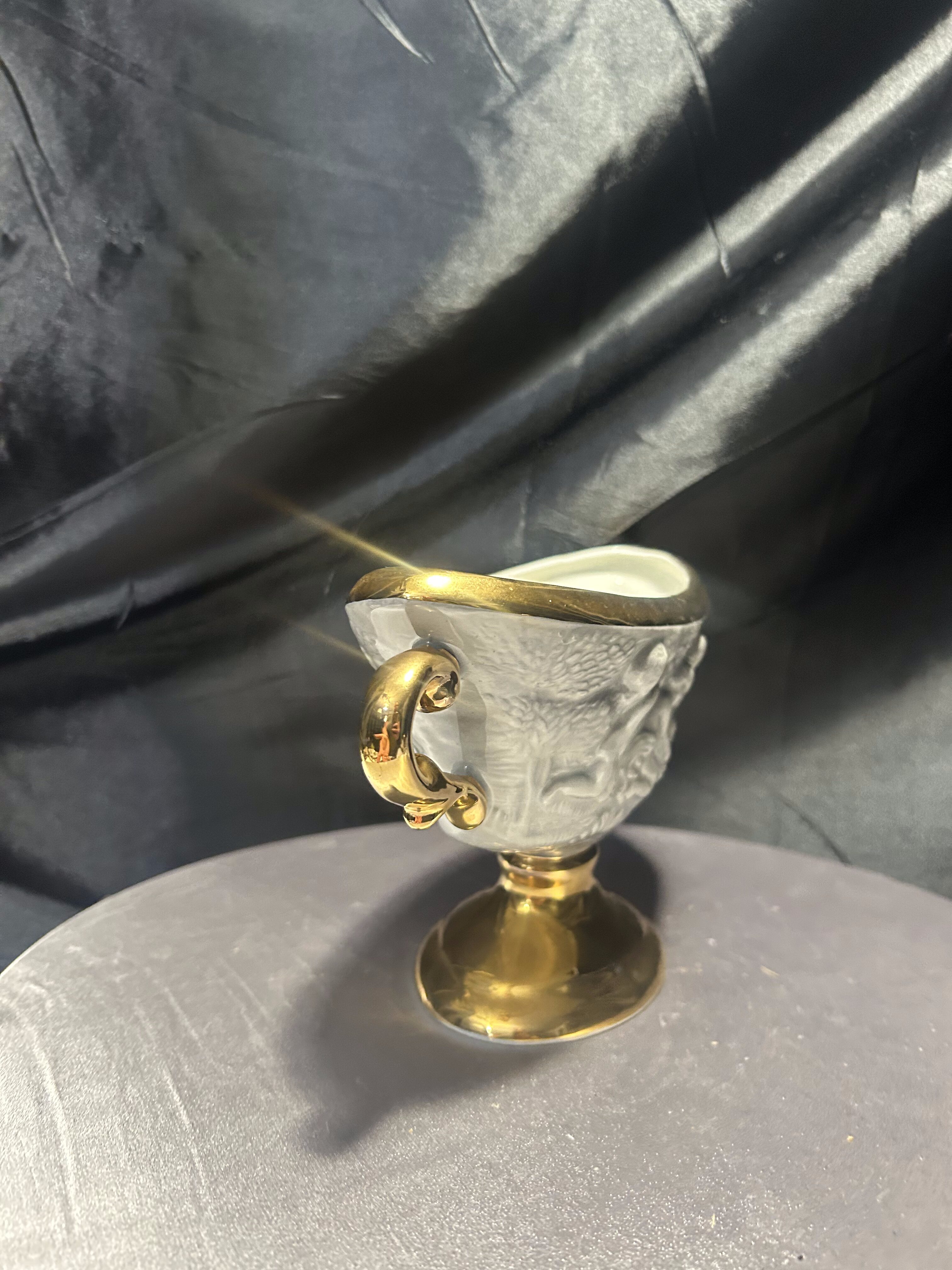 Waza osadzona jest na stabilnej, błyszczącej podstawie z emaliowanego złota, z którym harmonizują również bogato zdobione uchwyty. Na powierzchni naczynia widnieje kunsztownie wykonana scena figuralna z motywem antycznym – postaci wplecione w dekoracyjną kompozycję, przypominającą mityczne opowieści.