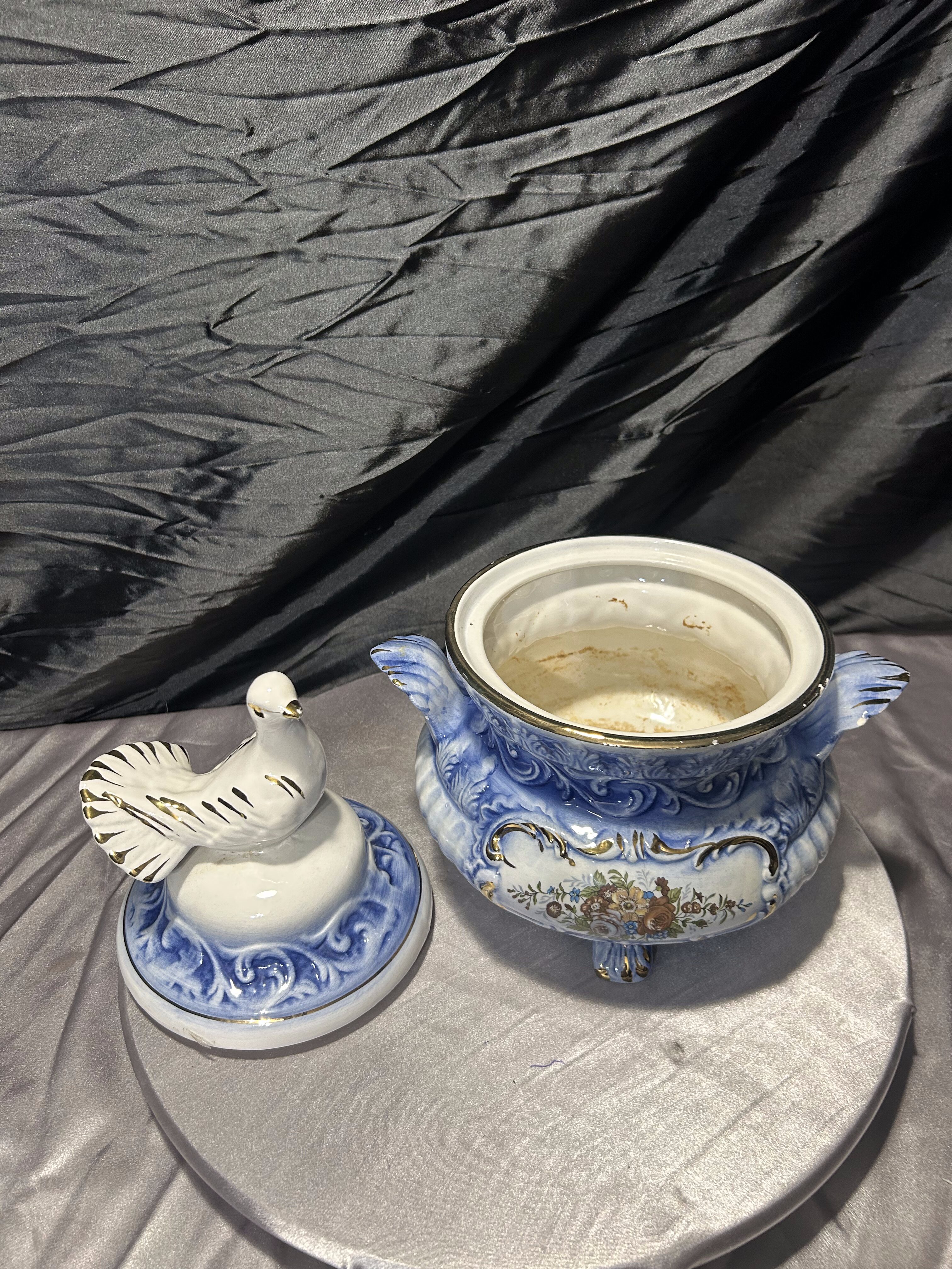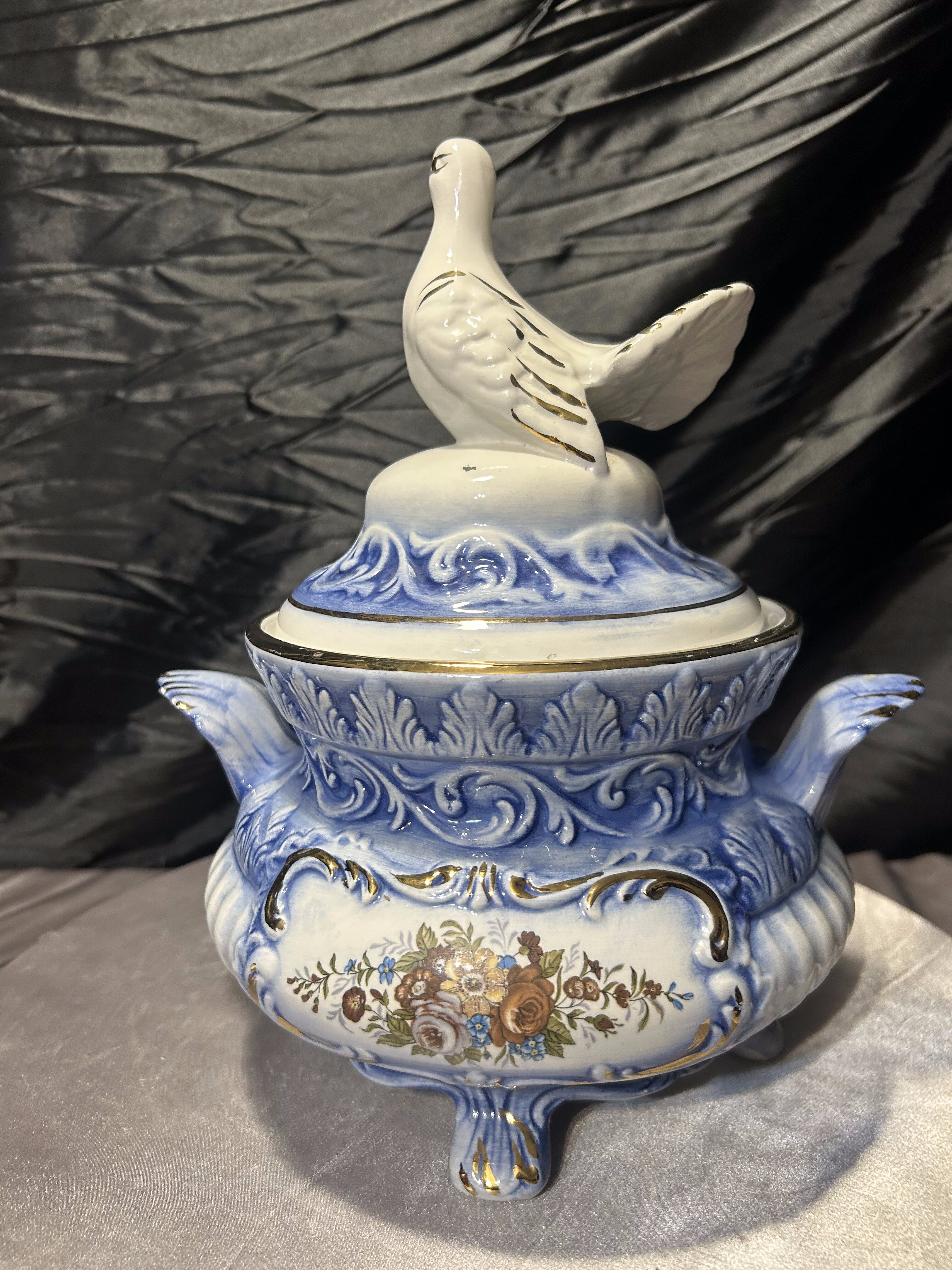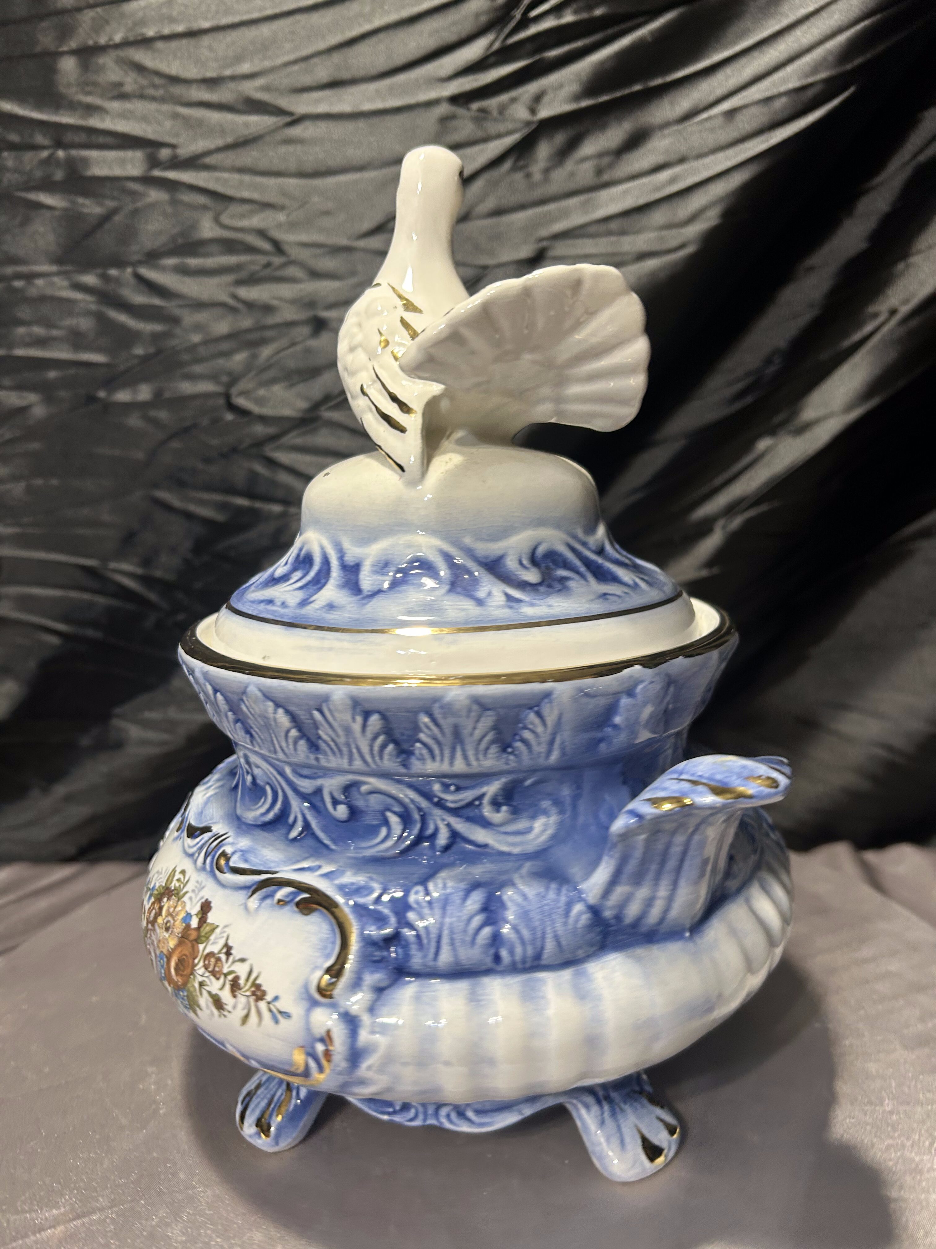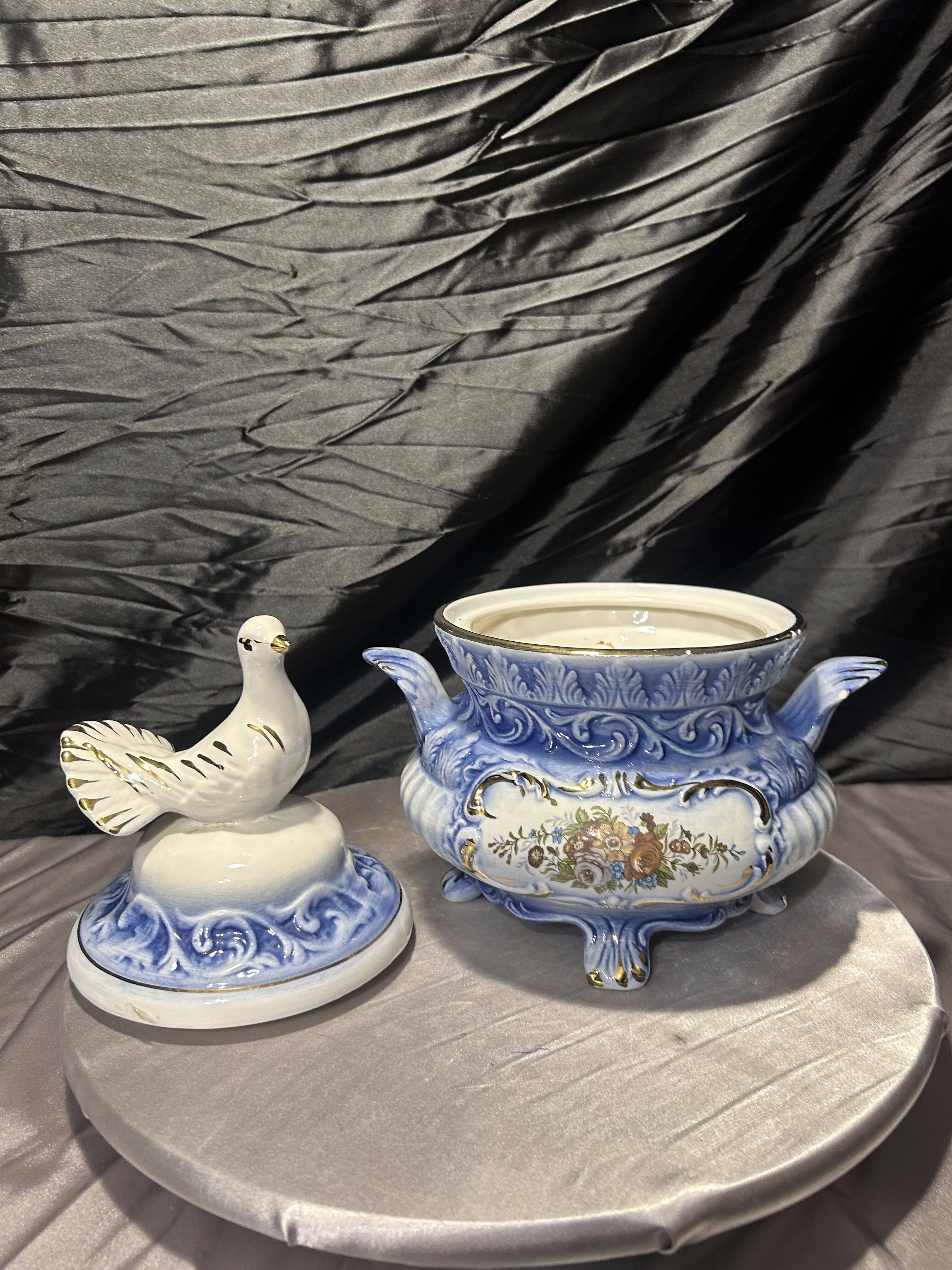 Elegancka włoska waza dekoracyjna, wykonana z ceramiki i zwieńczona efektowną pokrywą z figurą gołębia. Całość utrzymana w harmonijnej biało-niebieskiej kolorystyce, wzbogaconej złoceniami oraz klasycznym motywem kwiatowym. Forma naczynia nawiązuje do tradycyjnych włoskich wyrobów dekoracyjnych, w których łączono użytkowość z bogatą ornamentyką. Sygnatura „Made in Italy” potwierdza pochodzenie i jakość wykonania.