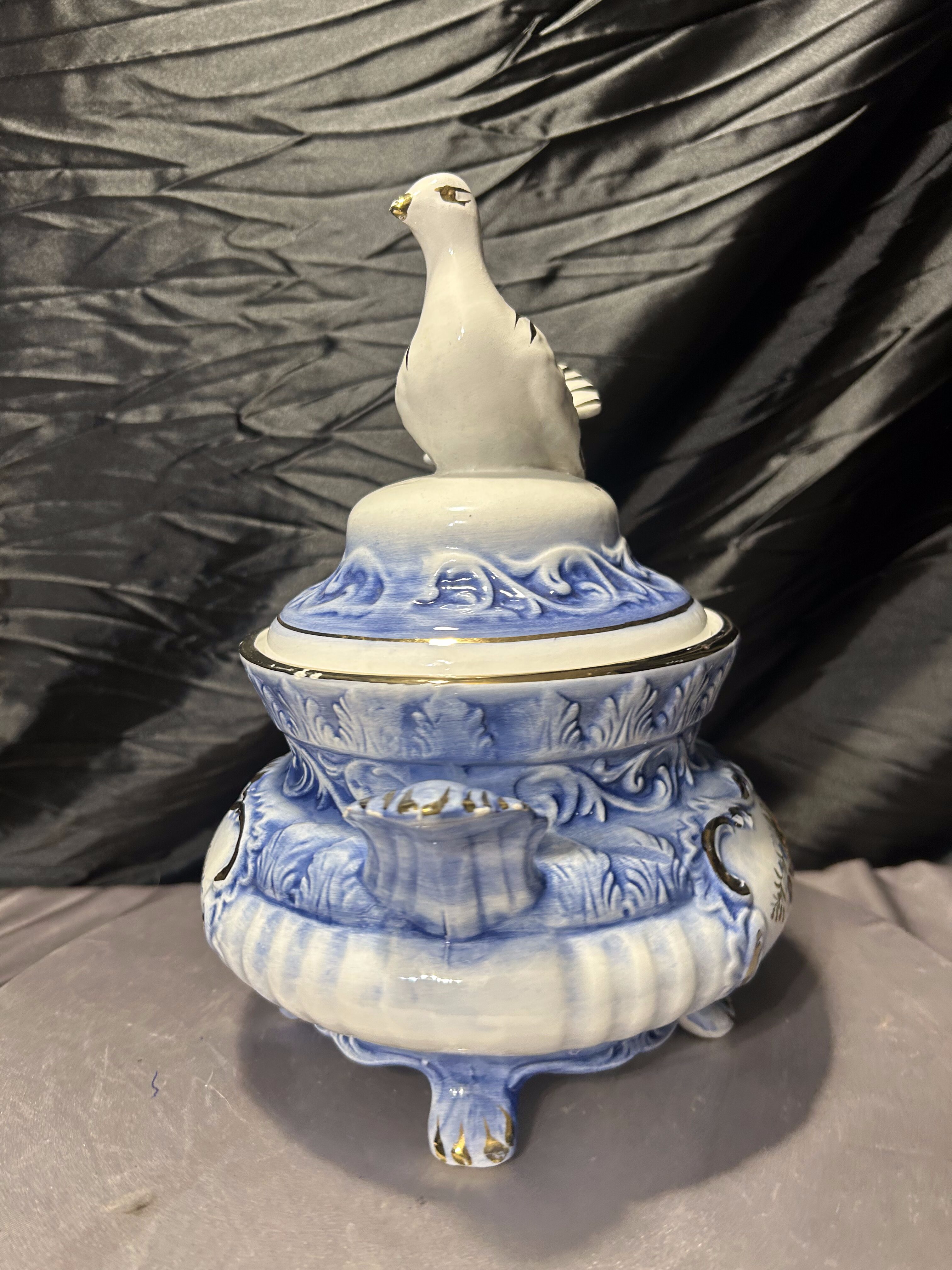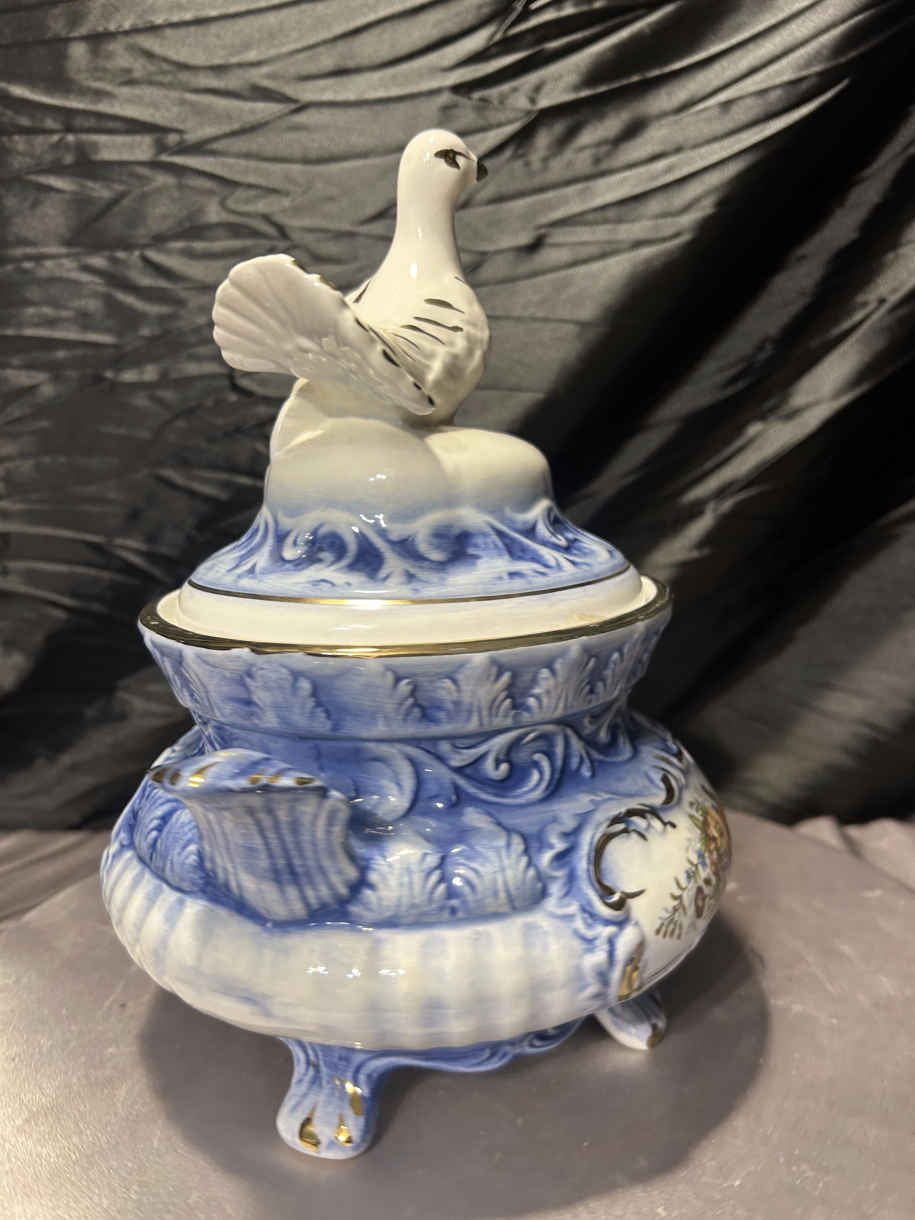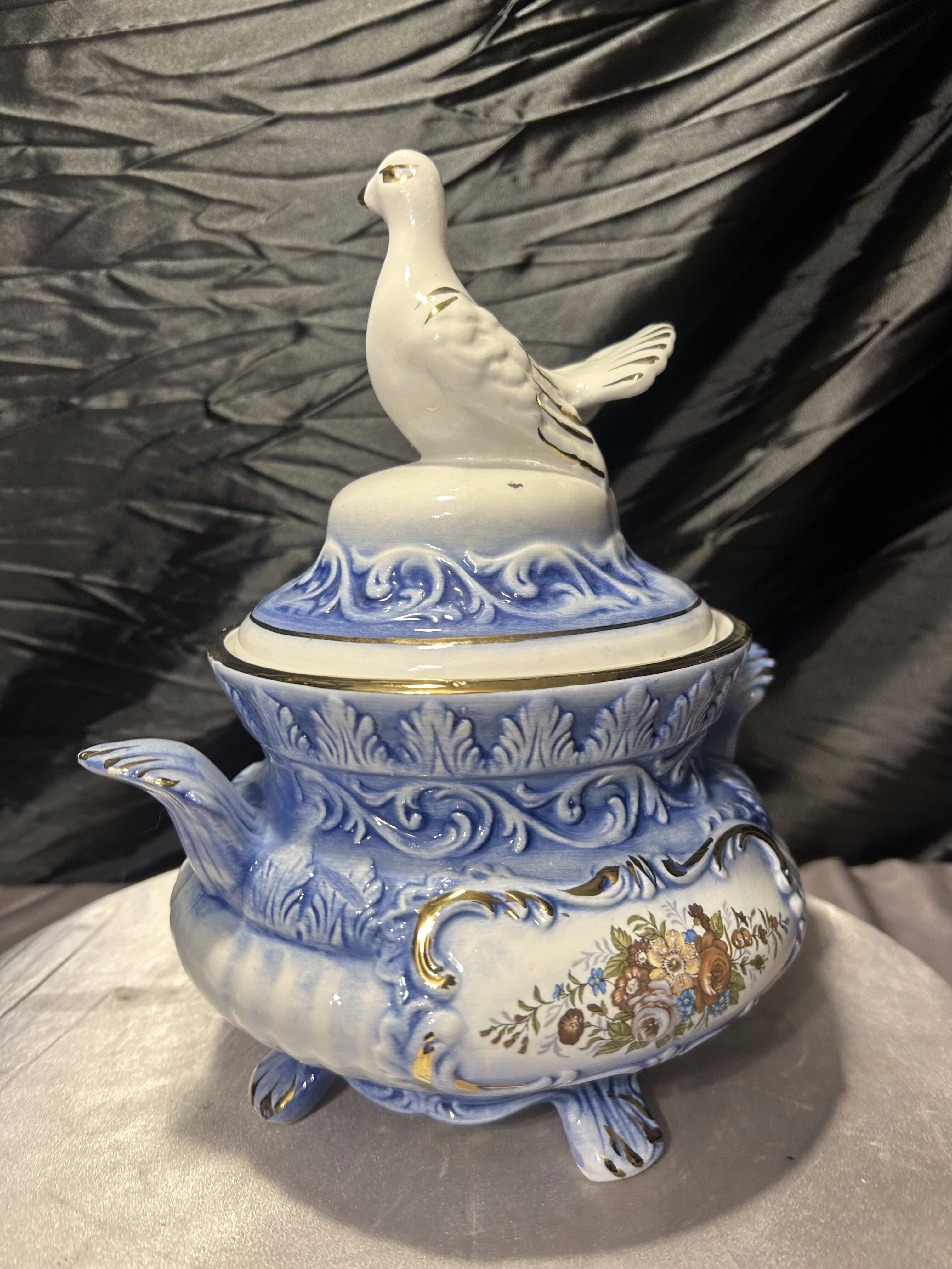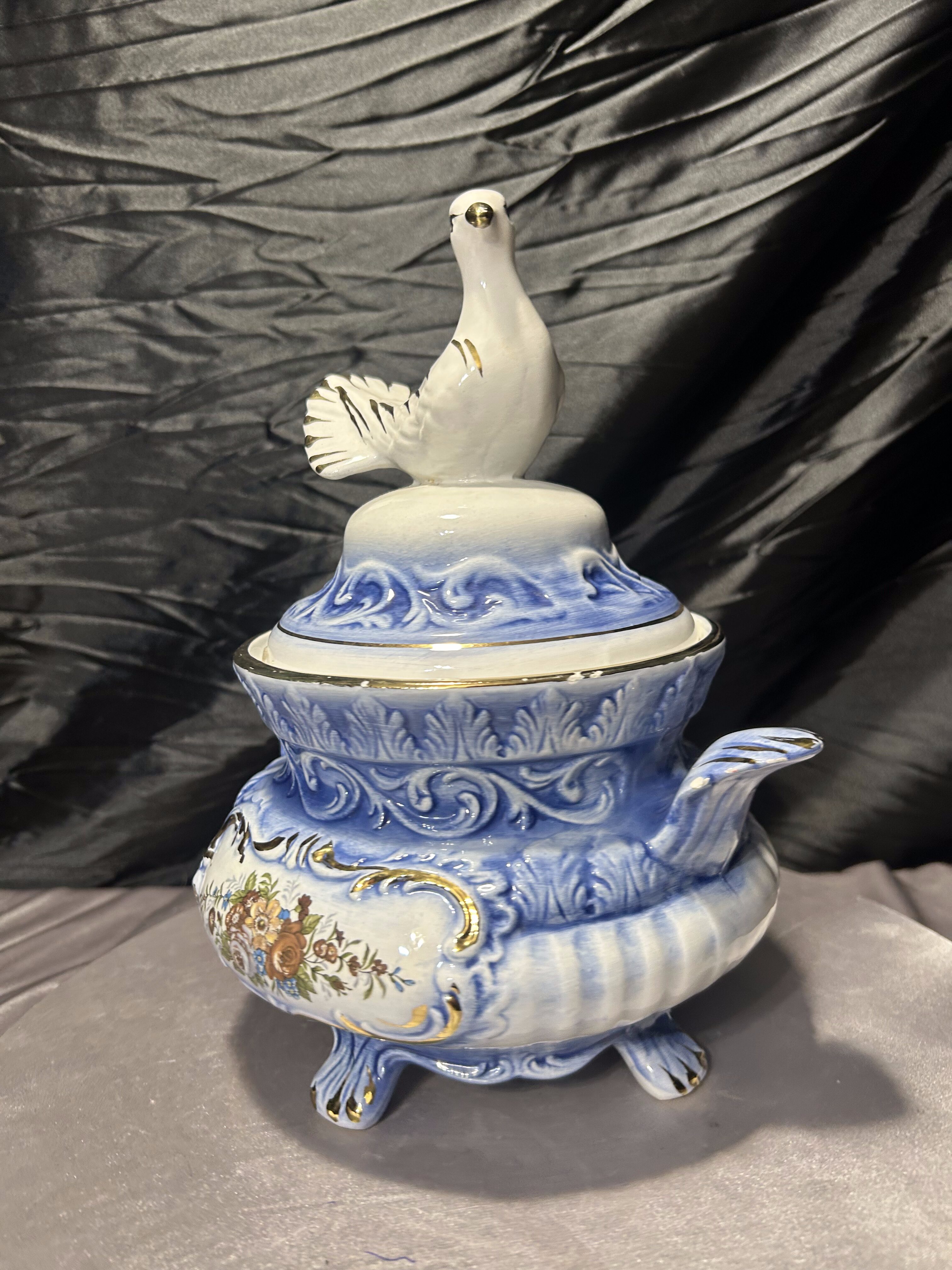 Elegancka włoska waza dekoracyjna, wykonana z ceramiki i zwieńczona efektowną pokrywą z figurą gołębia. Całość utrzymana w harmonijnej biało-niebieskiej kolorystyce, wzbogaconej złoceniami oraz klasycznym motywem kwiatowym. Forma naczynia nawiązuje do tradycyjnych włoskich wyrobów dekoracyjnych, w których łączono użytkowość z bogatą ornamentyką. Sygnatura „Made in Italy” potwierdza pochodzenie i jakość wykonania.
