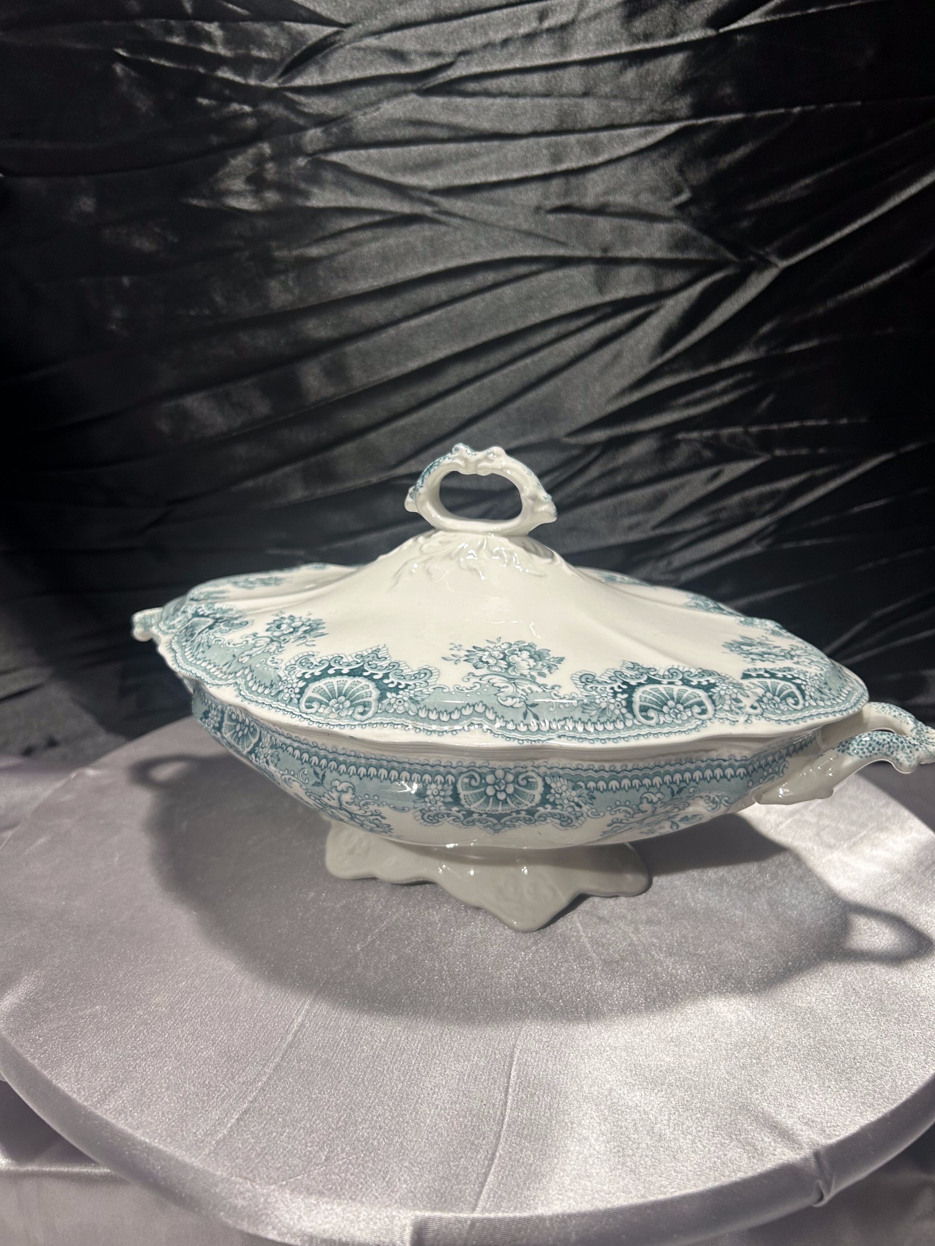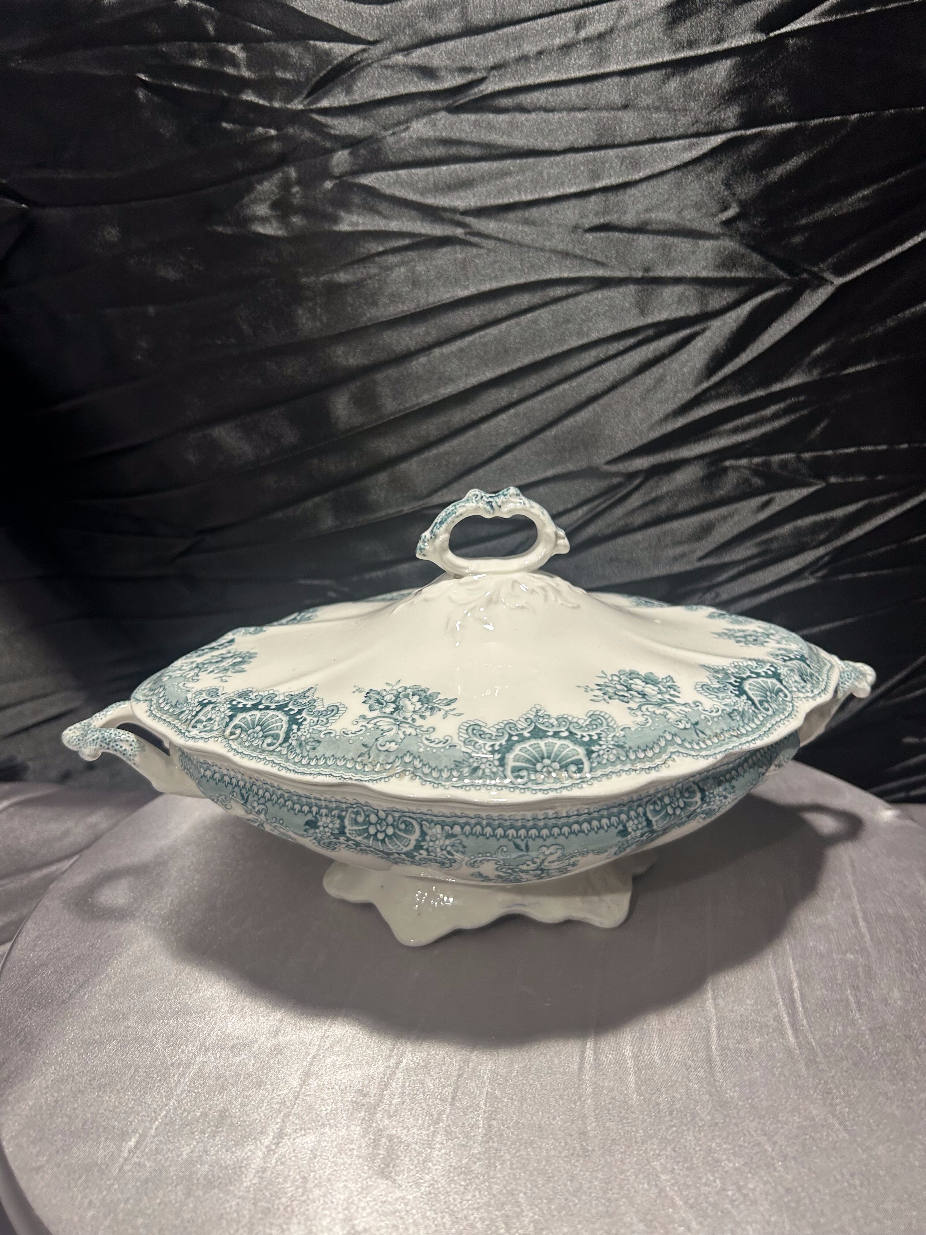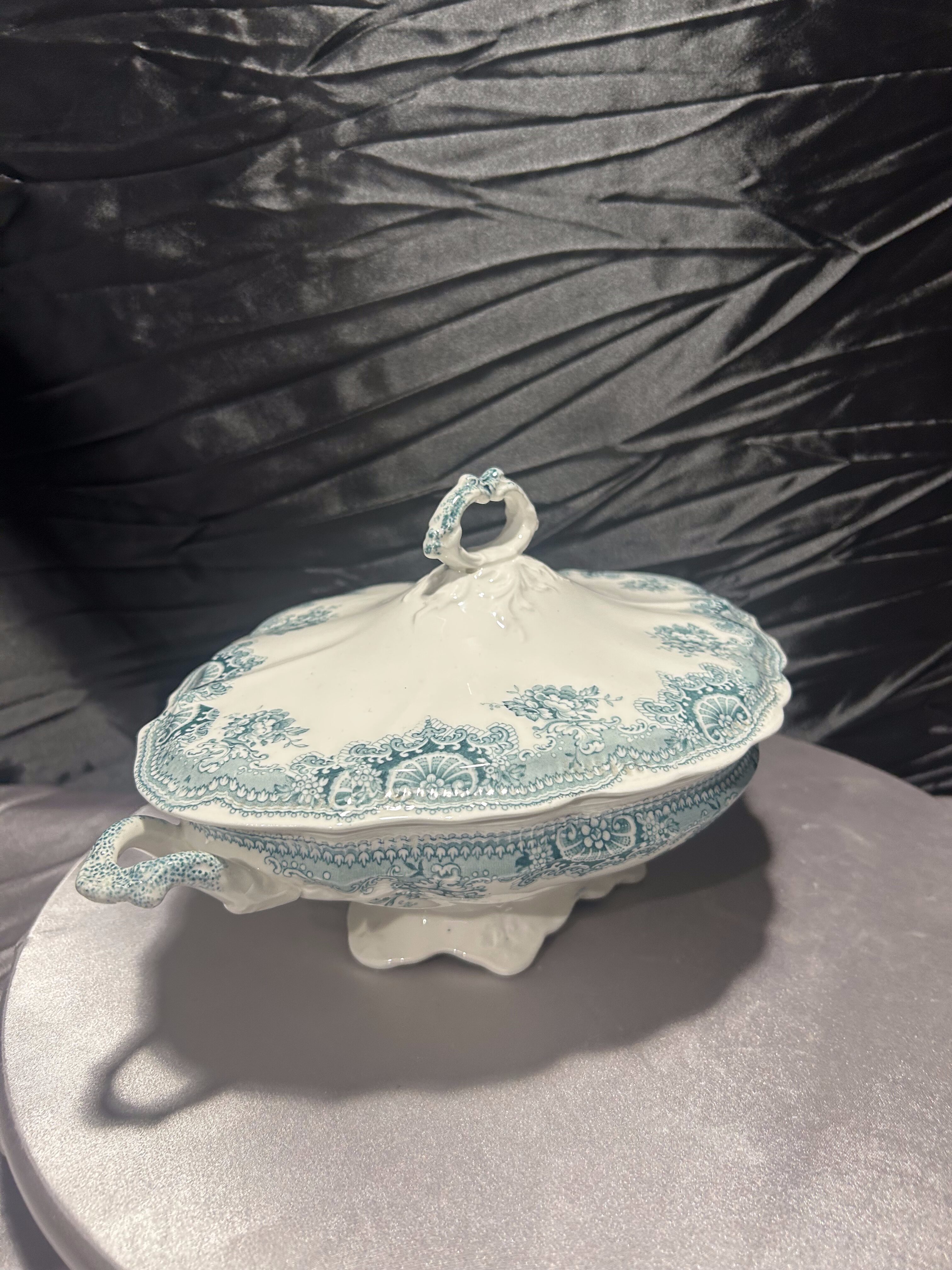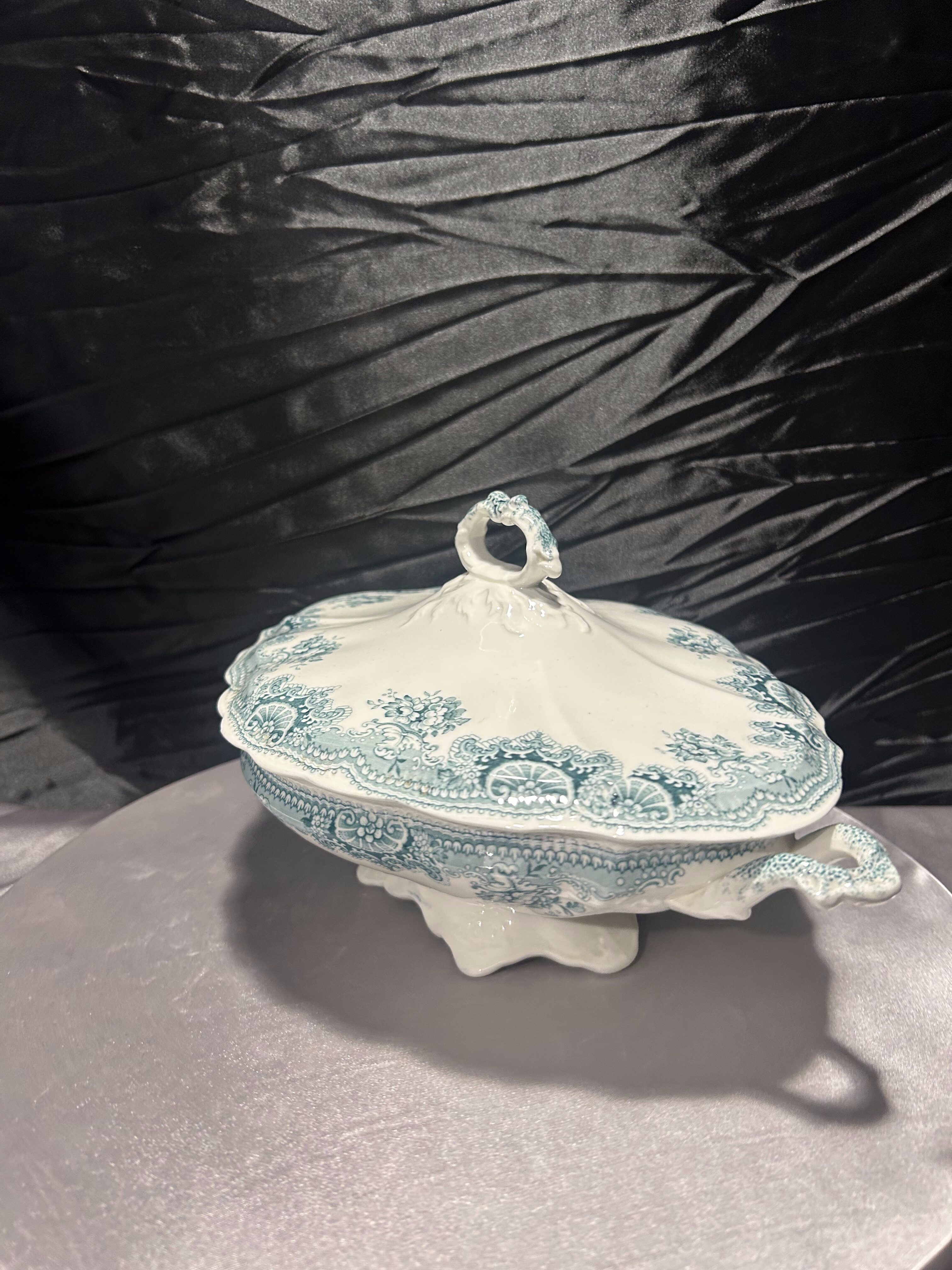 Waza porcelanowa Johnson Bros z kolekcji Edgvale to piękny przykład angielskiego rzemiosła ceramicznego przełomu XIX i XX wieku. Ornamenty w odcieniu turkusowym w połączeniu z klasyczną formą i secesyjną stylistyką czynią z niej wyjątkowy element kolekcjonerski, który ozdobi każdy stół i wnętrze.