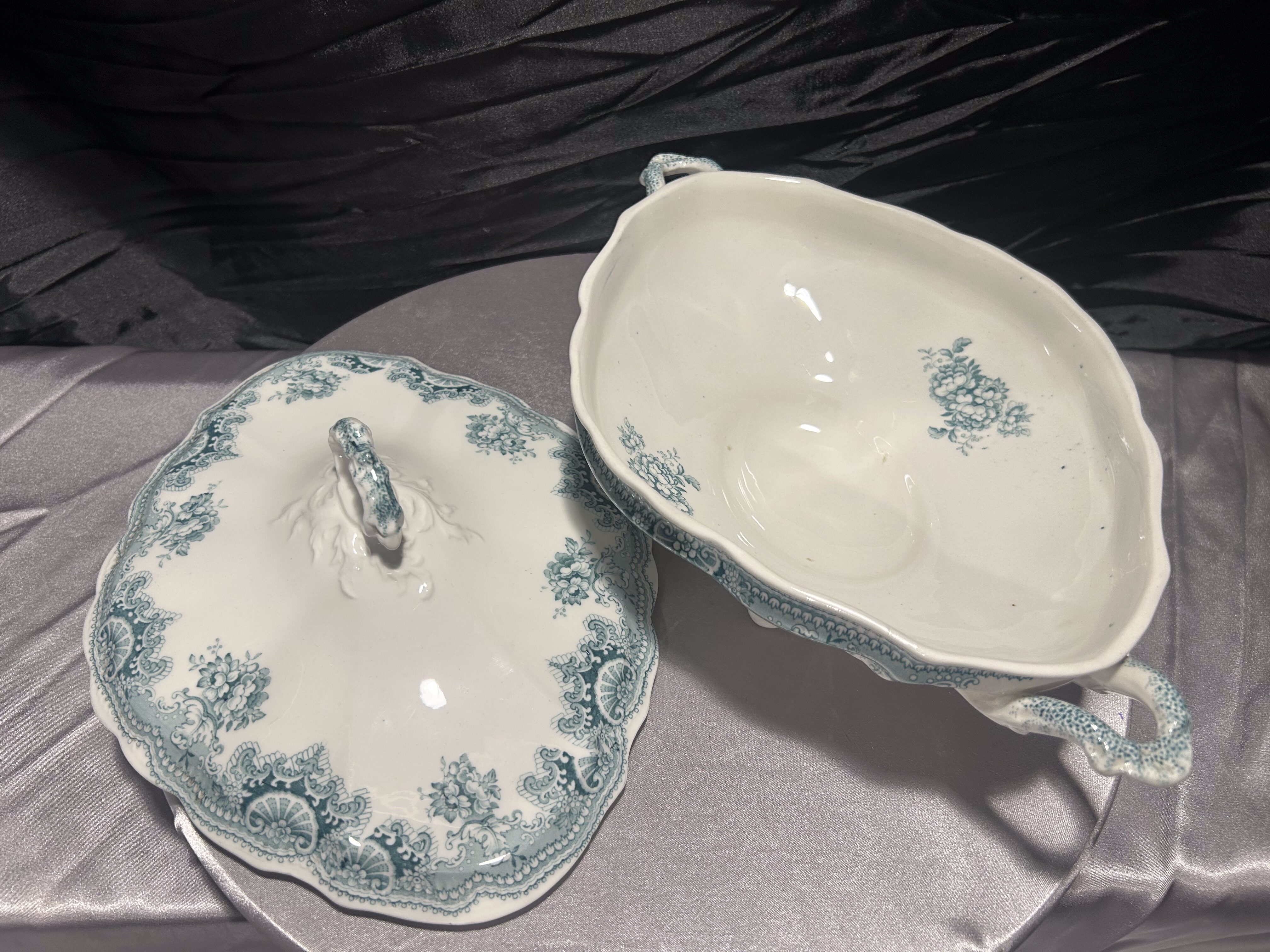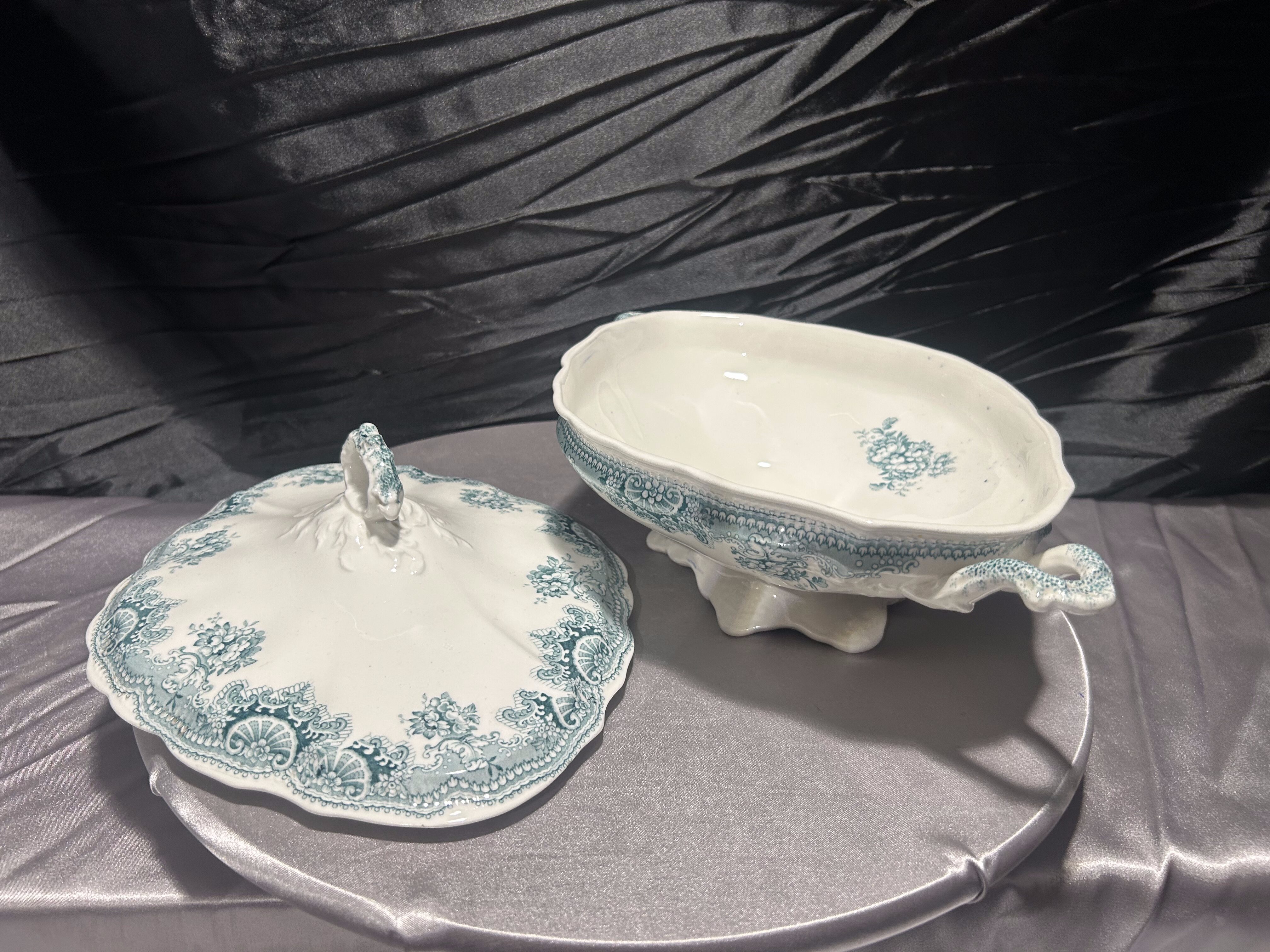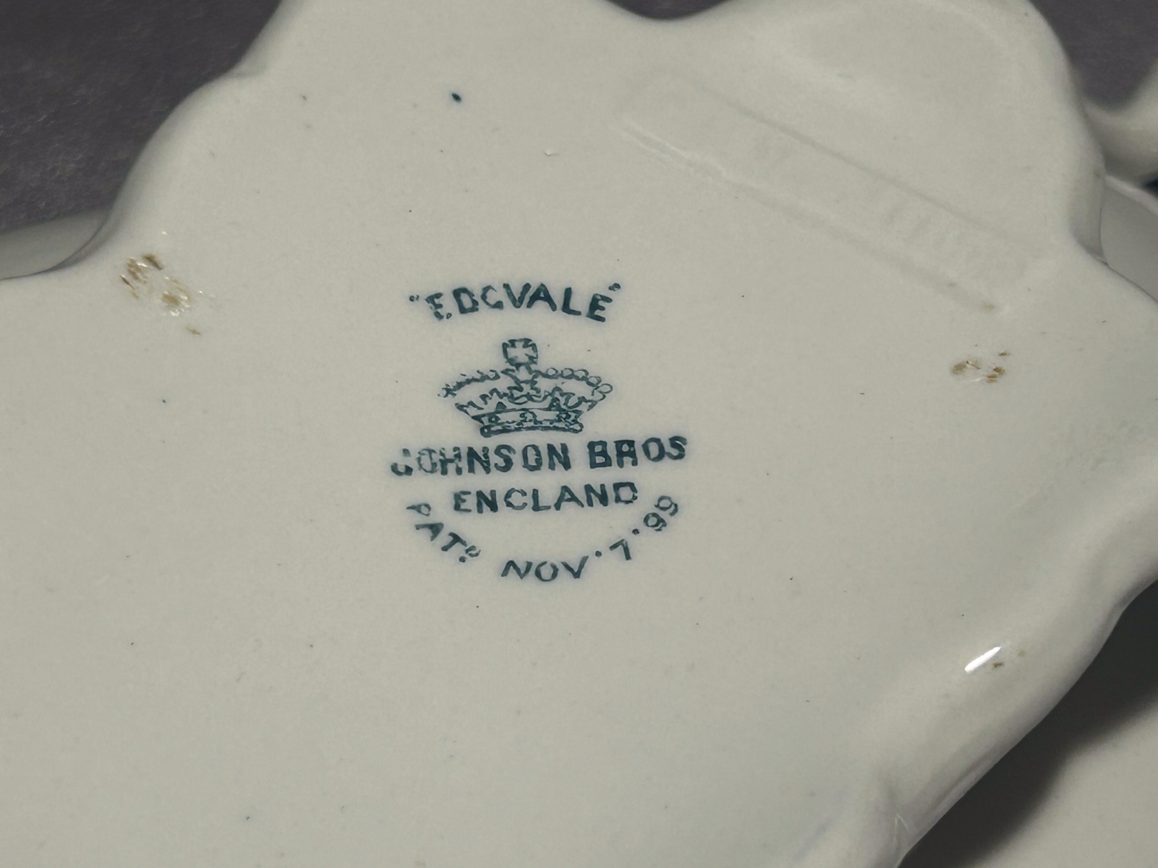 Johnson Bros to wytwórnia założona w 1883 roku w Hanley (Stoke-on-Trent, Staffordshire), znana z produkcji wyrobów ceramicznych o wysokiej jakości i pięknych zdobieniach. Kolekcja Edgvale charakteryzuje się dekoracją w odcieniach turkusu, inspirowaną stylistyką secesyjną, z ornamentalnymi bordiurami i motywami kwiatowymi.