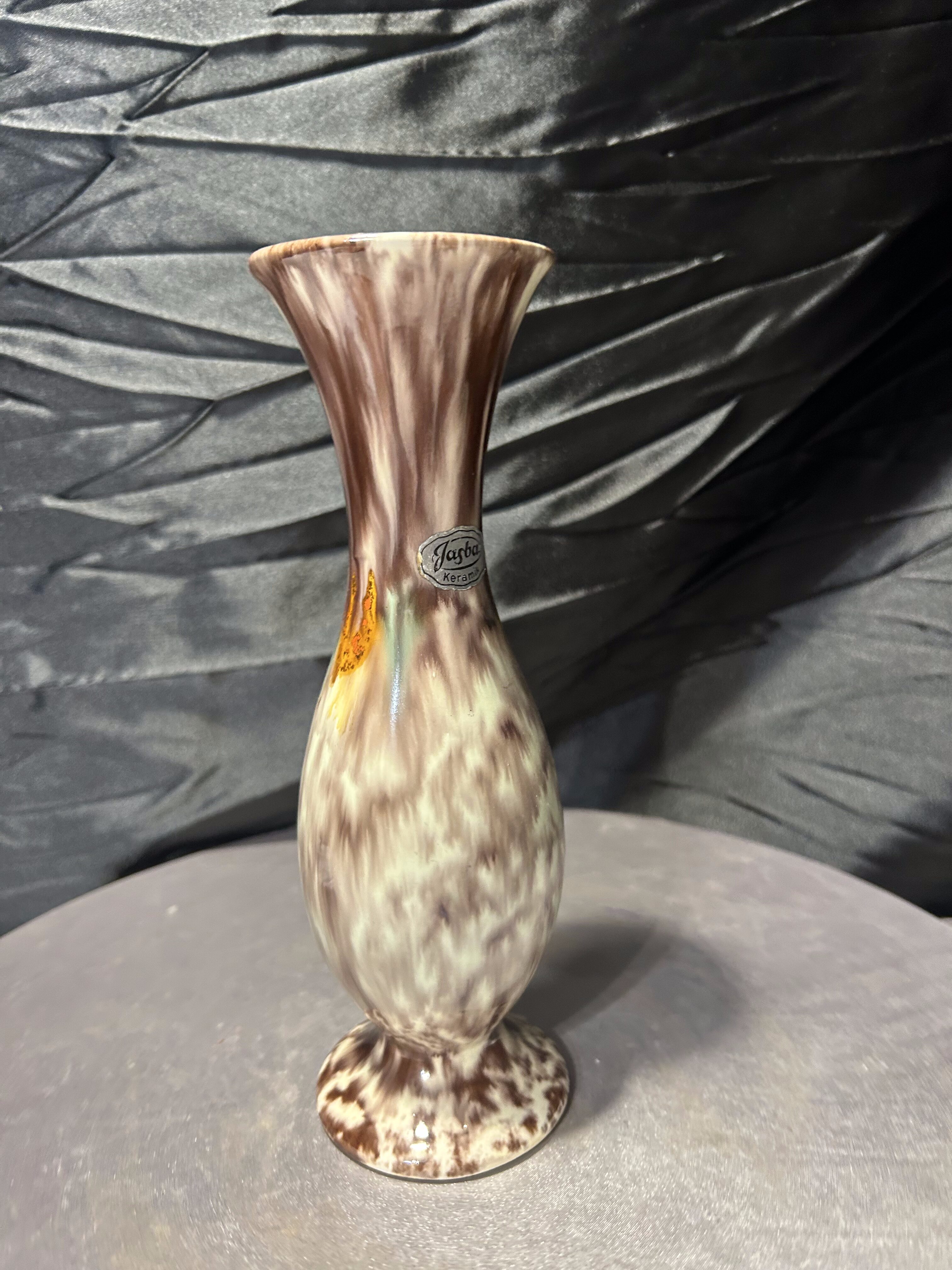 Dekoracyjny wazon niemieckiej manufaktury JASBA Keramik. Smukła forma oraz charakterystyczna szkliwiona powierzchnia w ciepłych odcieniach sprawiają, że jest to elegancki element wystroju wnętrza w stylu vintage.