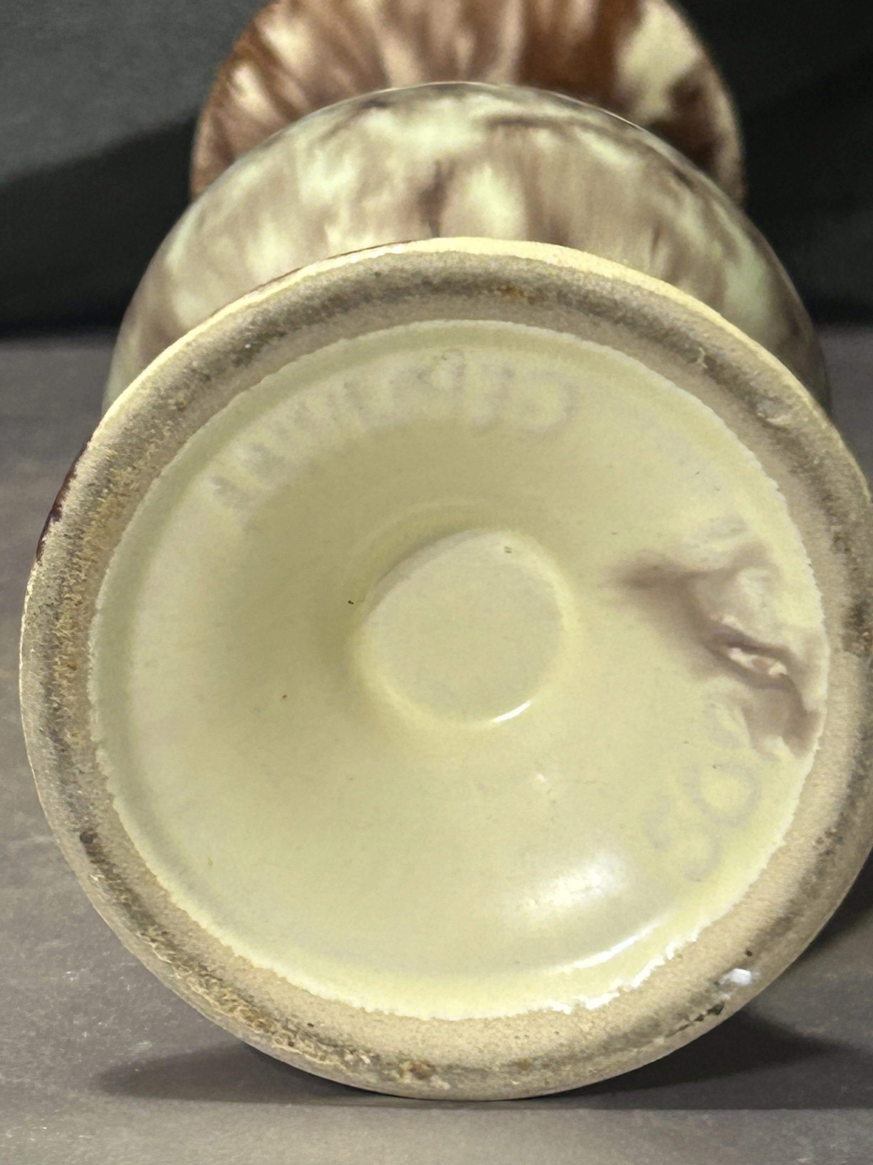 Wazon posiada smukłą, dekoracyjną formę z delikatnie rozszerzającą się szyjką. Pokryty jest efektowną szkliwioną powierzchnią o nieregularnym, artystycznym wzorze w odcieniach brązu, kremu oraz subtelnych tonów zieleni. Charakterystyczna dla ceramiki z połowy XX wieku glazura tworzy ciekawy efekt spływających barw, dzięki czemu każdy egzemplarz jest niepowtarzalny.
