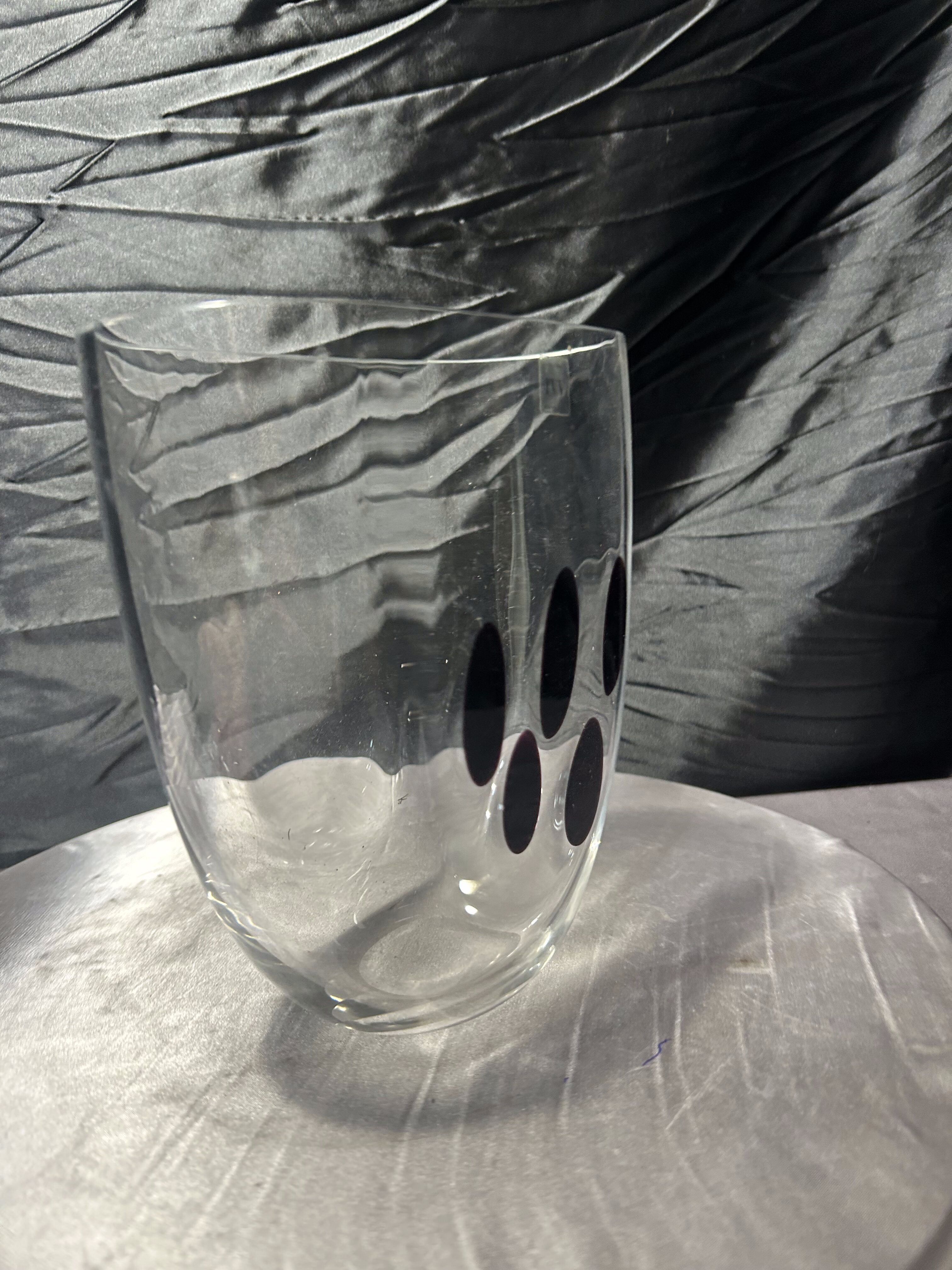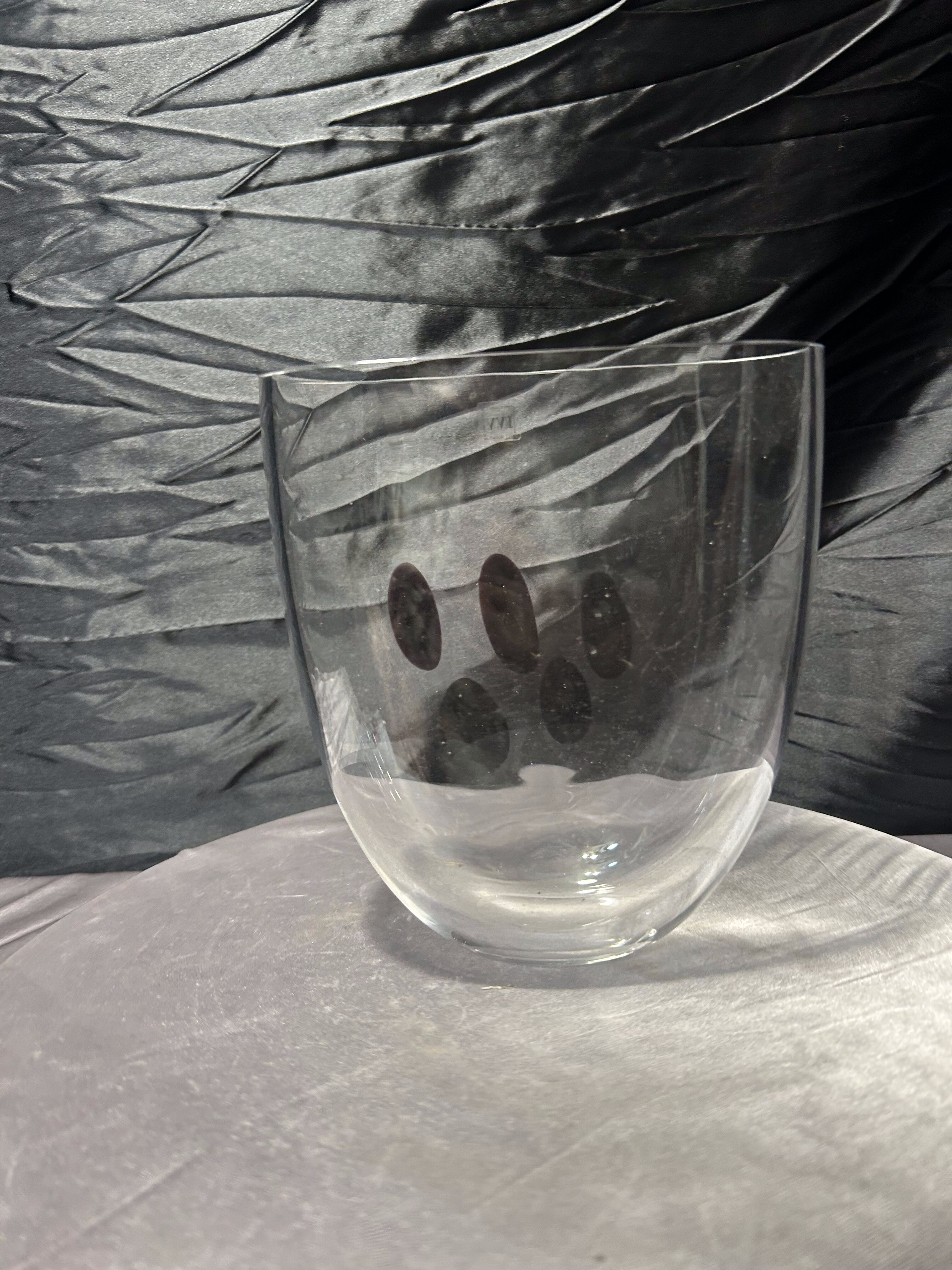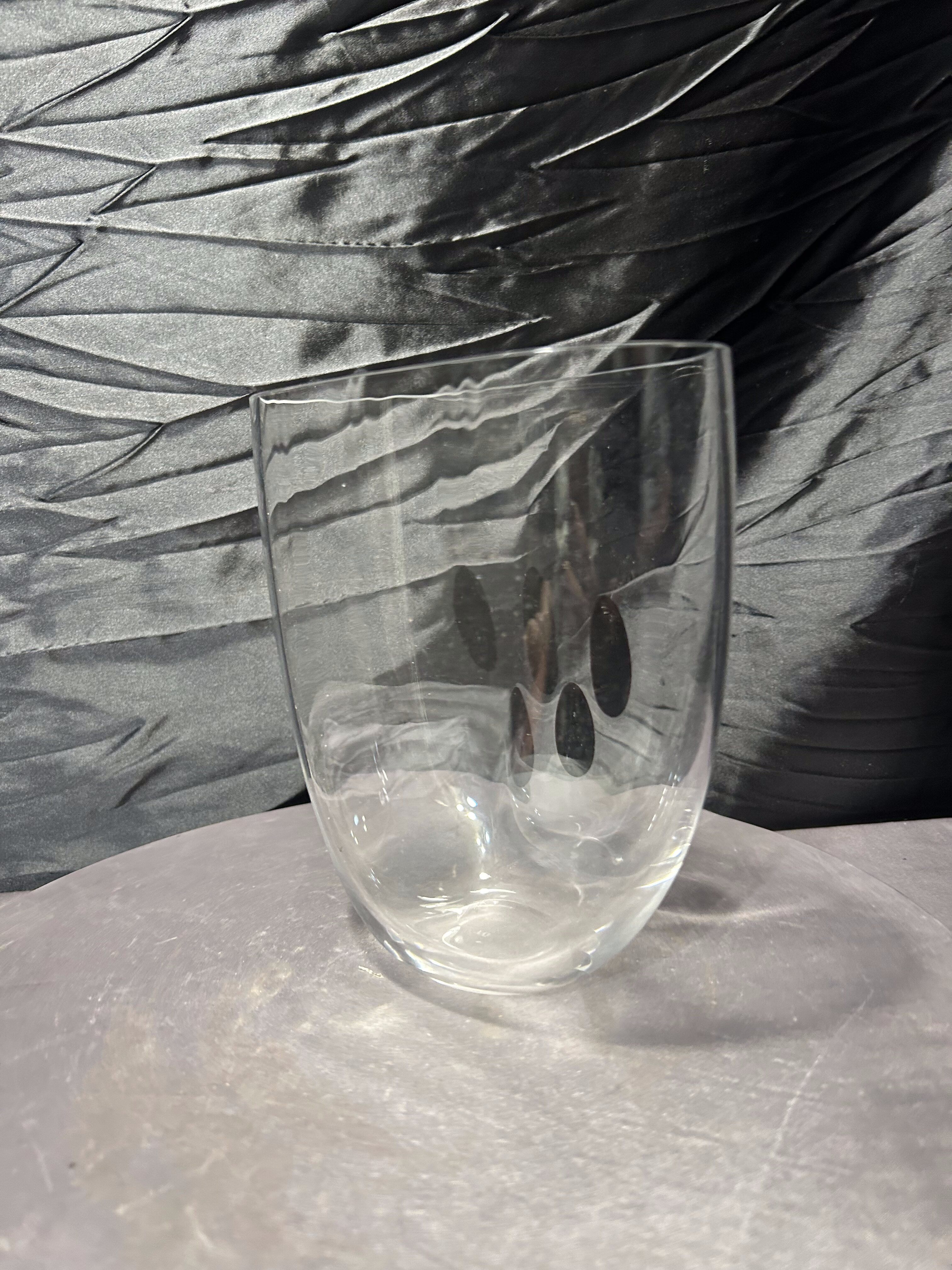 Dekoracyjny flakon wykonany z artystycznego szkła o nowoczesnej, miękko zaokrąglonej formie. Transparentna bryła została ozdobiona charakterystycznymi, zatopionymi w masie szkła ciemnymi owalami, które nadają całości wyrazisty, designerski charakter. Przedmiot doskonale wpisuje się zarówno w nowoczesne, jak i klasyczne wnętrza, pełniąc funkcję samodzielnej dekoracji lub eleganckiego wazonu.