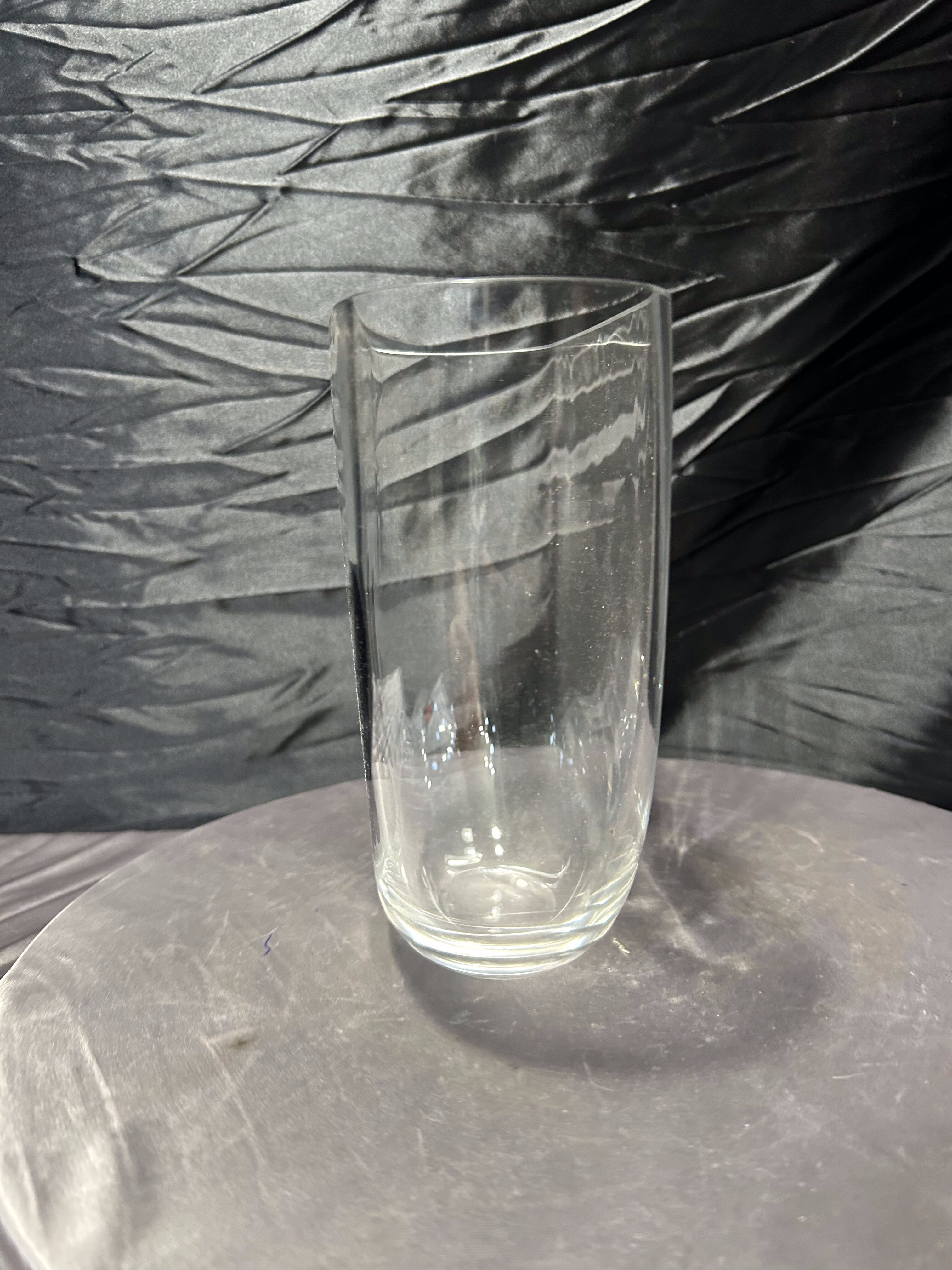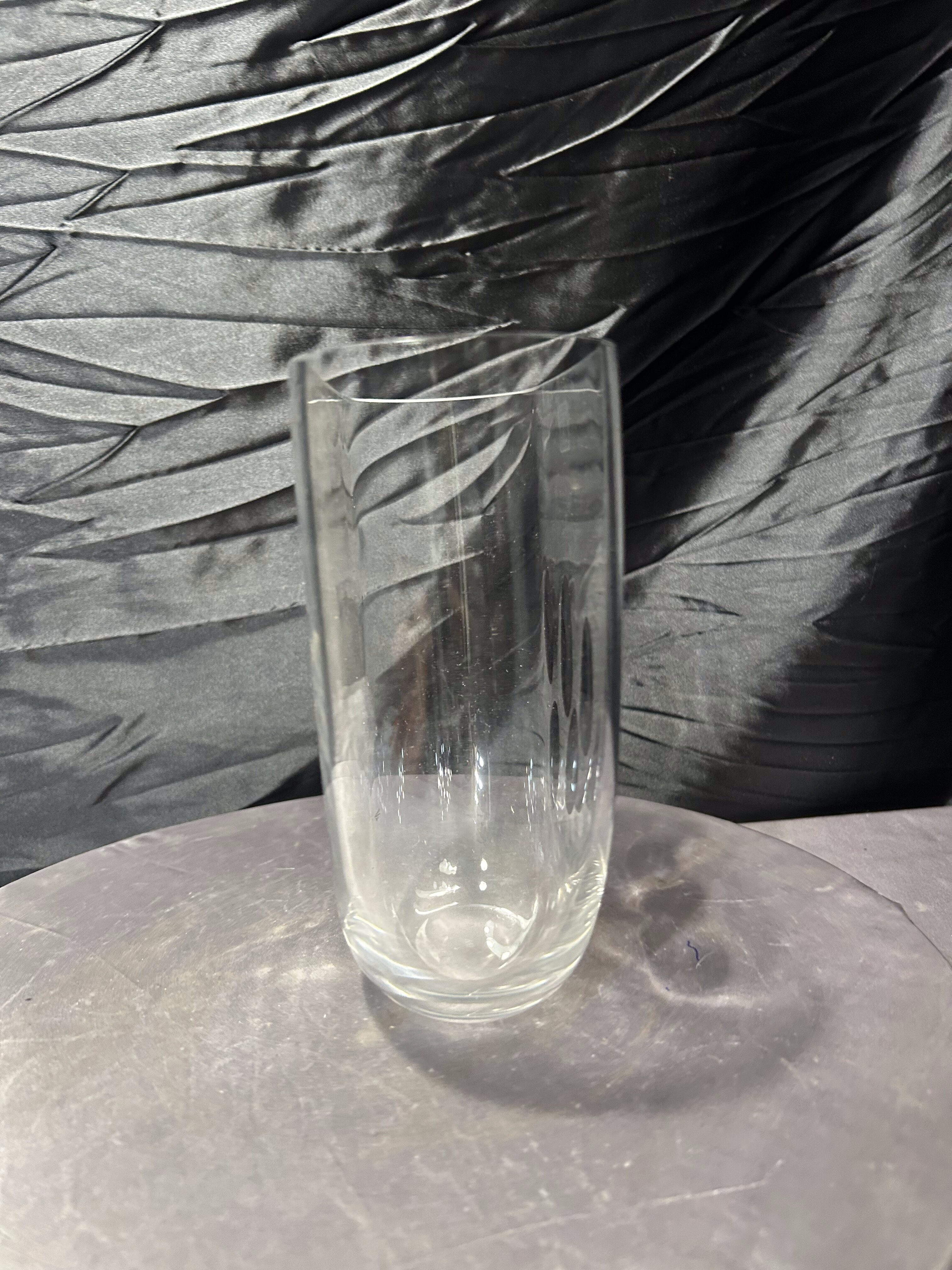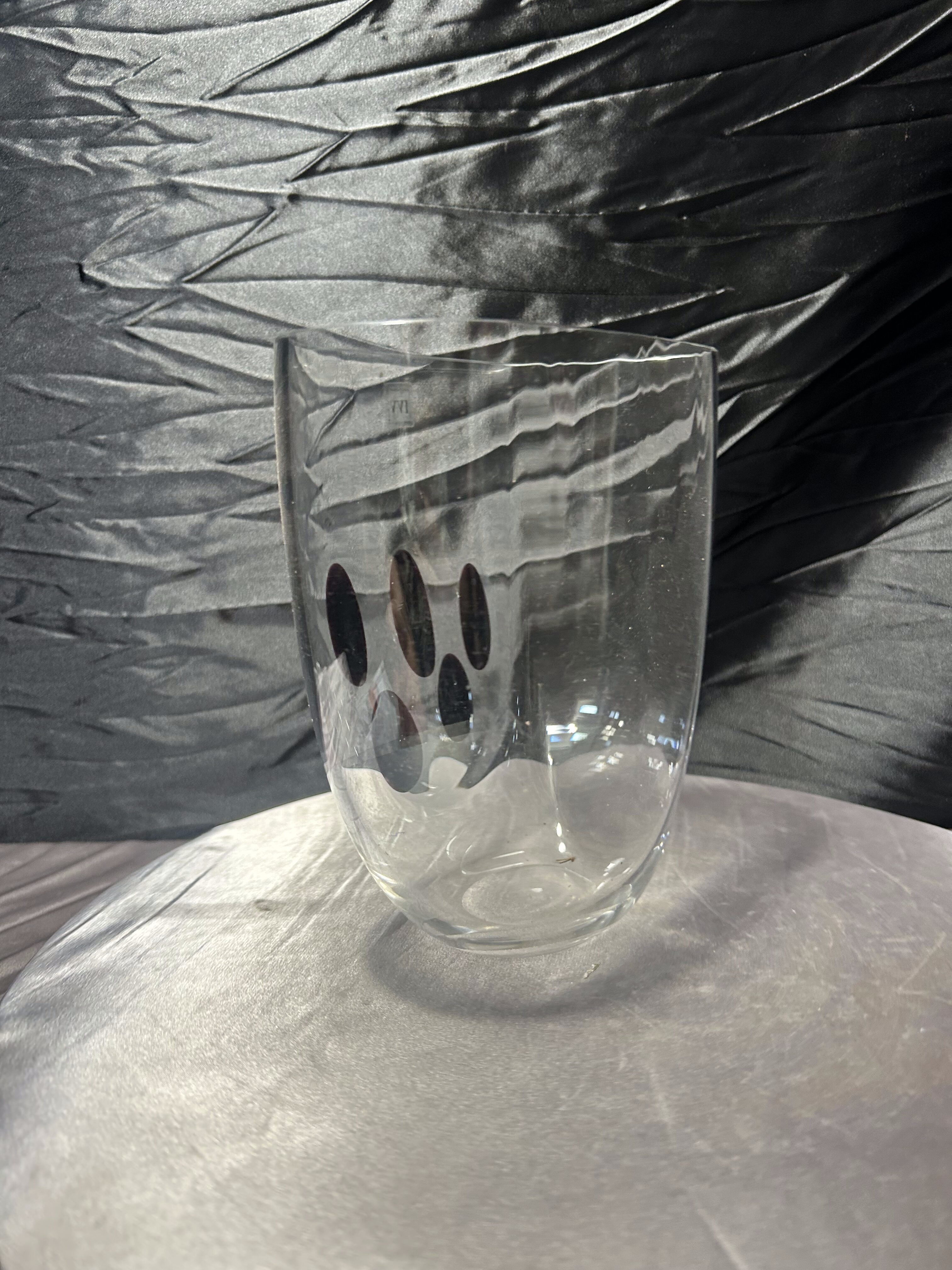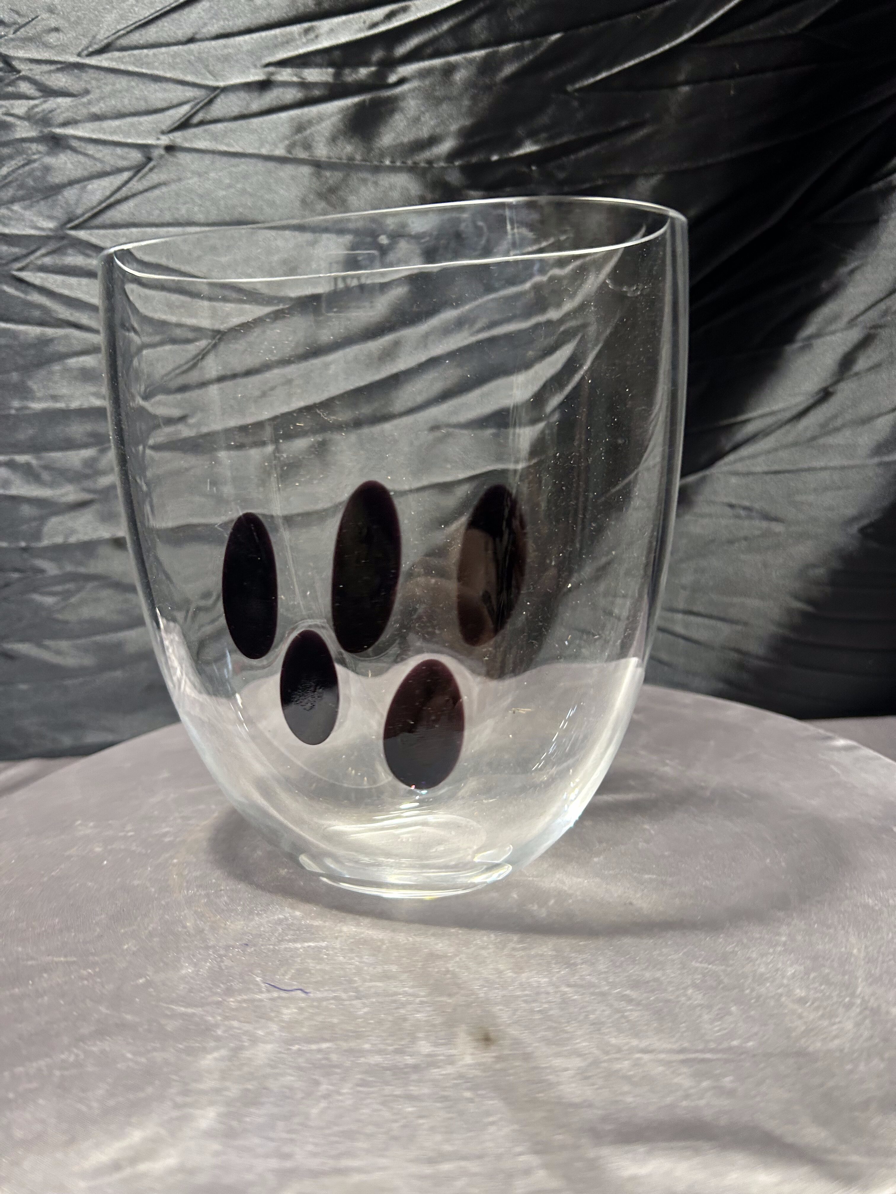 Dekoracyjny flakon wykonany z artystycznego szkła o nowoczesnej, miękko zaokrąglonej formie. Transparentna bryła została ozdobiona charakterystycznymi, zatopionymi w masie szkła ciemnymi owalami, które nadają całości wyrazisty, designerski charakter. Przedmiot doskonale wpisuje się zarówno w nowoczesne, jak i klasyczne wnętrza, pełniąc funkcję samodzielnej dekoracji lub eleganckiego wazonu.