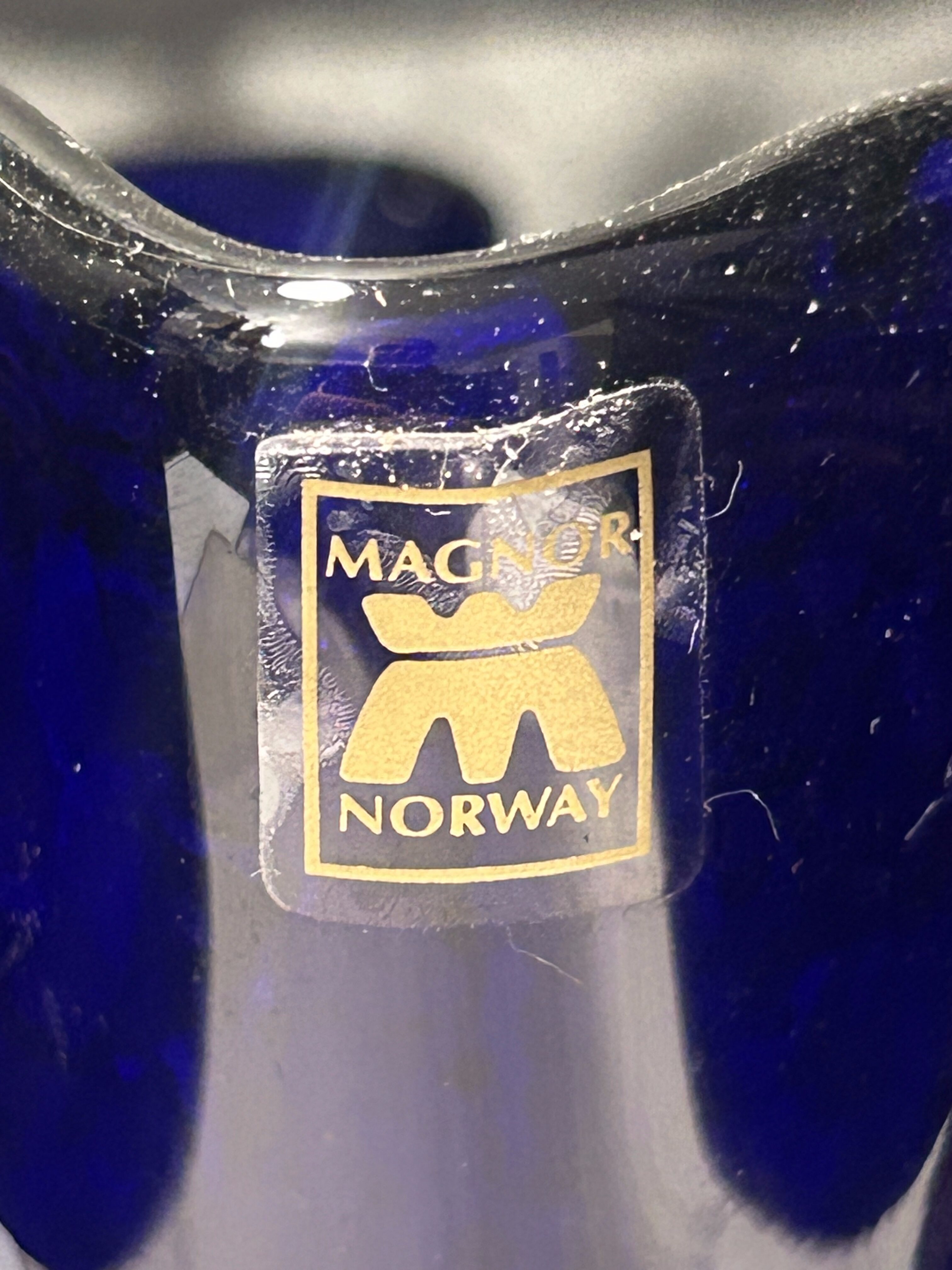 Egzemplarz posiada oryginalną sygnaturę producenta Magnor Norway, co potwierdza jego autentyczność oraz pochodzenie z jednej z najbardziej cenionych norweskich manufaktur szkła artystycznego, działającej od końca XIX wieku.