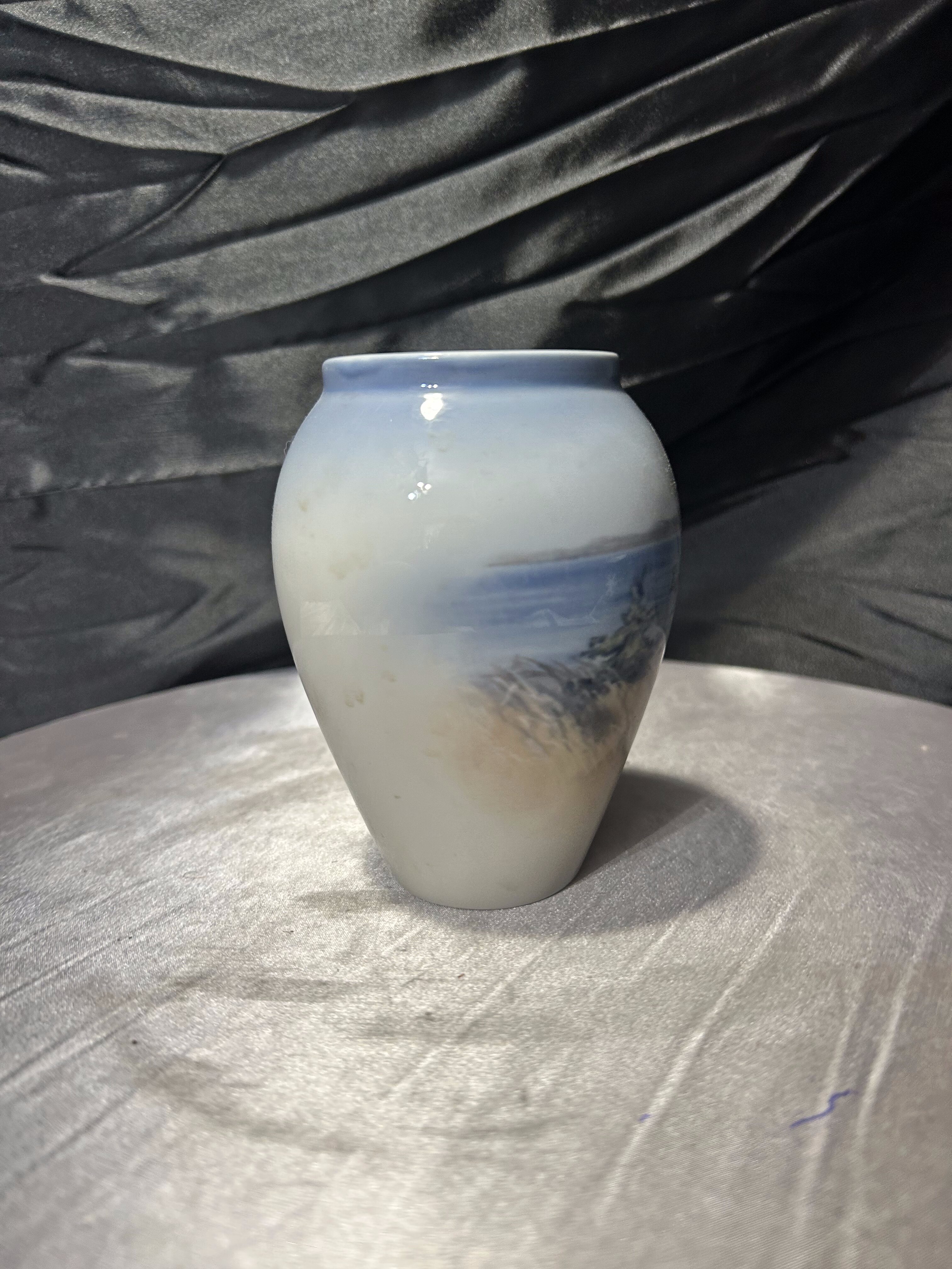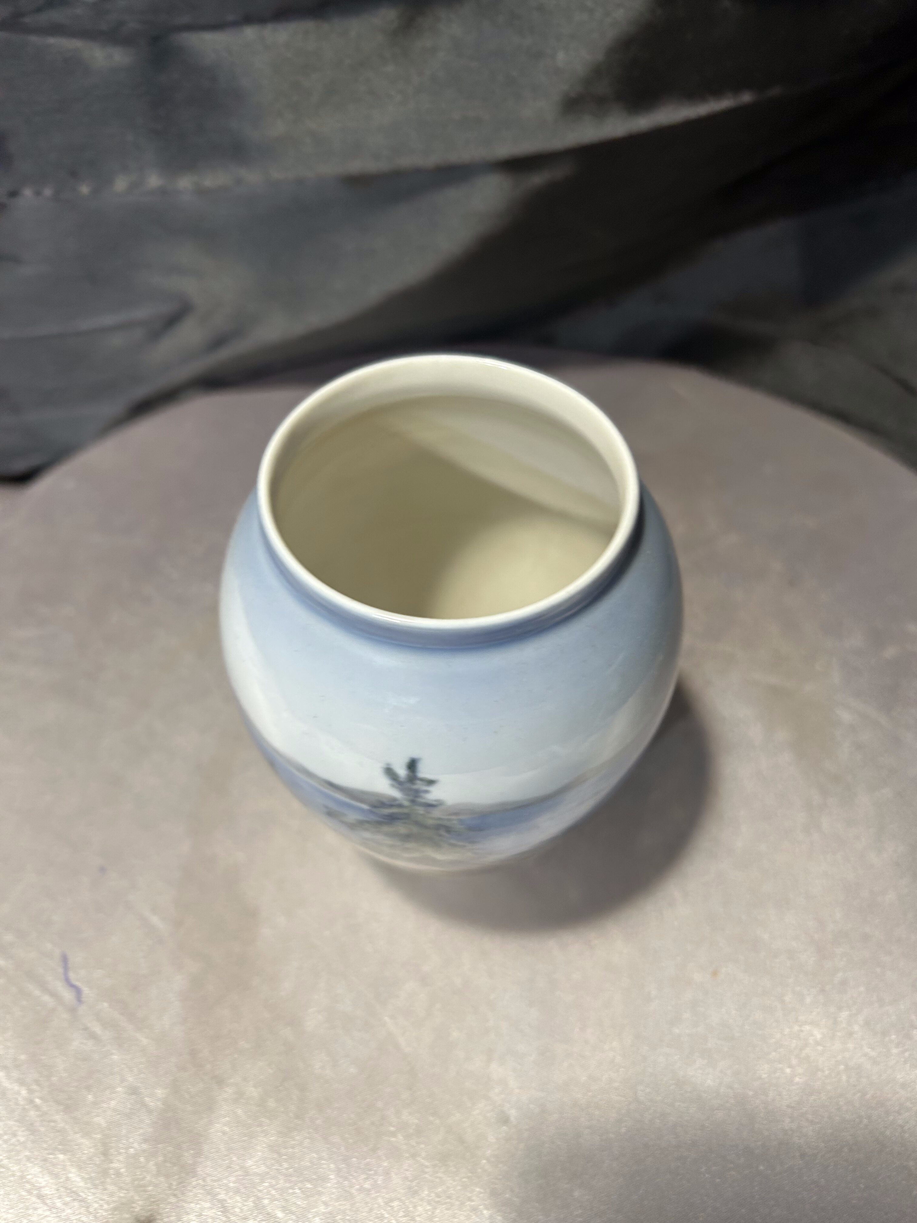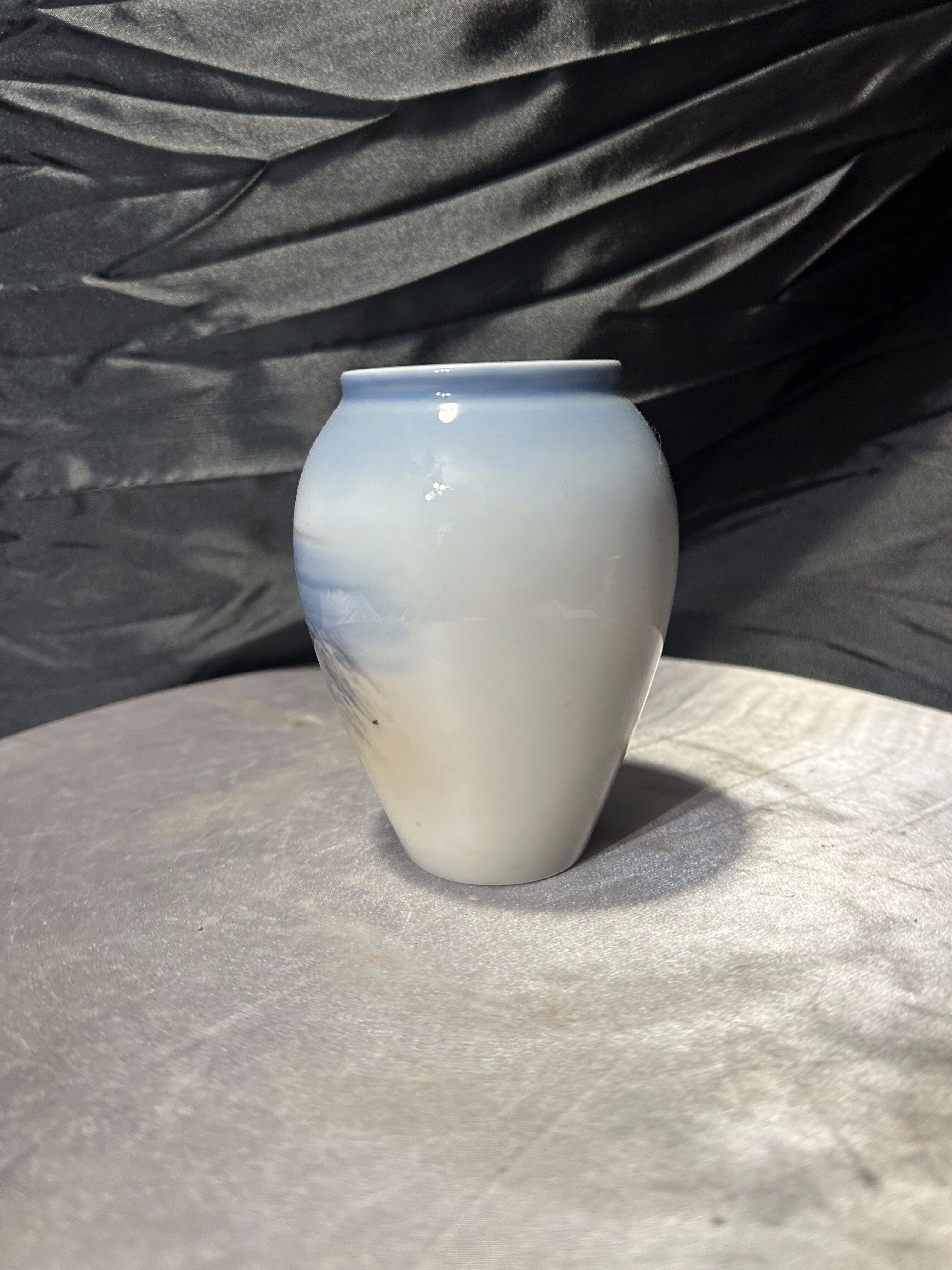 Porcelanowy wazon duńskiej manufaktury Royal Copenhagen z subtelnym pejzażem inspirowanym skandynawską naturą. Elegancka forma oraz ręcznie malowana dekoracja sprawiają, że jest to wyjątkowy element wystroju i interesujący egzemplarz dla kolekcjonerów porcelany.
