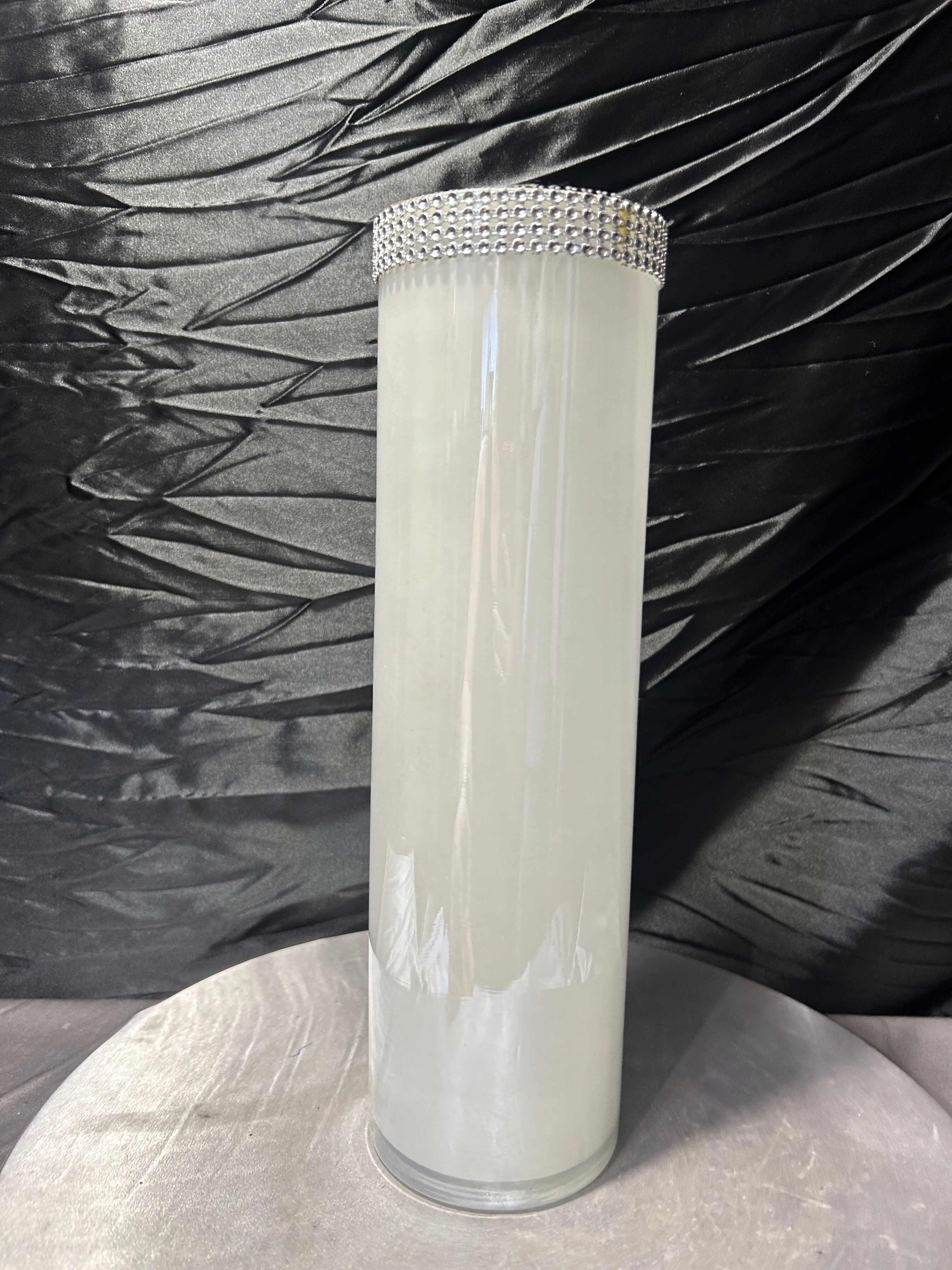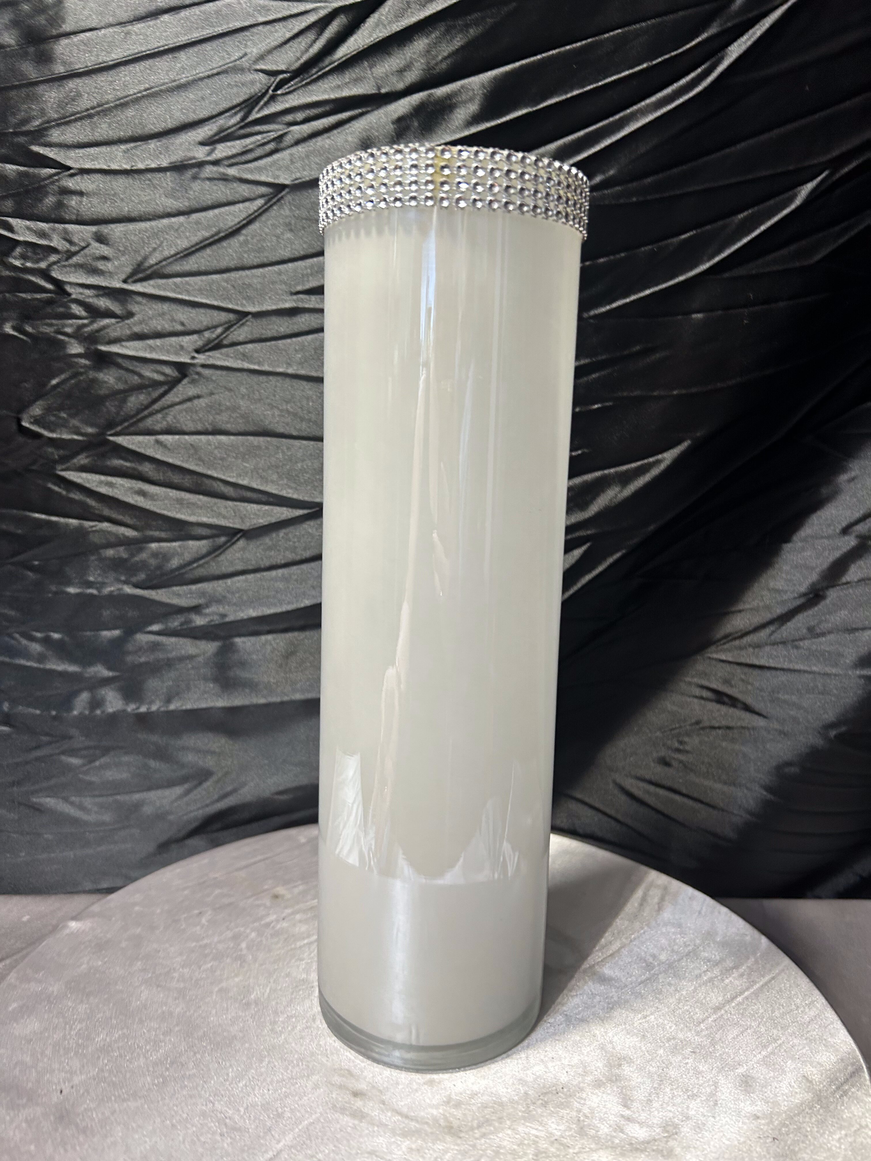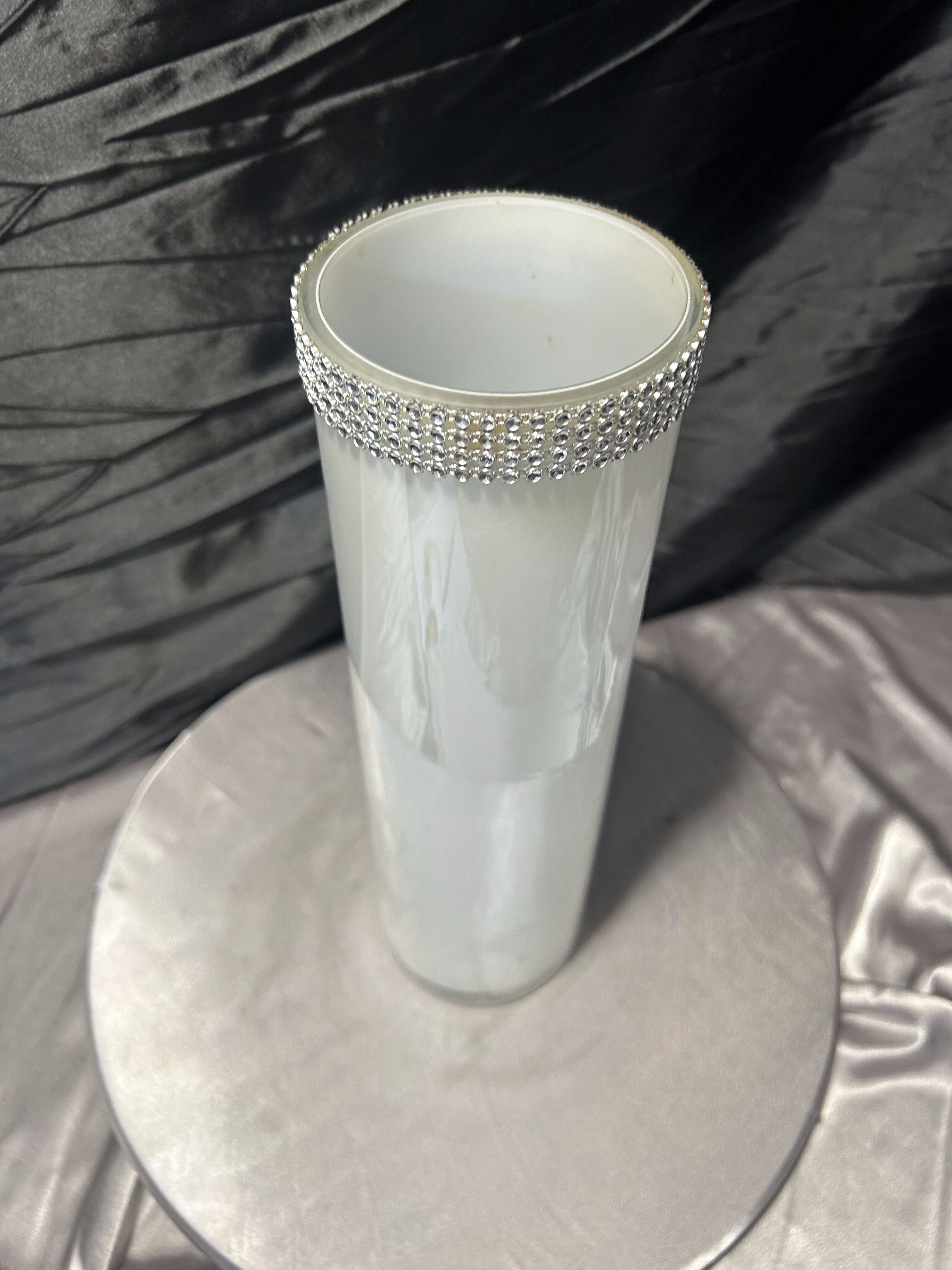 Elegancki, wysoki wazon o prostej, cylindrycznej formie wykonany z mlecznego szkła. Minimalistyczny kształt został przełamany efektowną, dekoracyjną obwódką z cyrkonii umieszczoną w górnej części, która nadaje całości wyrafinowanego charakteru w stylu glamour.