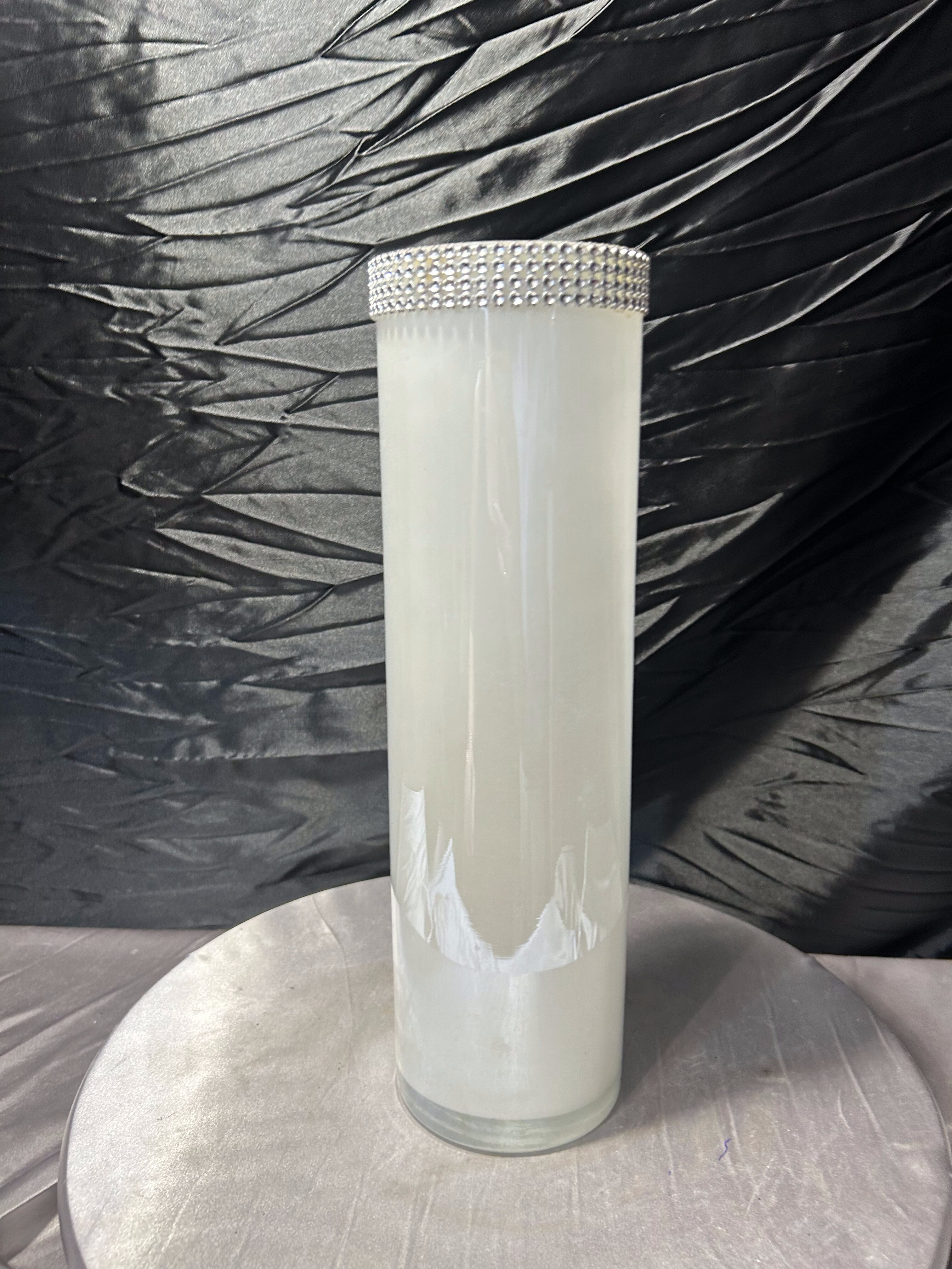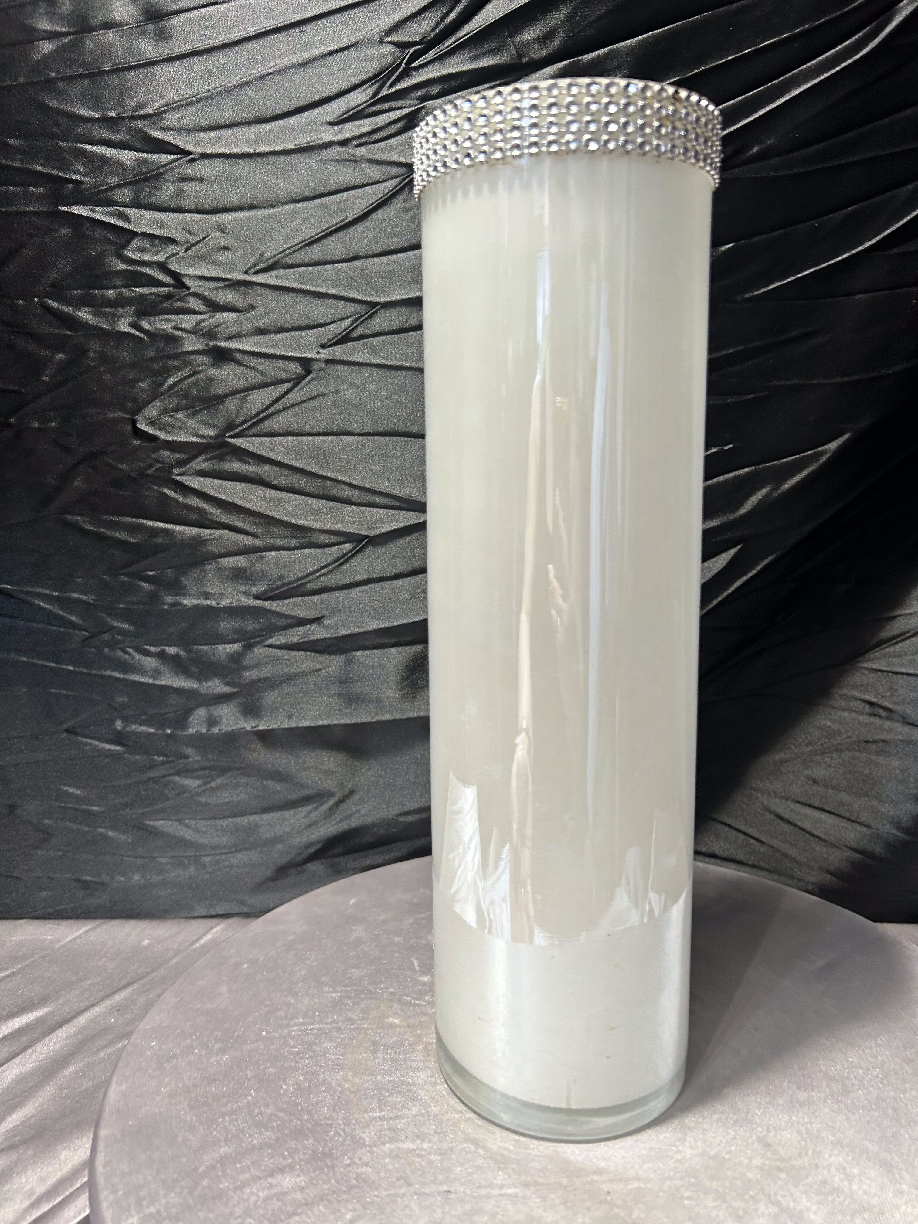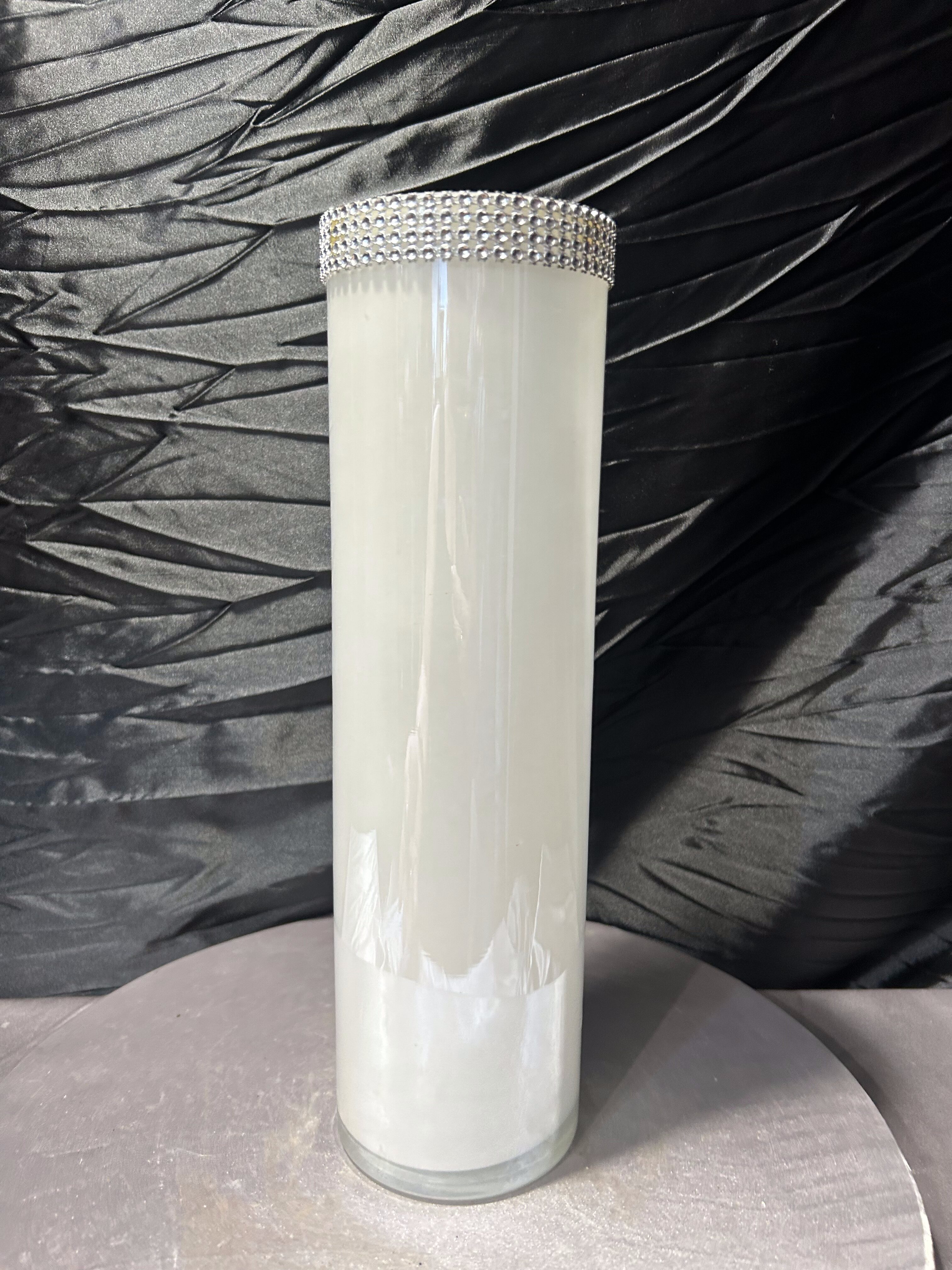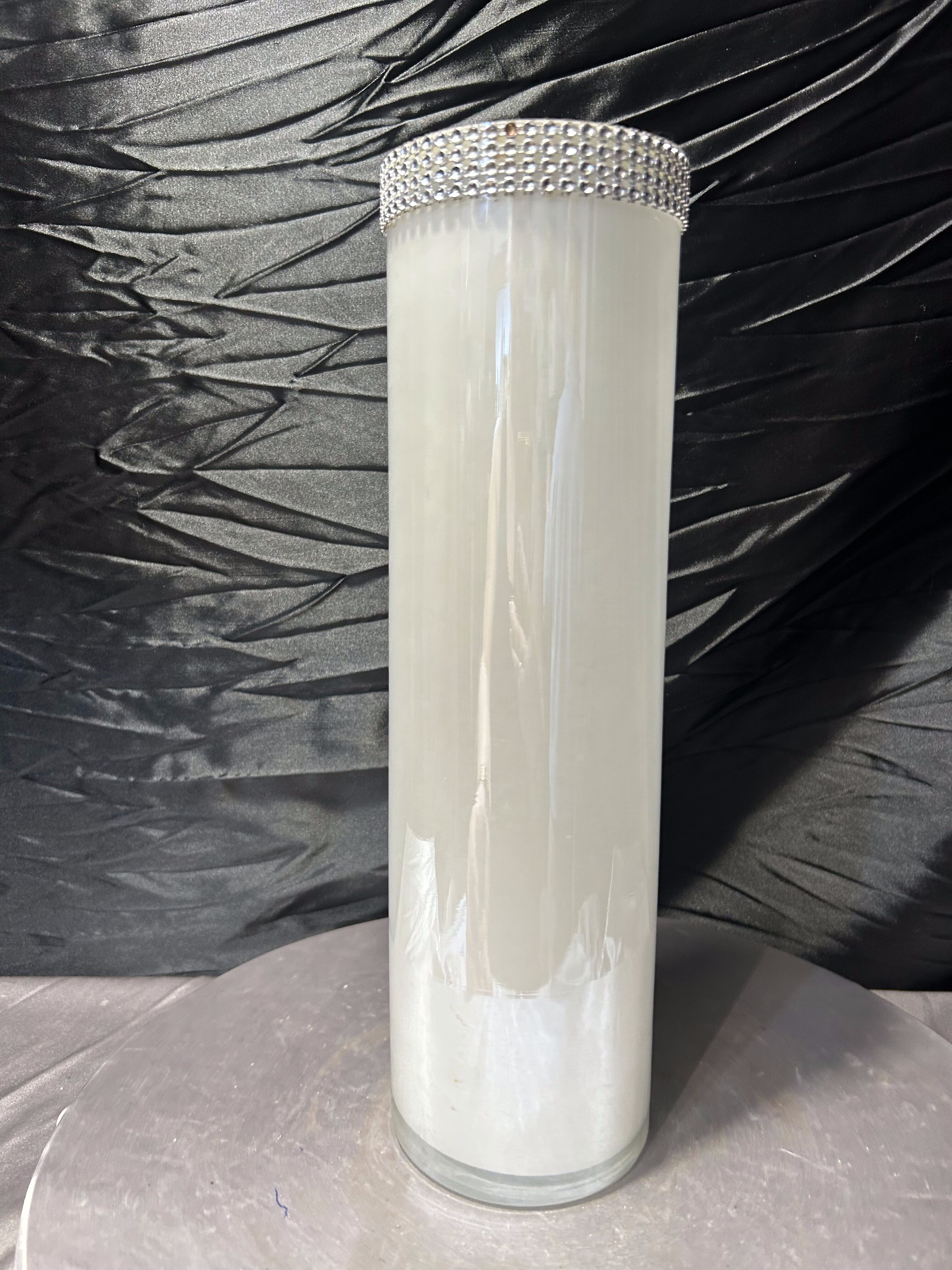 Elegancki, wysoki wazon o prostej, cylindrycznej formie wykonany z mlecznego szkła. Minimalistyczny kształt został przełamany efektowną, dekoracyjną obwódką z cyrkonii umieszczoną w górnej części, która nadaje całości wyrafinowanego charakteru w stylu glamour.