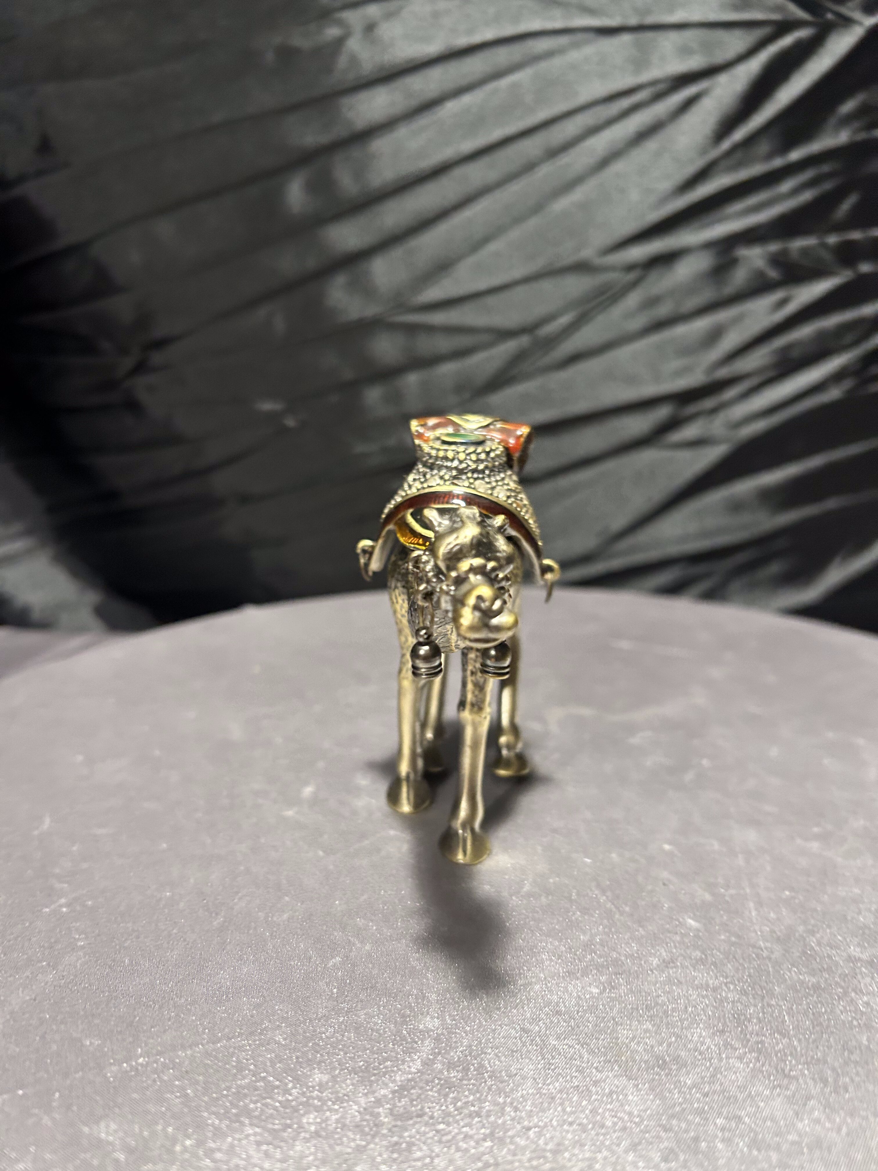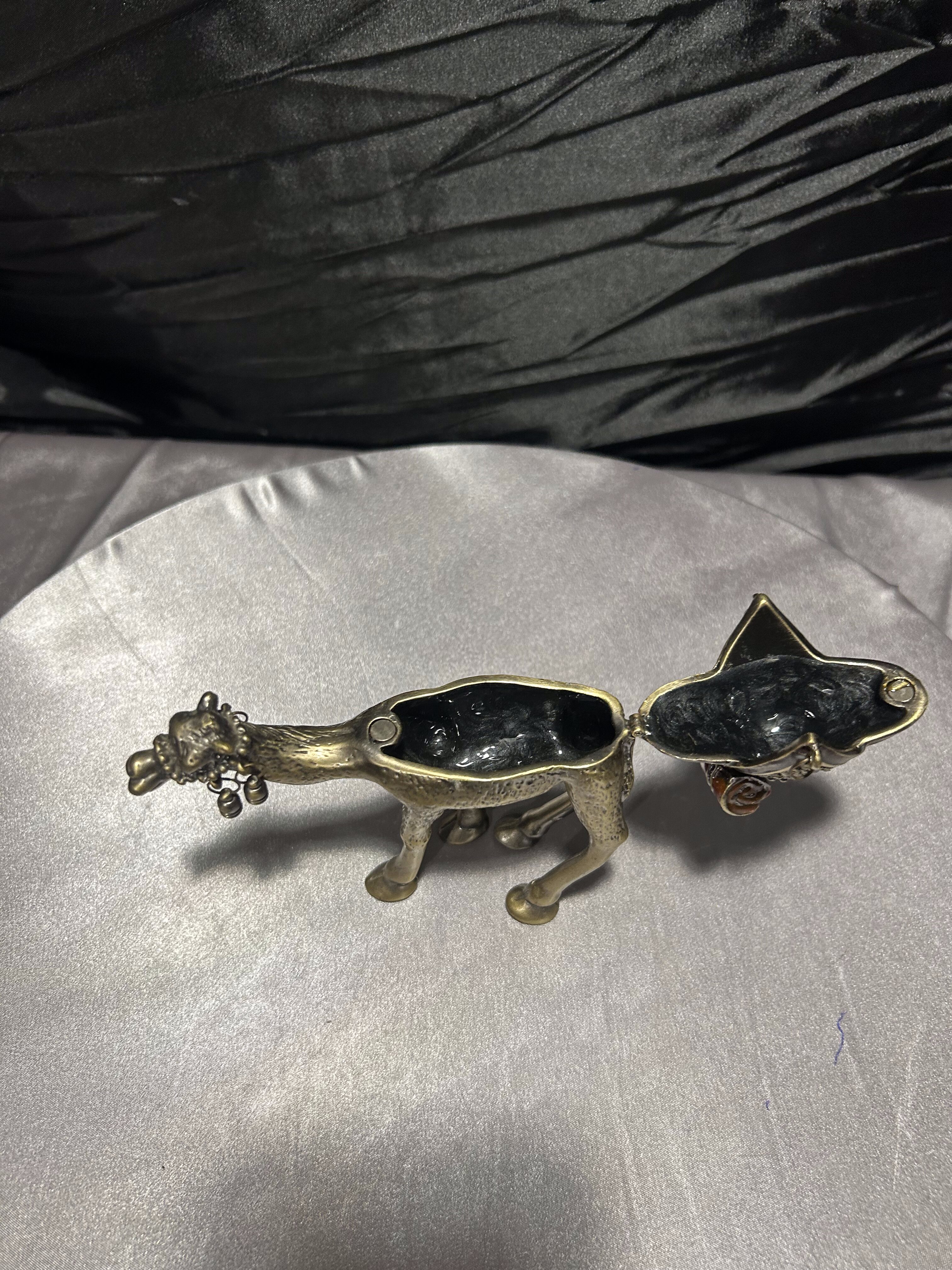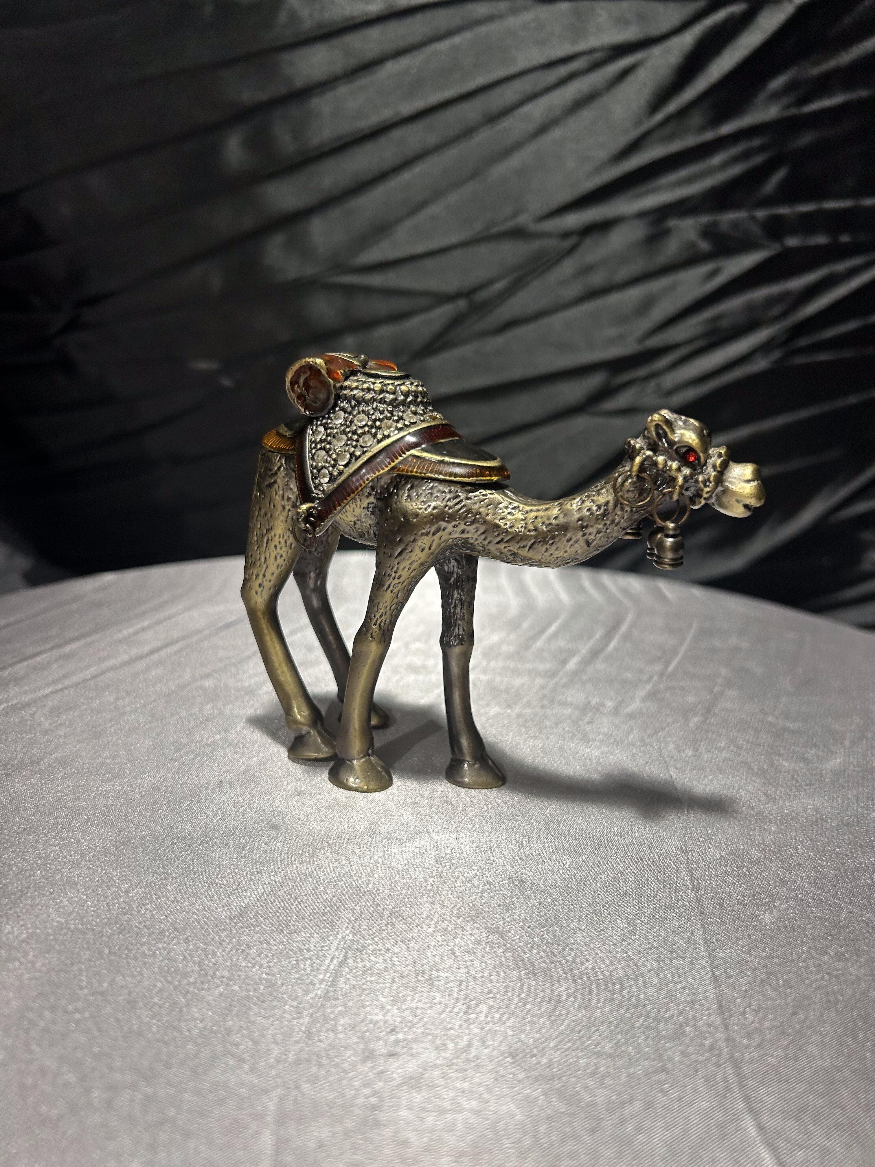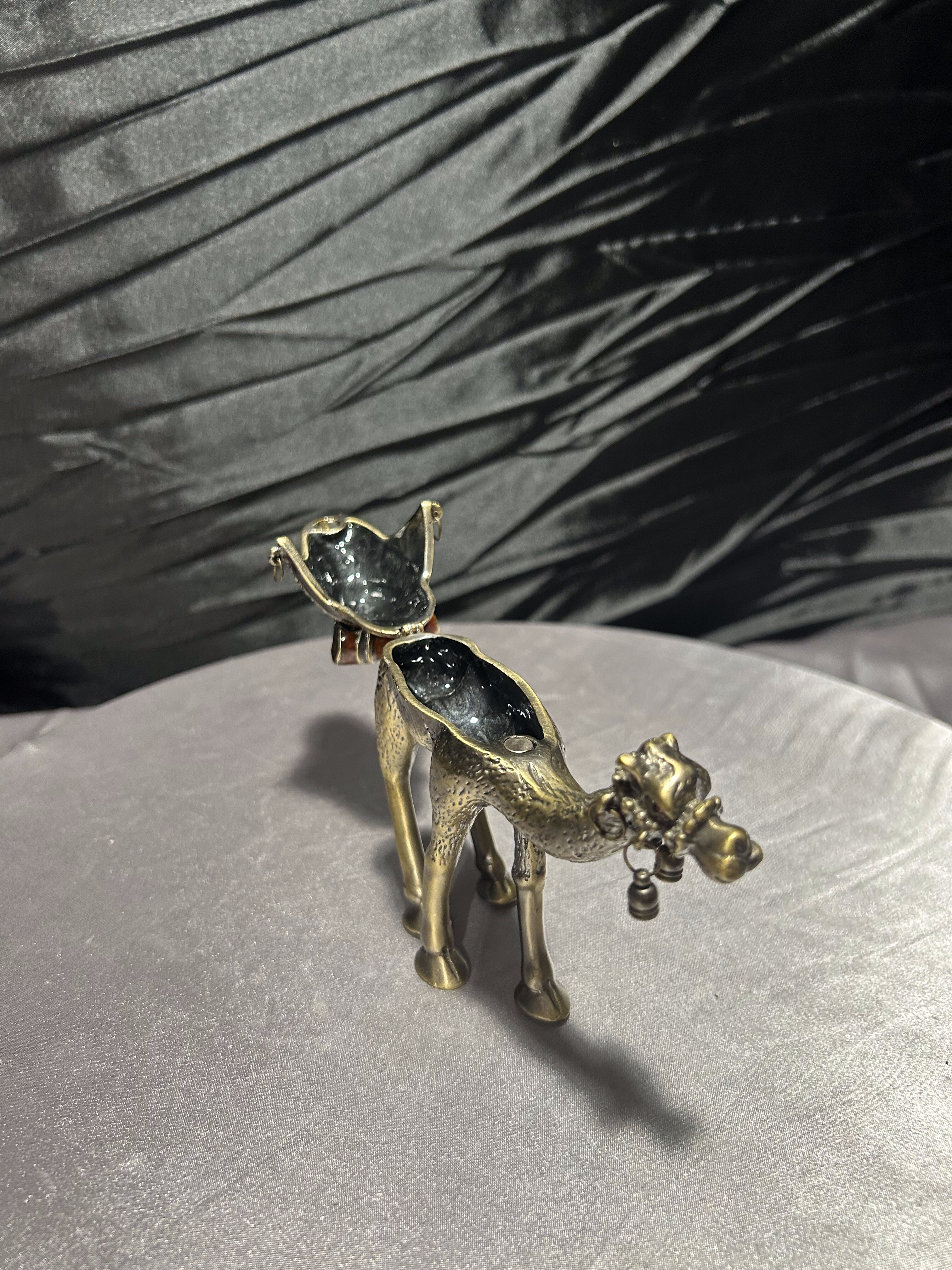 Wyjątkowy przedmiot – figura wielbłąda wykonana z metalu (prawdopodobnie mosiądz lub brąz), pełniąca jednocześnie funkcję małego puzderka-schowka. Zdobiona detalami: siodło dekoracyjne z kamieniami lub imitacją kamieni, zawieszki dzwoneczki przy pysku, ruchome zamknięcie-klapa umożliwiające umieszczenie w środku drobnych przedmiotów. Osadzona w stylu orientalnym, idealna jako dekoracja, prezent lub mały wazałek kolekcjonerski.