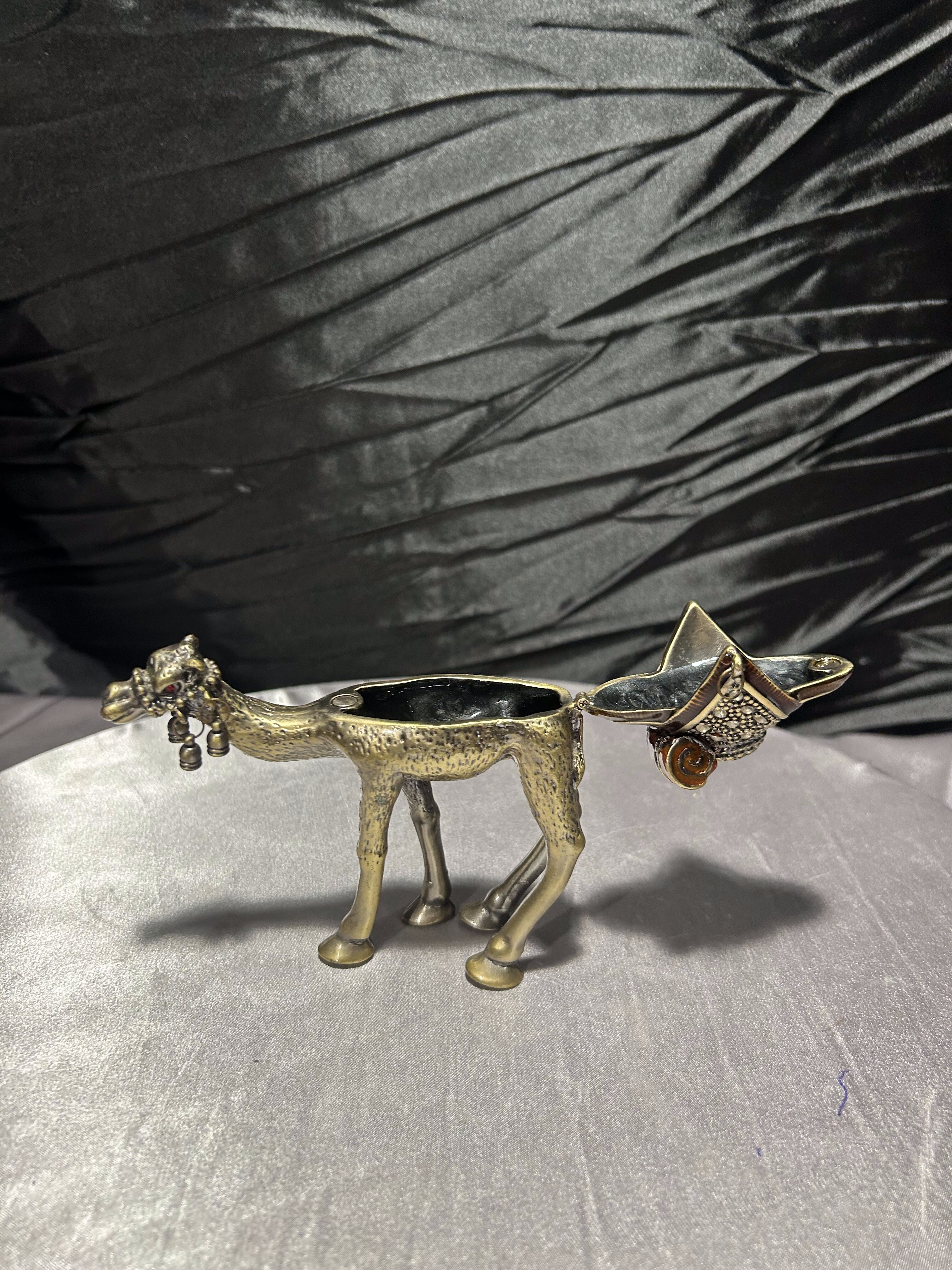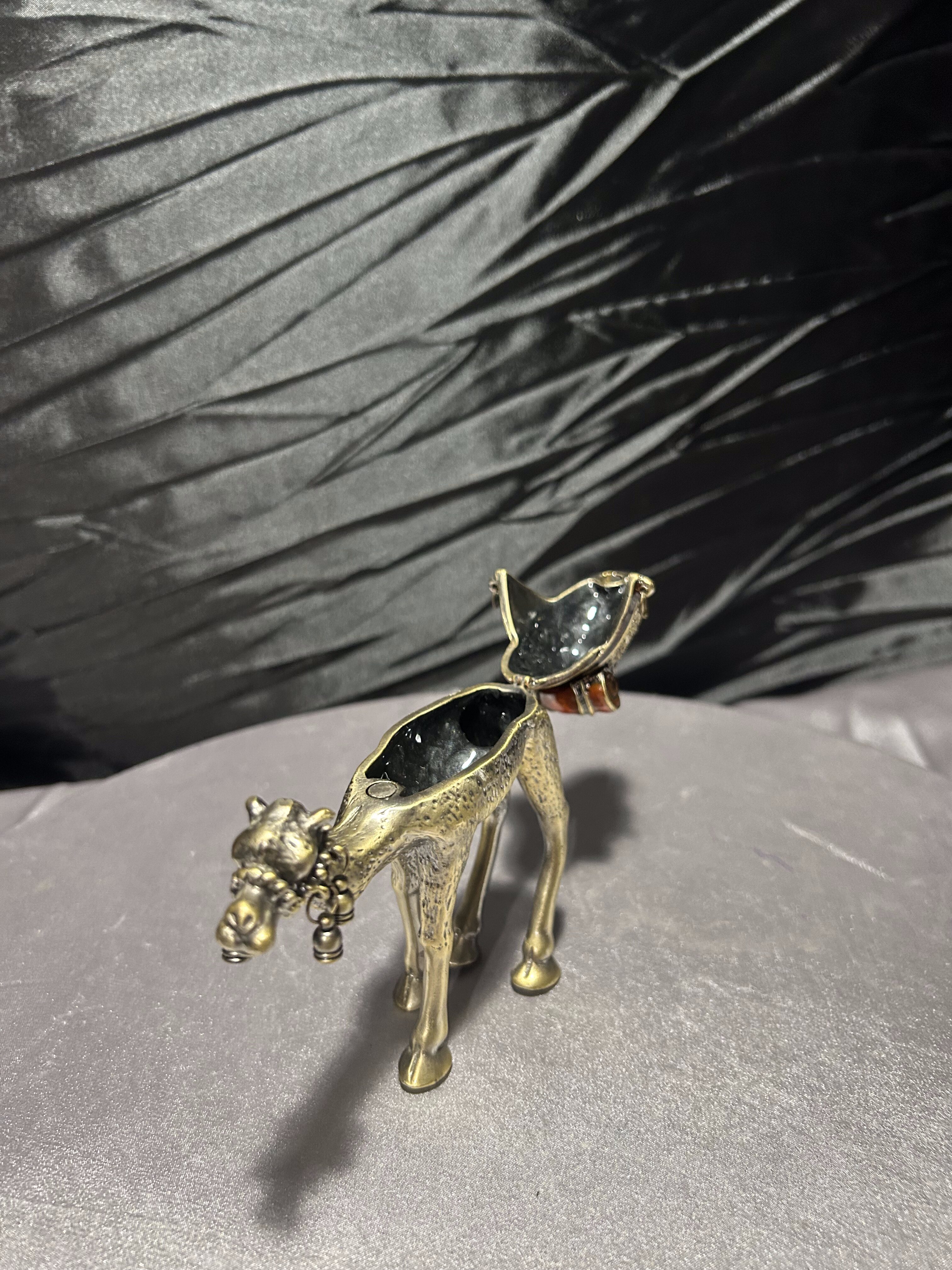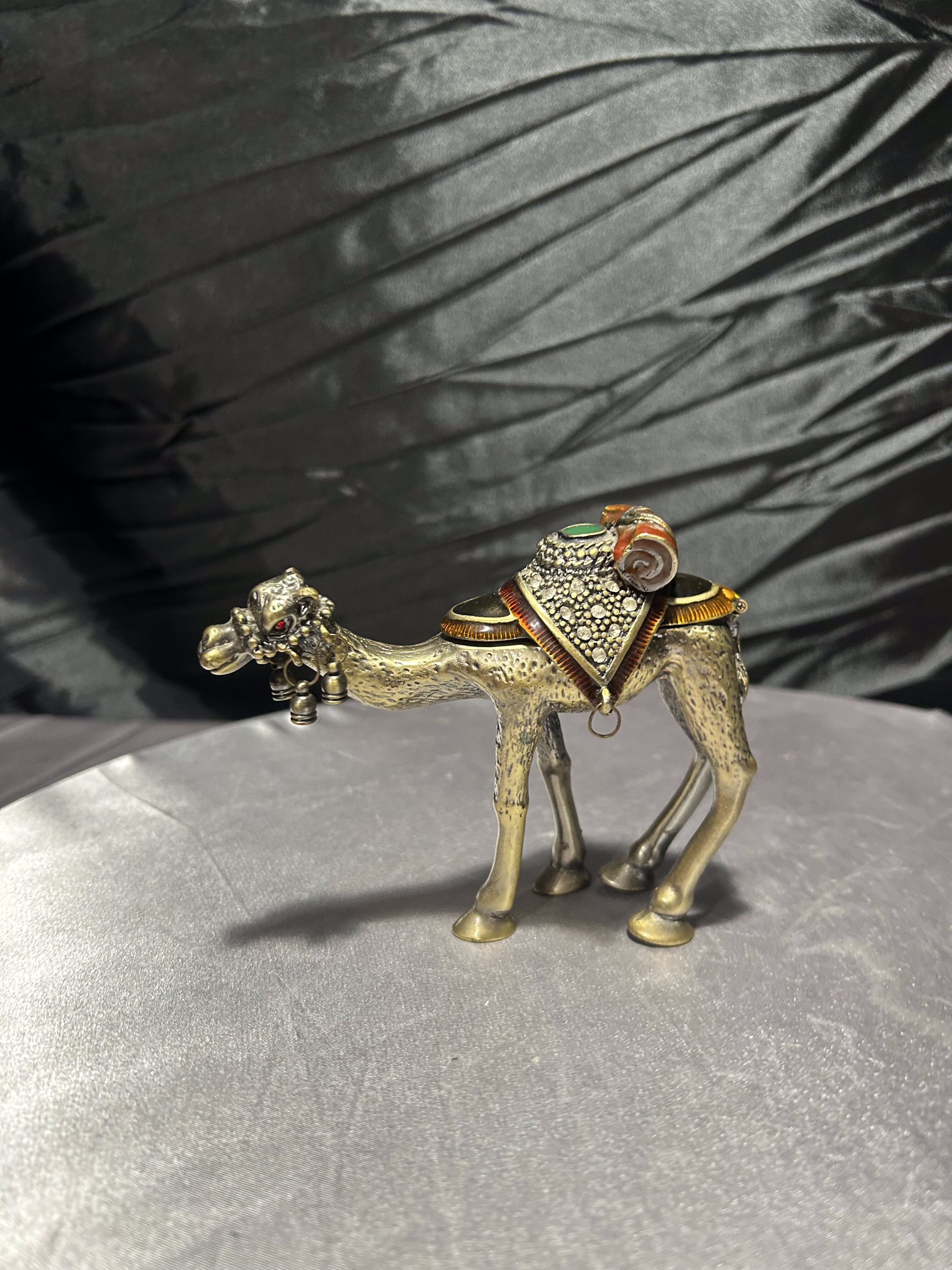 Wyjątkowy przedmiot – figura wielbłąda wykonana z metalu (prawdopodobnie mosiądz lub brąz), pełniąca jednocześnie funkcję małego puzderka-schowka. Zdobiona detalami: siodło dekoracyjne z kamieniami lub imitacją kamieni, zawieszki dzwoneczki przy pysku, ruchome zamknięcie-klapa umożliwiające umieszczenie w środku drobnych przedmiotów. Osadzona w stylu orientalnym, idealna jako dekoracja, prezent lub mały wazałek kolekcjonerski.
