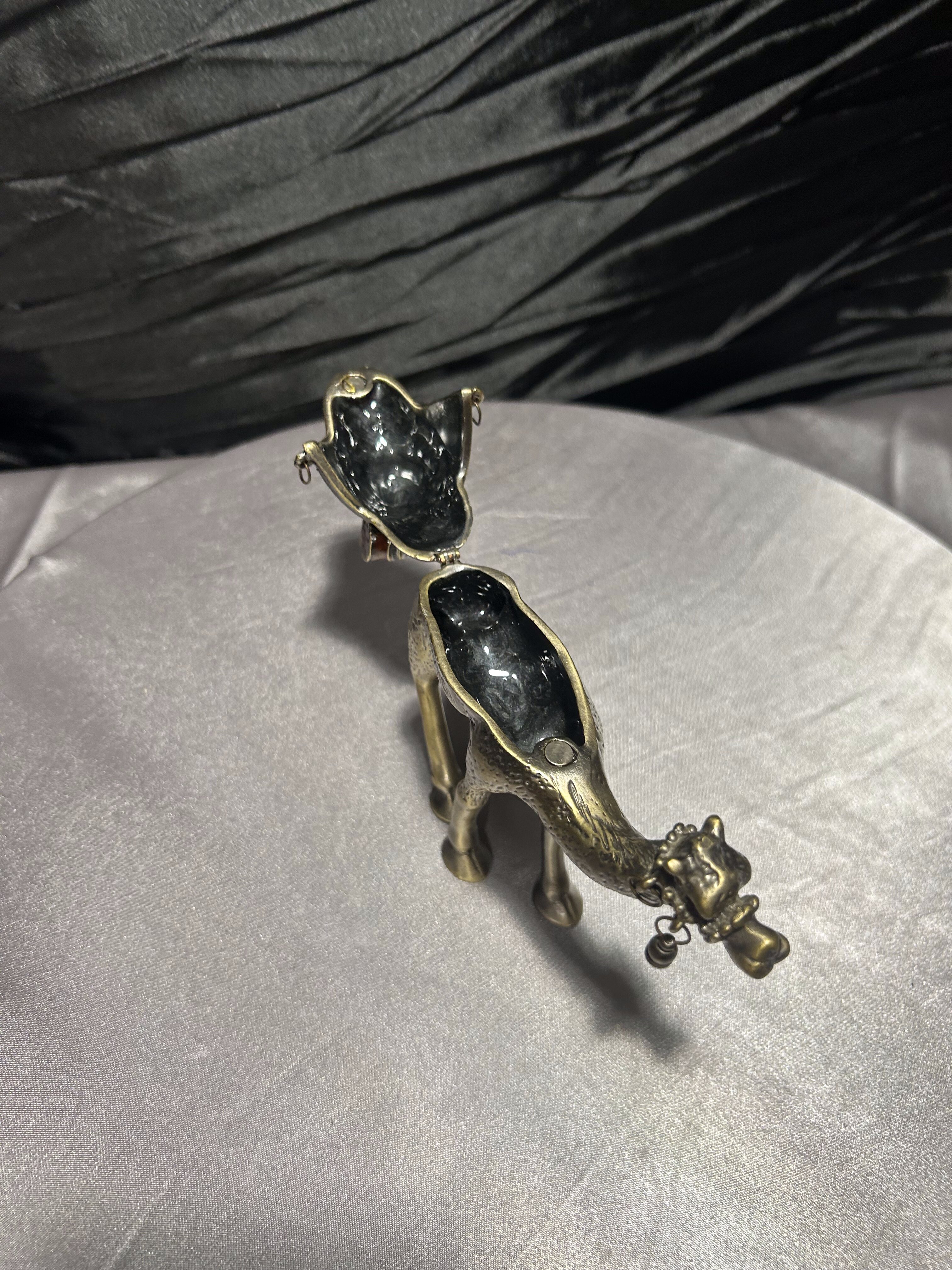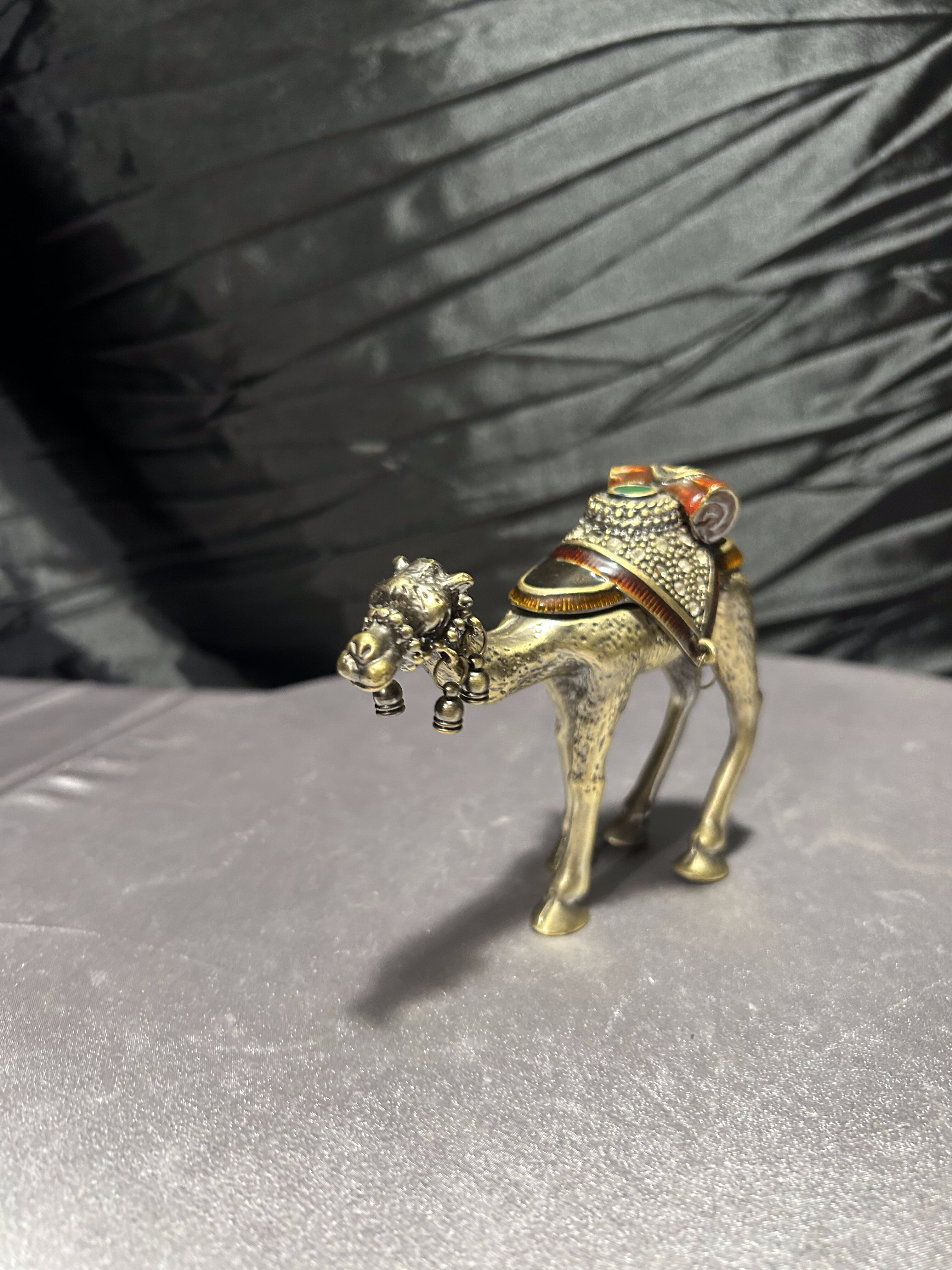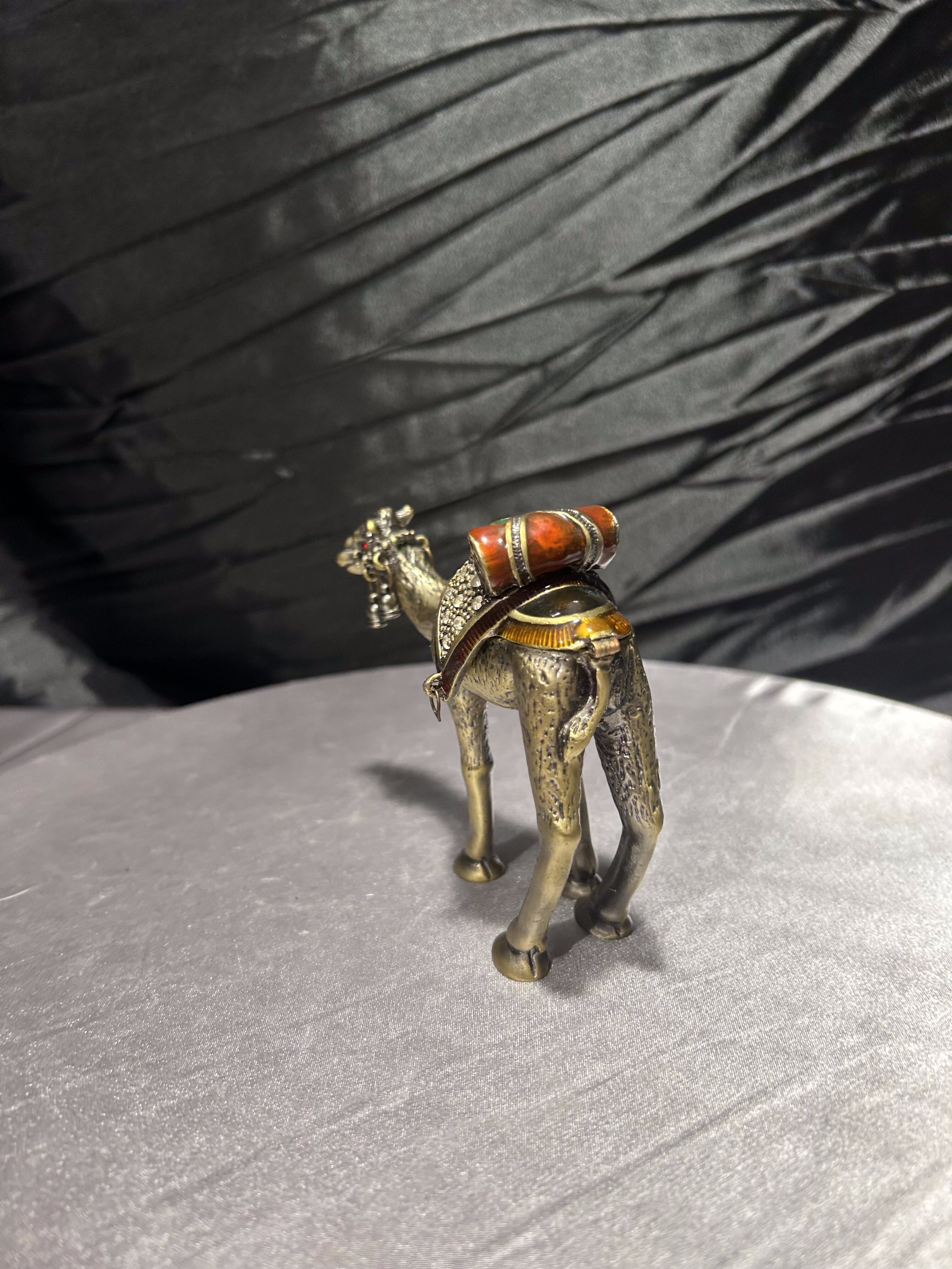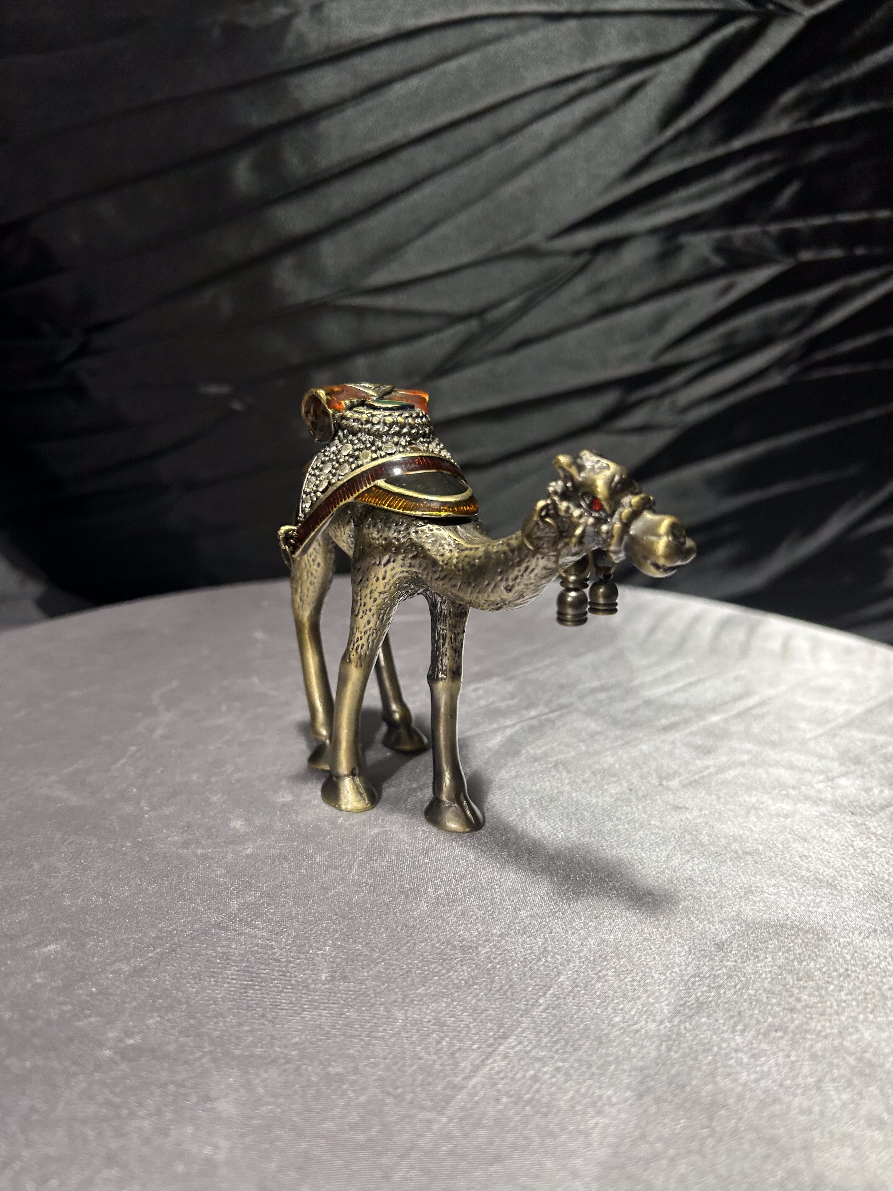 Wyjątkowy przedmiot – figura wielbłąda wykonana z metalu (prawdopodobnie mosiądz lub brąz), pełniąca jednocześnie funkcję małego puzderka-schowka. Zdobiona detalami: siodło dekoracyjne z kamieniami lub imitacją kamieni, zawieszki dzwoneczki przy pysku, ruchome zamknięcie-klapa umożliwiające umieszczenie w środku drobnych przedmiotów. Osadzona w stylu orientalnym, idealna jako dekoracja, prezent lub mały wazałek kolekcjonerski.
