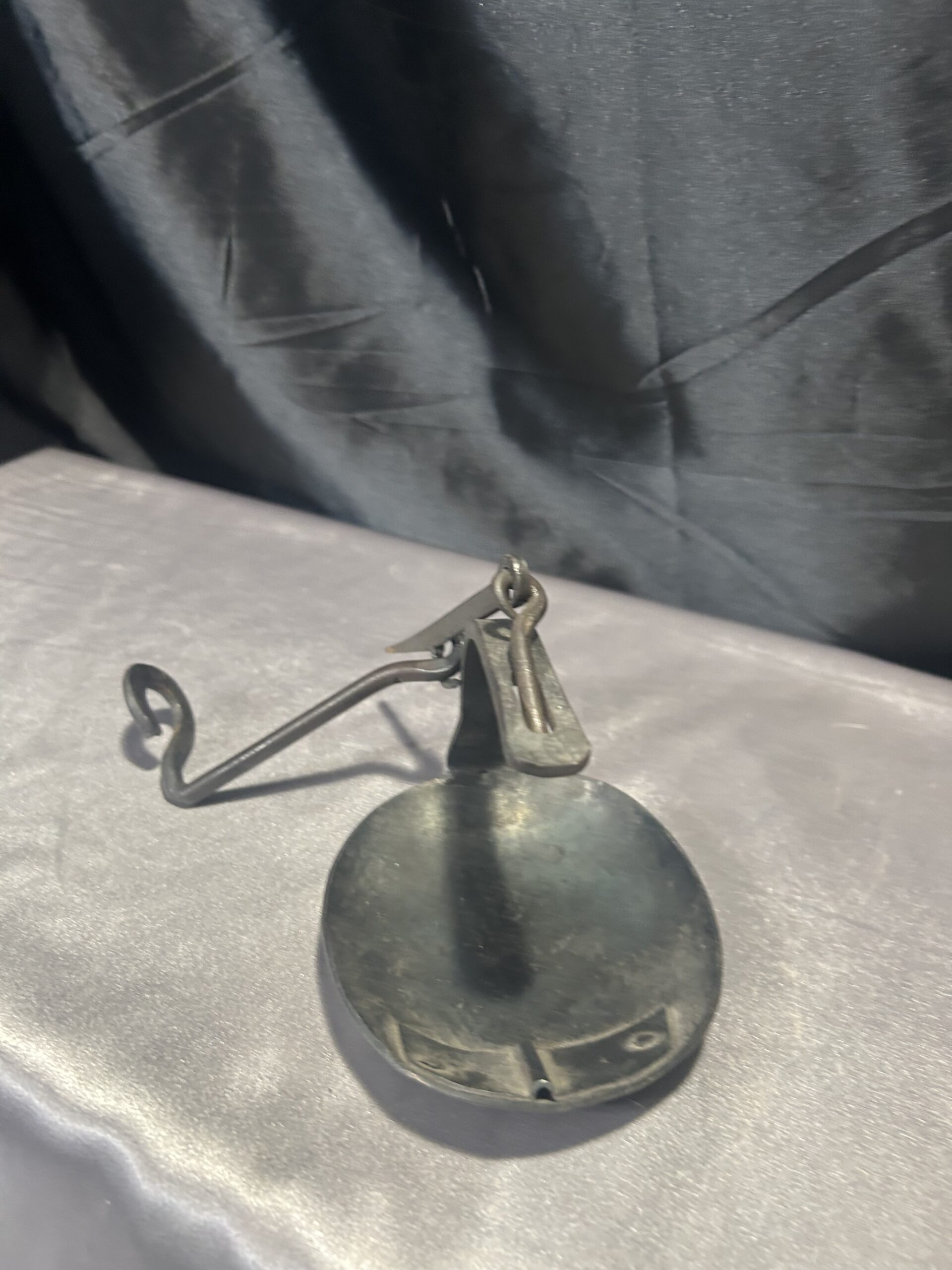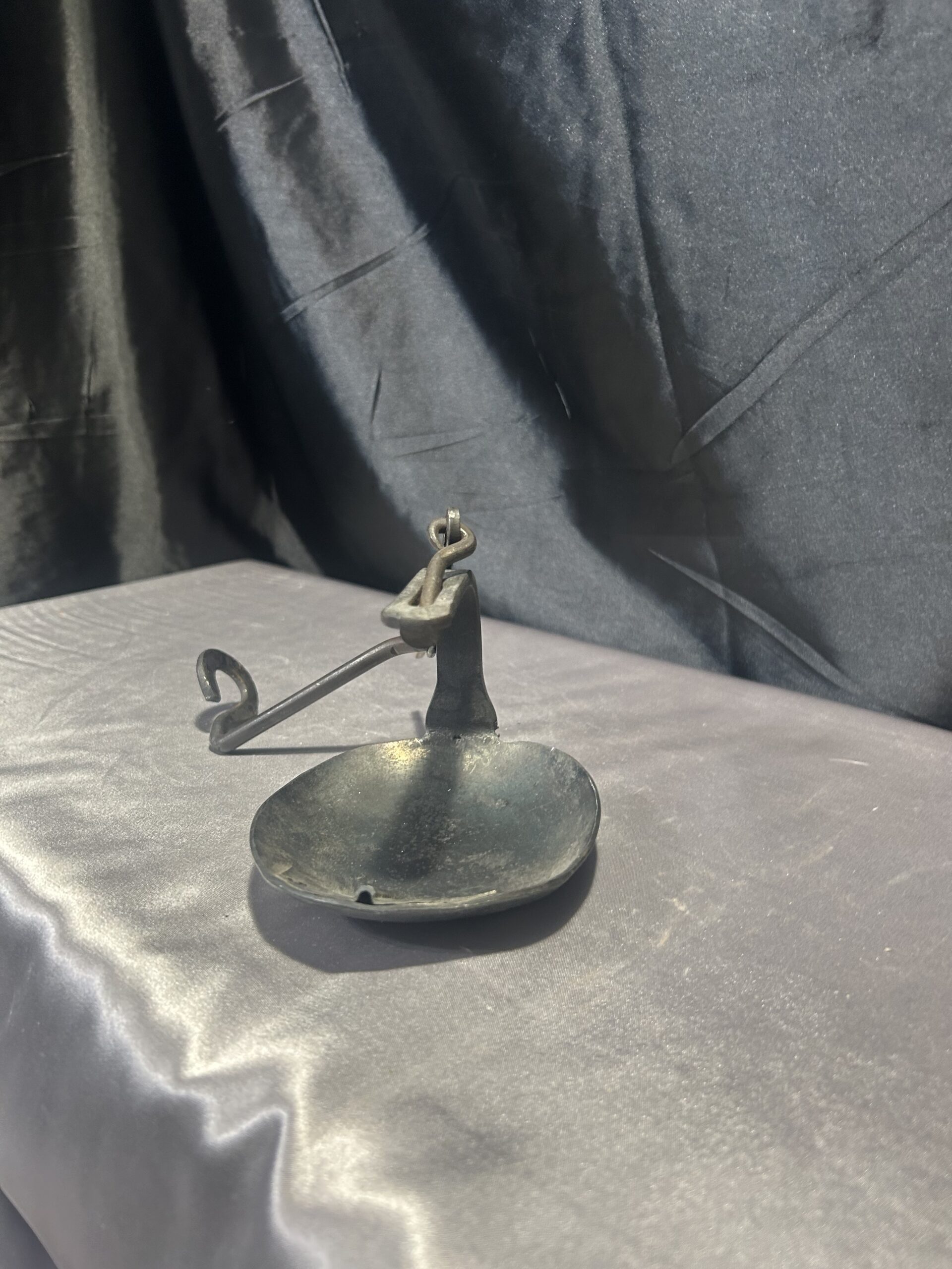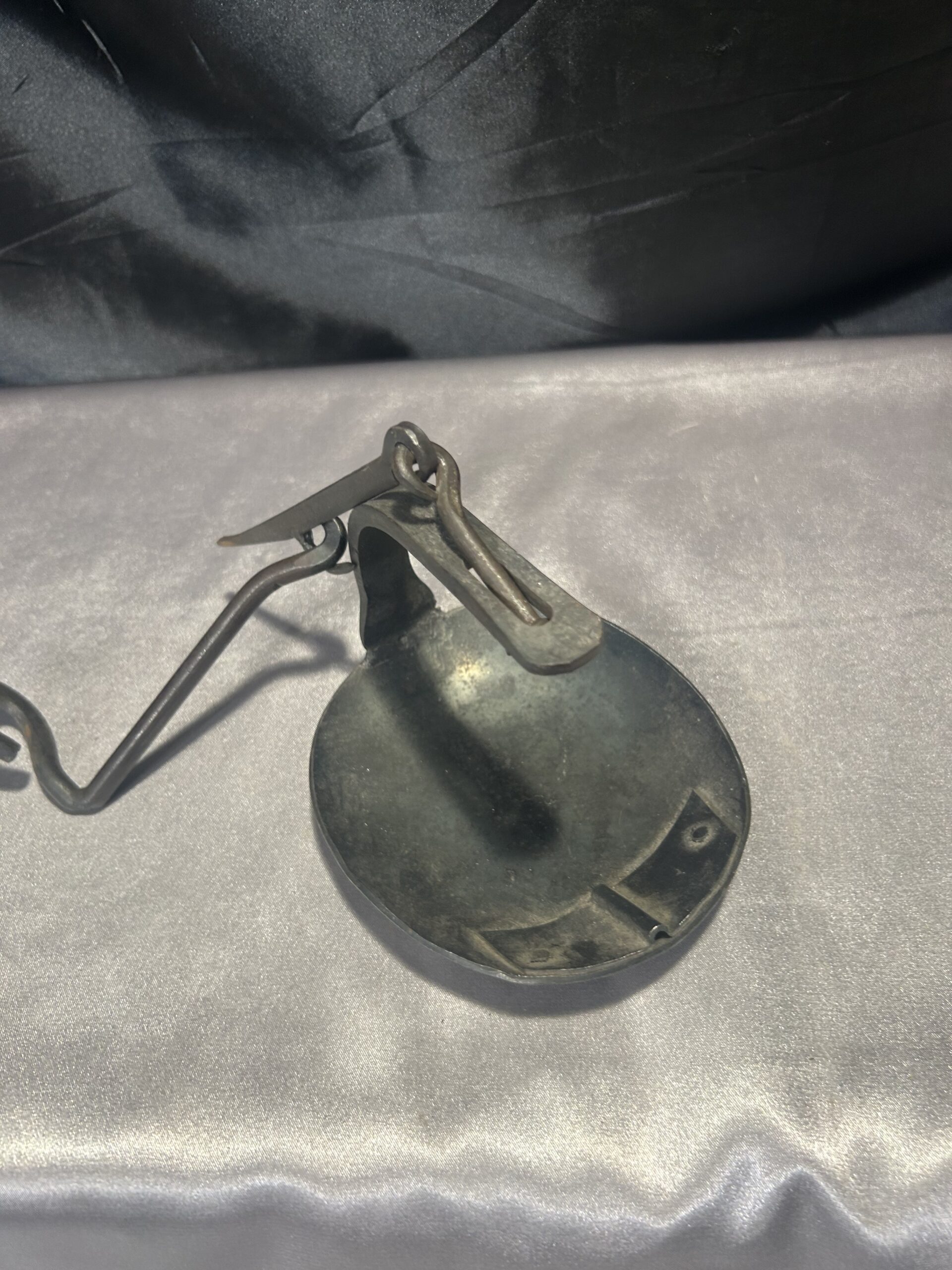 Wyjątkowy wiszący kaganek łojowy, prawdziwy antyk o unikalnym charakterze. To niezwykle rzadki przedmiot, który niegdyś służył do oświetlania wnętrz przy pomocy płonącego łoju. Jego autentyczna forma i pięknie zachowane detale czynią go cennym elementem kolekcjonerskim oraz stylową ozdobą we wnętrzach w klimacie retro, rustykalnym czy historycznym.